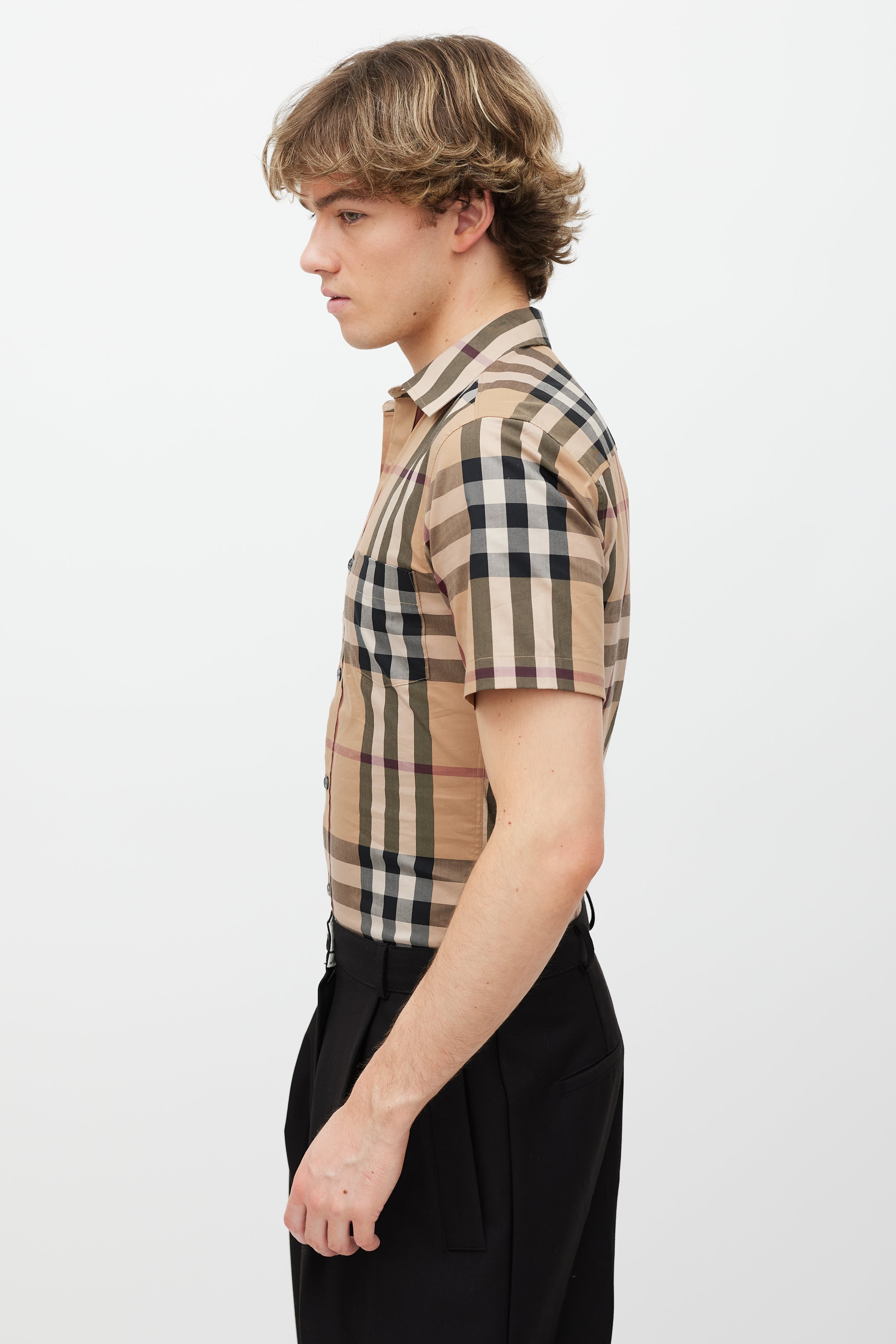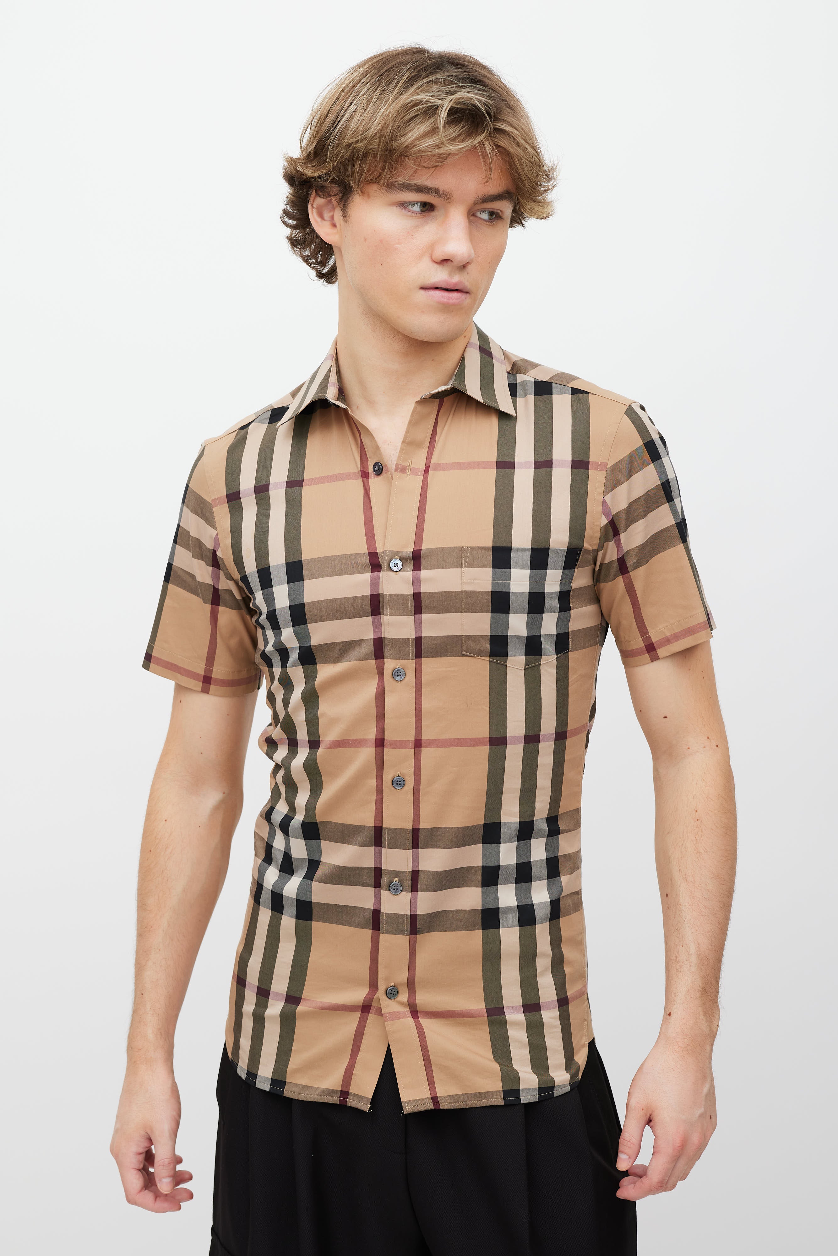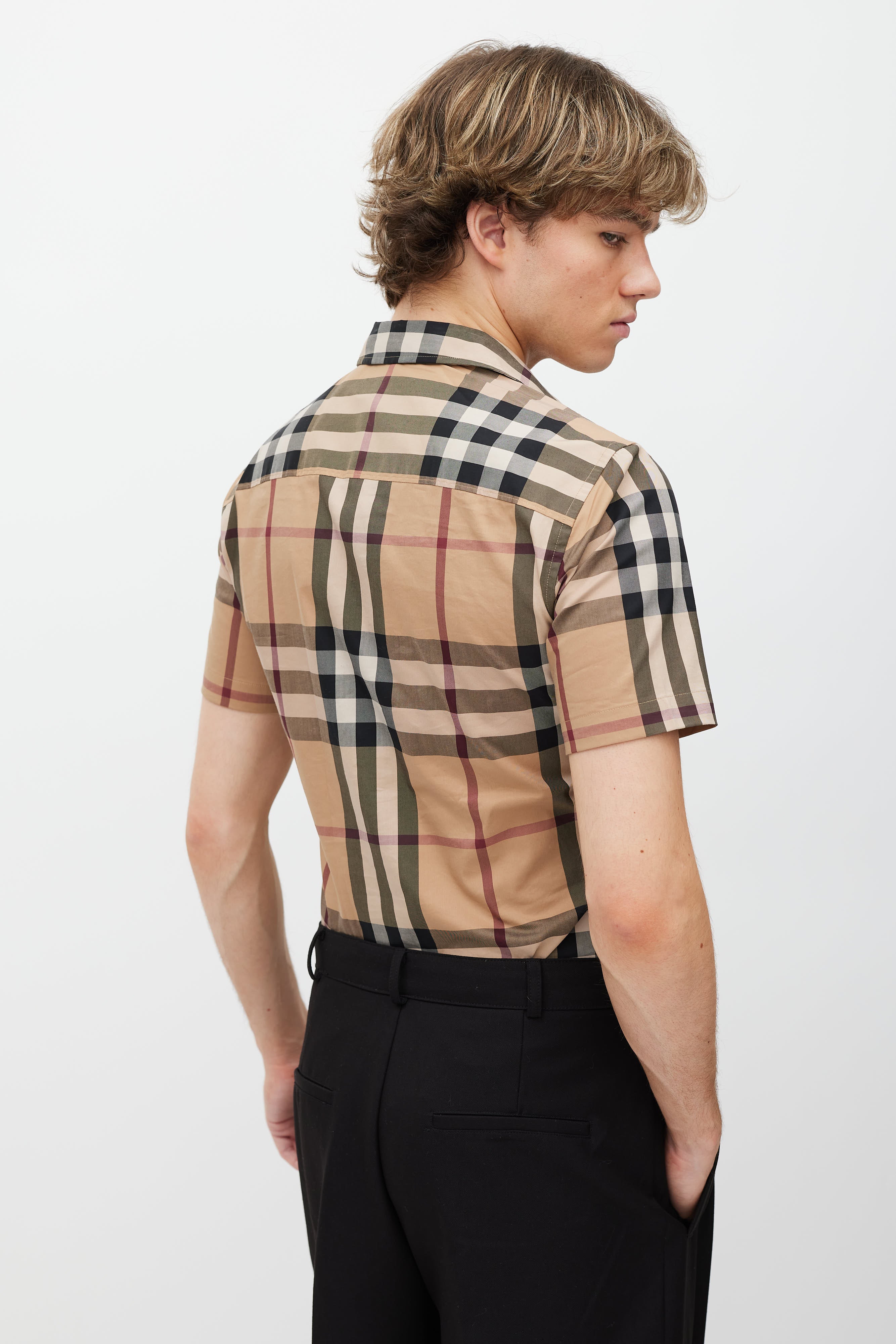 Pre-owned Burberry Brit brown shirt featuring signature Nova Check print throughout, pointed collar, short sleeves, button up front, and one patch pocket at left chest.