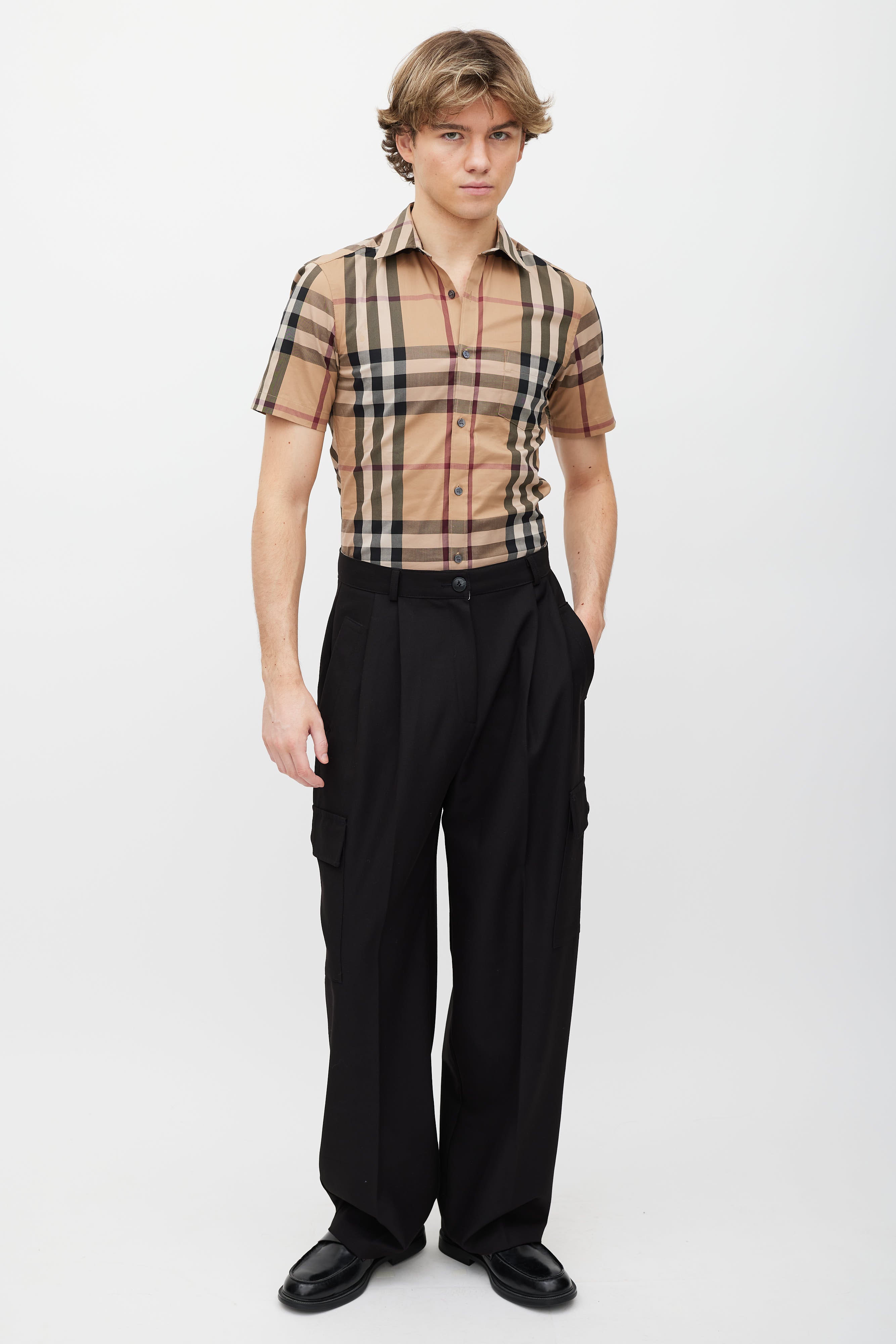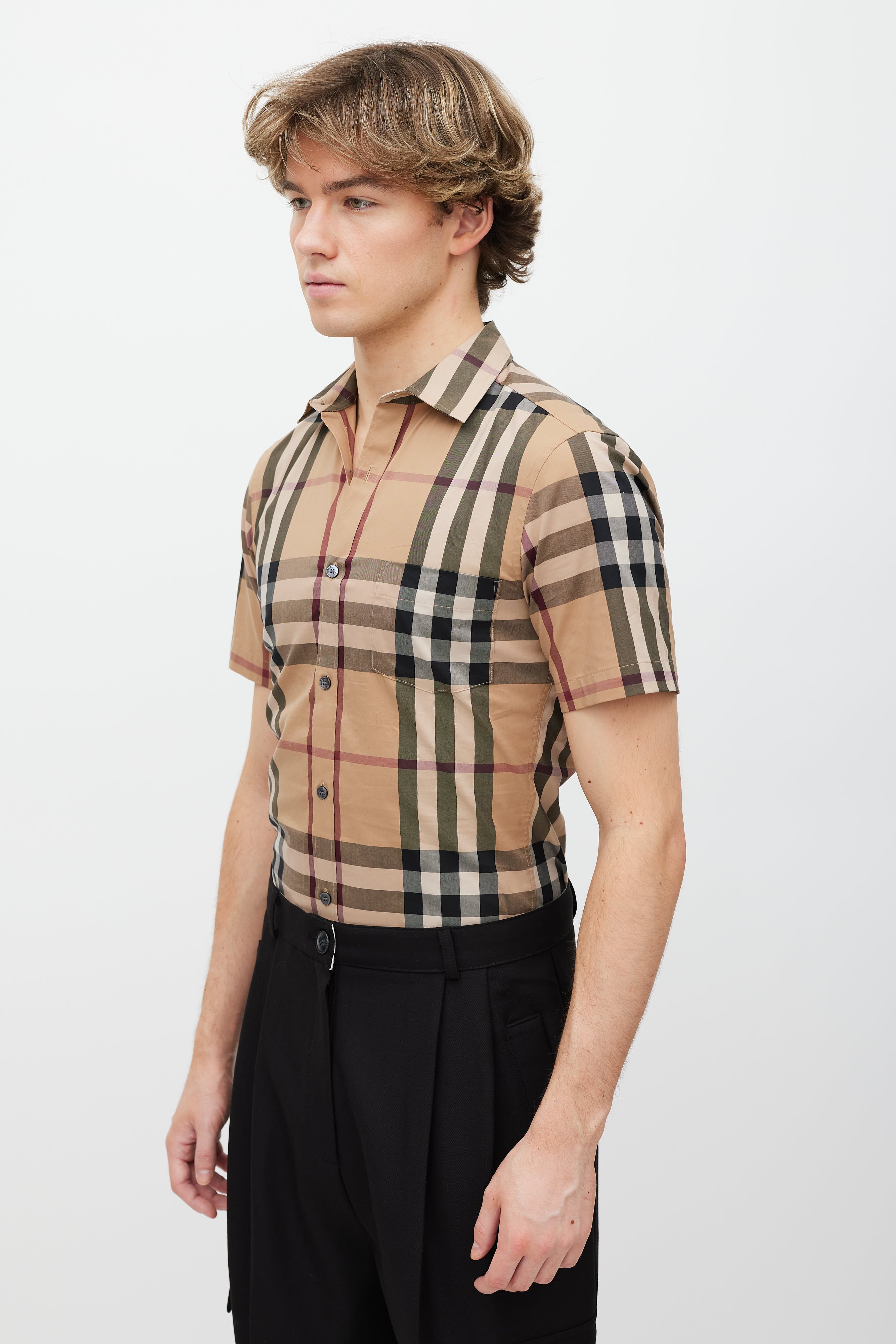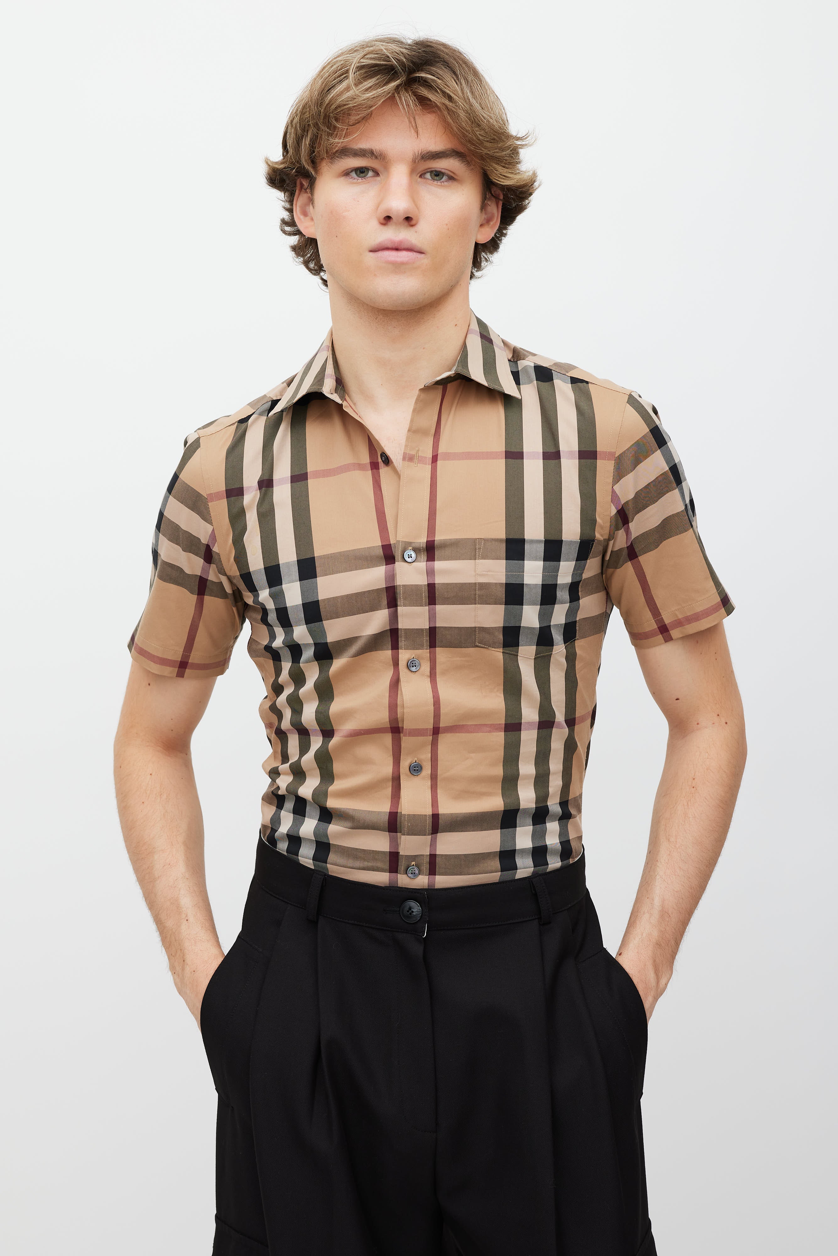 Pre-owned Burberry Brit brown shirt featuring signature Nova Check print throughout, pointed collar, short sleeves, button up front, and one patch pocket at left chest.