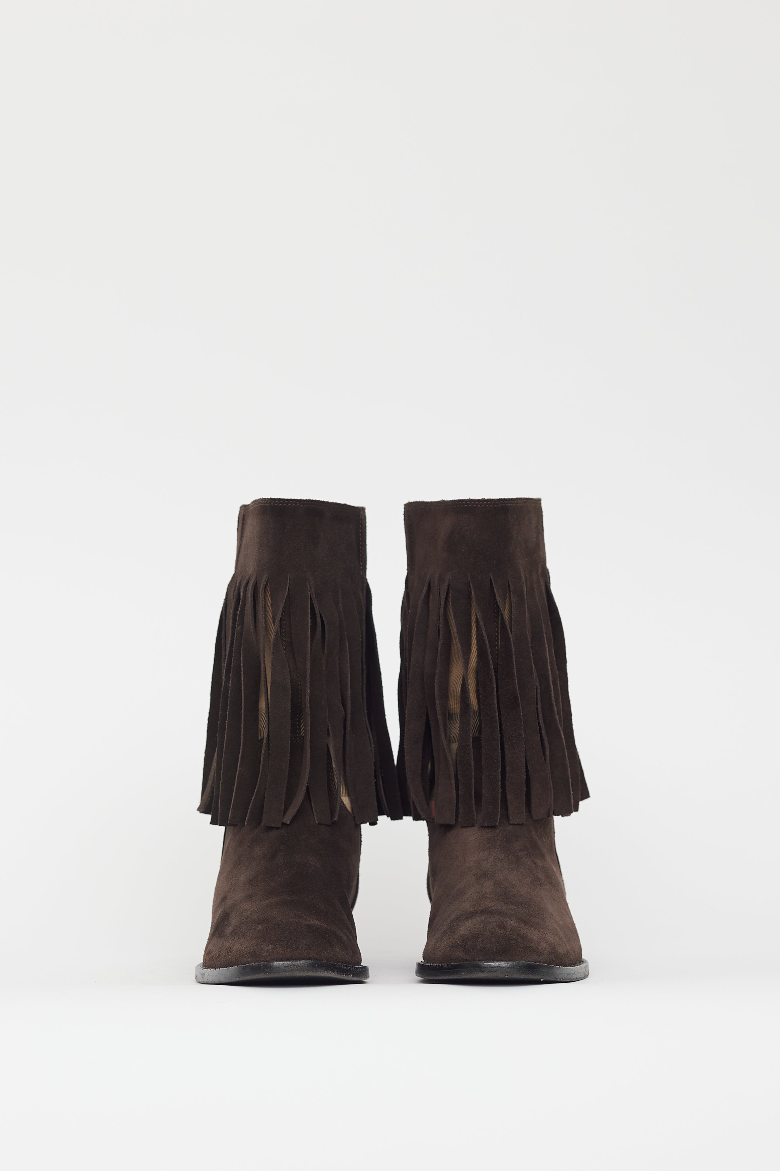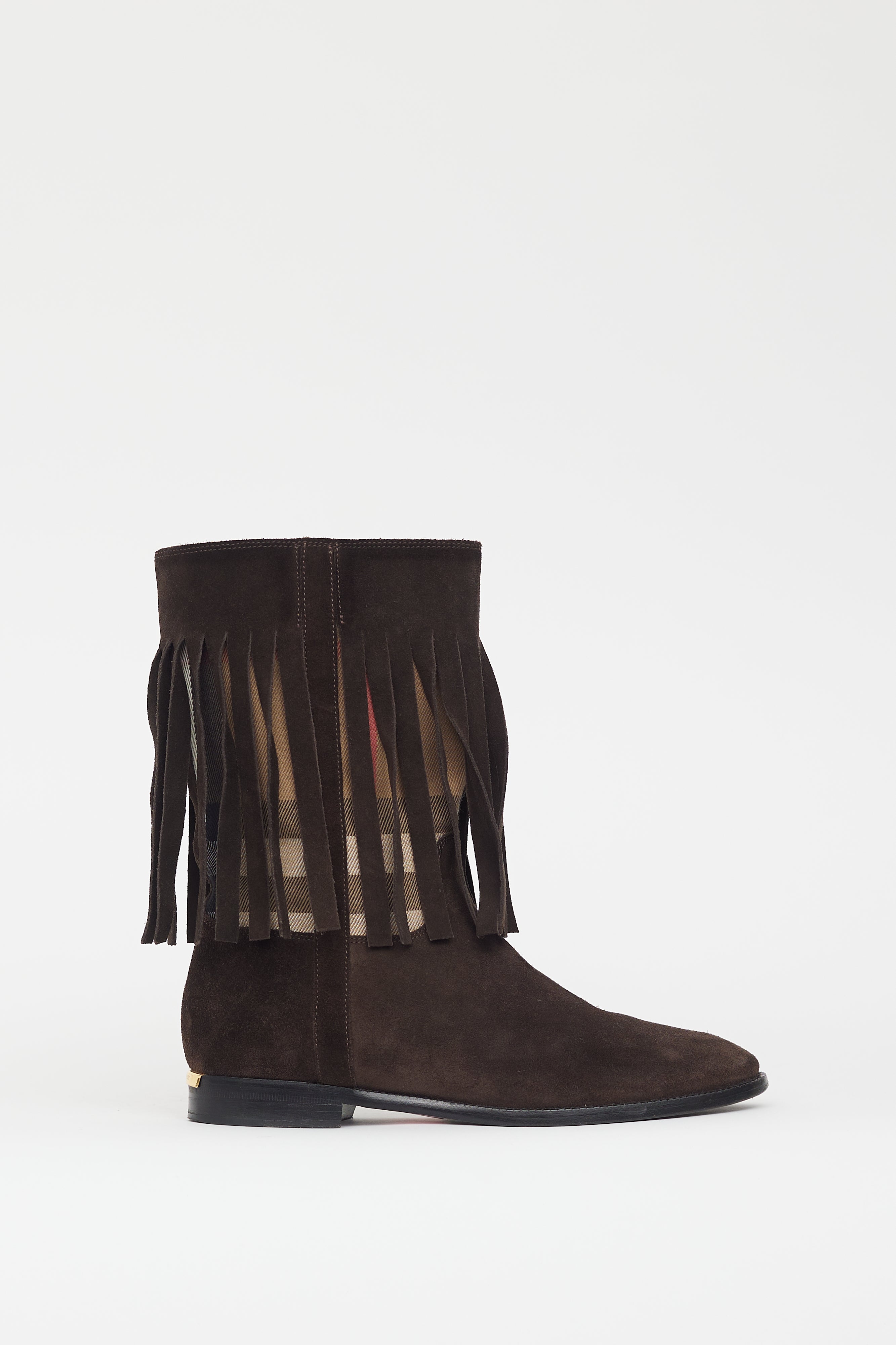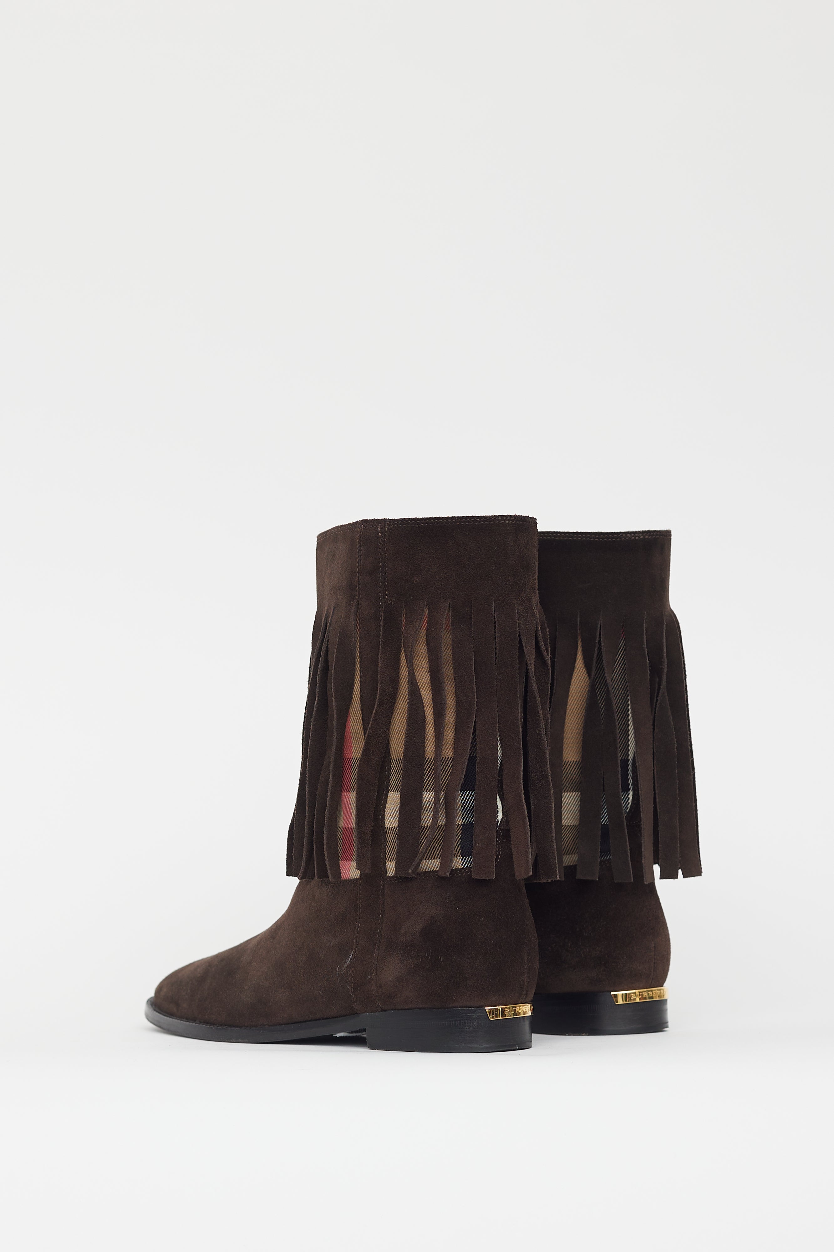 Pre-owned Burberry brown suede boots featuring fringe at ankle, almond toe, gold tone engraved plaque at counter, nova canvas at shaft, and leather insoles. Comes with original dust bag.