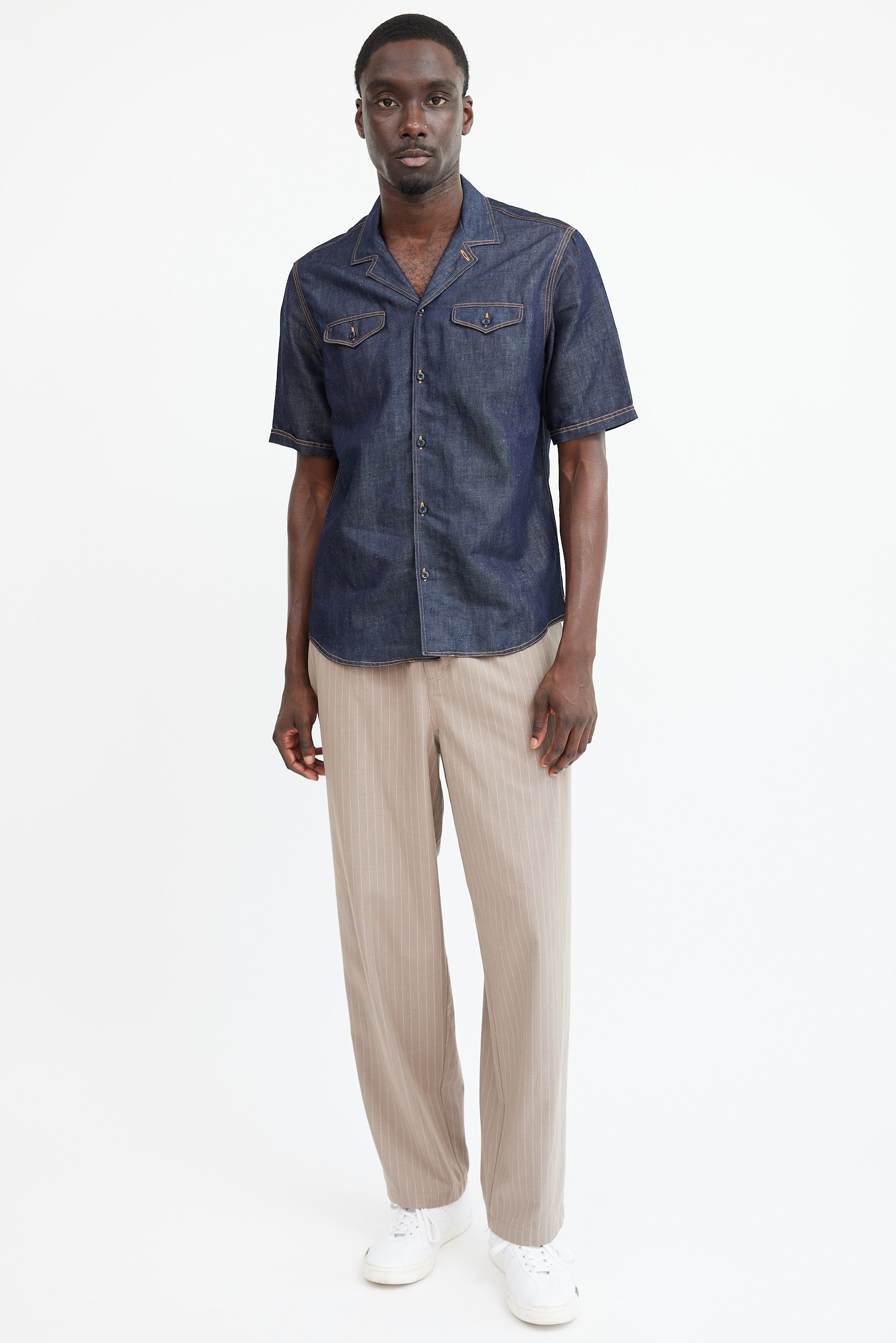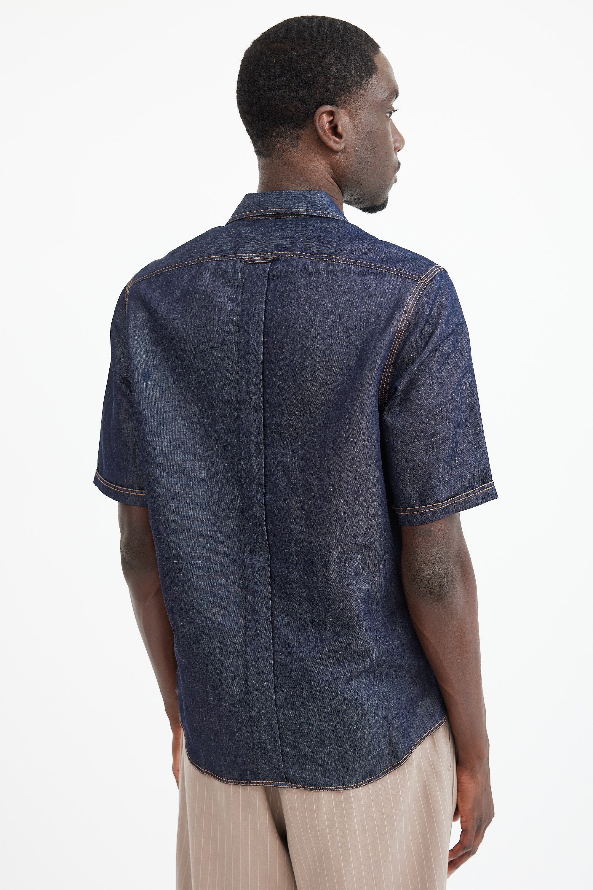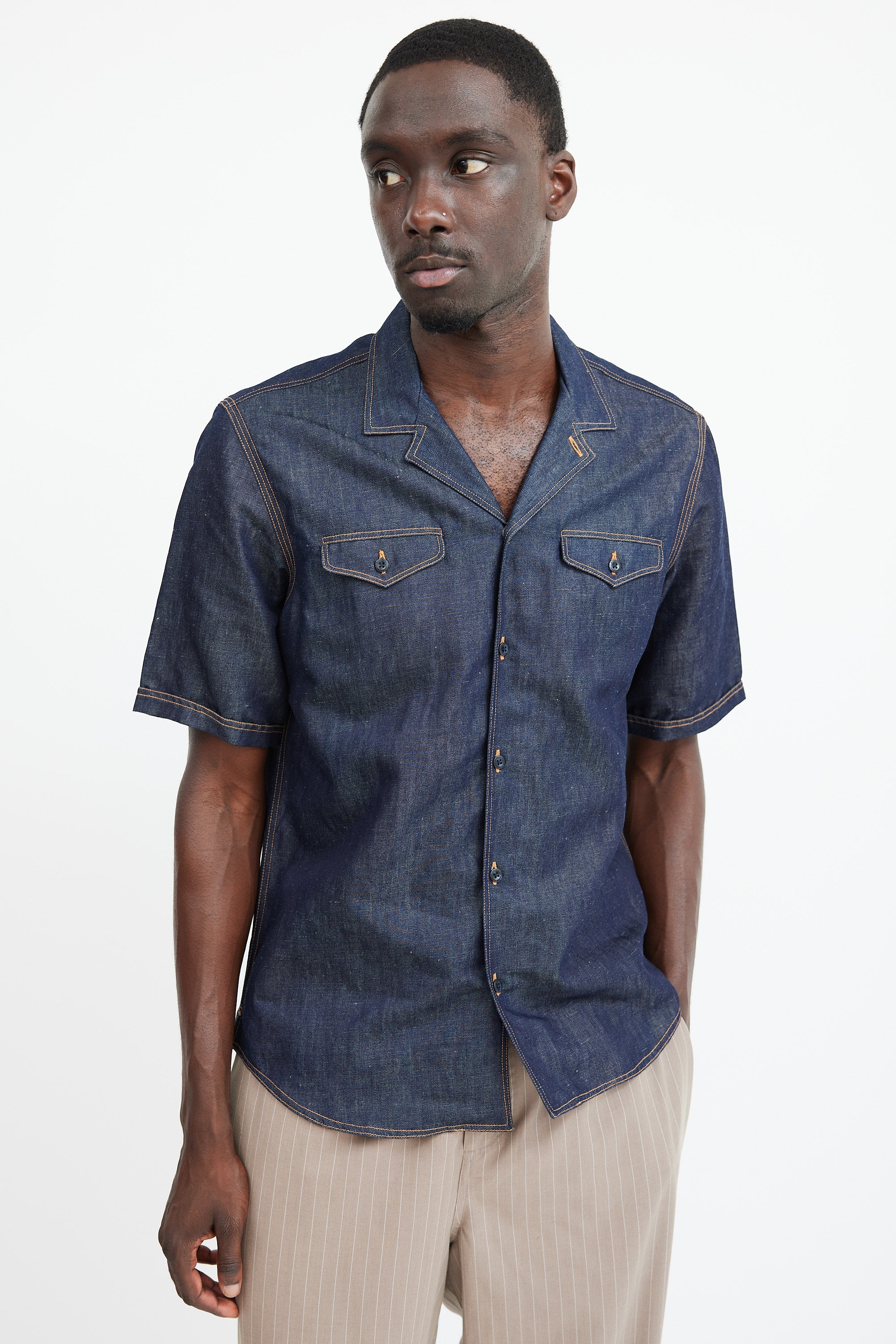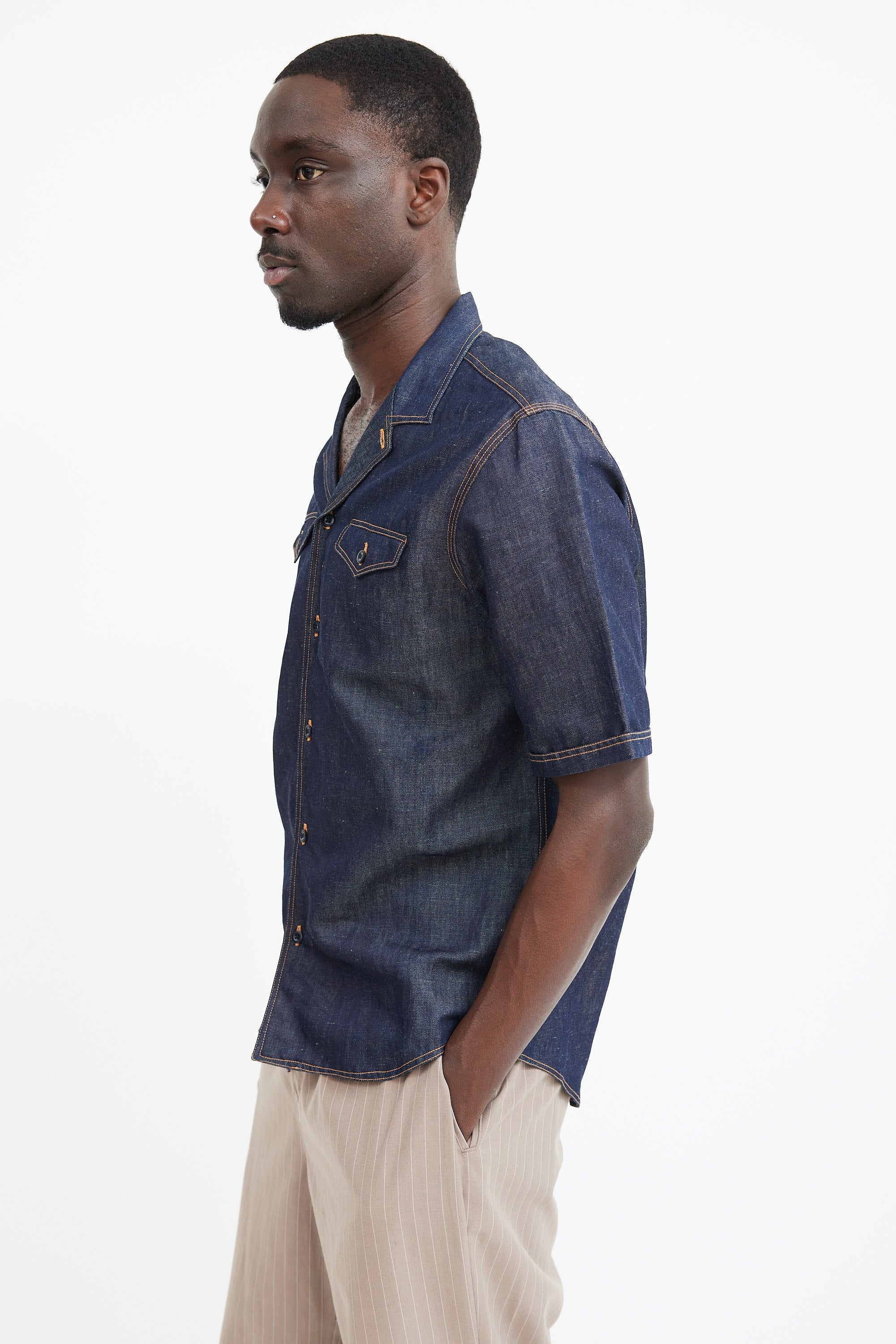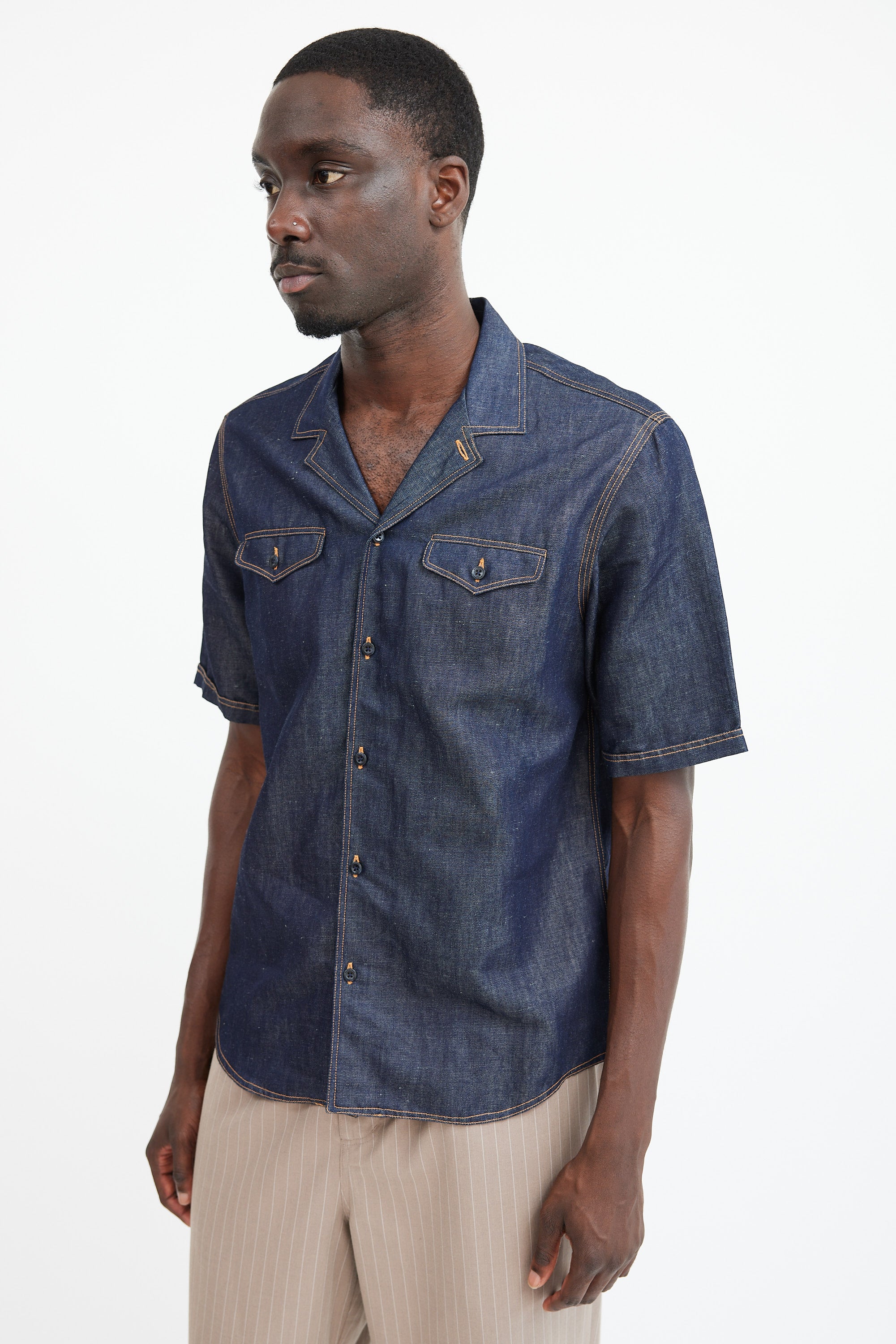 Pre-owned Burberry dark wash denim shirt featuring a camp collar, two flap pockets at chest, short sleeves, contrast stitching, and button up closure.