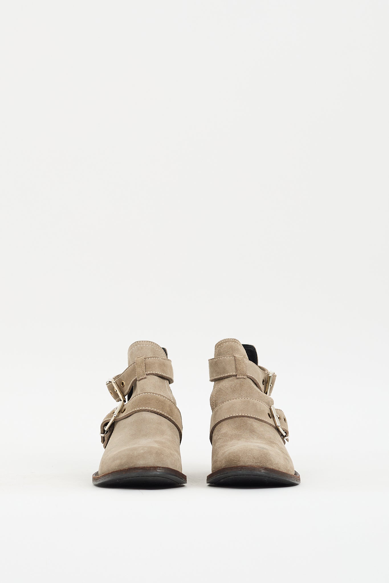 Pre-owned Burberry grey suede ankle boot featuring a rounded toe, notched topline, cut out sides, dual buckled straps at shaft, and wooden base with short stacked heel and pale gold tone stamped logo hardware at counter.