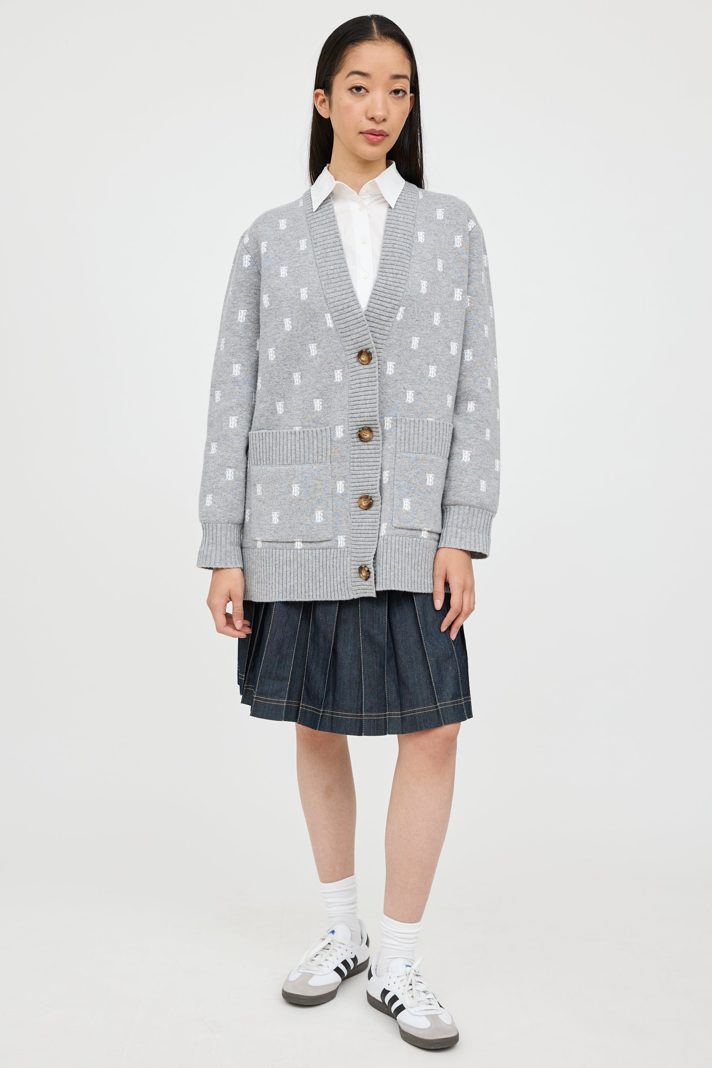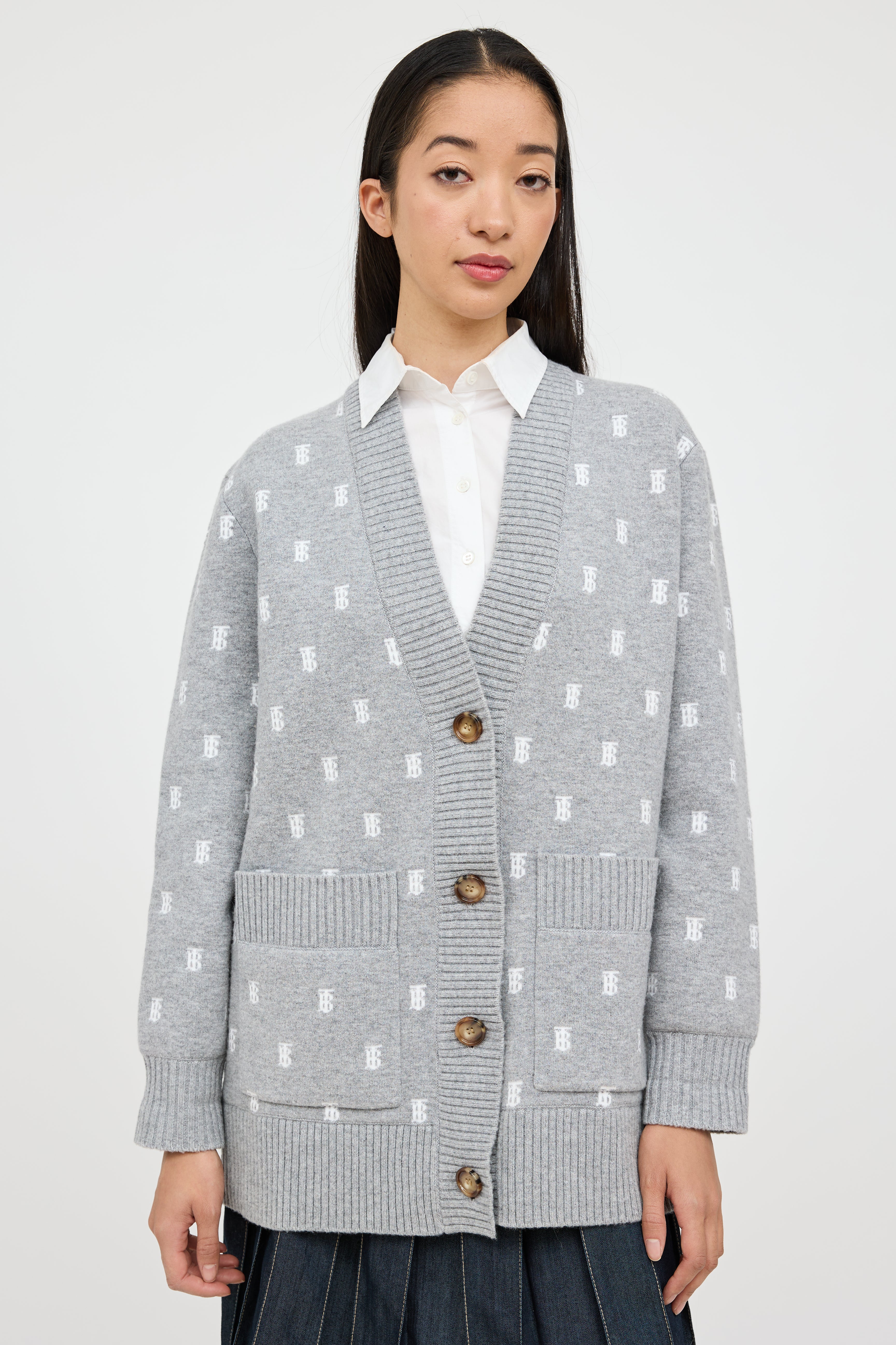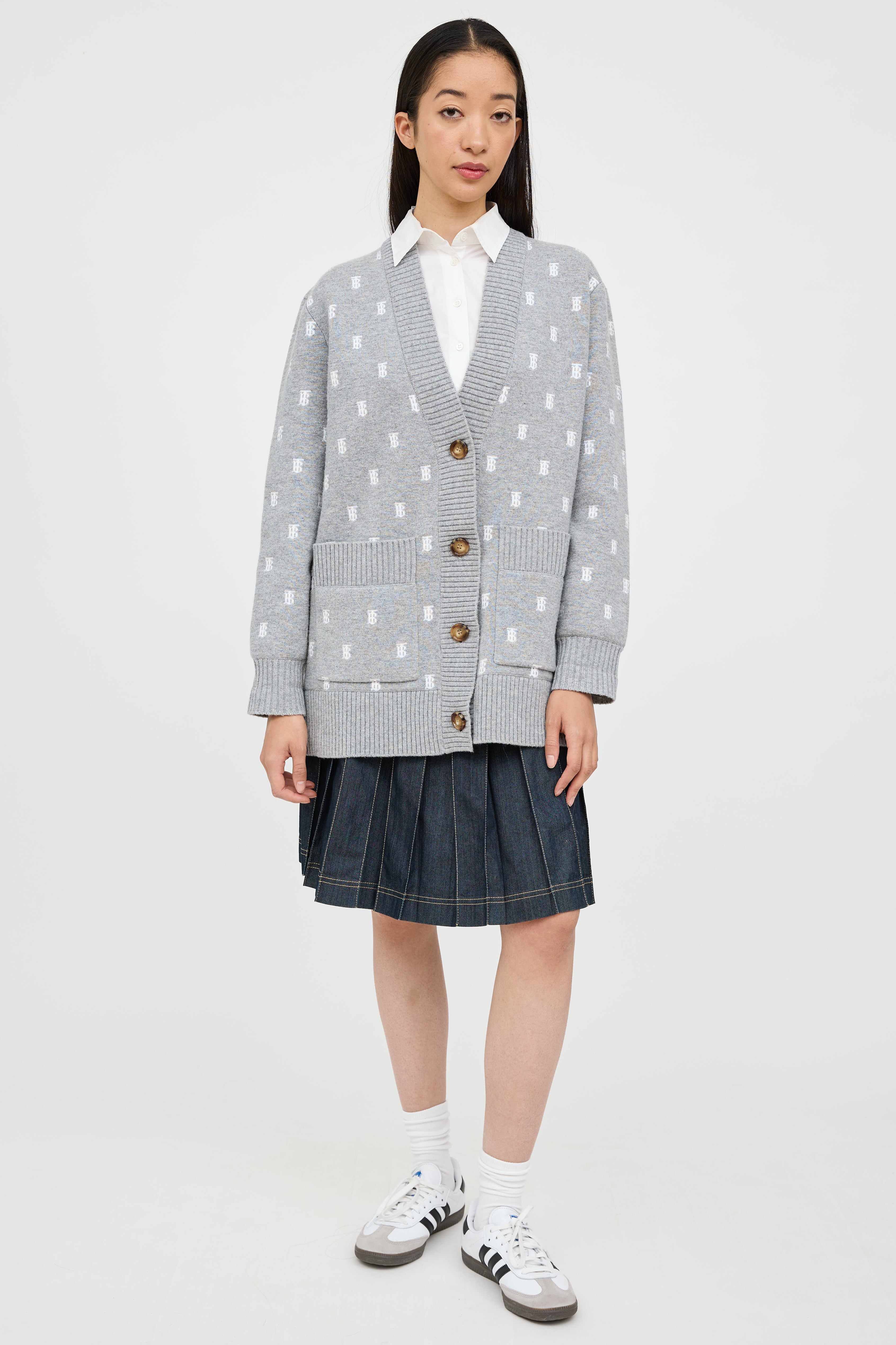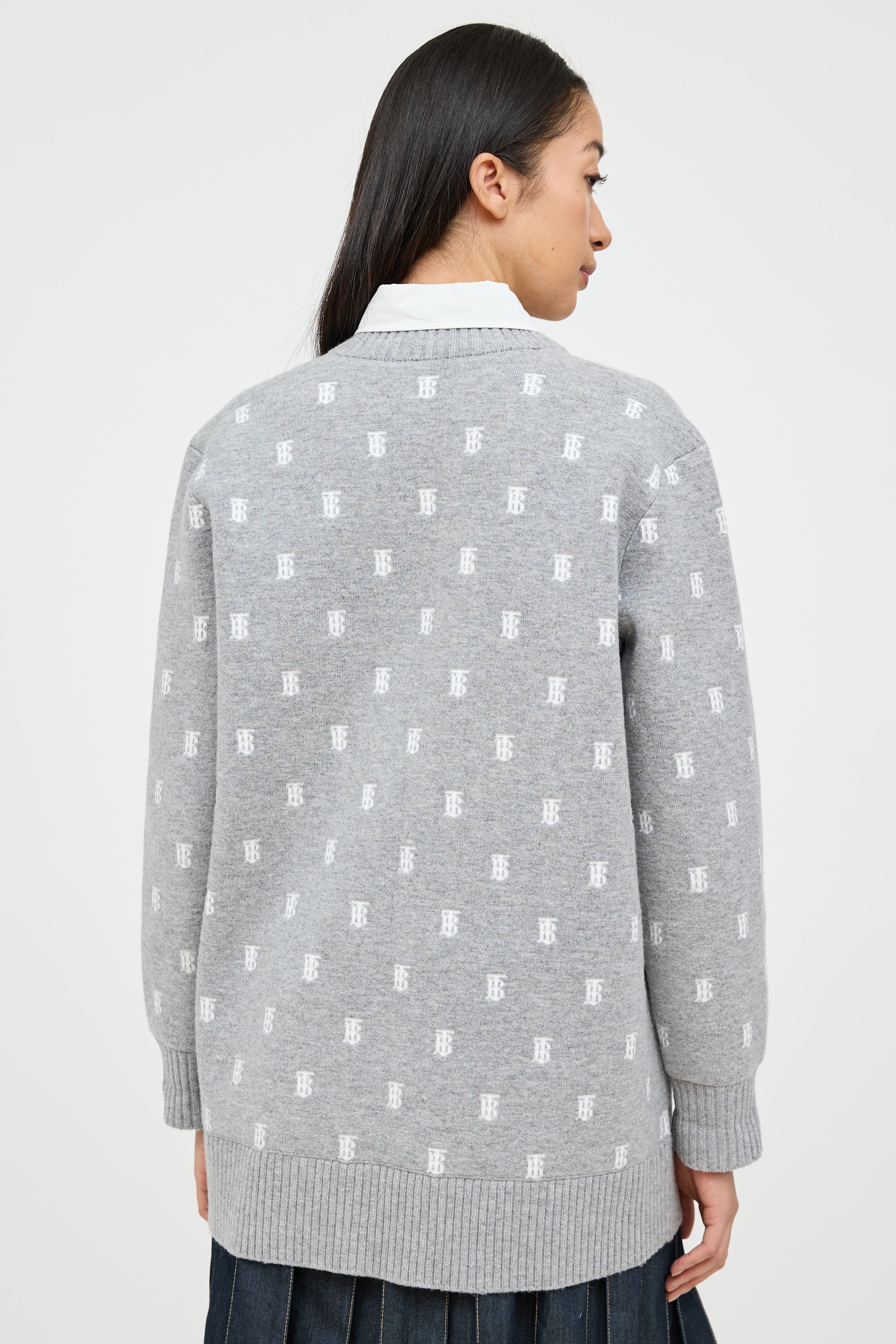 Pre-owned Burberry grey wool blend knit cardigan featuring a white woven monogram pattern throughout, v-neck, long sleeves, two patch pockets at hip, ribbed hem, and button up closure.