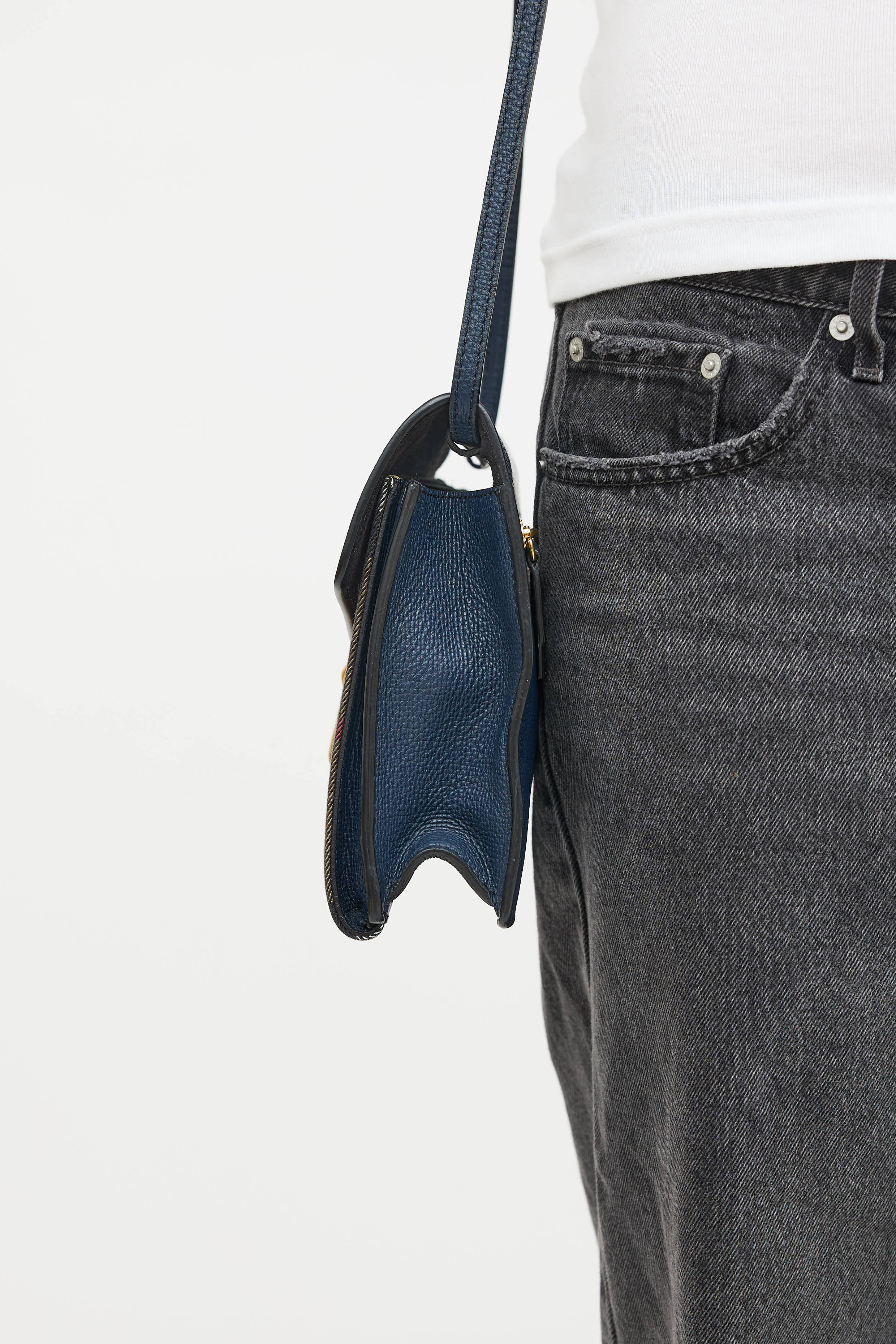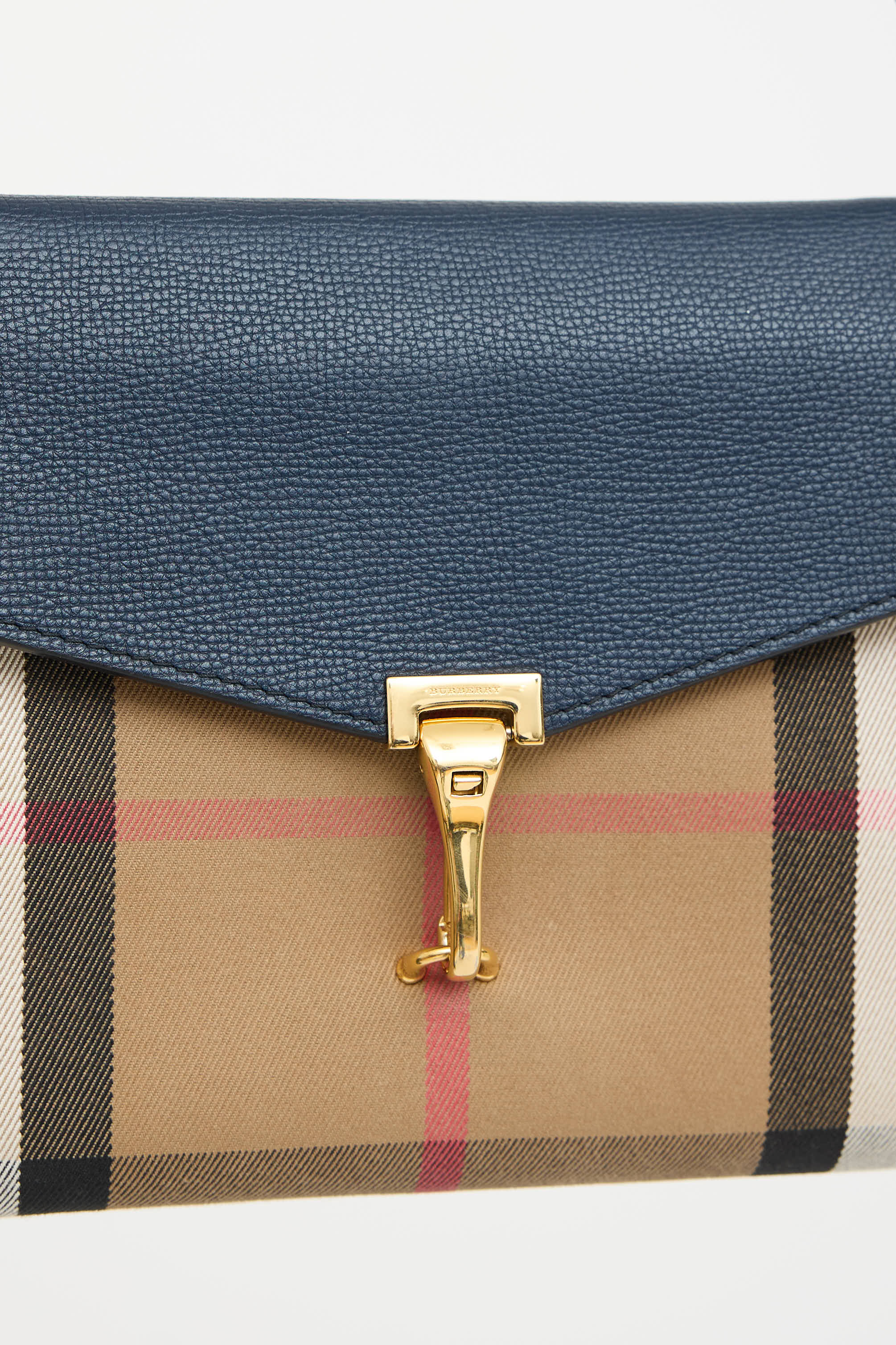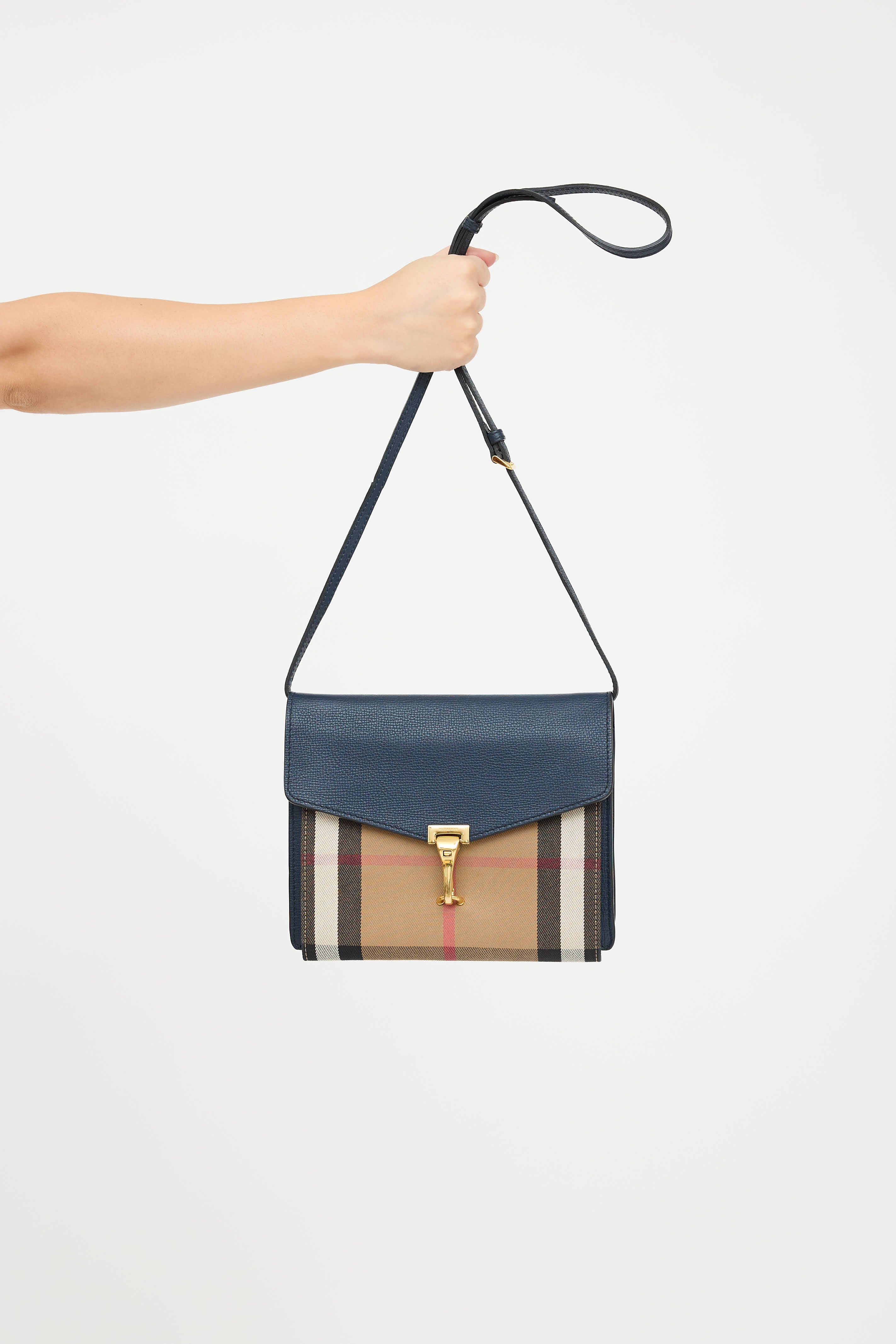 Pre-owned Burberry navy and beige Macken crossbody bag featuring House Check, gold tone hardware, hook clasp closure, zip pocket at back, interior slip pocket, and one main compartment with one slip pocket.