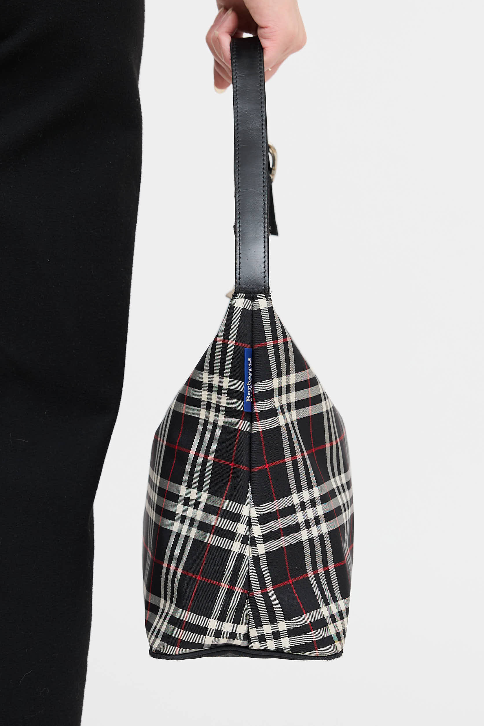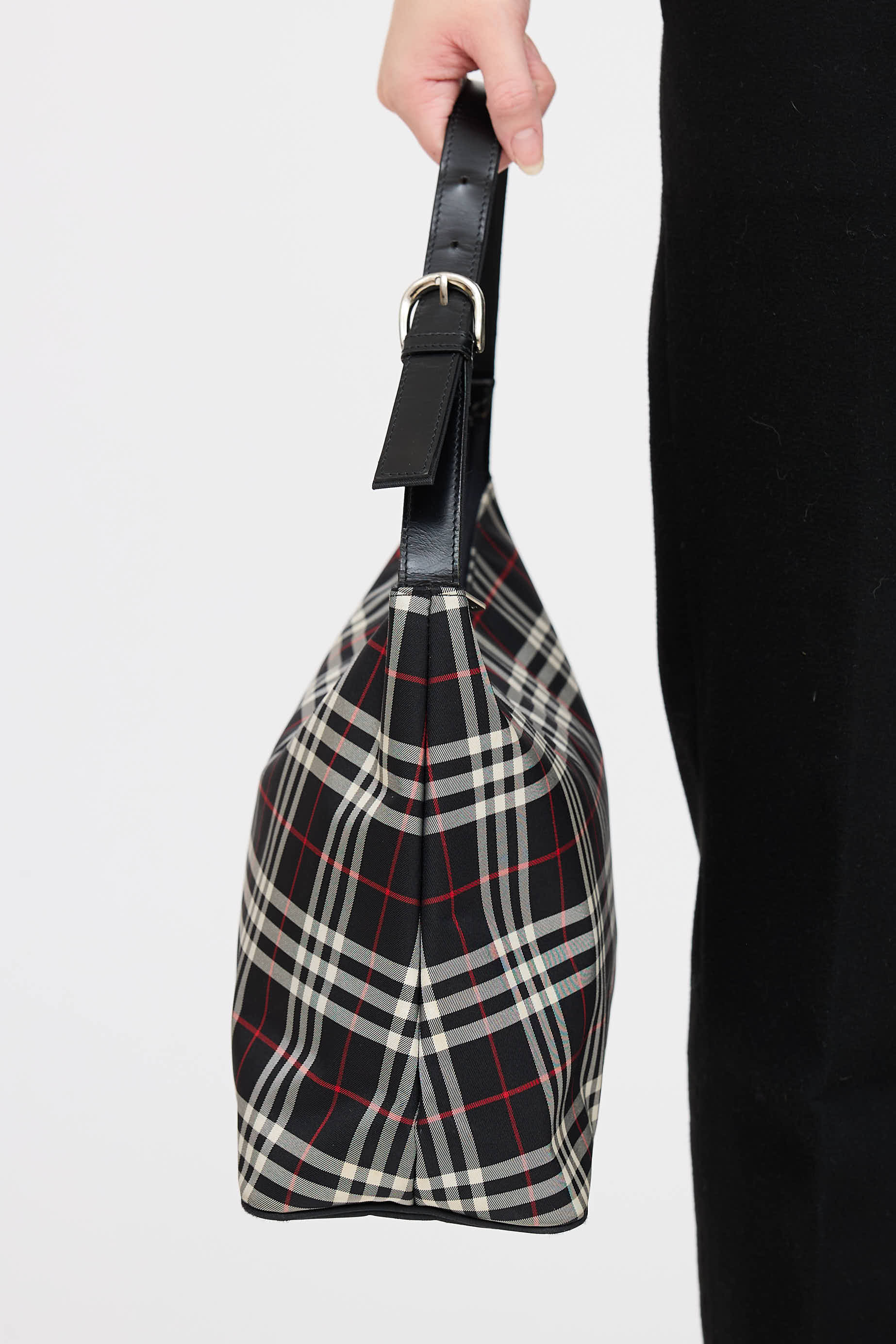 Pre-owned Burberrys Blue Label Shoulder bag featuring black and red nylon check , adjustable leather shoulder strap, logo tab at side, zip top closure, nylon lining, one interior slip pocket and single interior zip pocket.