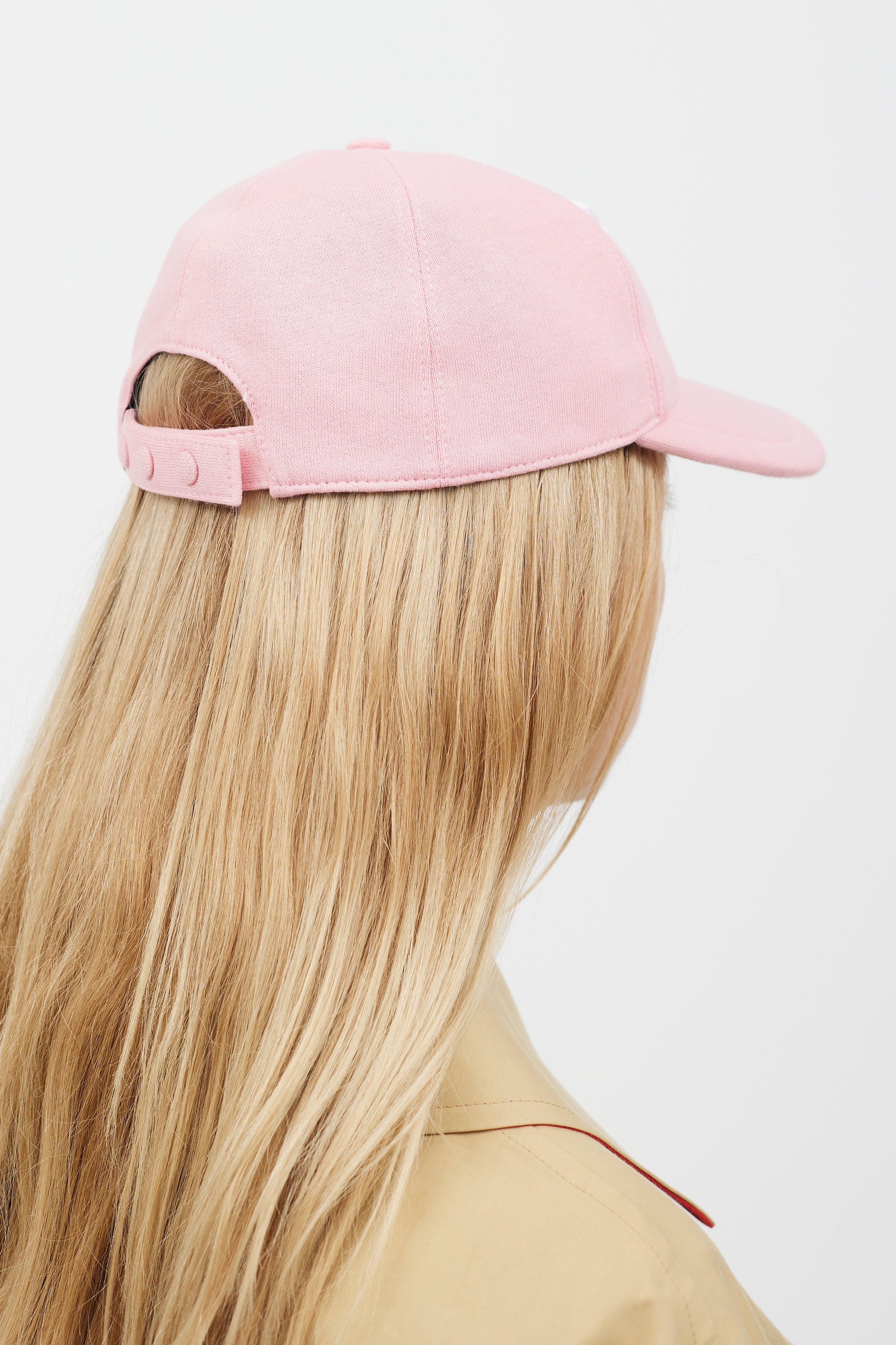 Pre-owned Burberry pink hat featuring a white embroidered TB logo at front, curved brim, and adjustable snap closure at back. Comes with original box. Lined.
