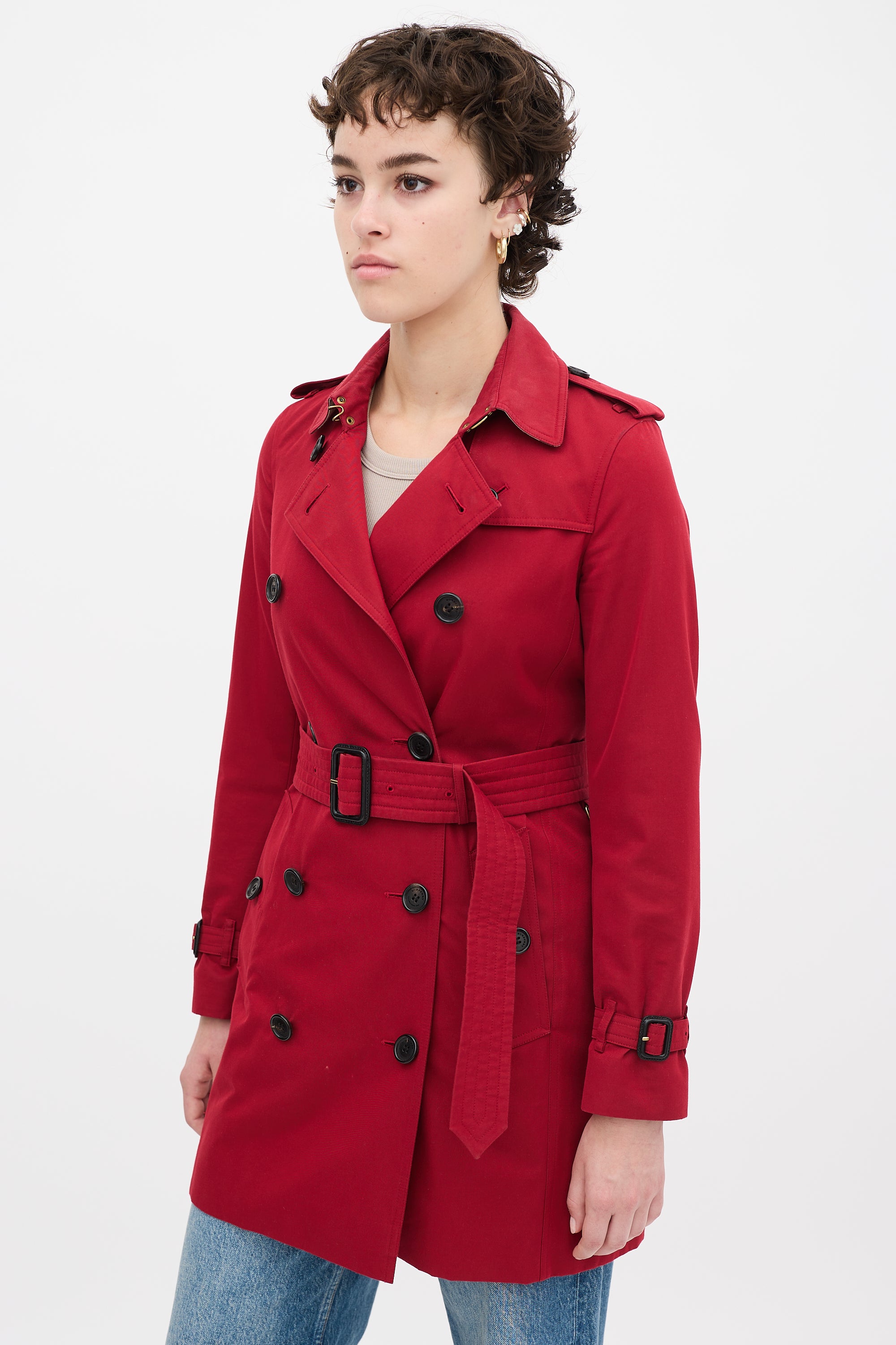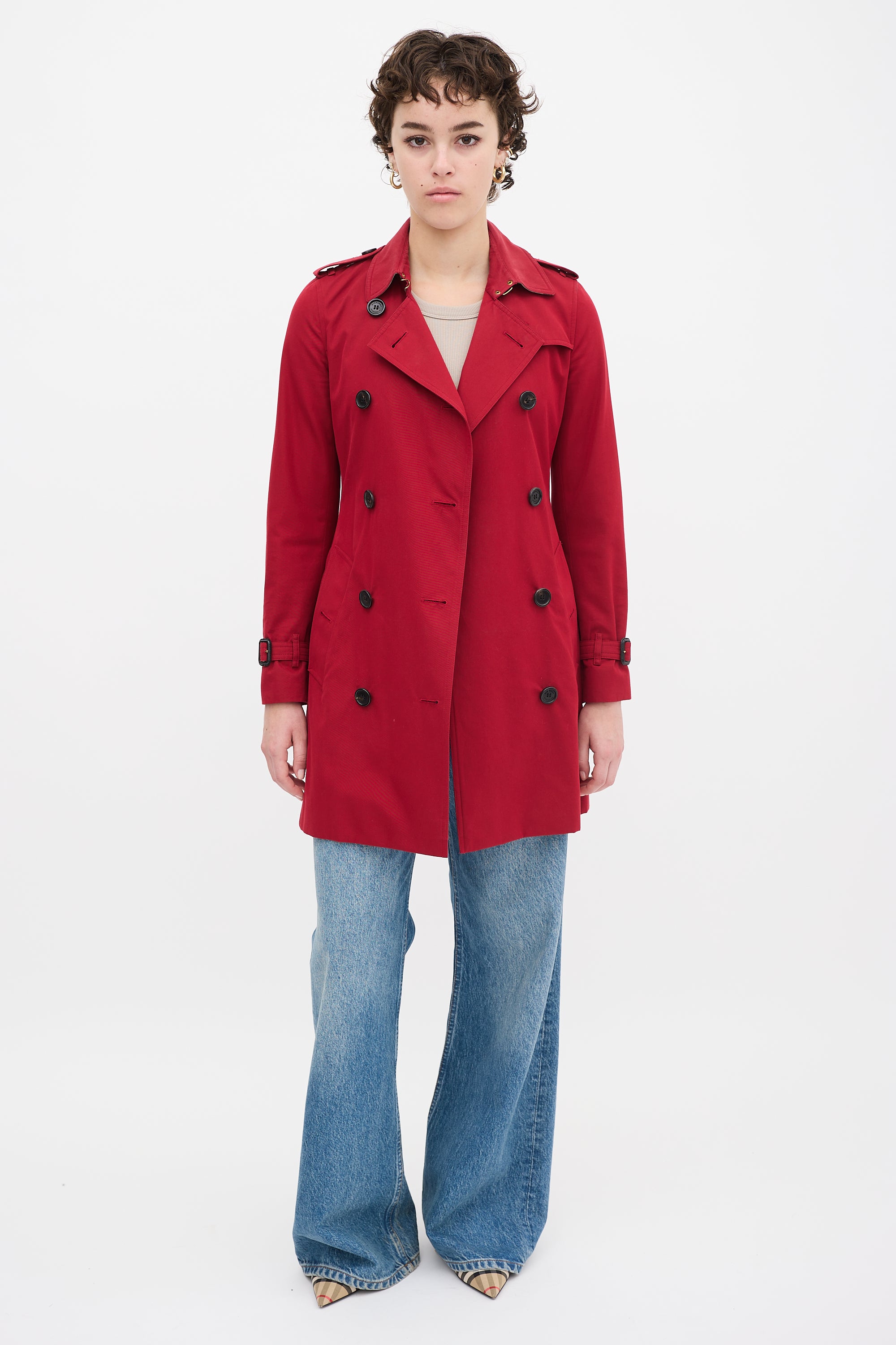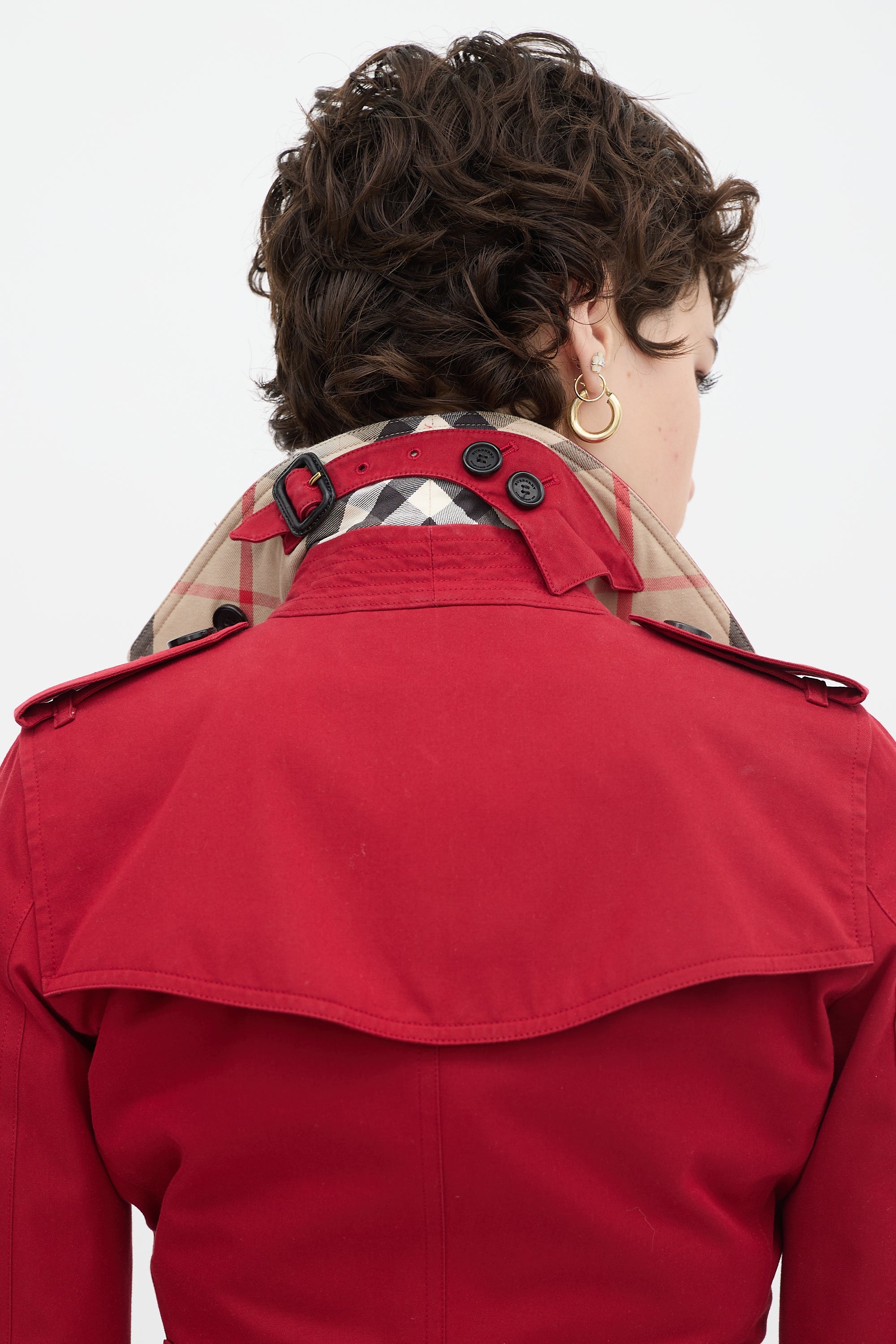 Pre-owned Burberry red cotton Kensington Medium trench coat featuring a convertible collar with concealed strap detail, double breasted button up front, two buttoned front slip pockets, storm flap at front left shoulder, back storm shield, back vent, belted waist with gold tone D-ring hardware, epaulettes at shoulders, long sleeves with buckle strapped cuffs, and signature Nova Check lining.