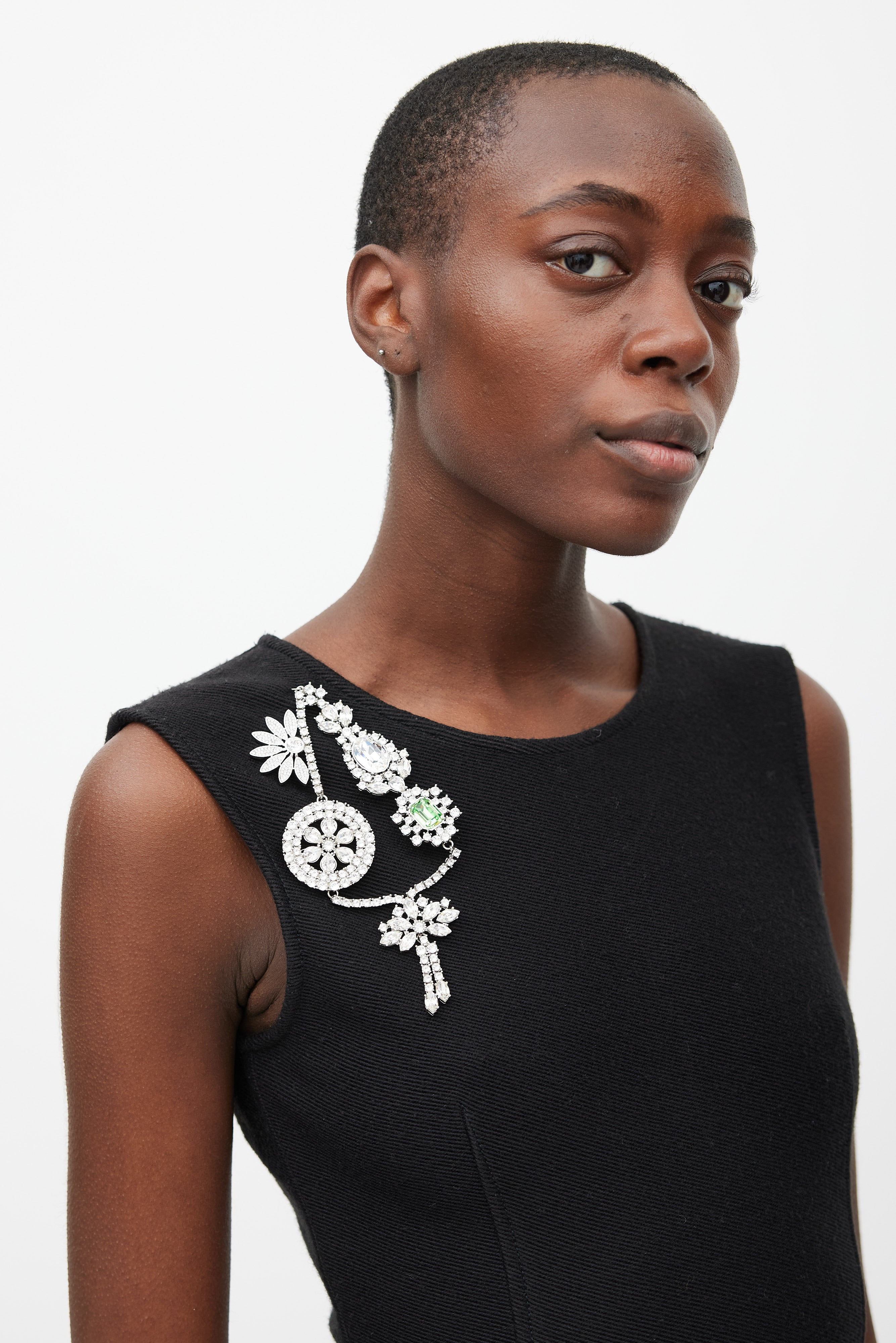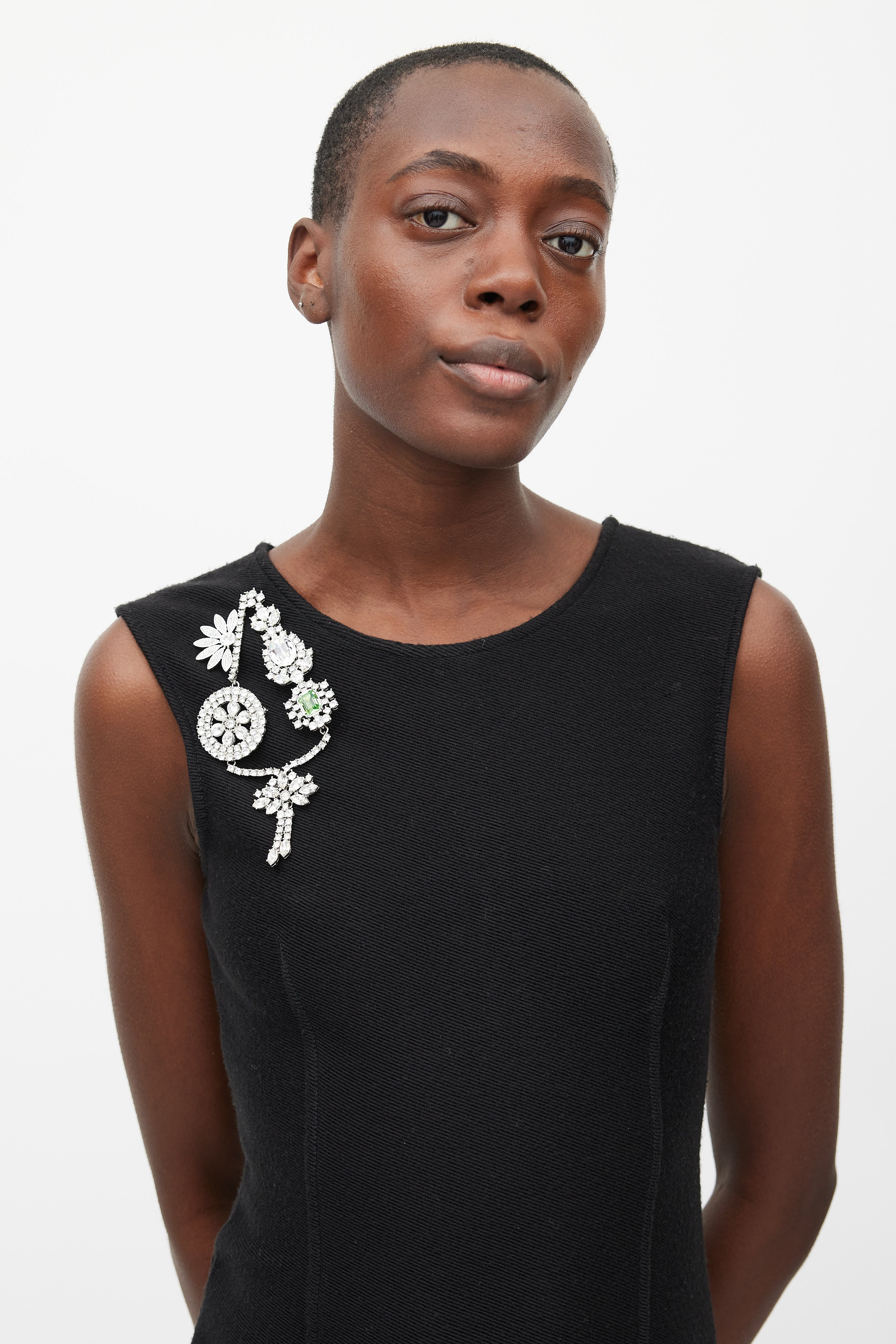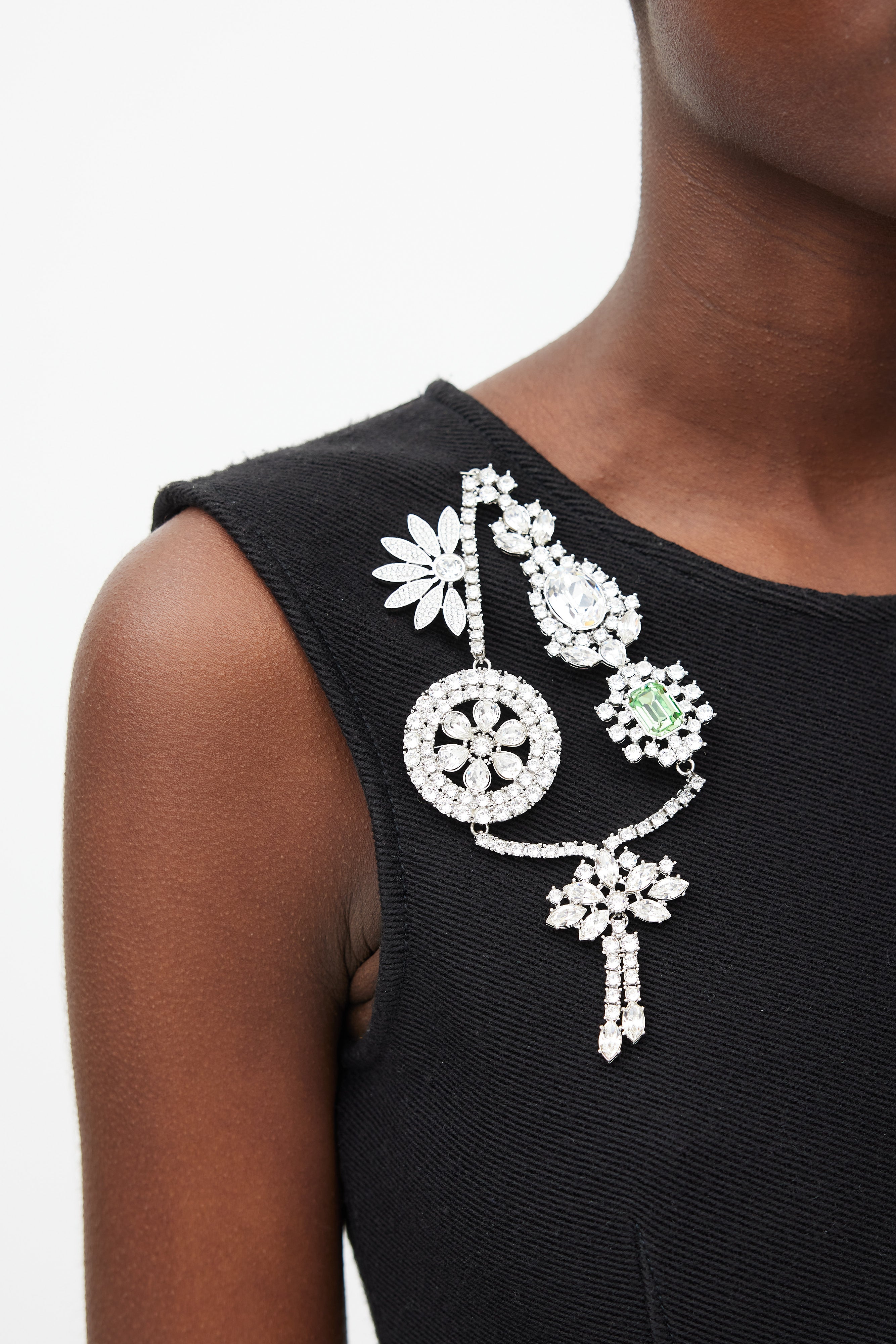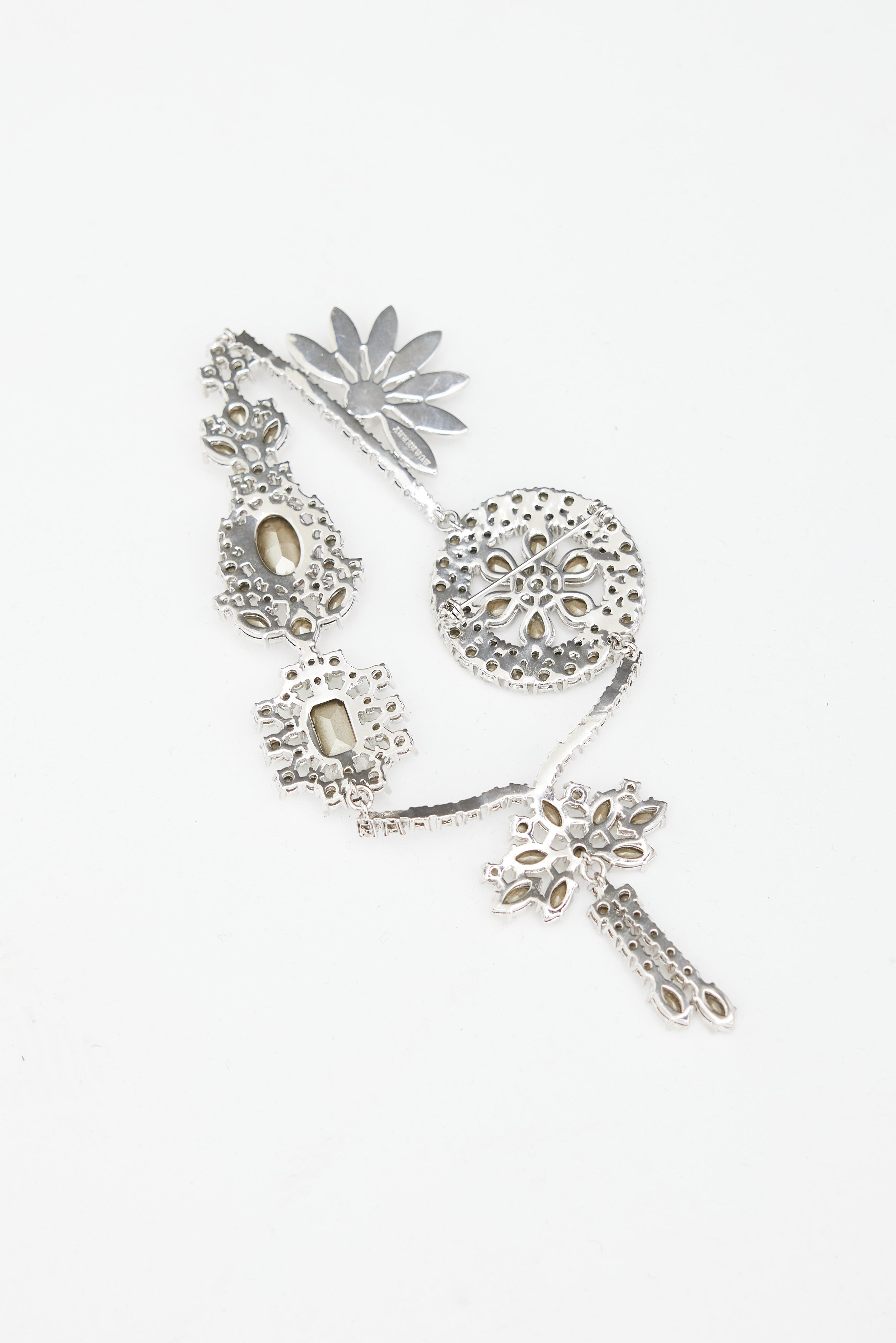 Pre-owned Burberry silver brooch featuring jewel embellishment, green drop jewel pendant, floral detailing, and pin closure.
