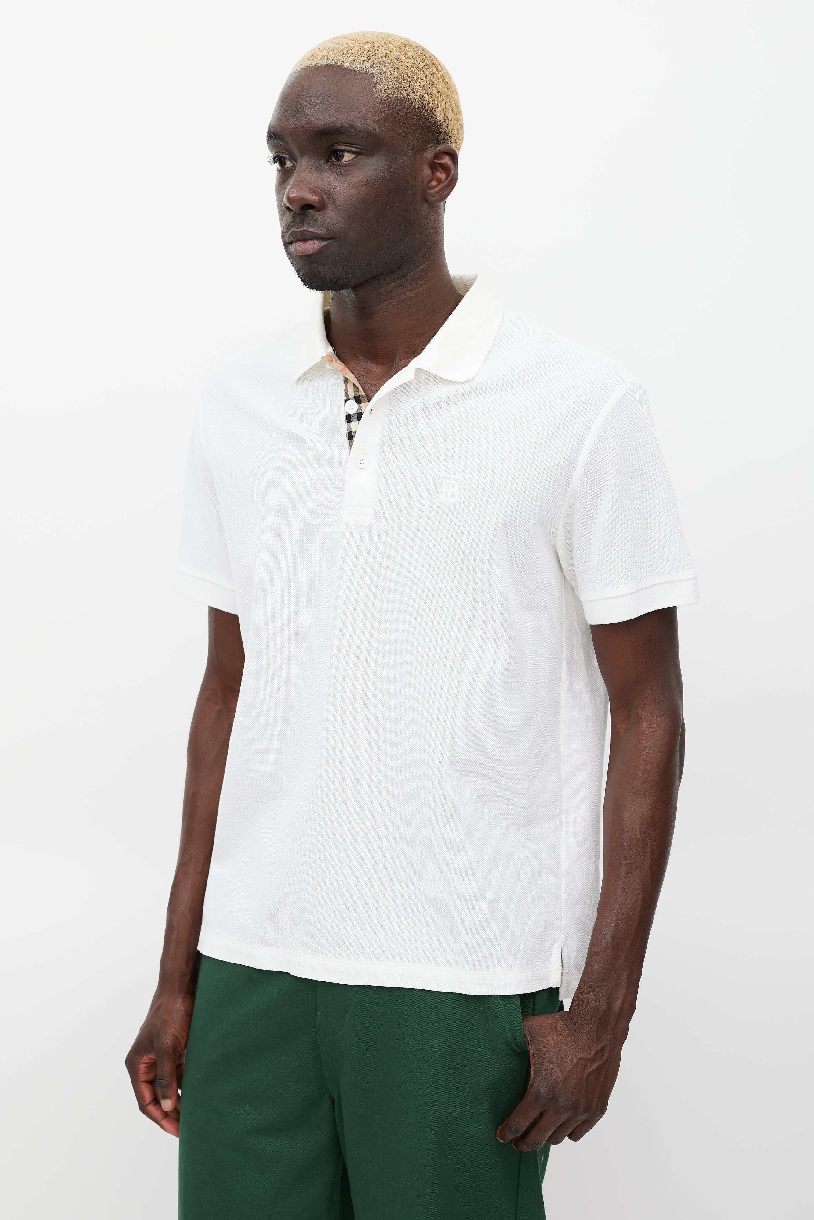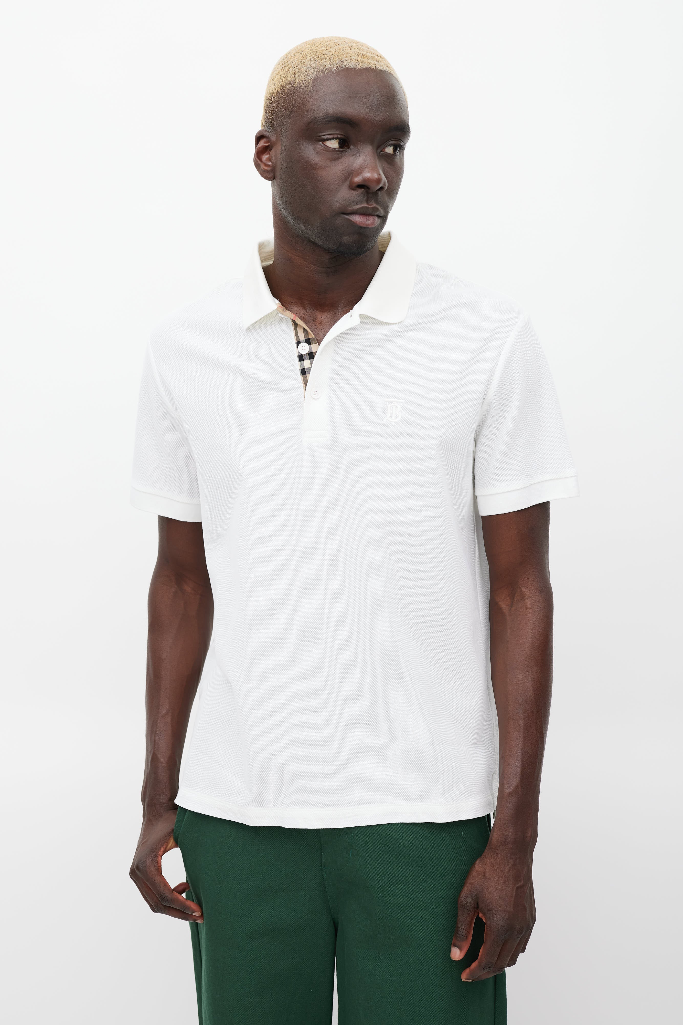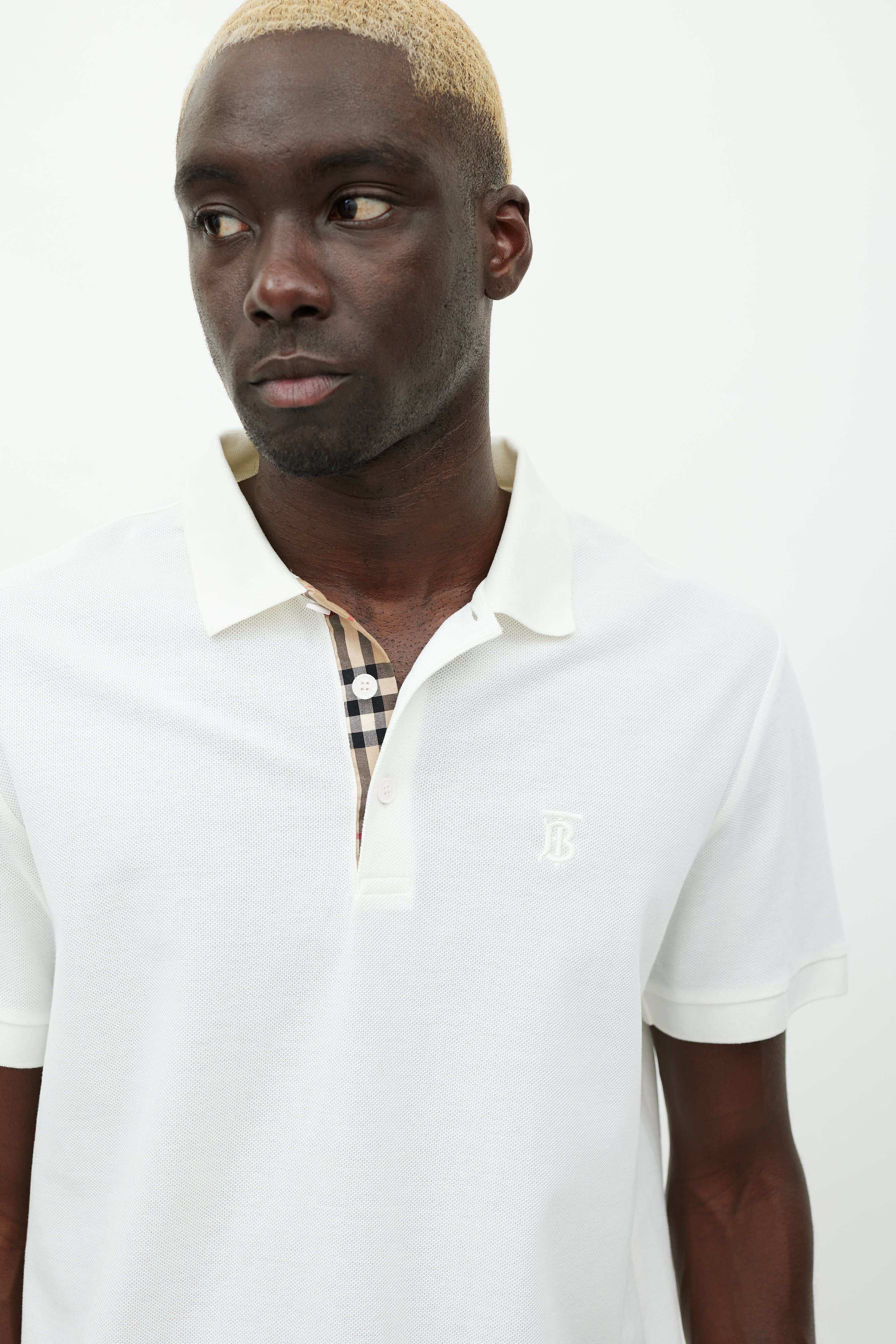 Pre-owned Burberry white polo featuring a collared neckline, button front with inner Nova check placket, embroidered TB monogram logo at left chest, high low hem, vents at sides, and short sleeves with ribbed trim.