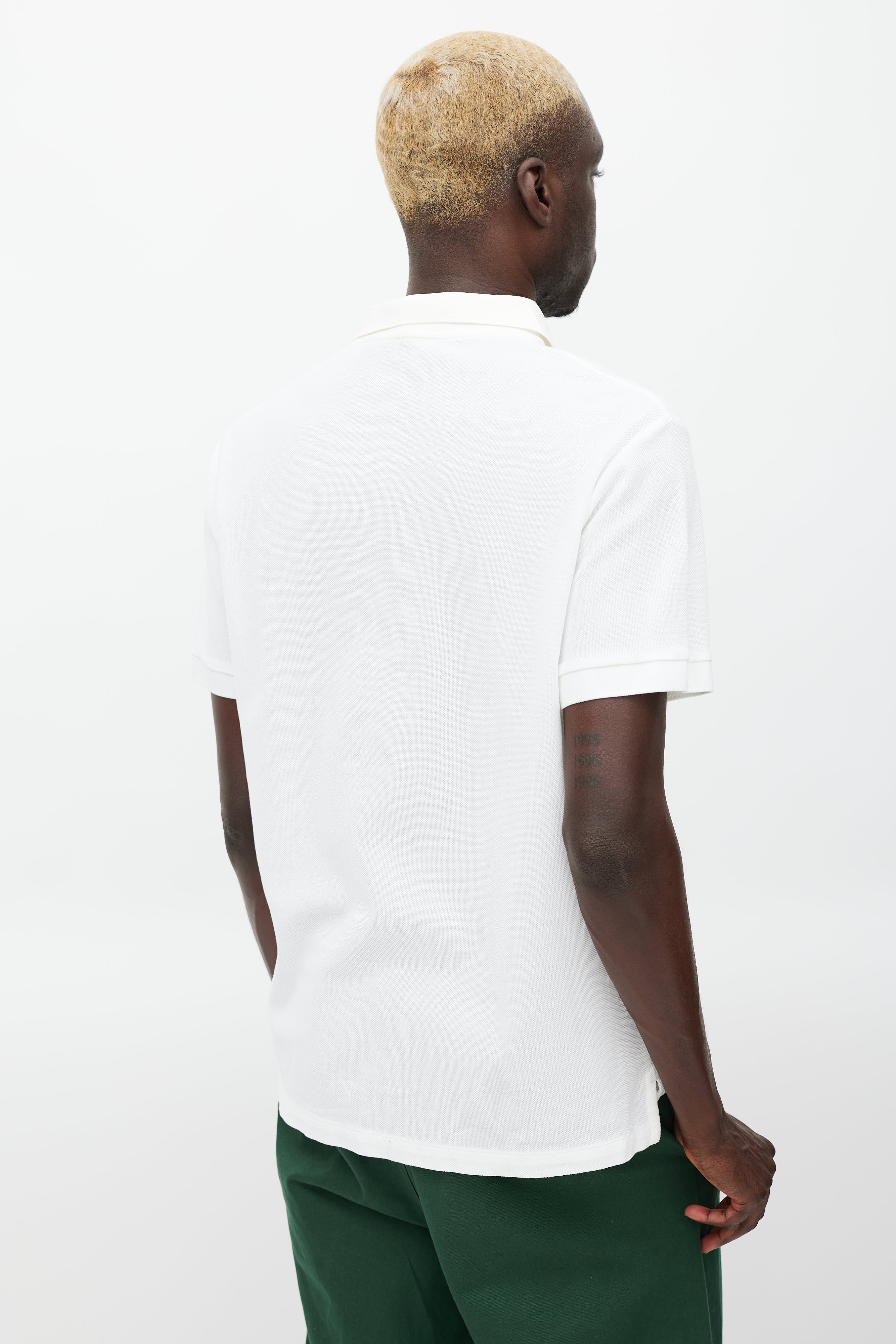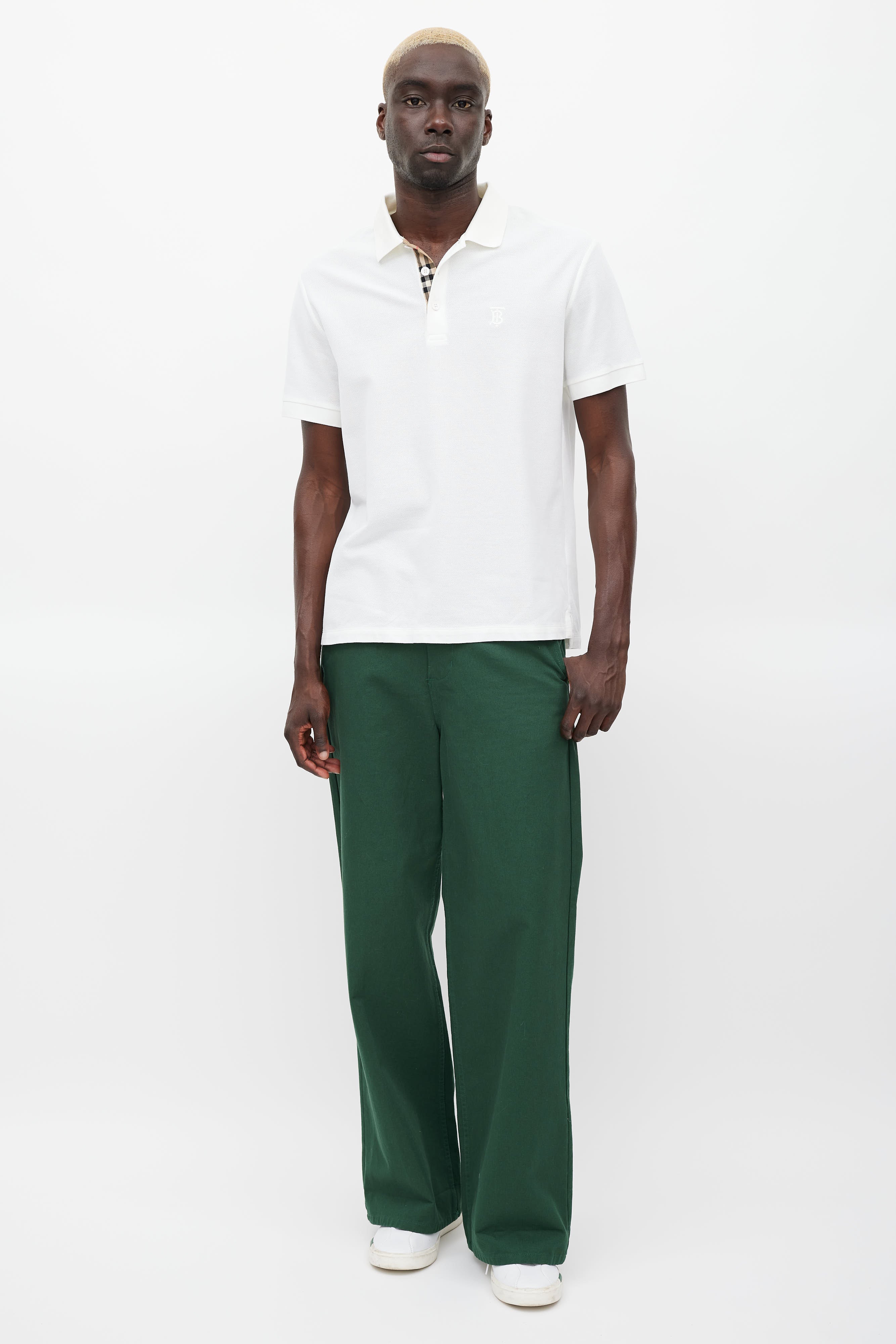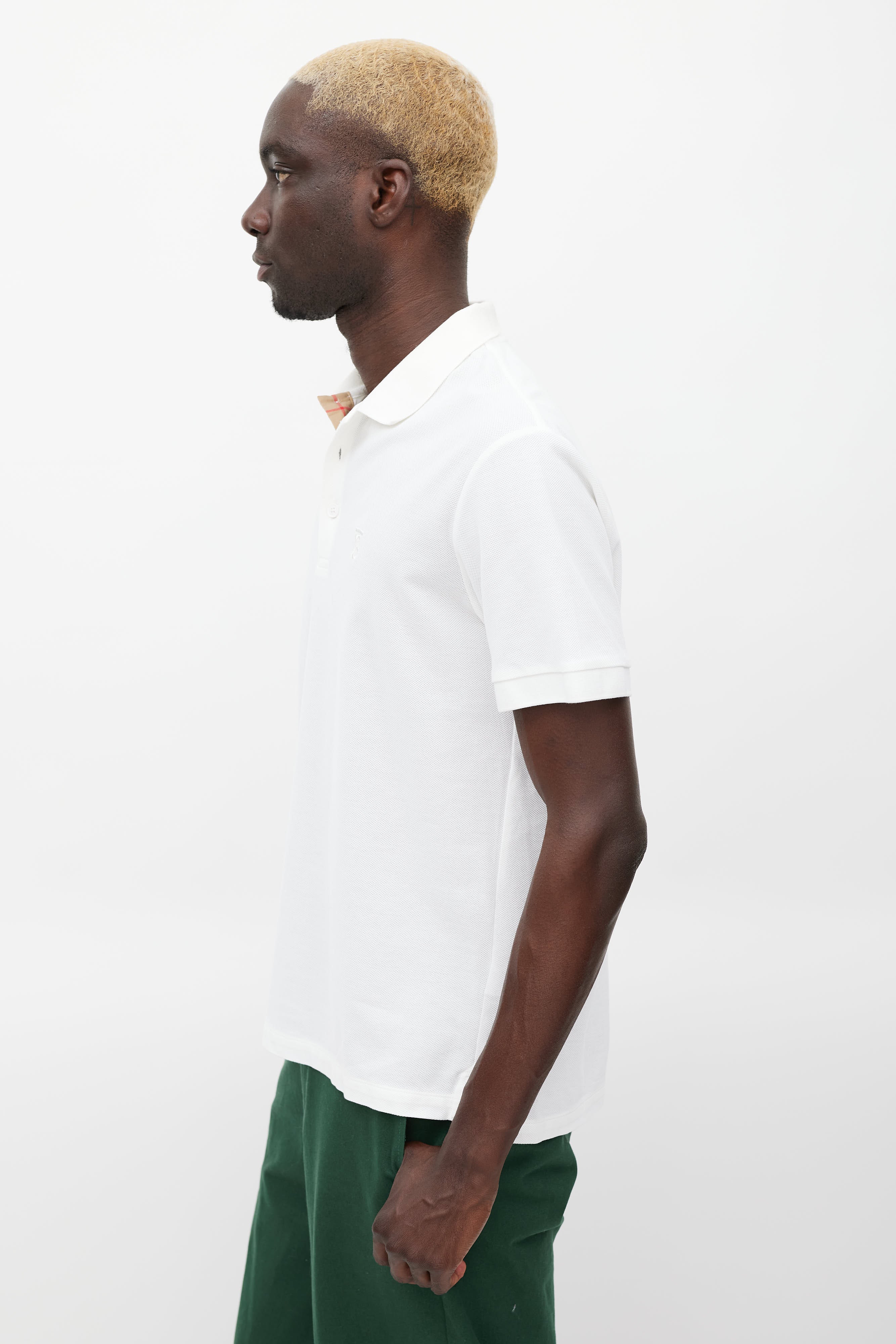 Pre-owned Burberry white polo featuring a collared neckline, button front with inner Nova check placket, embroidered TB monogram logo at left chest, high low hem, vents at sides, and short sleeves with ribbed trim.