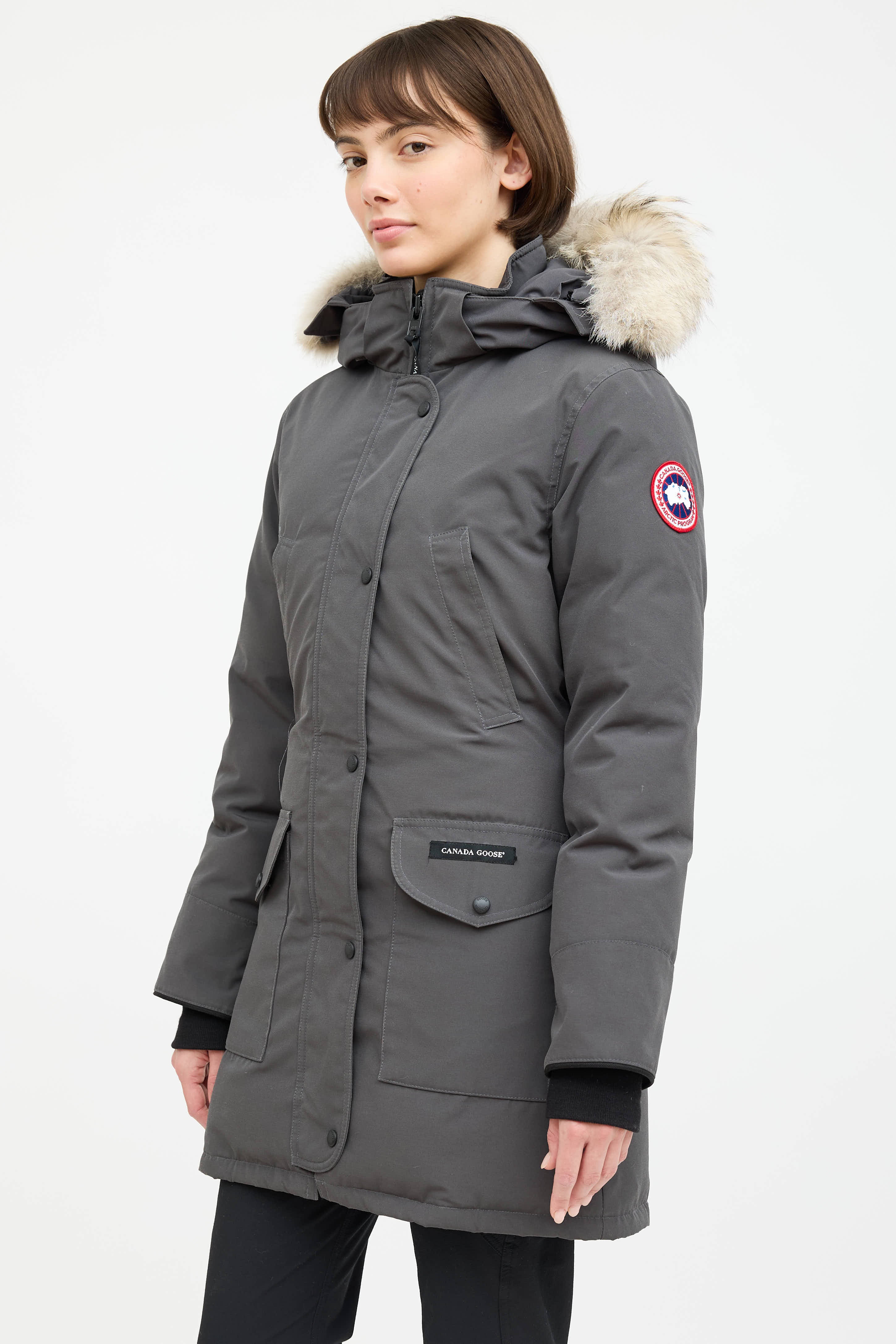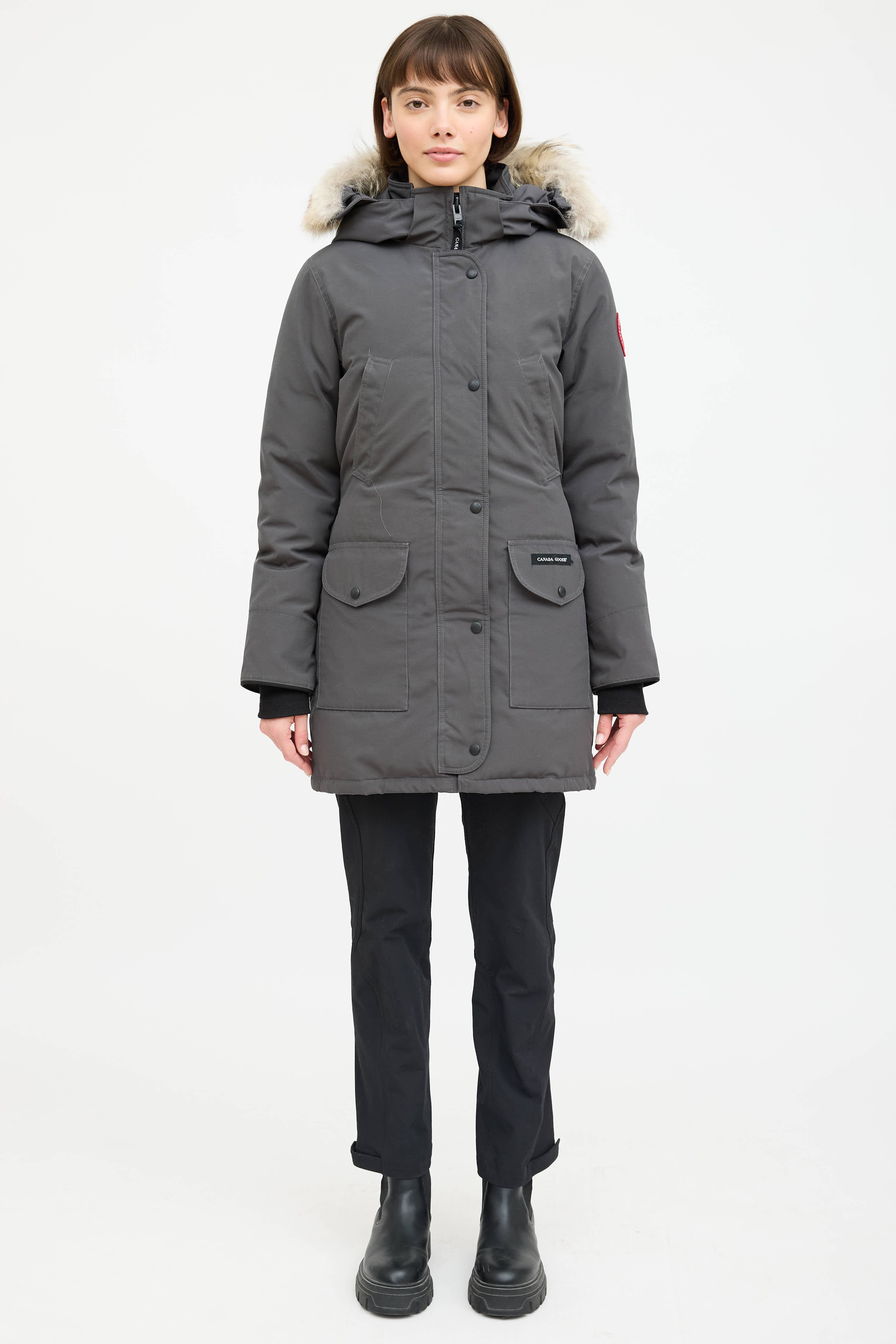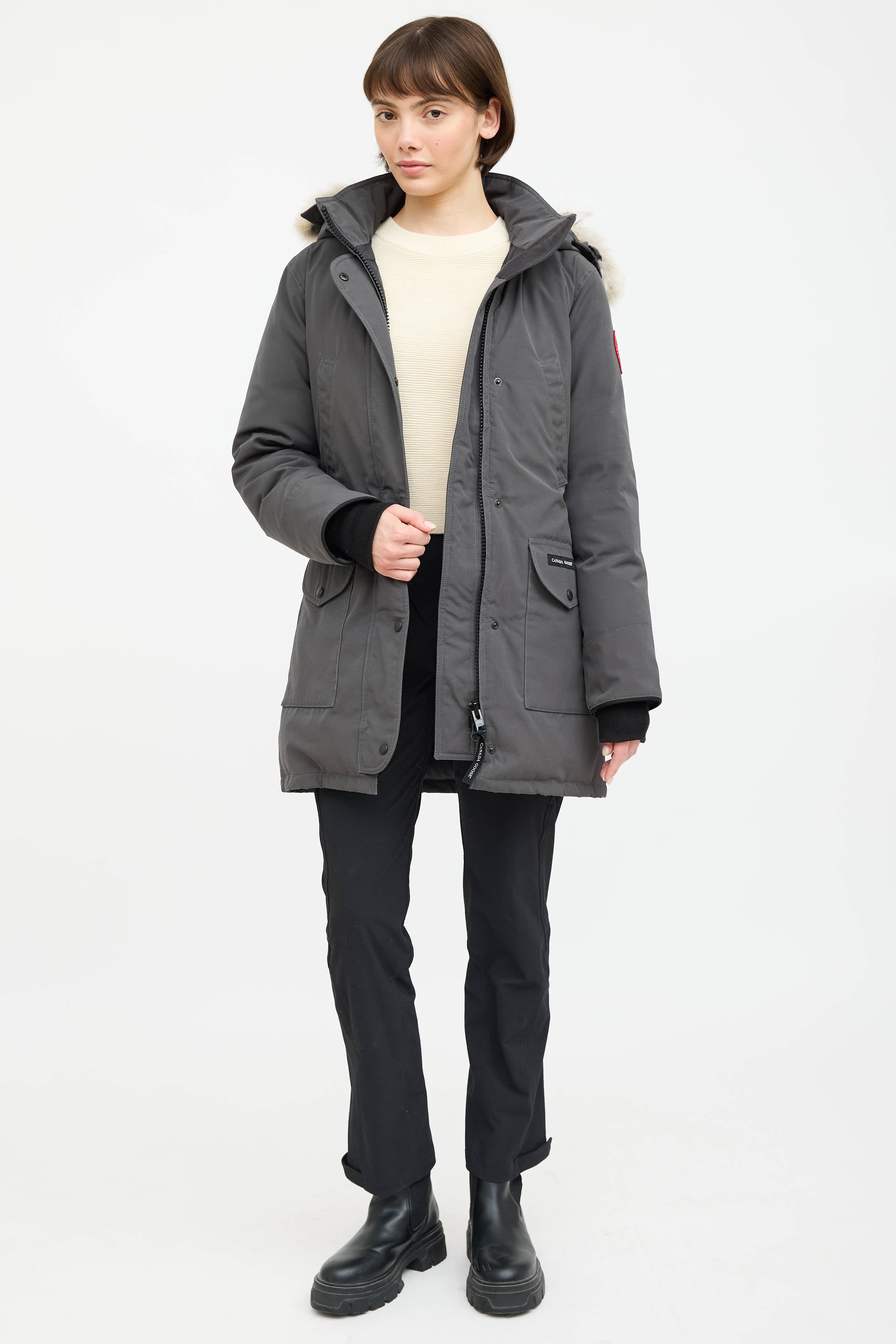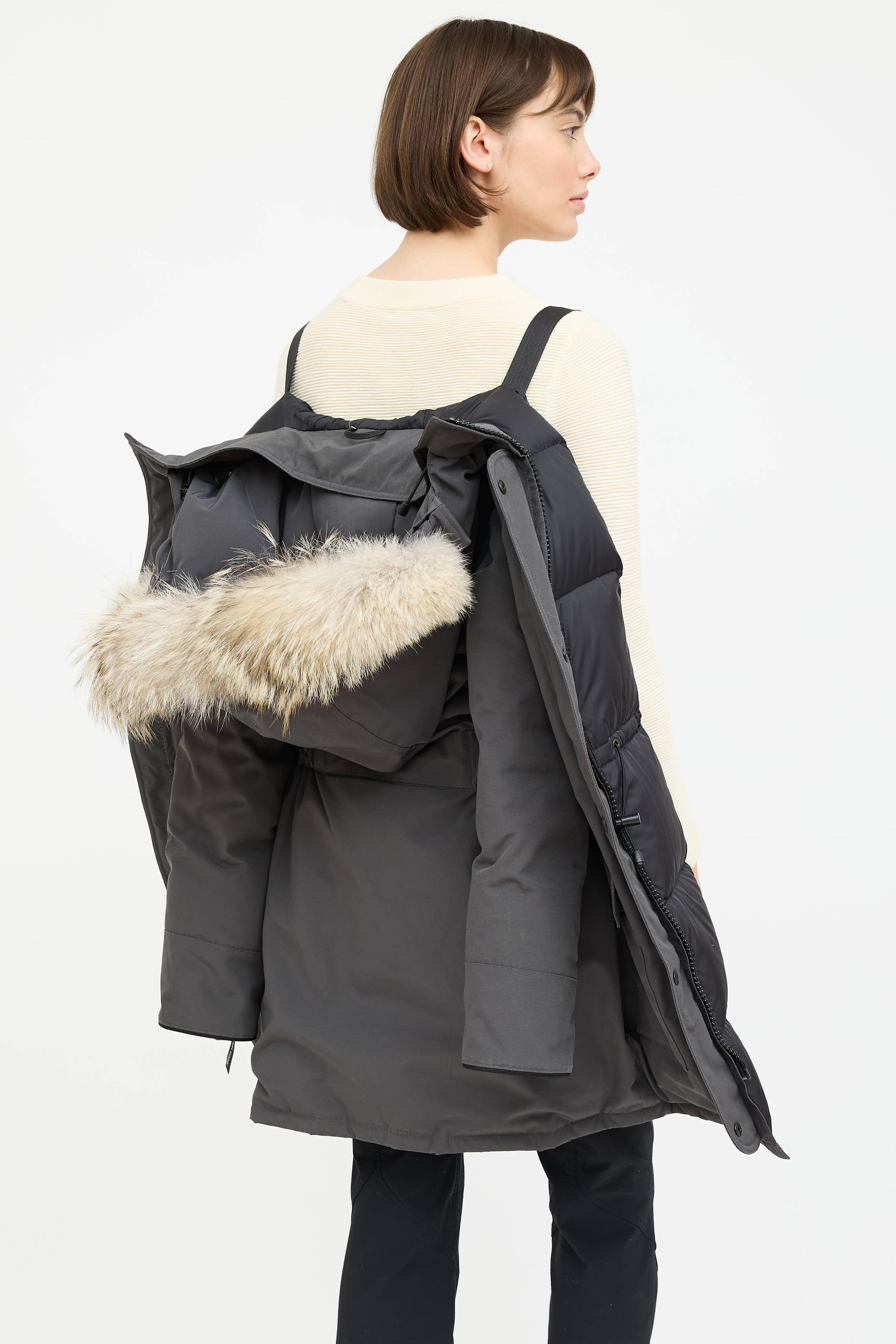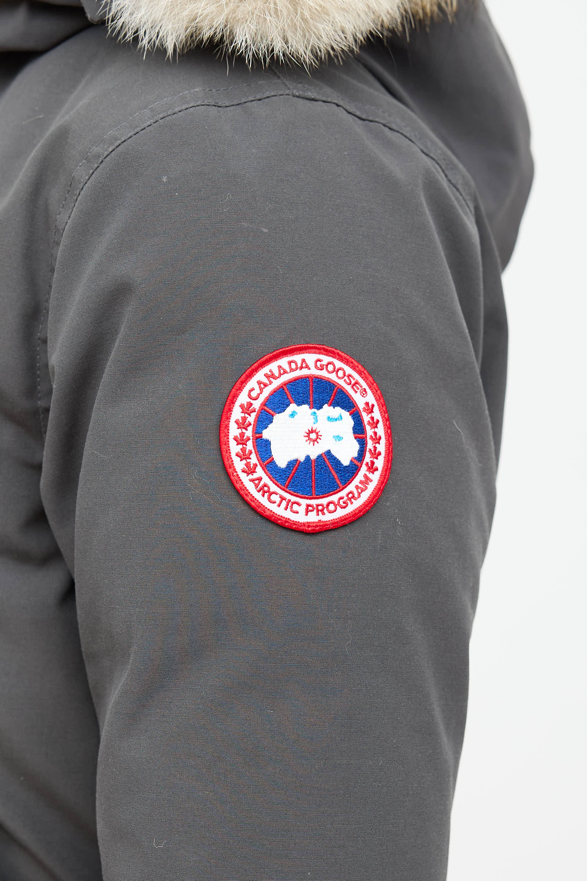 Pre-owned Canada Goose grey down parka jacket featuring removeable hood with fur trim, drawstring on hood, webbed strap on back of hood, knit cuffs, zip closure with snap buttons, dual slip pockets on chest, dual flap pockets on waist with snap button closure, logo patch on left sleeve, cinched back of waist with interior drawstring, and interior backpack straps.