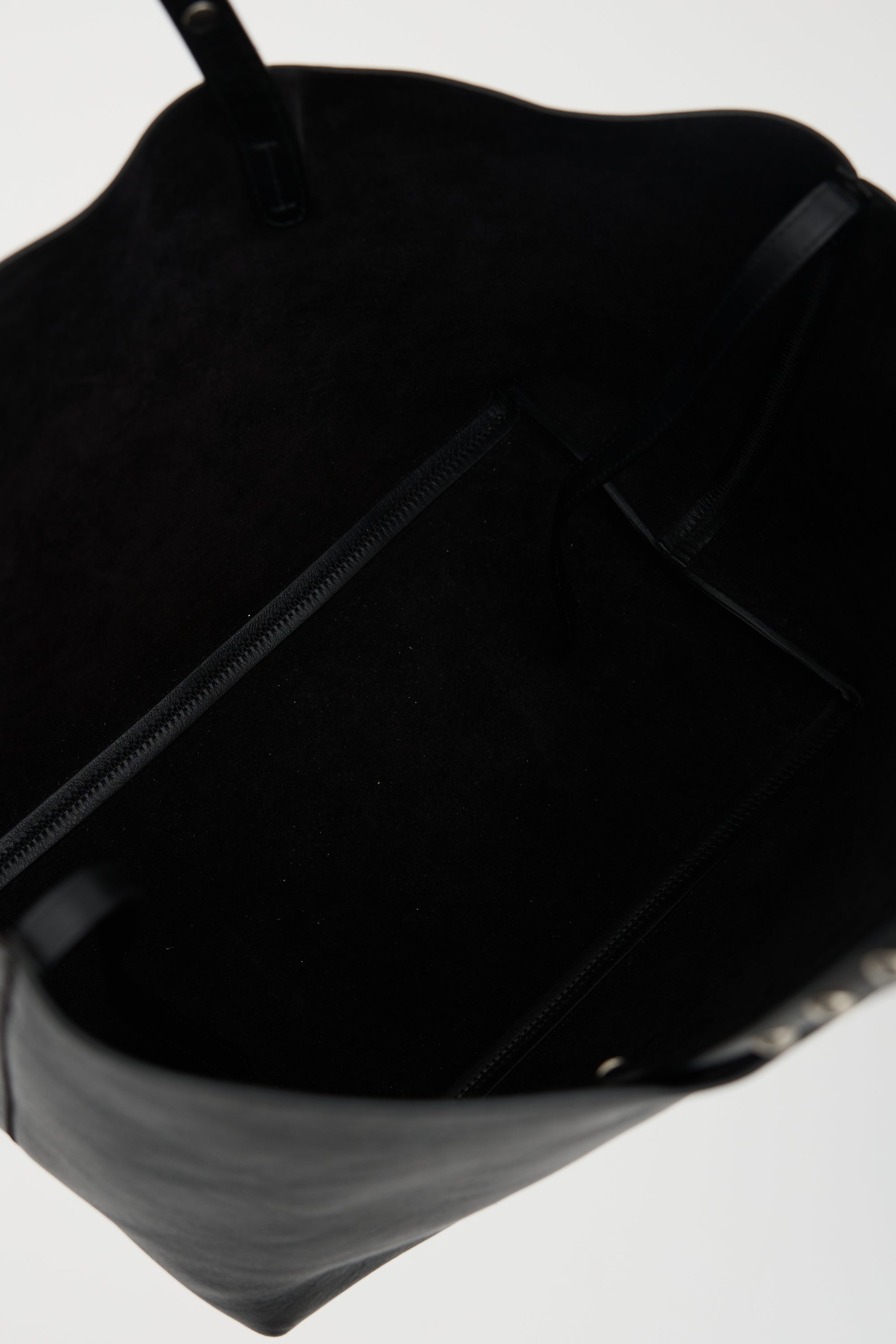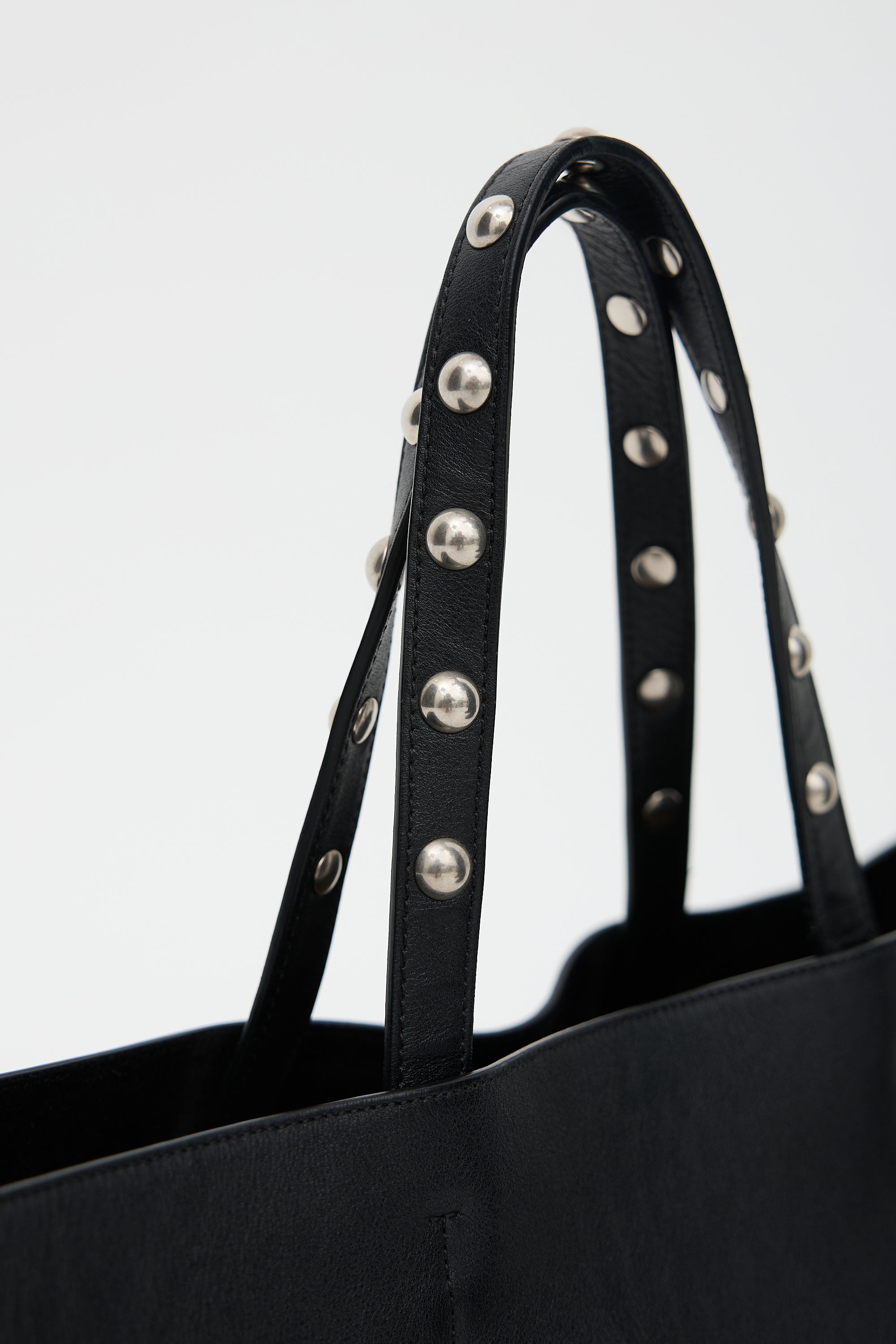 Pre-owned Celine black leather Cabas Phantom tote bag featuring silver tone studs at shoulder straps, silver tone logo stamp at front, elongated straps at sides, open compartment, and suede interior.