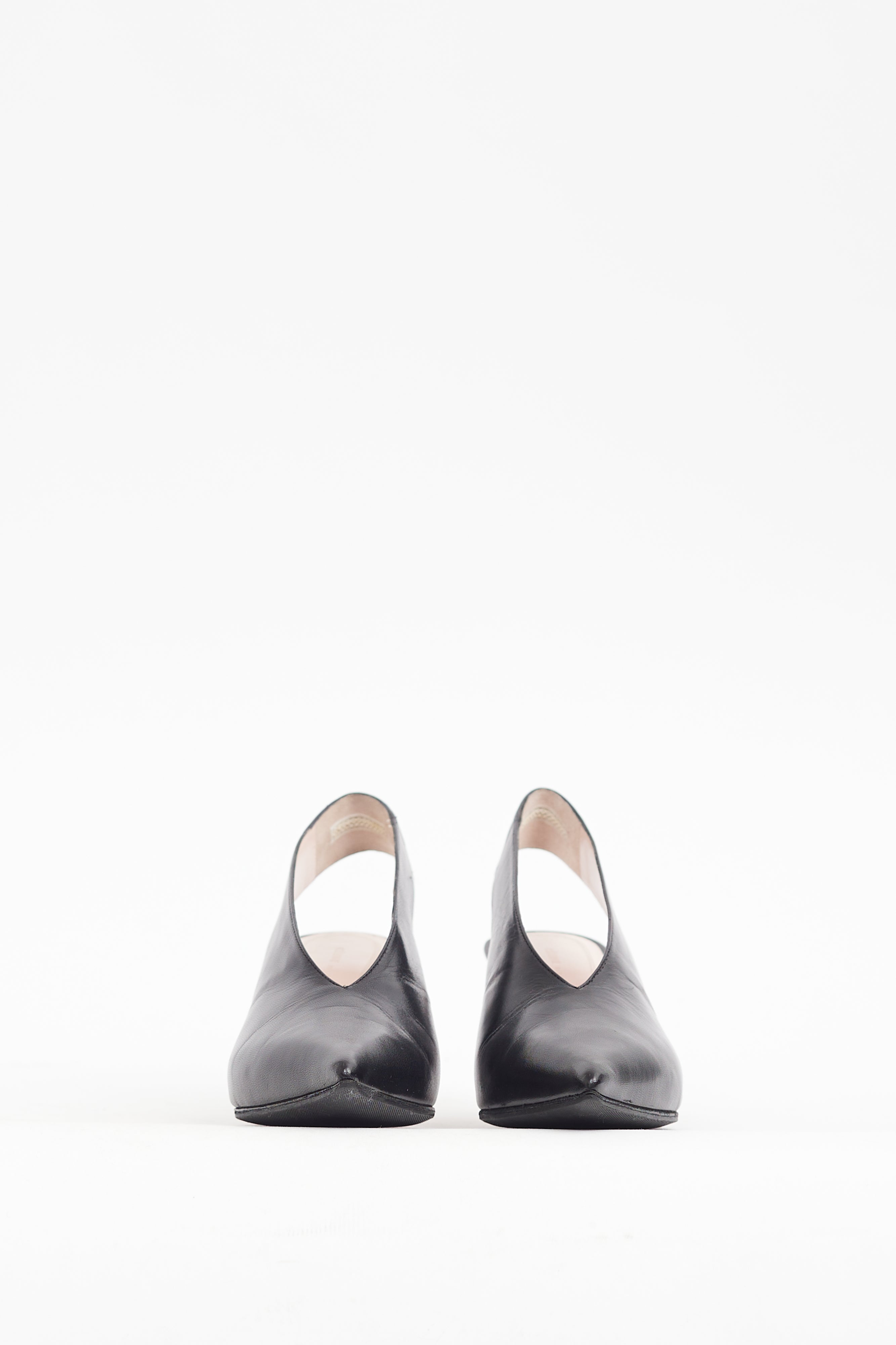 Pre-owned Celine black heels featuring a pointed toe, leather uppers, V-cut at throat, slingback strap, and a short covered stiletto heel. Comes with original dust bag.