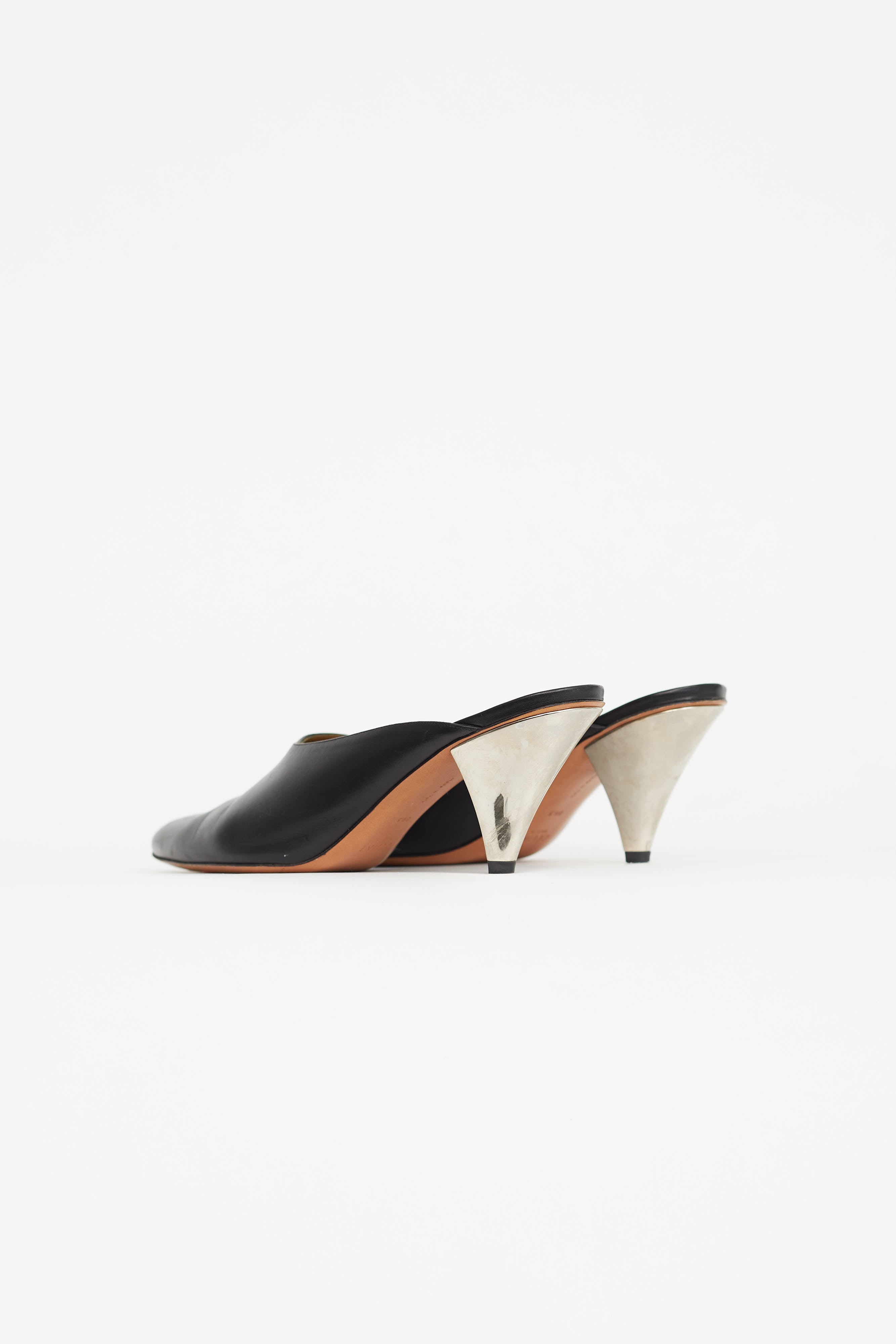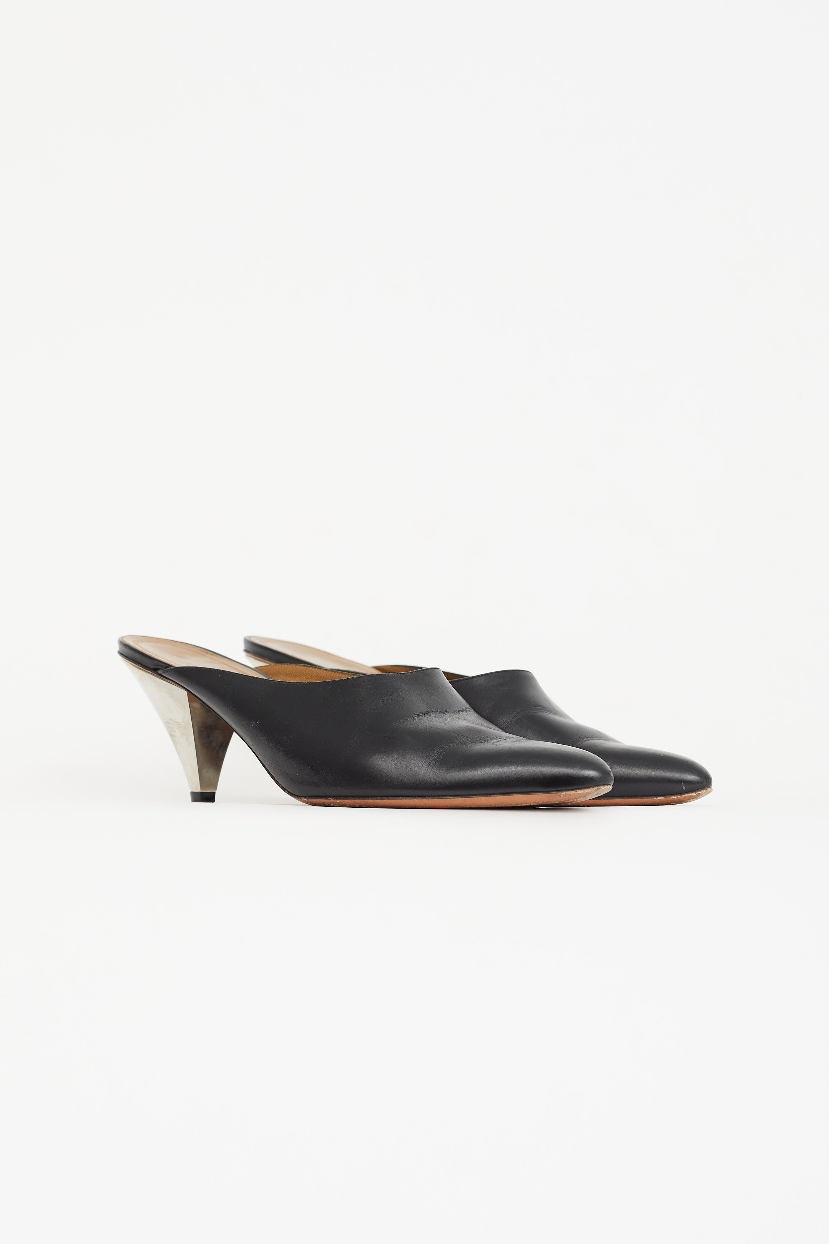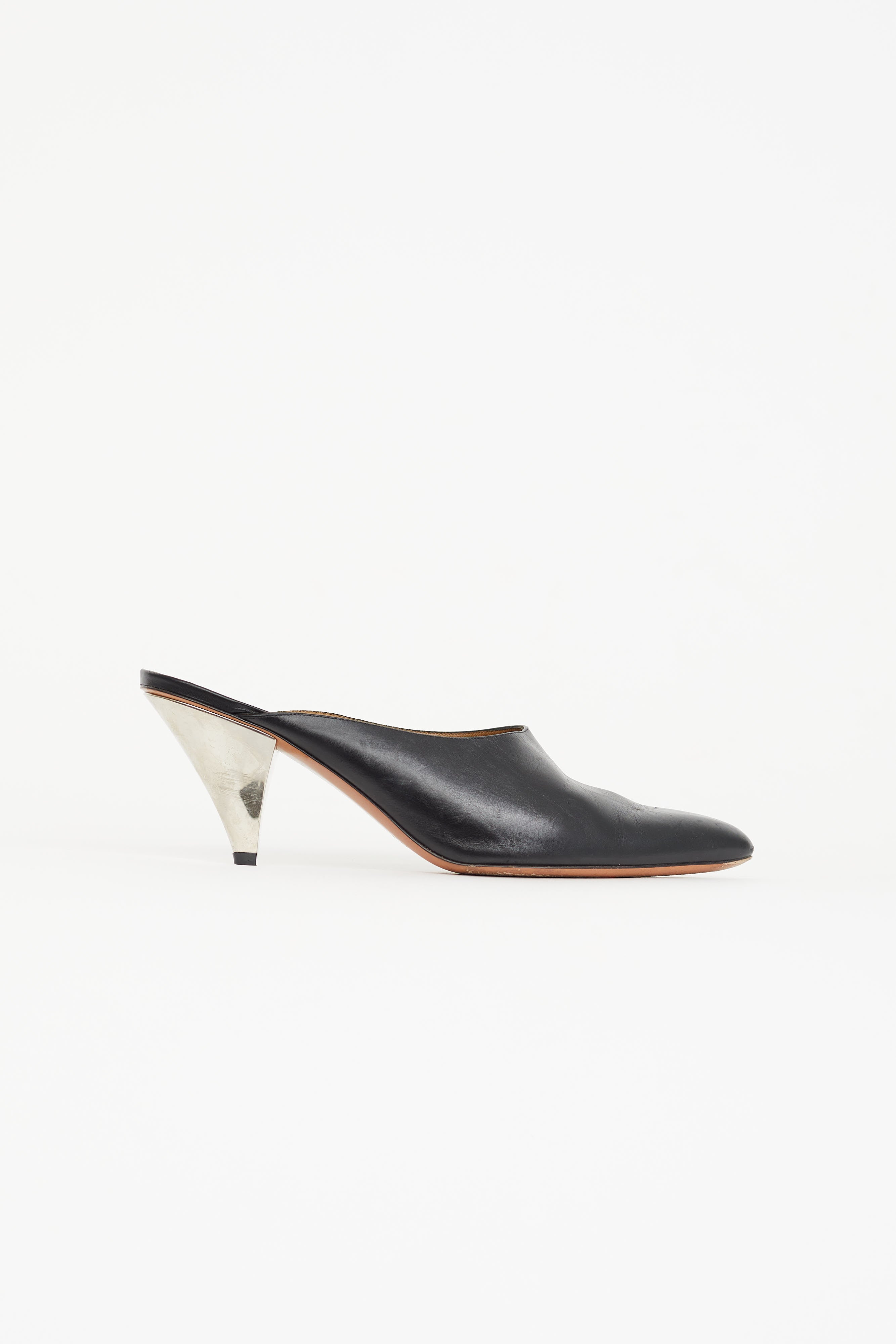 Pre-owned Celine mules in black featuring pointed toe, silver mirrored cone heel, and leather insole with gold logo stamp.
