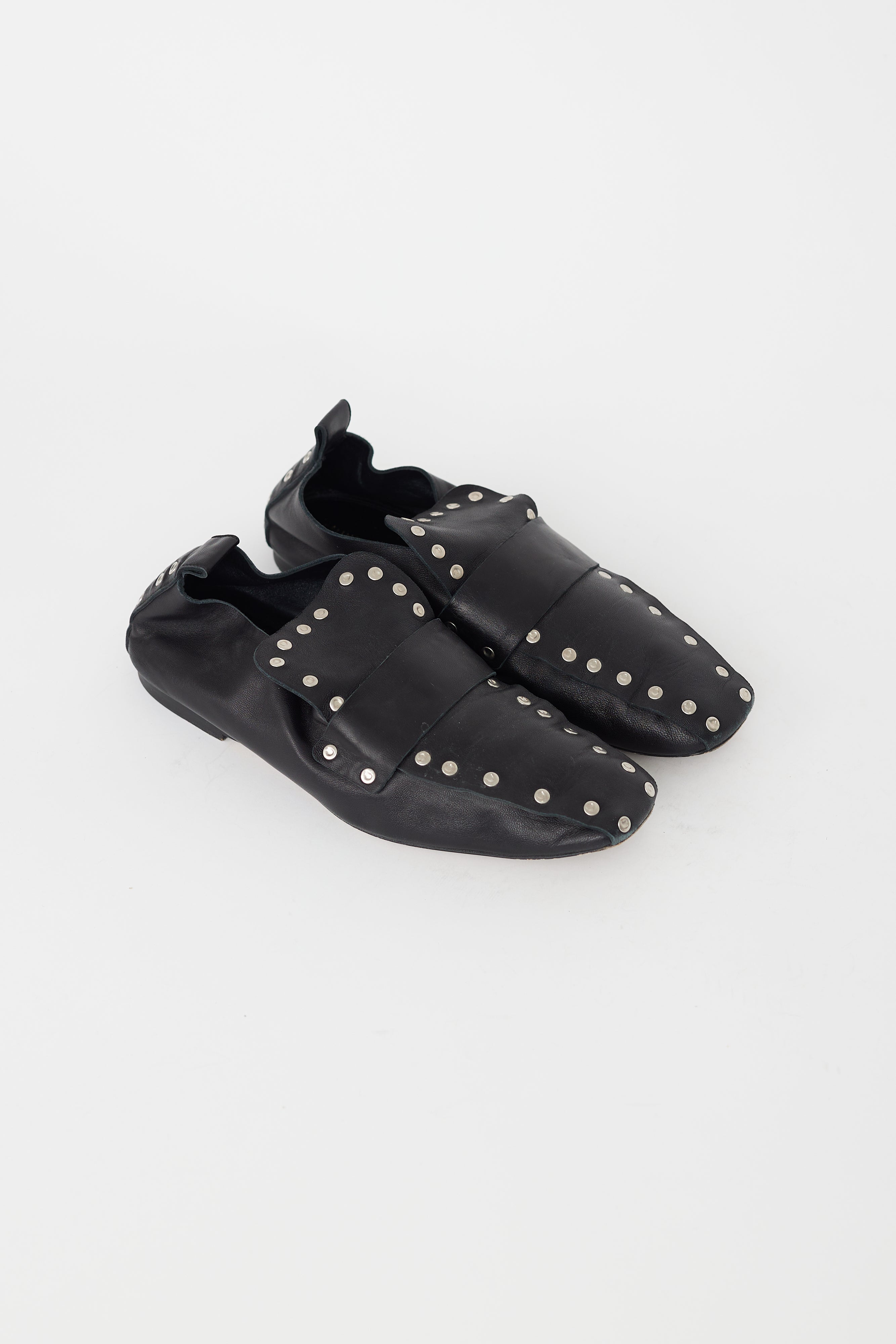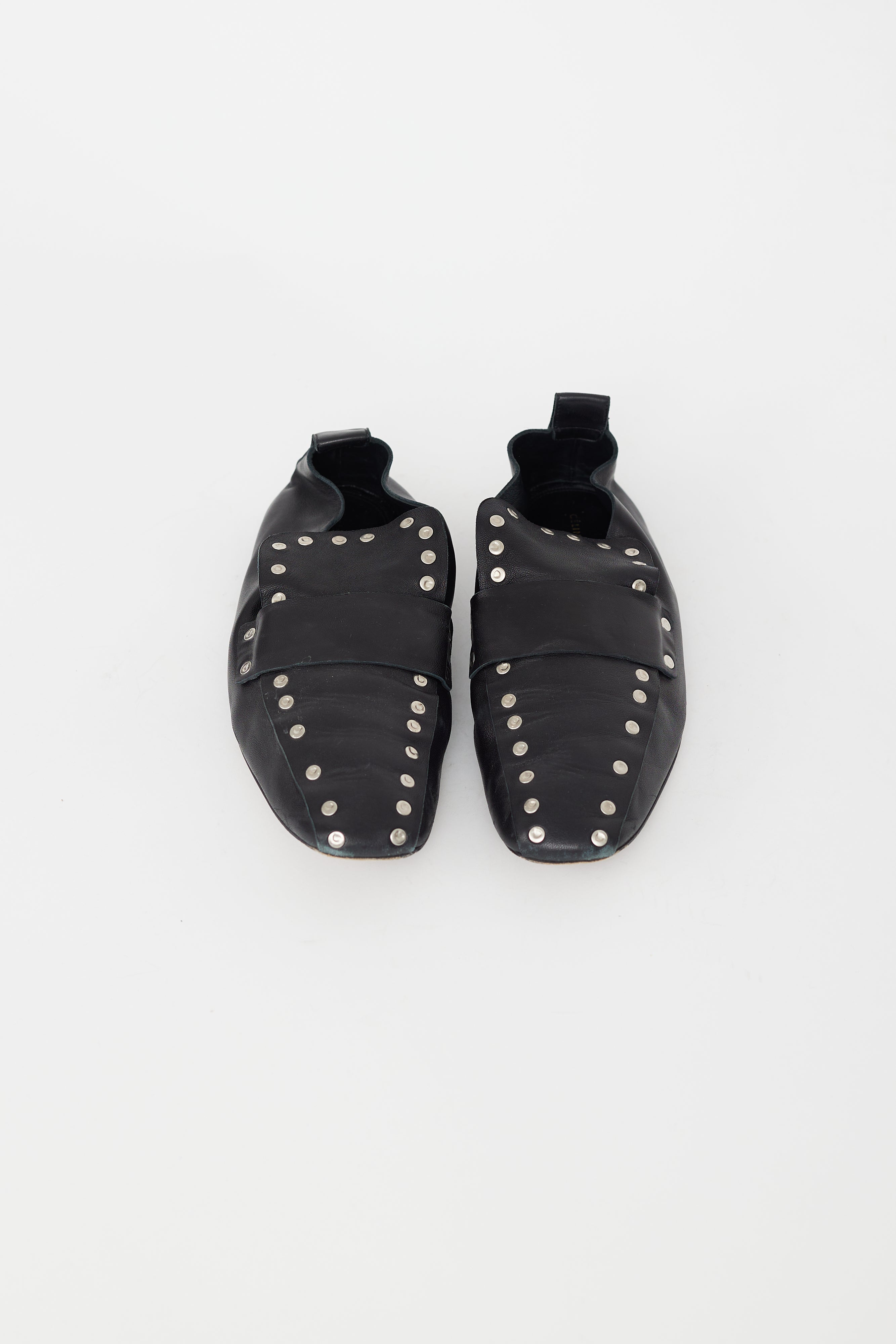 Pre-owned Celine black leather loafers featuring a tapered square toe, oversized tongue and strap at vamp, silver tone studs throughout, leather pull tab at back, and leather outsole. Comes with original dust bag.