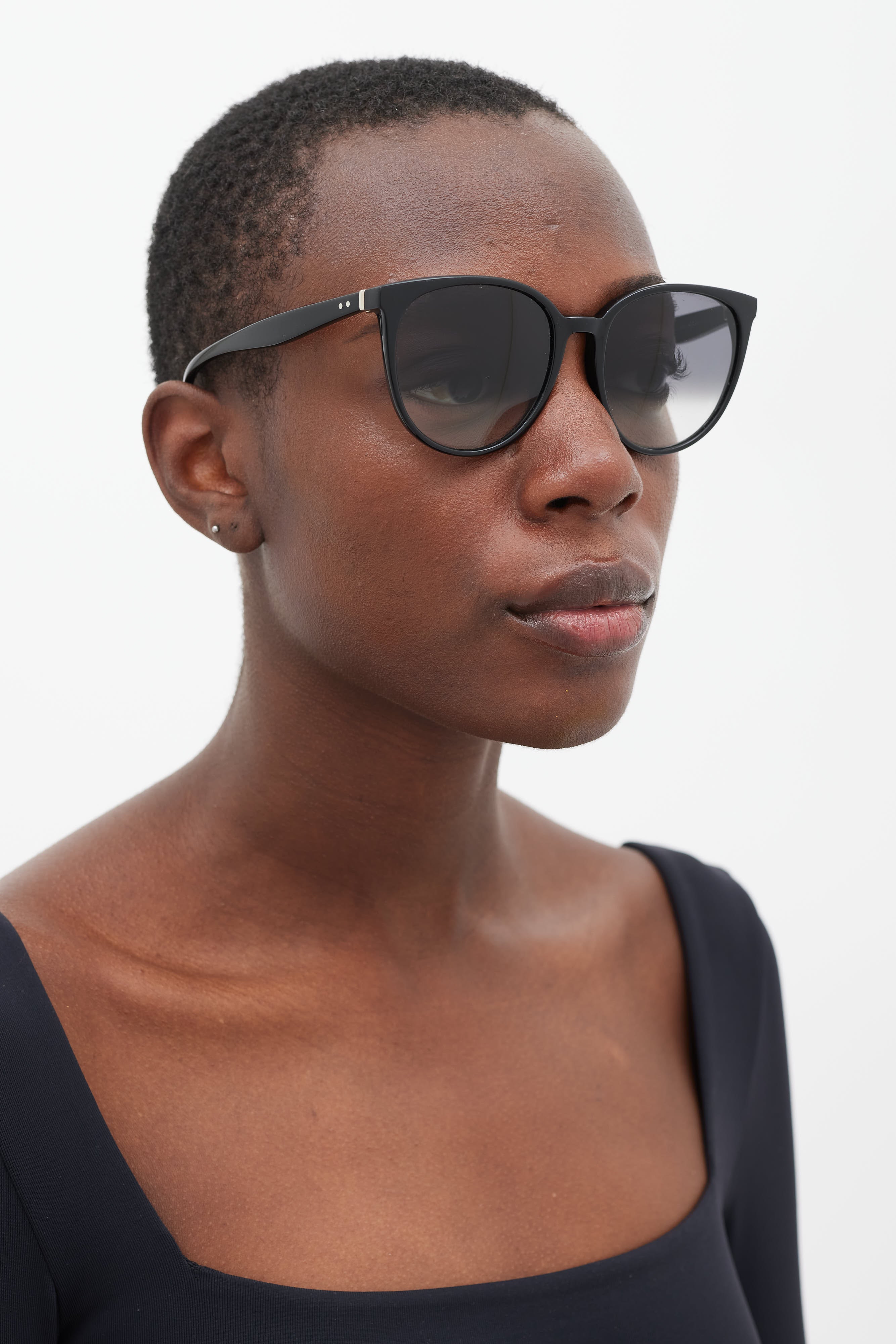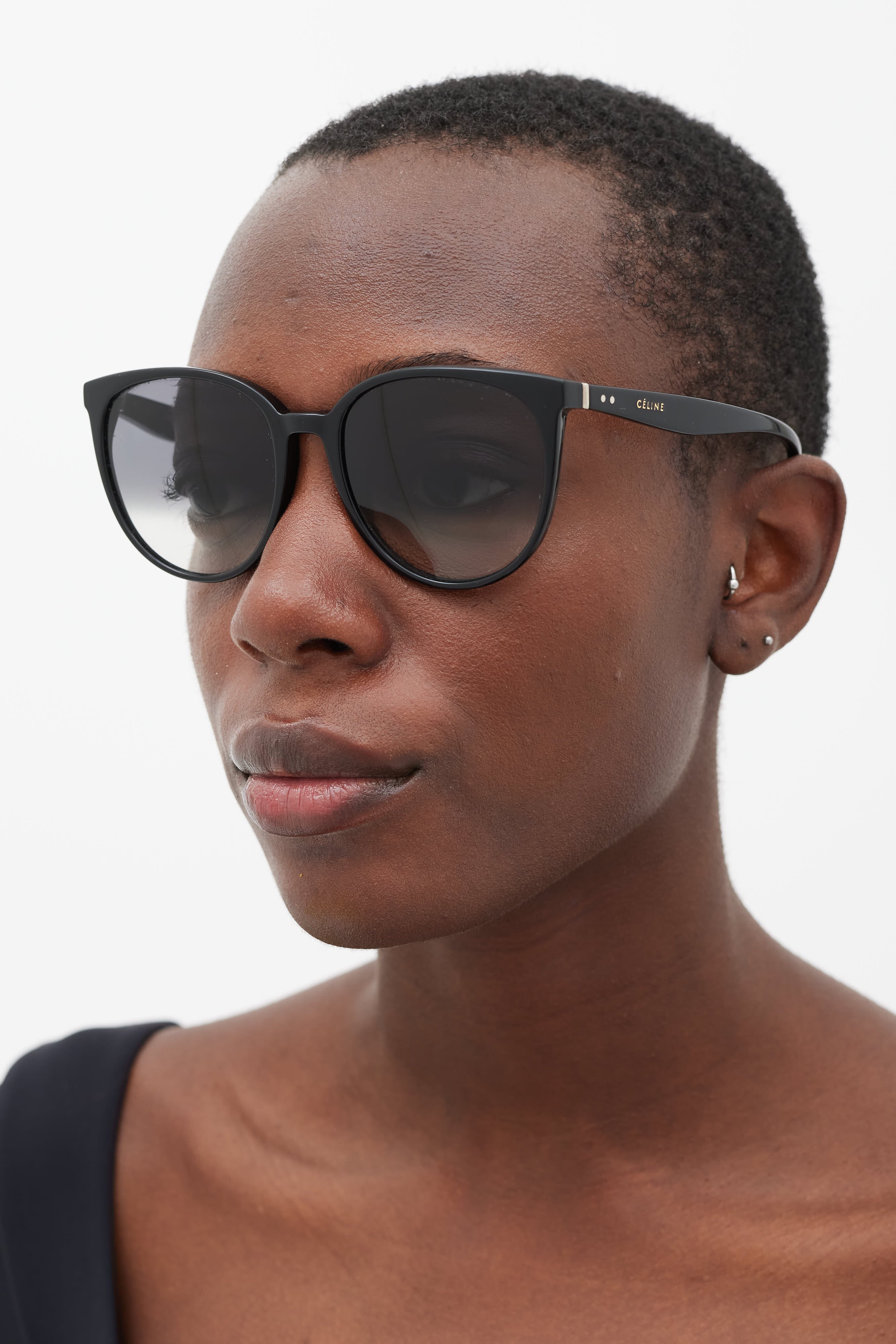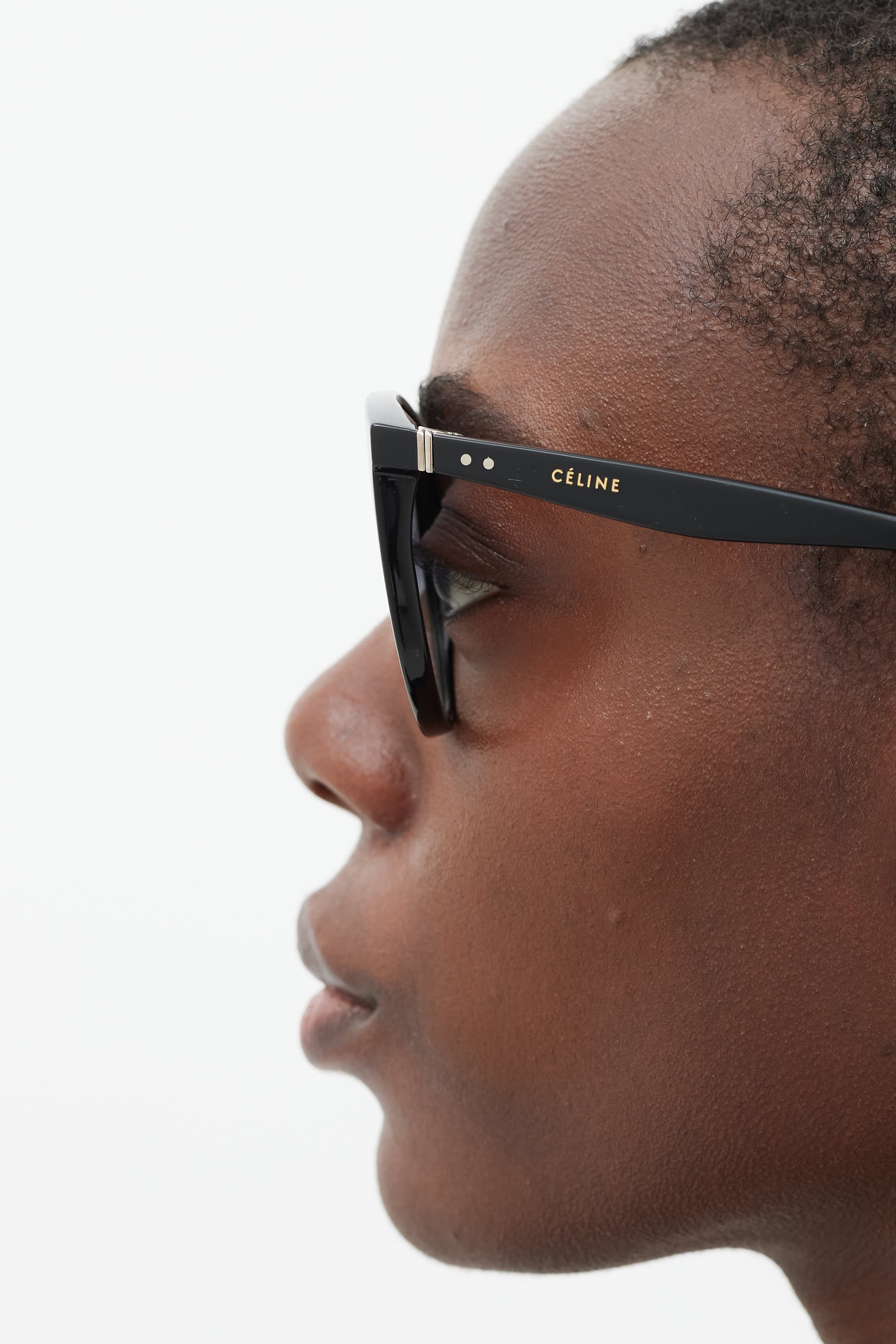 Pre-owned Celine black Thin Mary sunglasses featuring cat eye shape, black rim and arm, silver tone hardware, and gold logo stamp on arm. Comes with pouch.