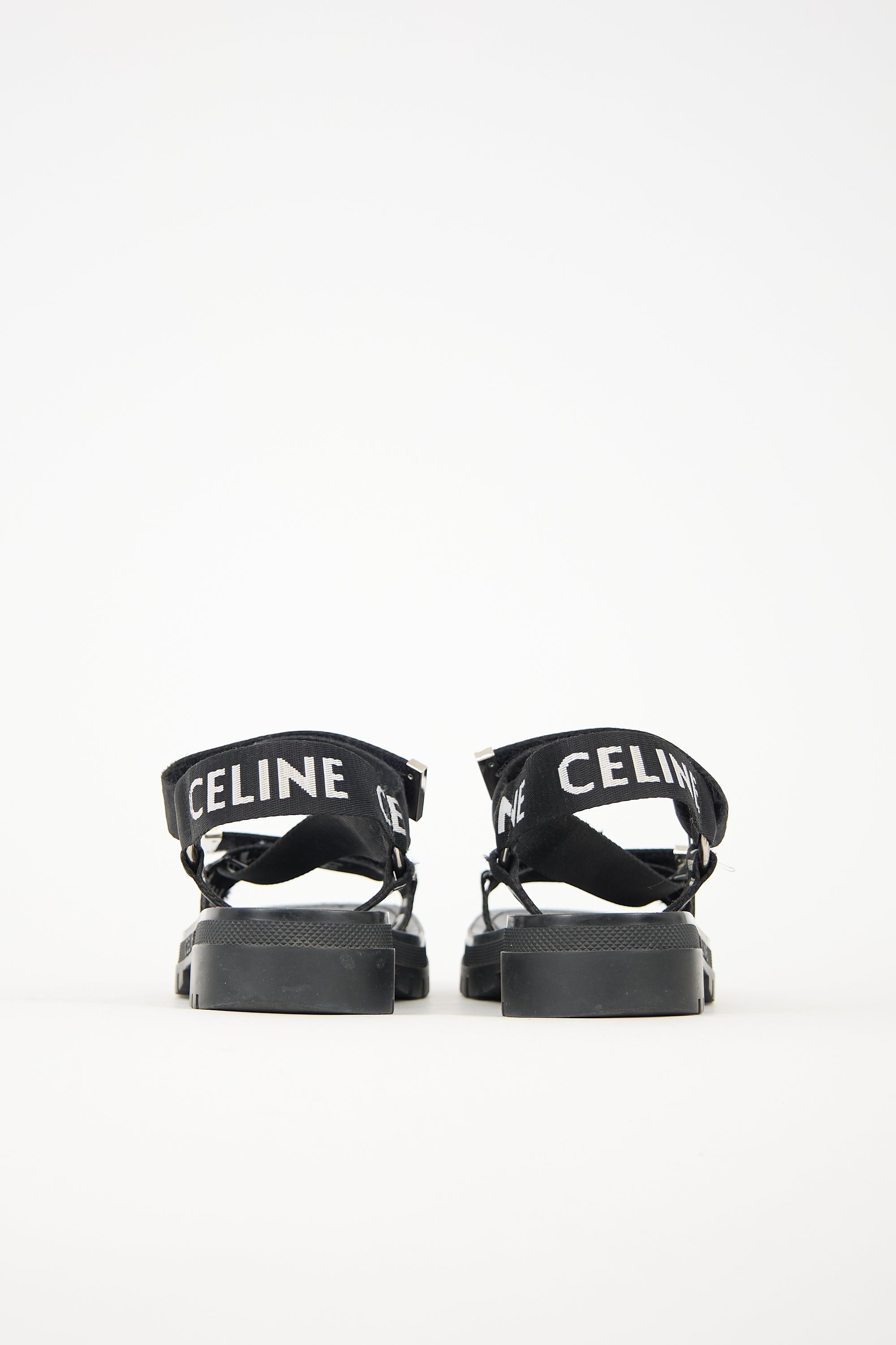 Pre-owned Celine black sandals featuring open square toe, adjustable Velcro strappy upper with embroidered logo embellishment, debossed logo at outer midsole, and rubber tread sole.