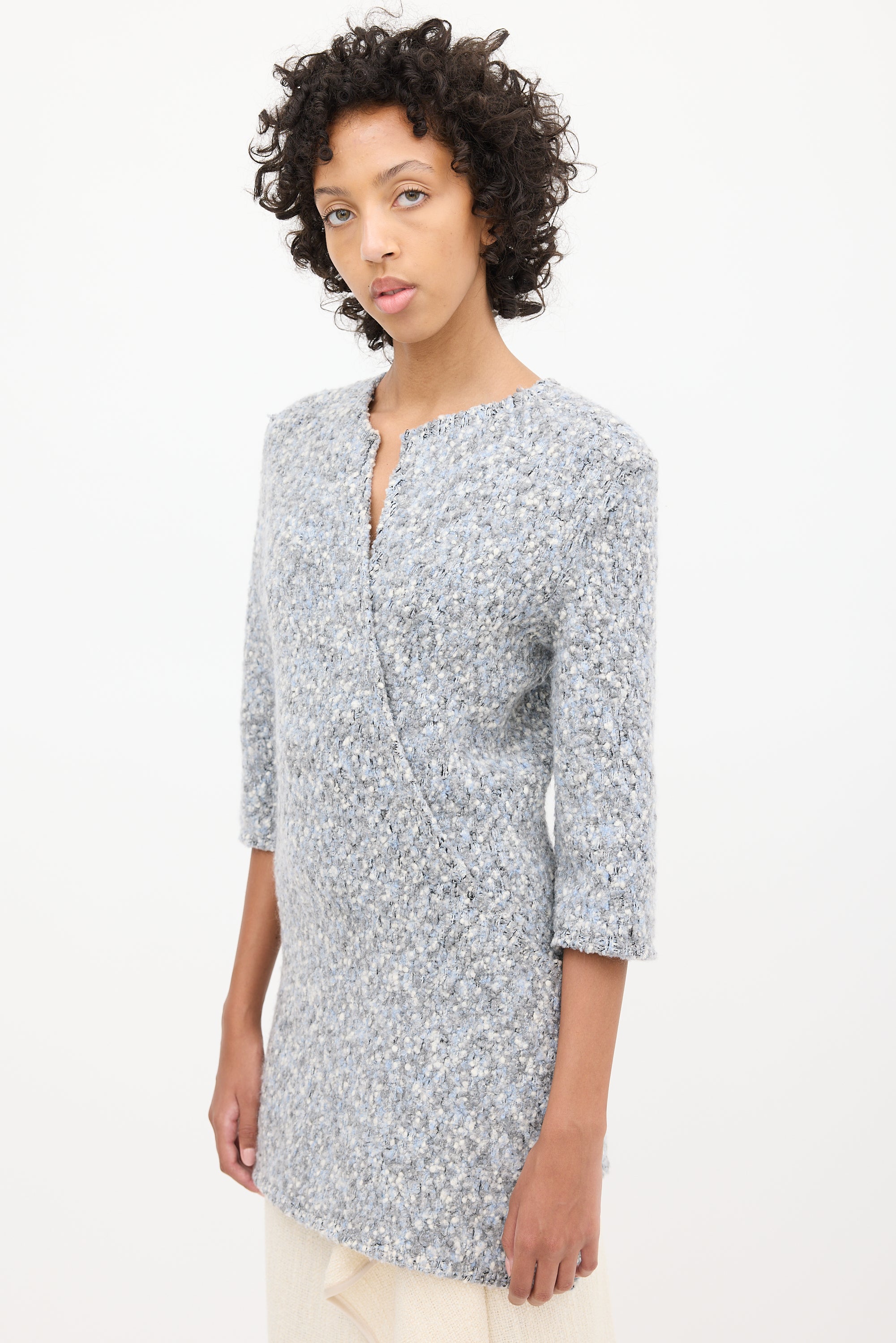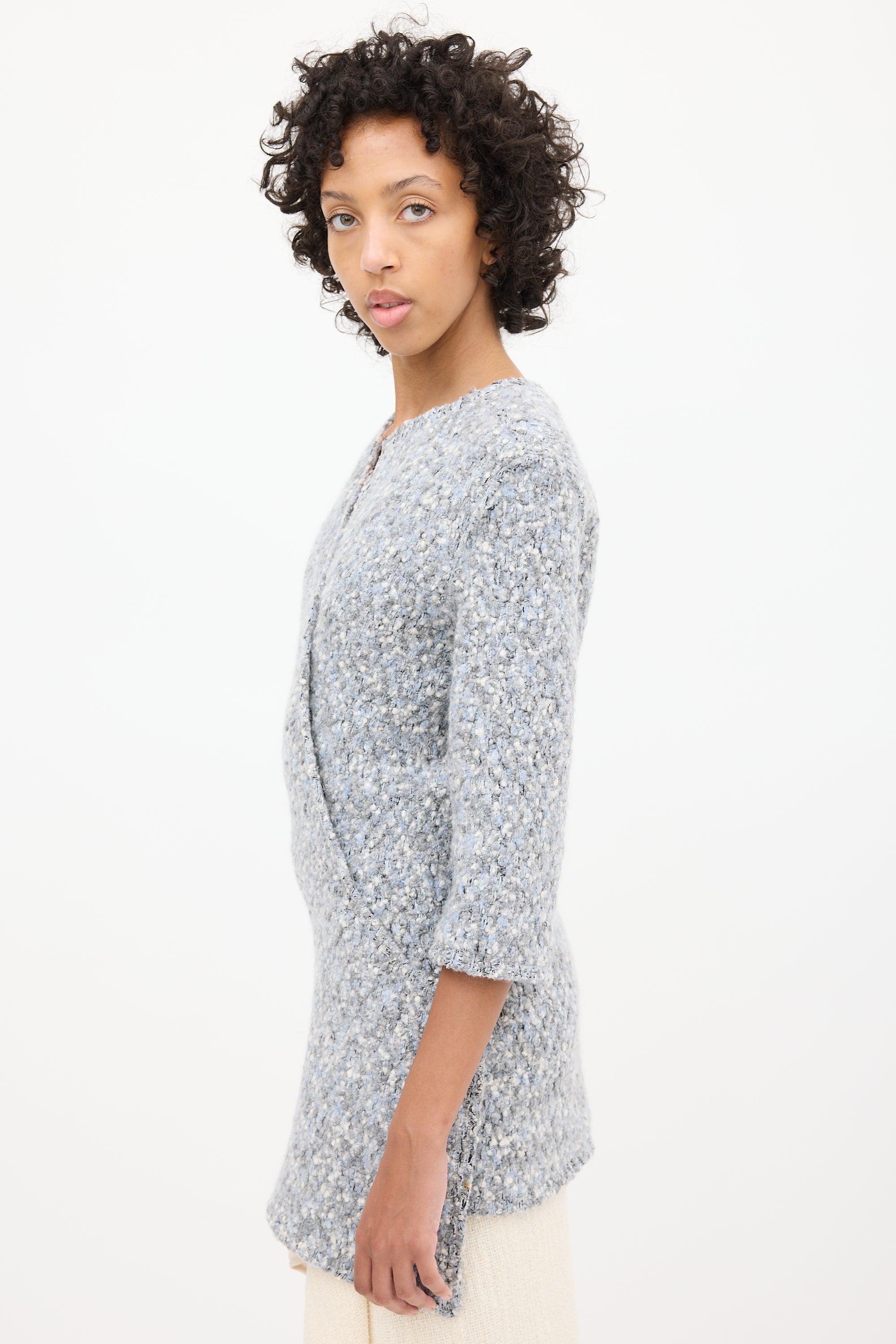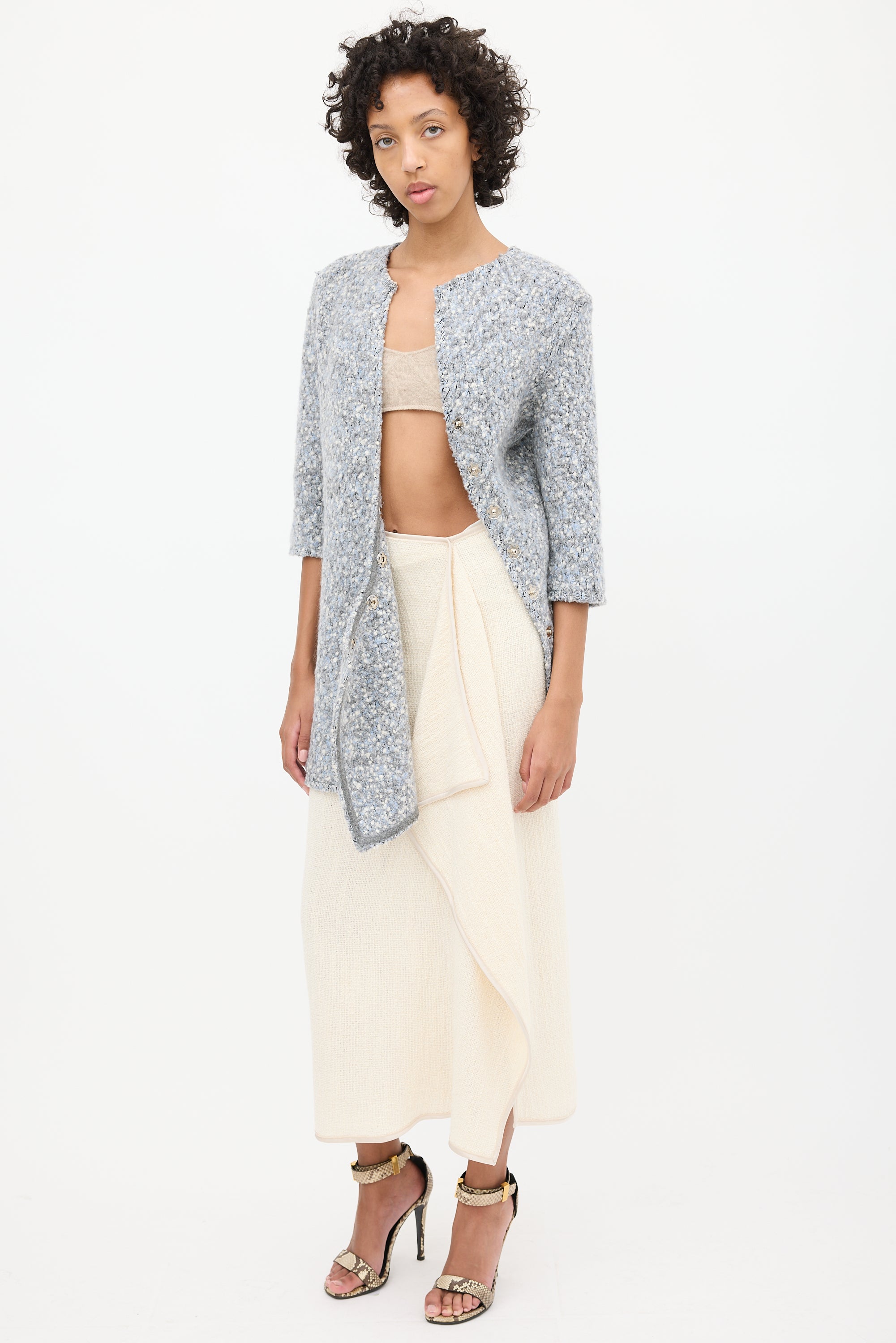 Pre-owned Celine Fall 2014 blue and grey boucle coat featuring asymmetrical neckline, three quarter length sleeves, back slit, and asymmetrical snap button up front. Unlined. Phoebe Philo era design. Look 23 from the collection.
