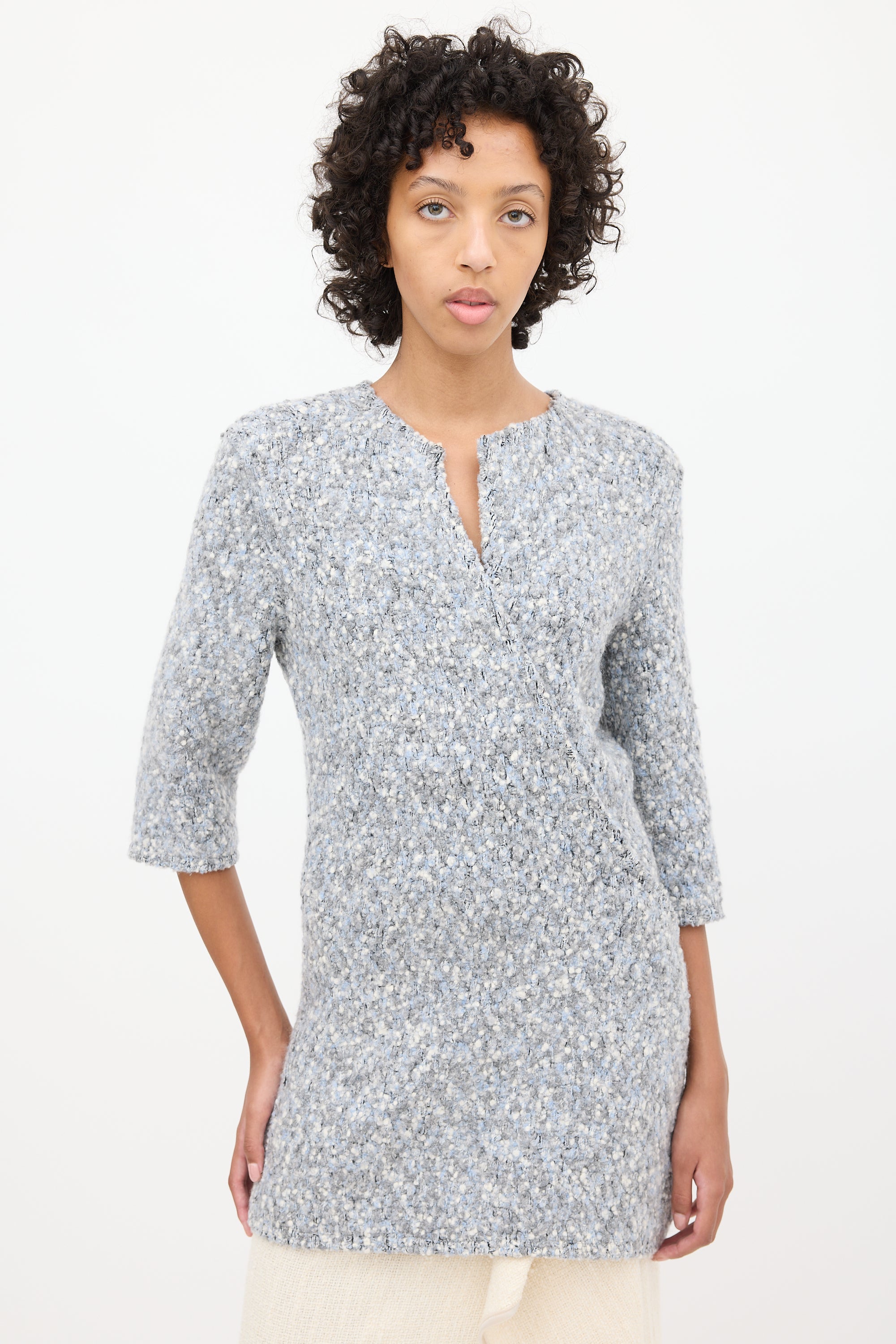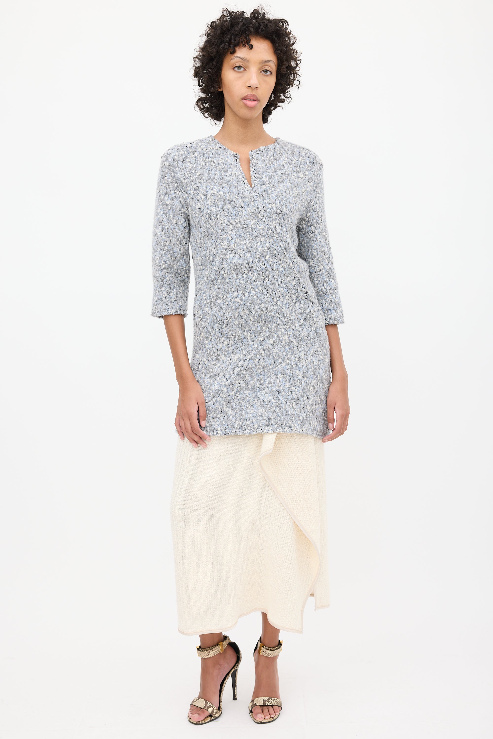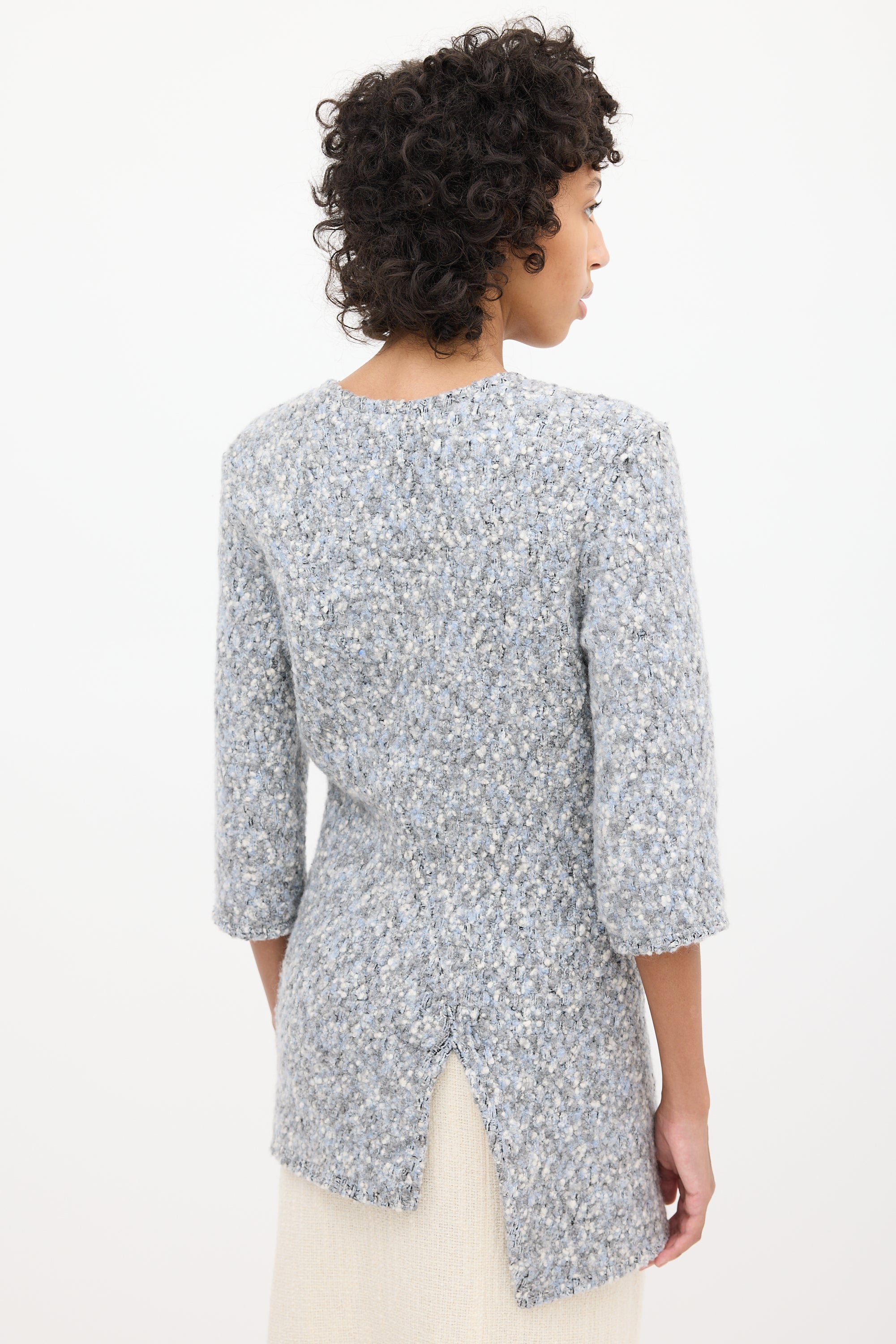 Pre-owned Celine Fall 2014 blue and grey boucle coat featuring asymmetrical neckline, three quarter length sleeves, back slit, and asymmetrical snap button up front. Unlined. Phoebe Philo era design. Look 23 from the collection.