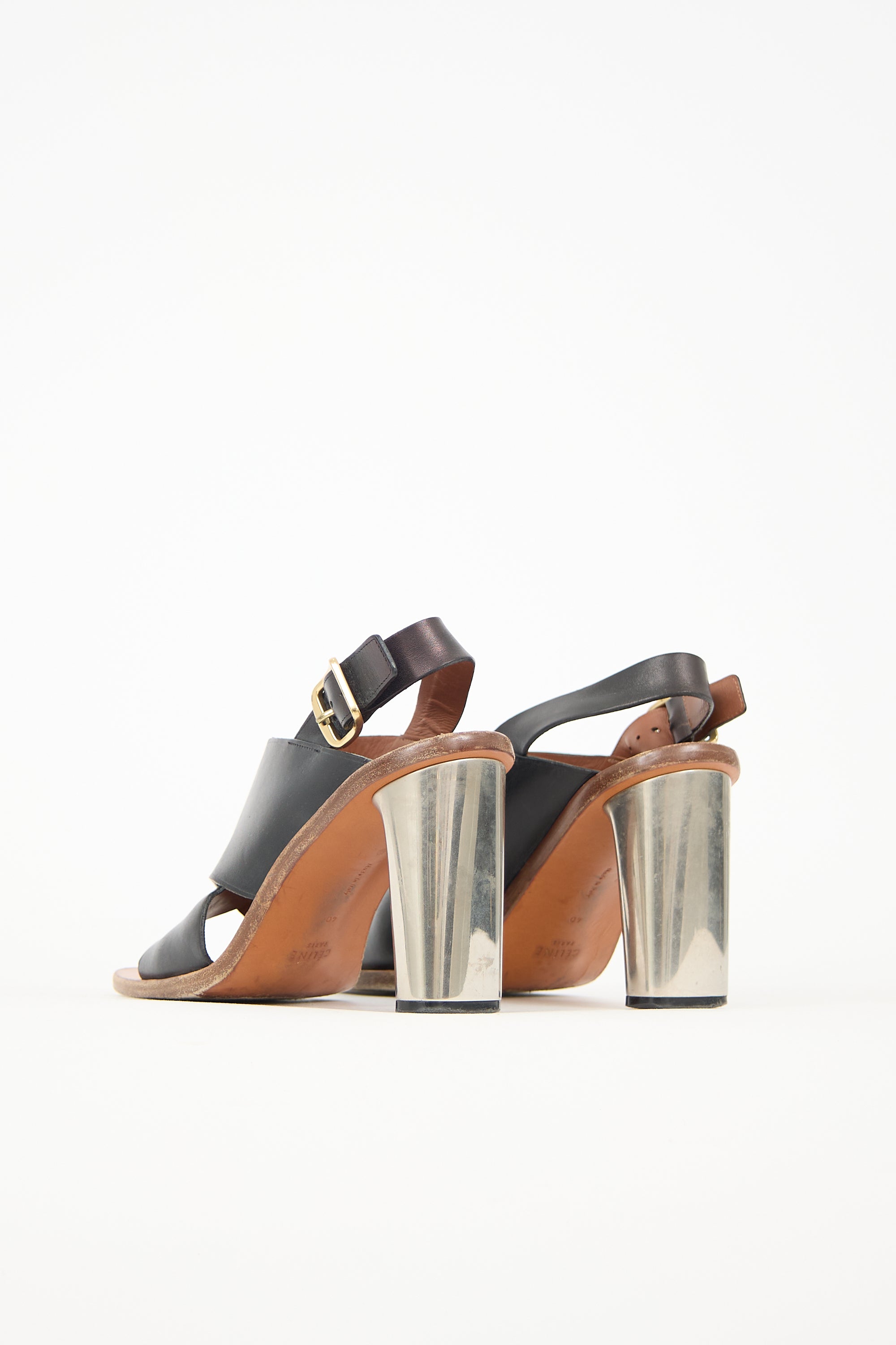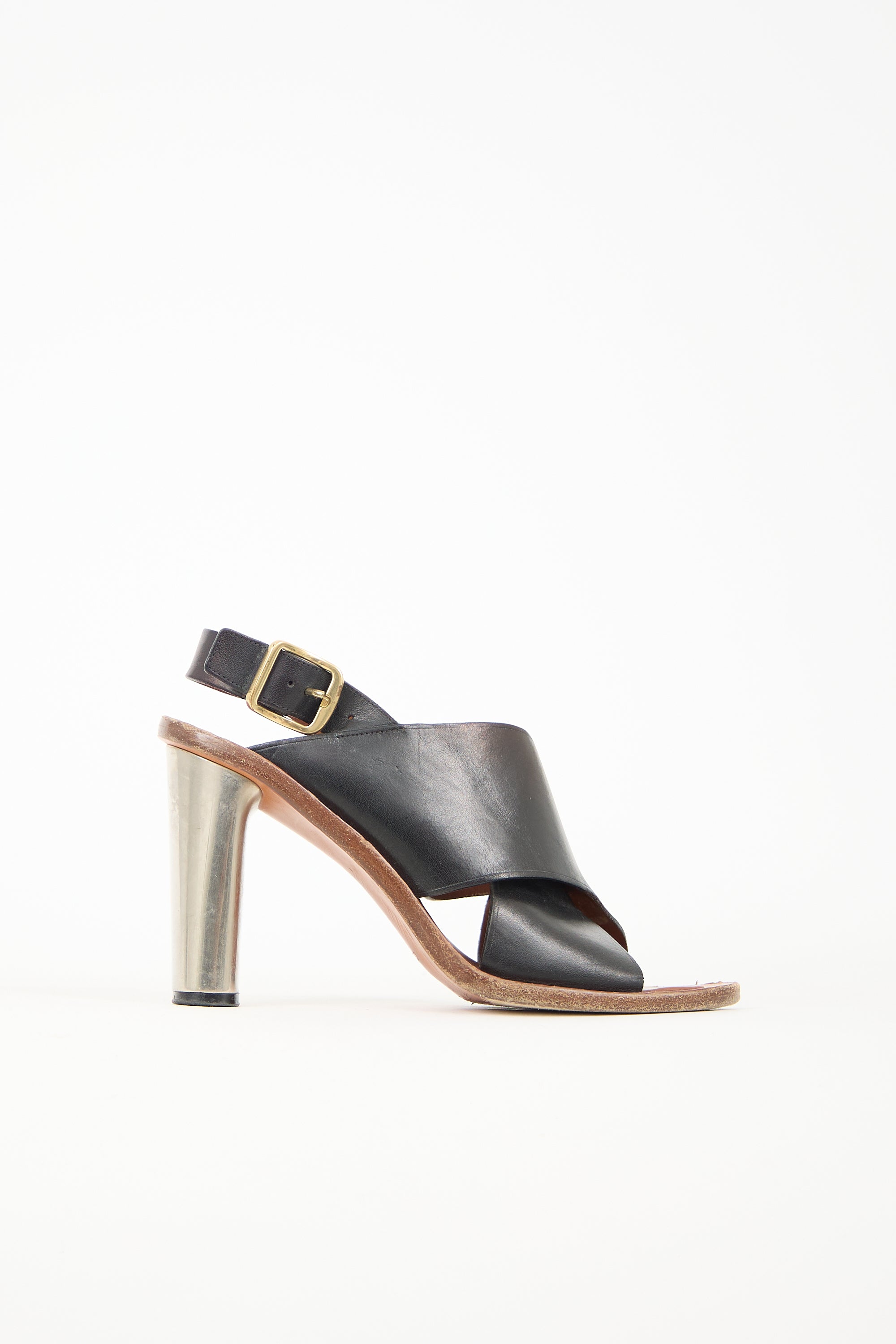 Pre-owned Celine black leather Bam Bam sandals featuring an open rounded toe, crisscross uppers with slingback ankle strap, gold tone buckle fastening, brown leather insole, and a stainless steel block heel. Phoebe Philo era design.