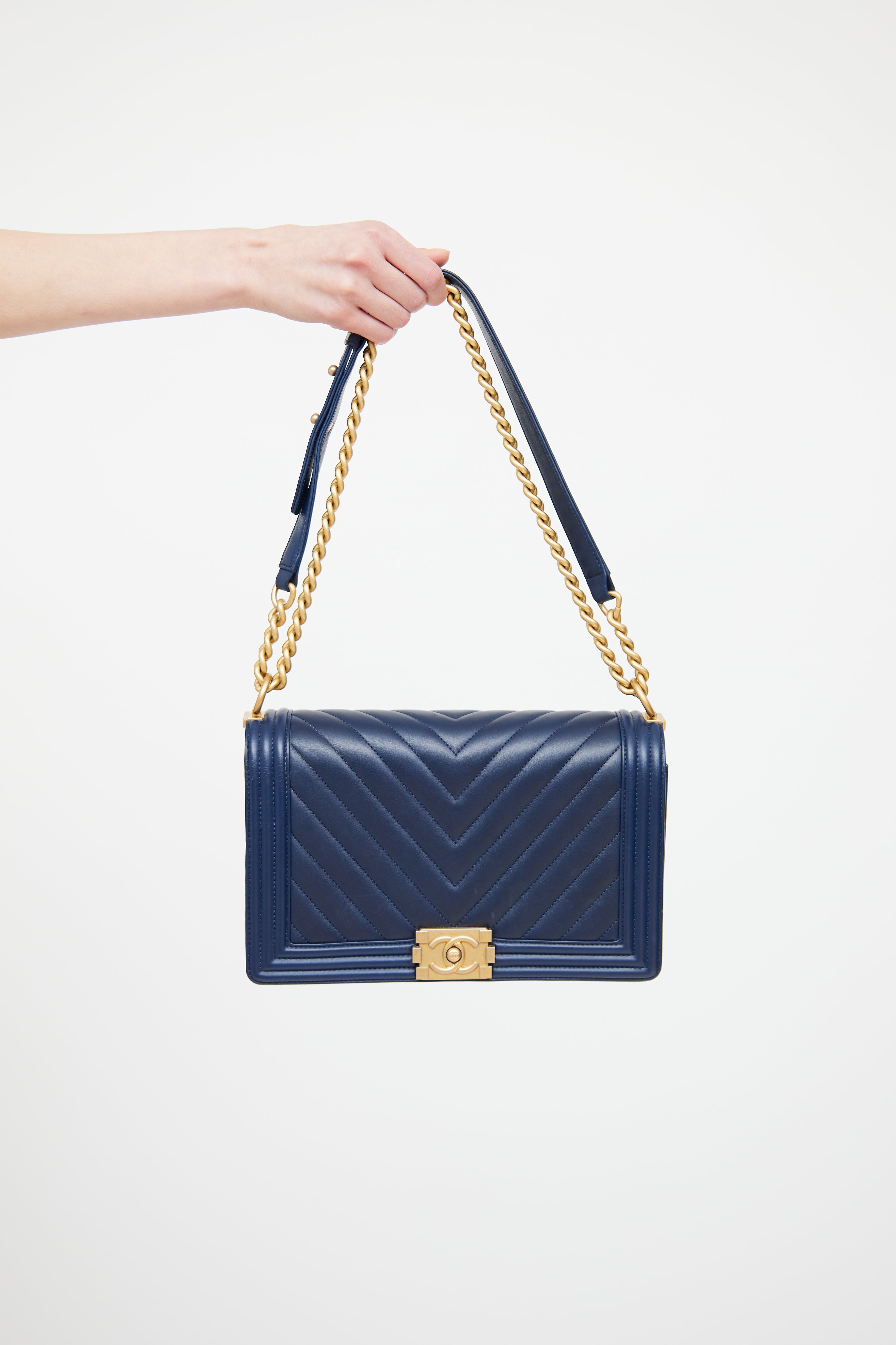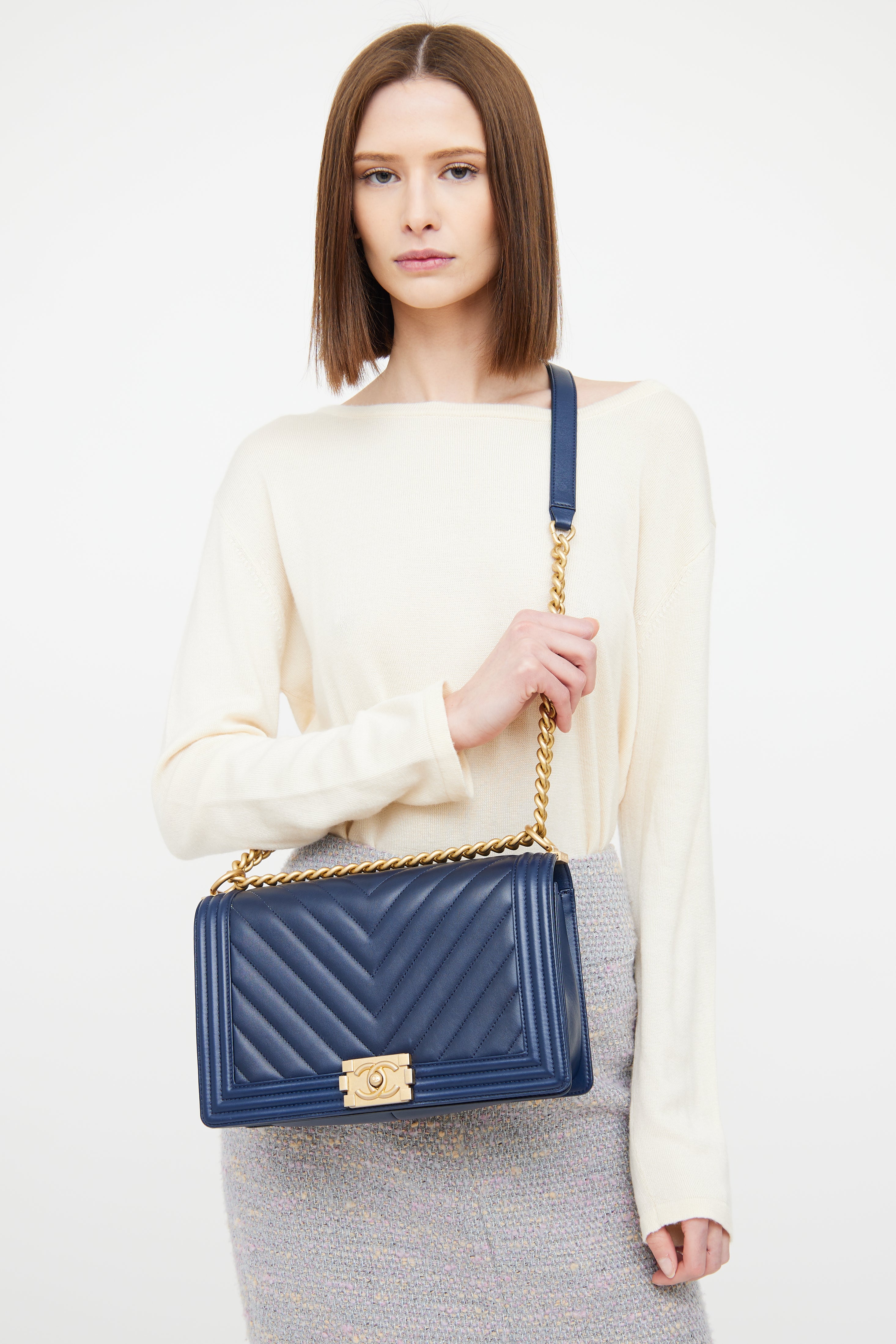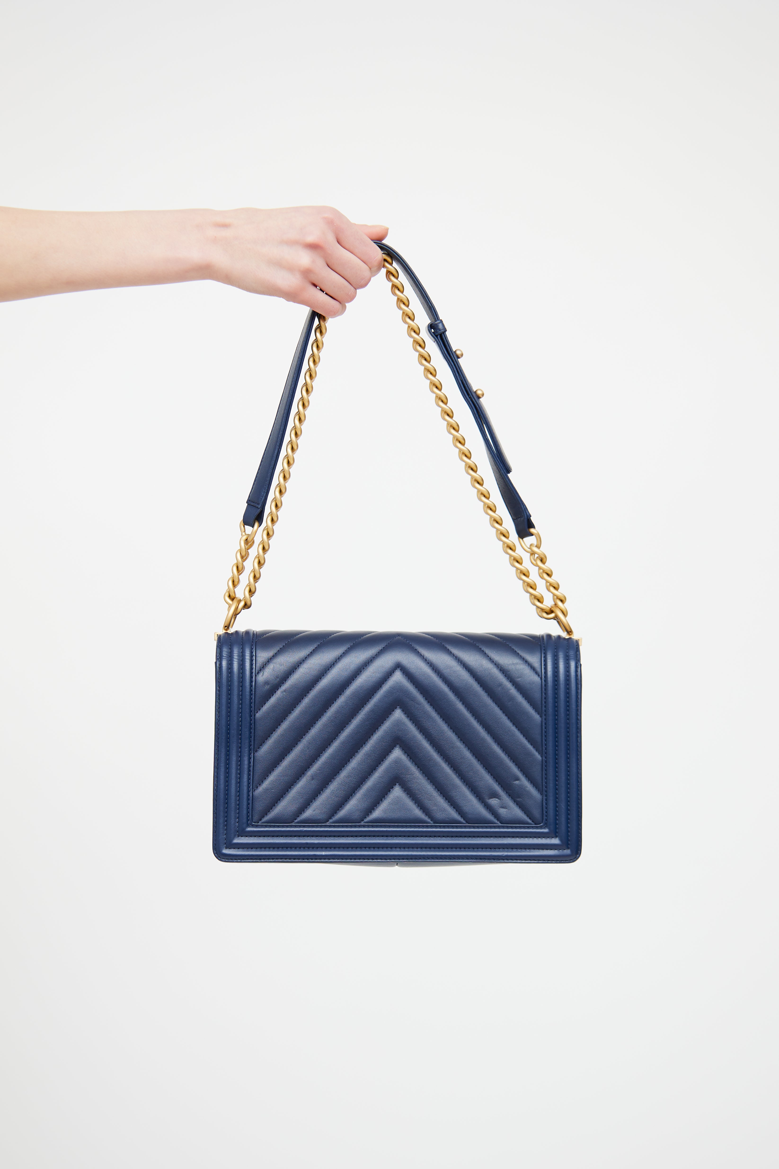 Pre-owned Chanel Medium Boy bag featuring calfskin leather in navy, quilted chevron flap, tonal stitching, gold tone chain link adjustable strap that can be worn two ways and CC push lock closure at front. Textile lined interior featuring one zip pocket and one slip pocket. Series 24, year 2017.