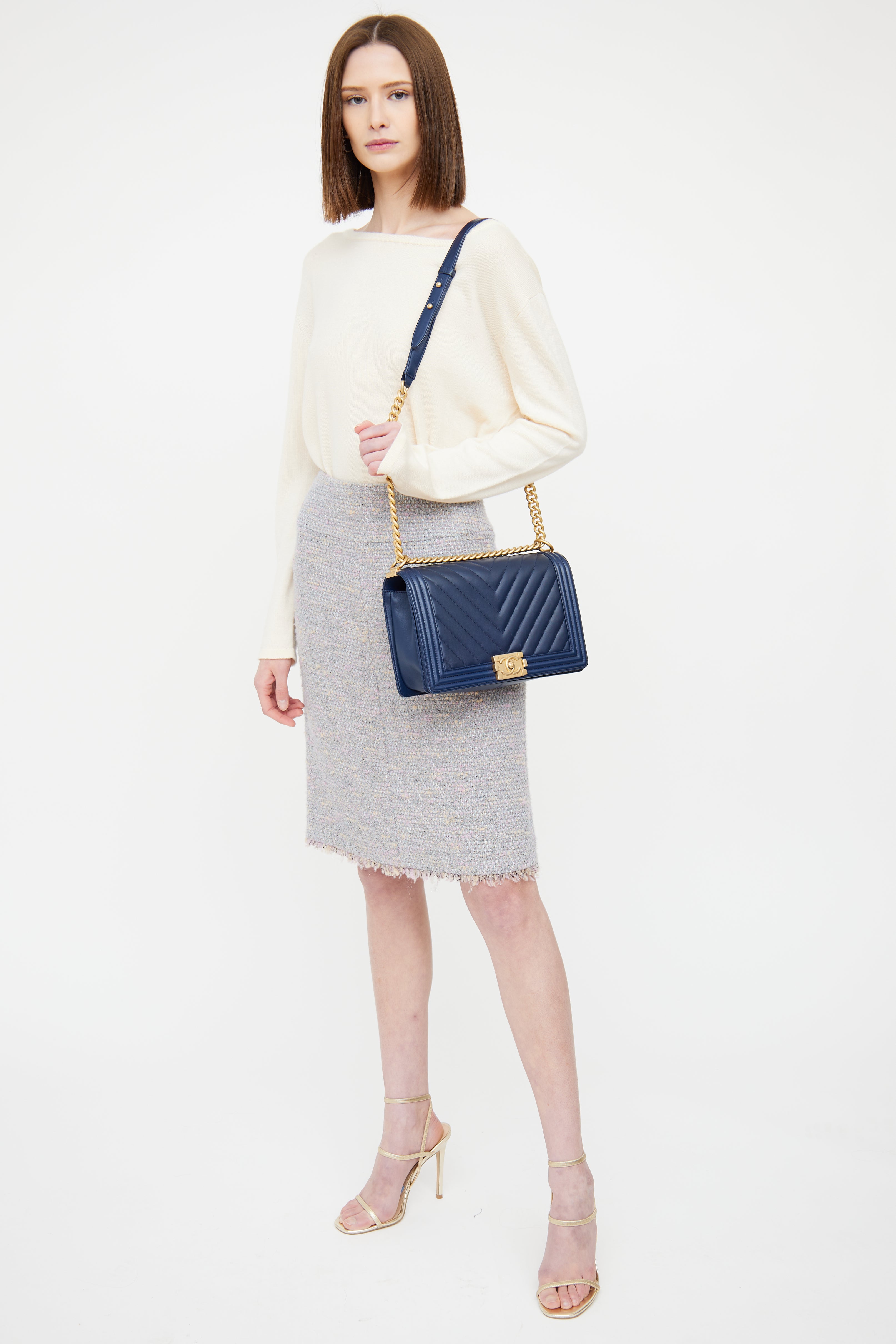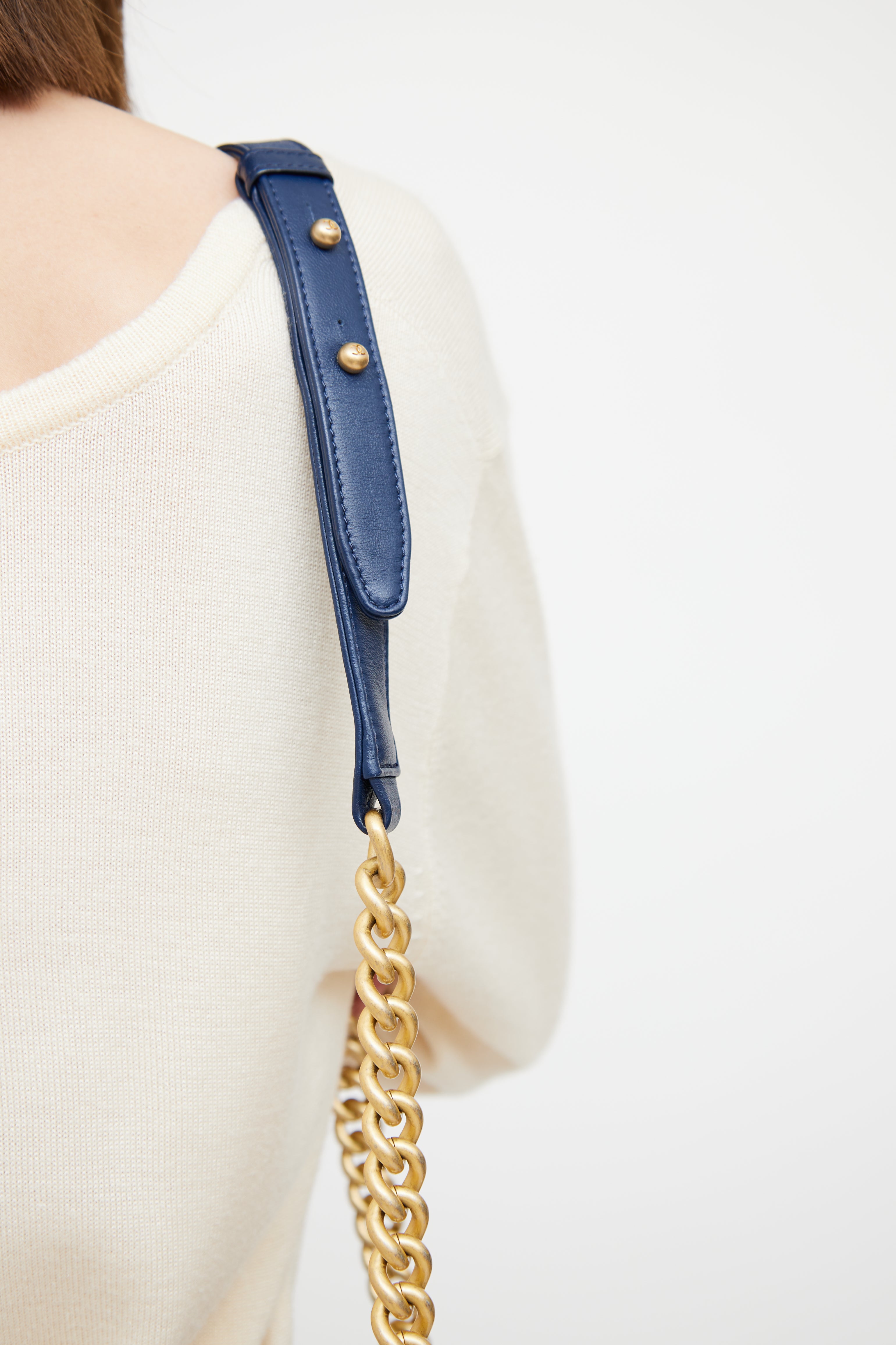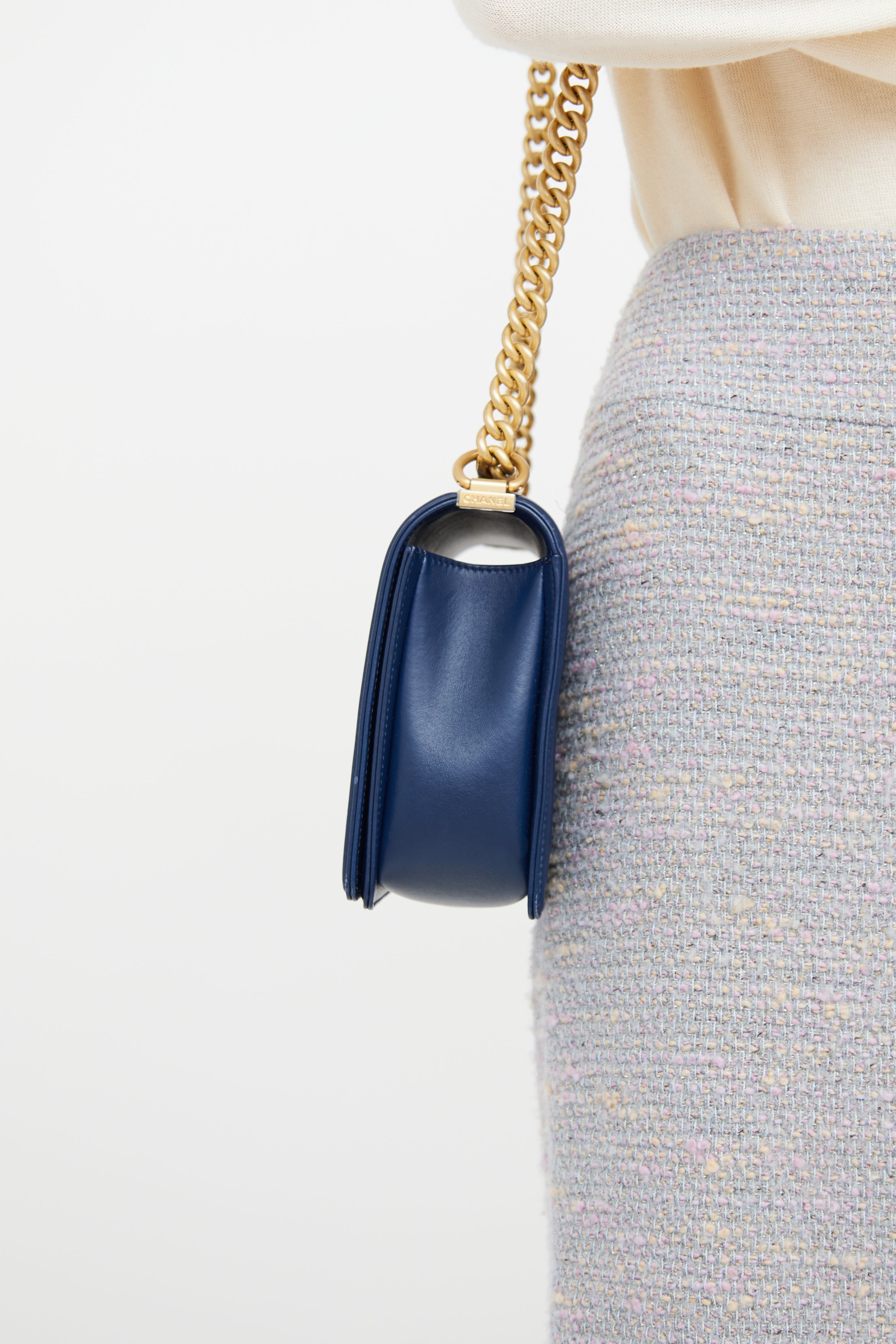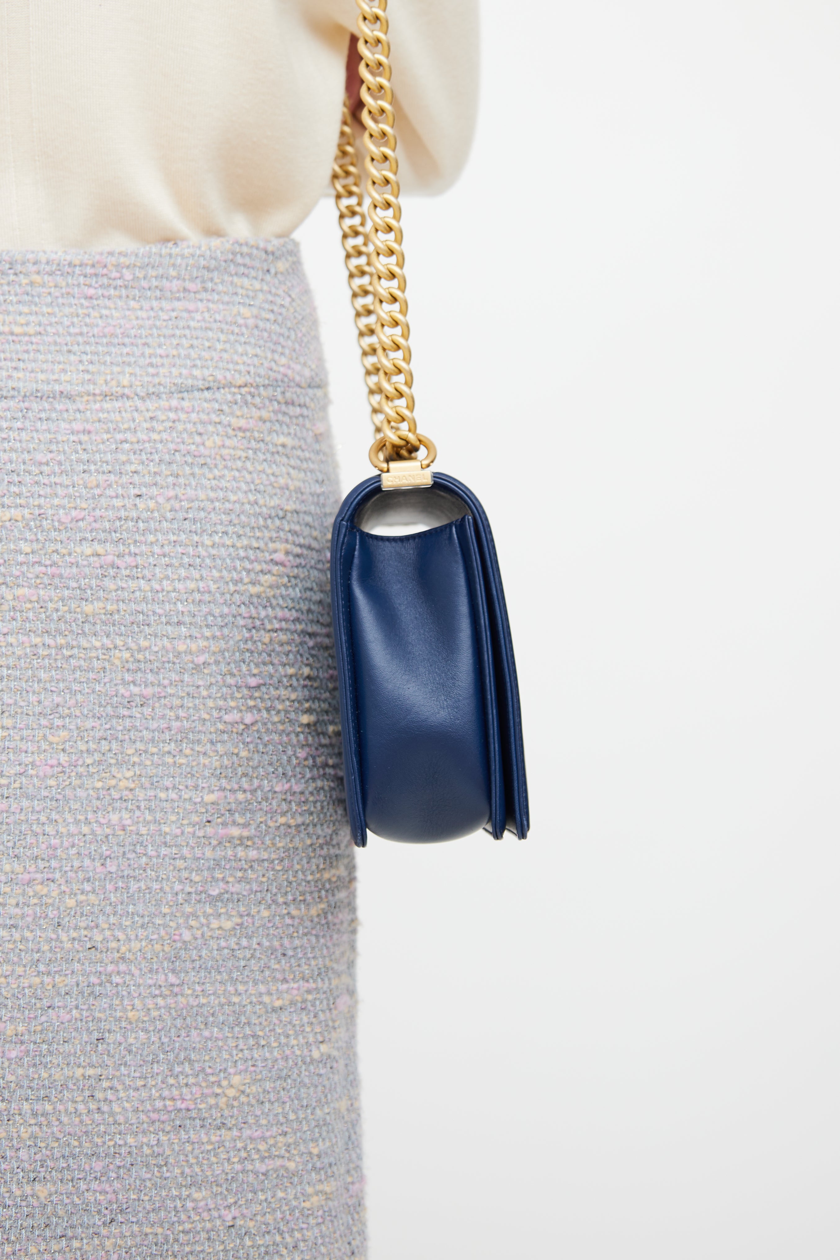 Pre-owned Chanel Medium Boy bag featuring calfskin leather in navy, quilted chevron flap, tonal stitching, gold tone chain link adjustable strap that can be worn two ways and CC push lock closure at front. Textile lined interior featuring one zip pocket and one slip pocket. Series 24, year 2017.