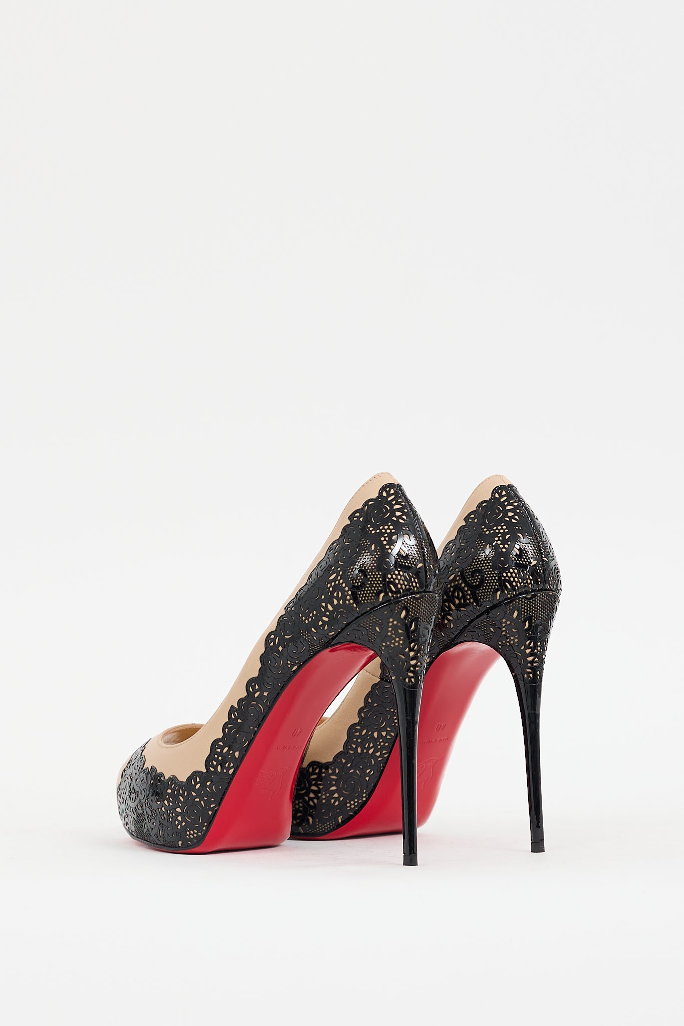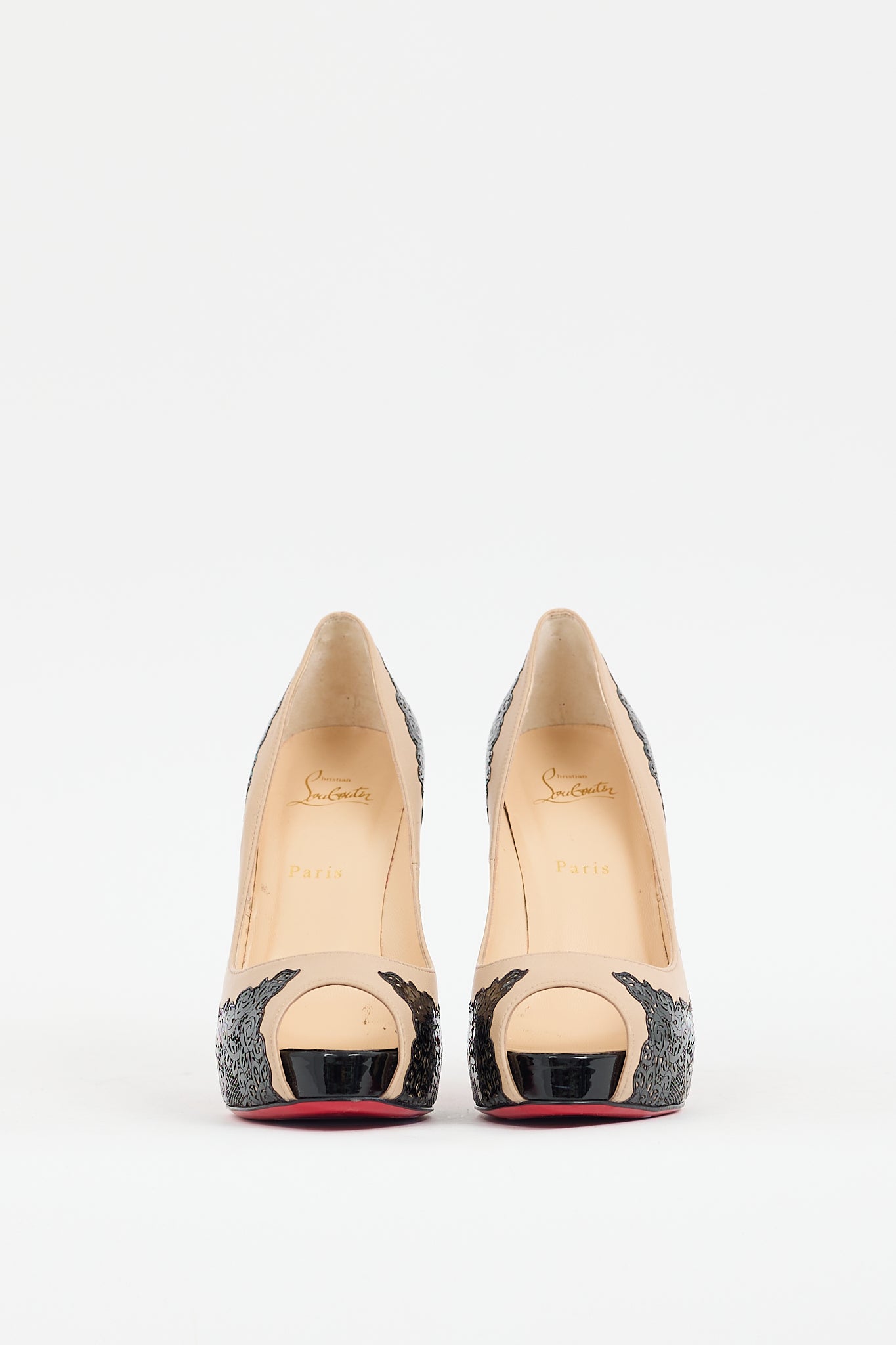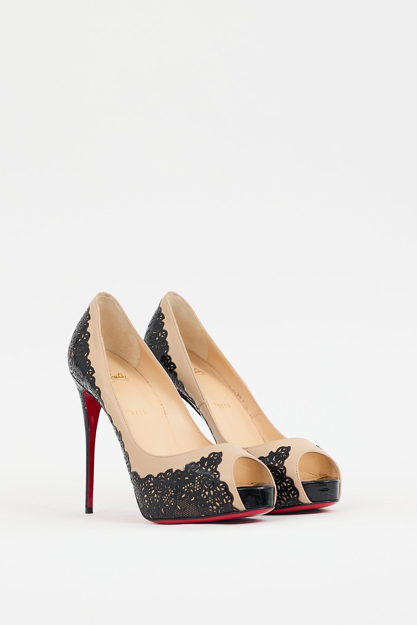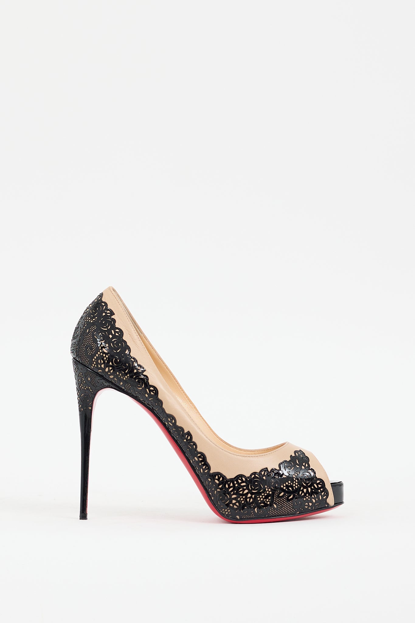 Pre-owned Christian Louboutin black and beige Veramucha pumps featuring open almond toe, lace pattern at upper, slip on entry, stiletto heel, and signature red lacquered outsole. Comes with original dust bag,
