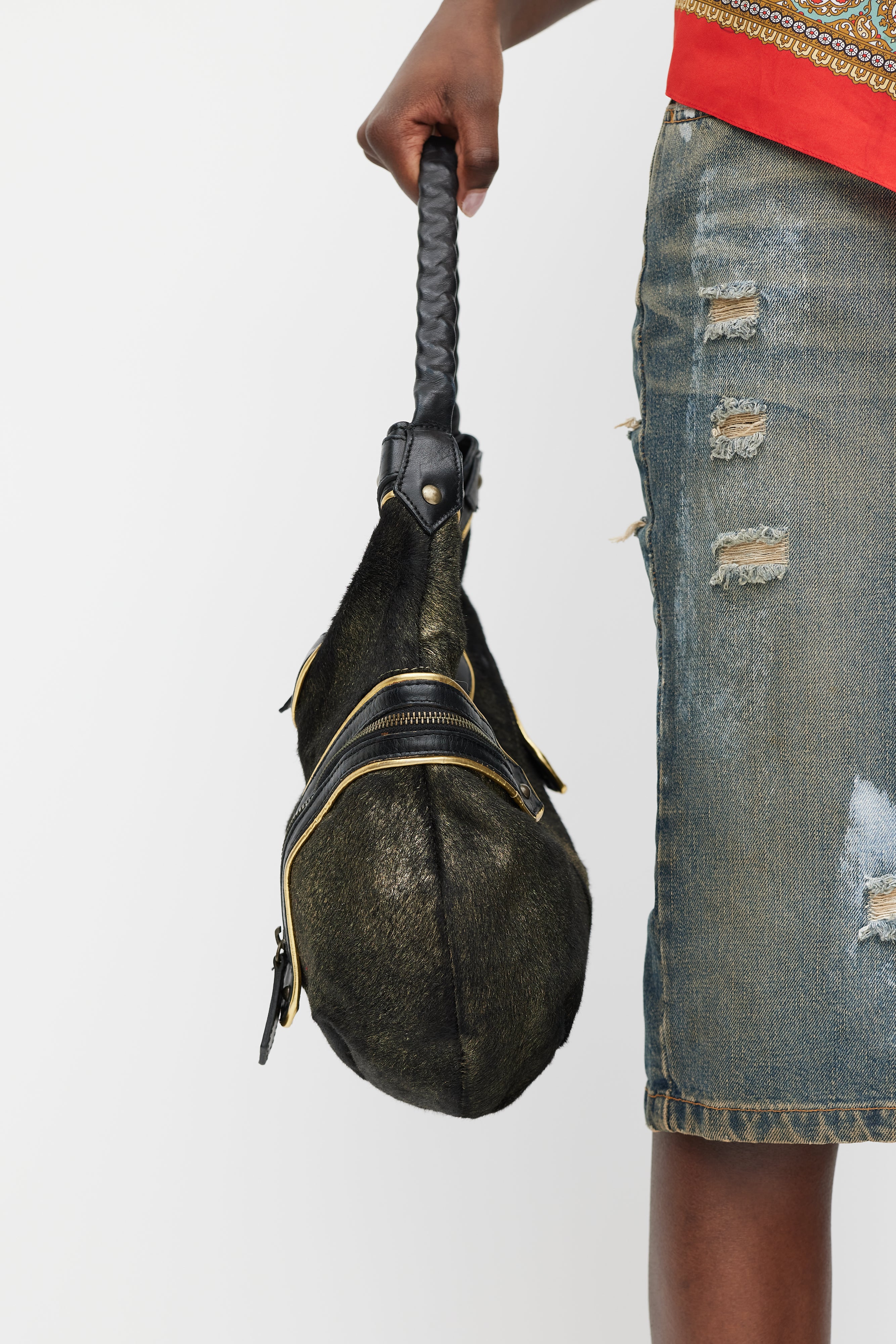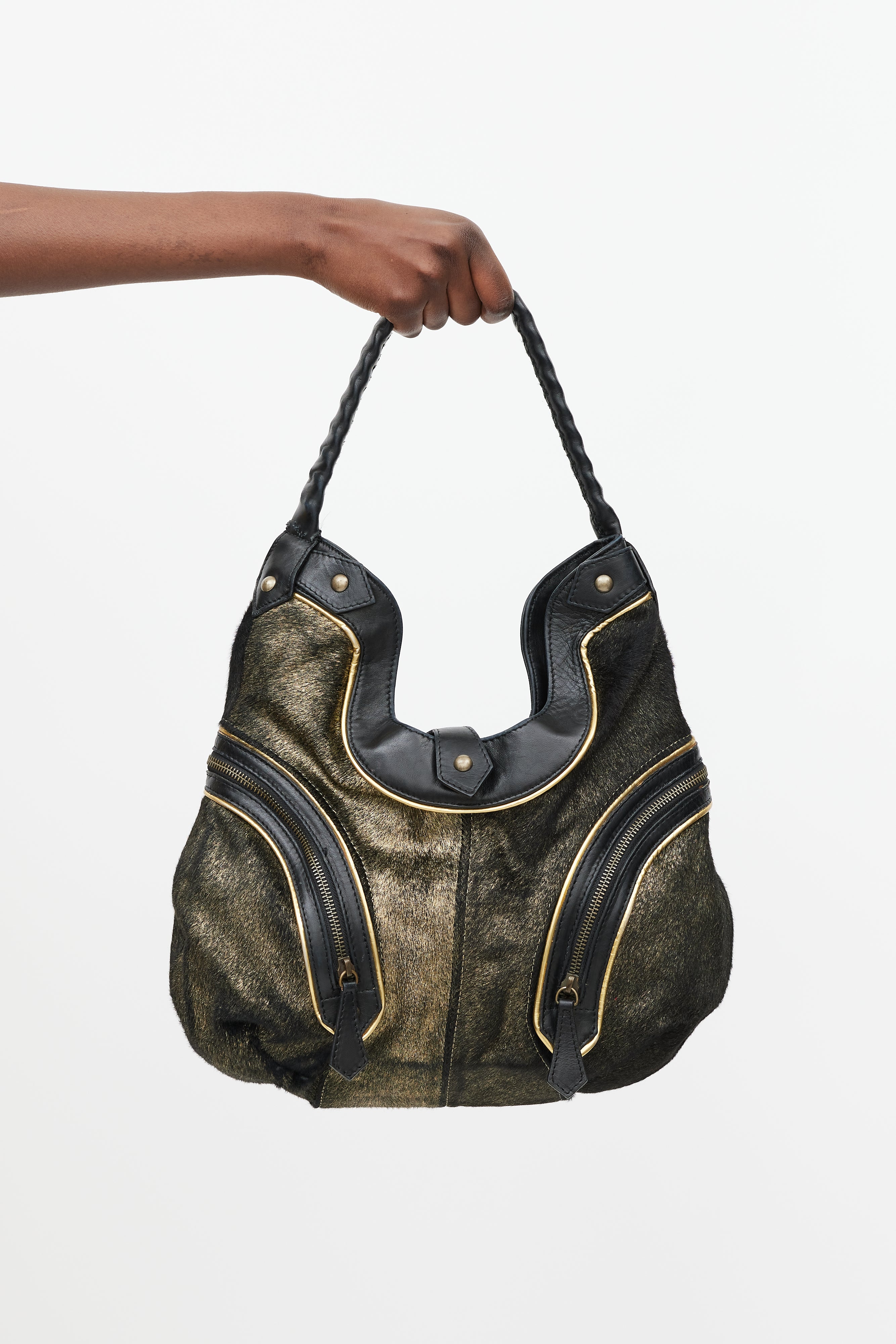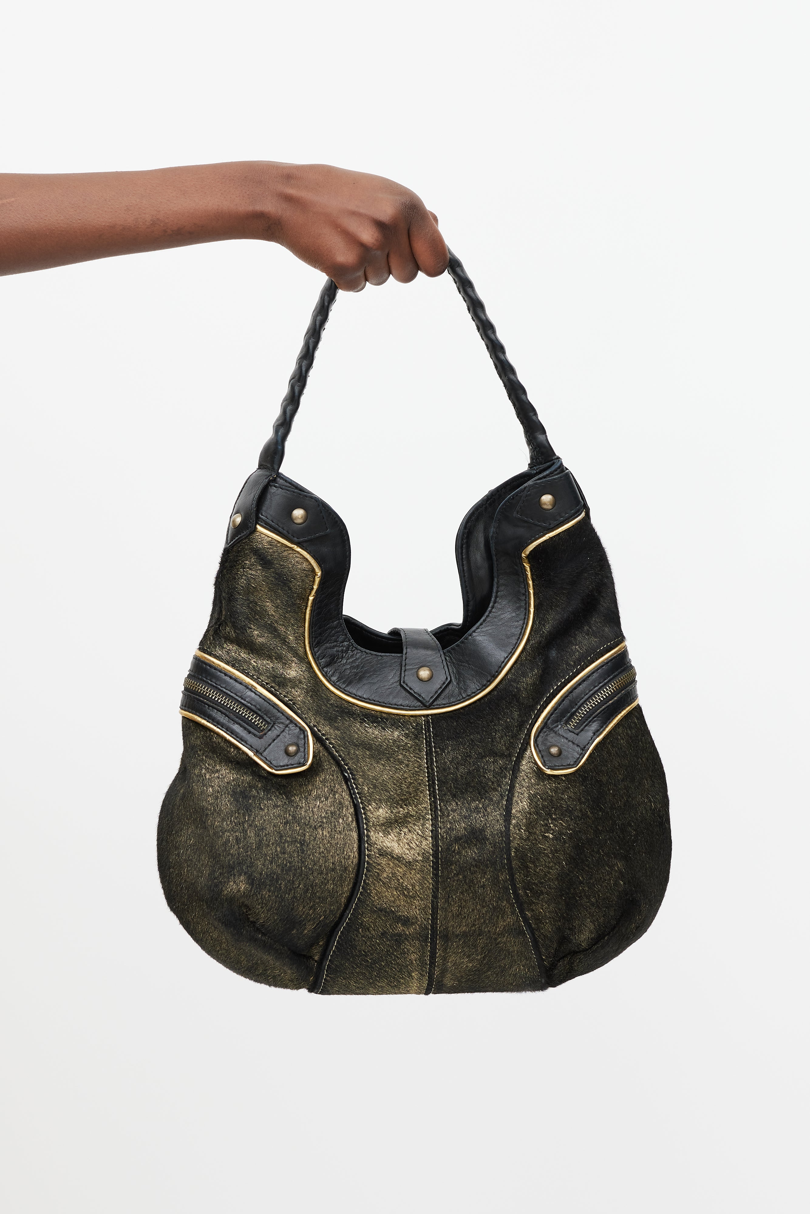 Pre-owned Christian Louboutin black leather bag featuring gold tone textured ponyhair throughout, two zip pockets at front, one main compartment with one slip pocket and one zip pocket, braided top handle, and top snap closure.