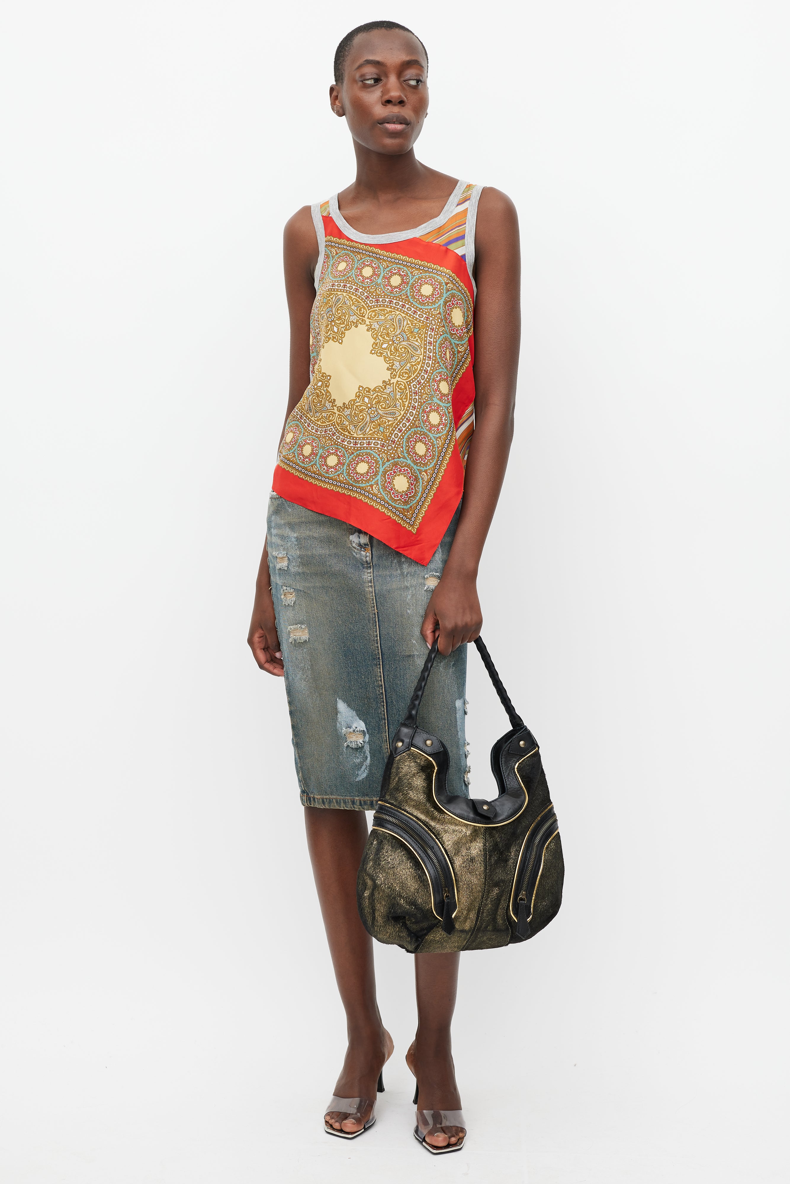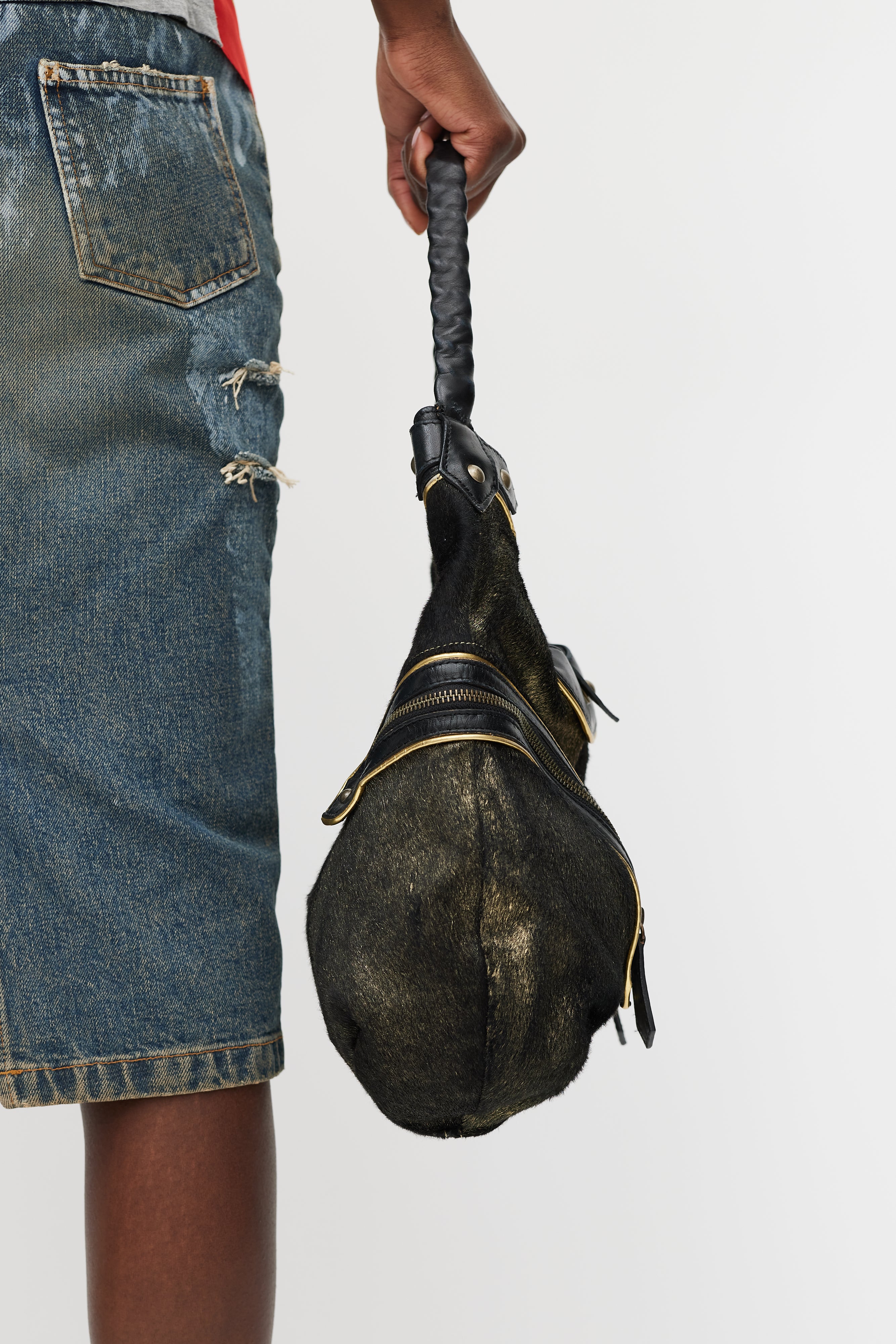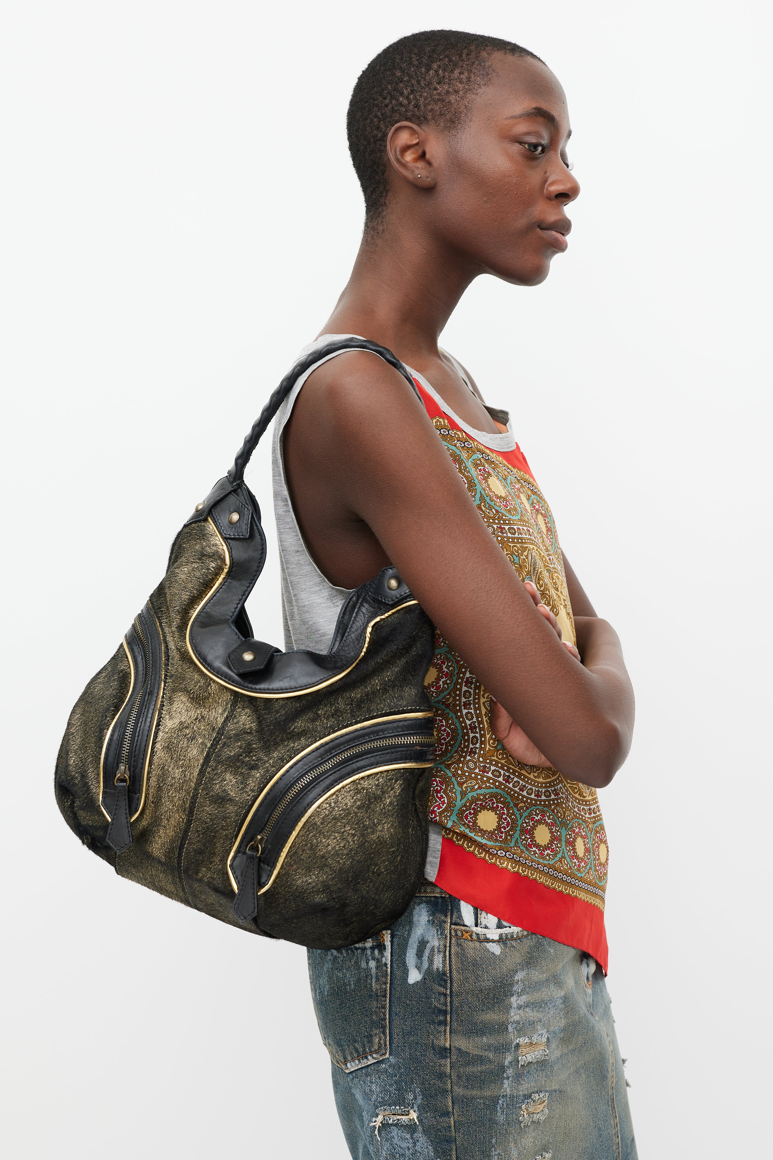 Pre-owned Christian Louboutin black leather bag featuring gold tone textured ponyhair throughout, two zip pockets at front, one main compartment with one slip pocket and one zip pocket, braided top handle, and top snap closure.