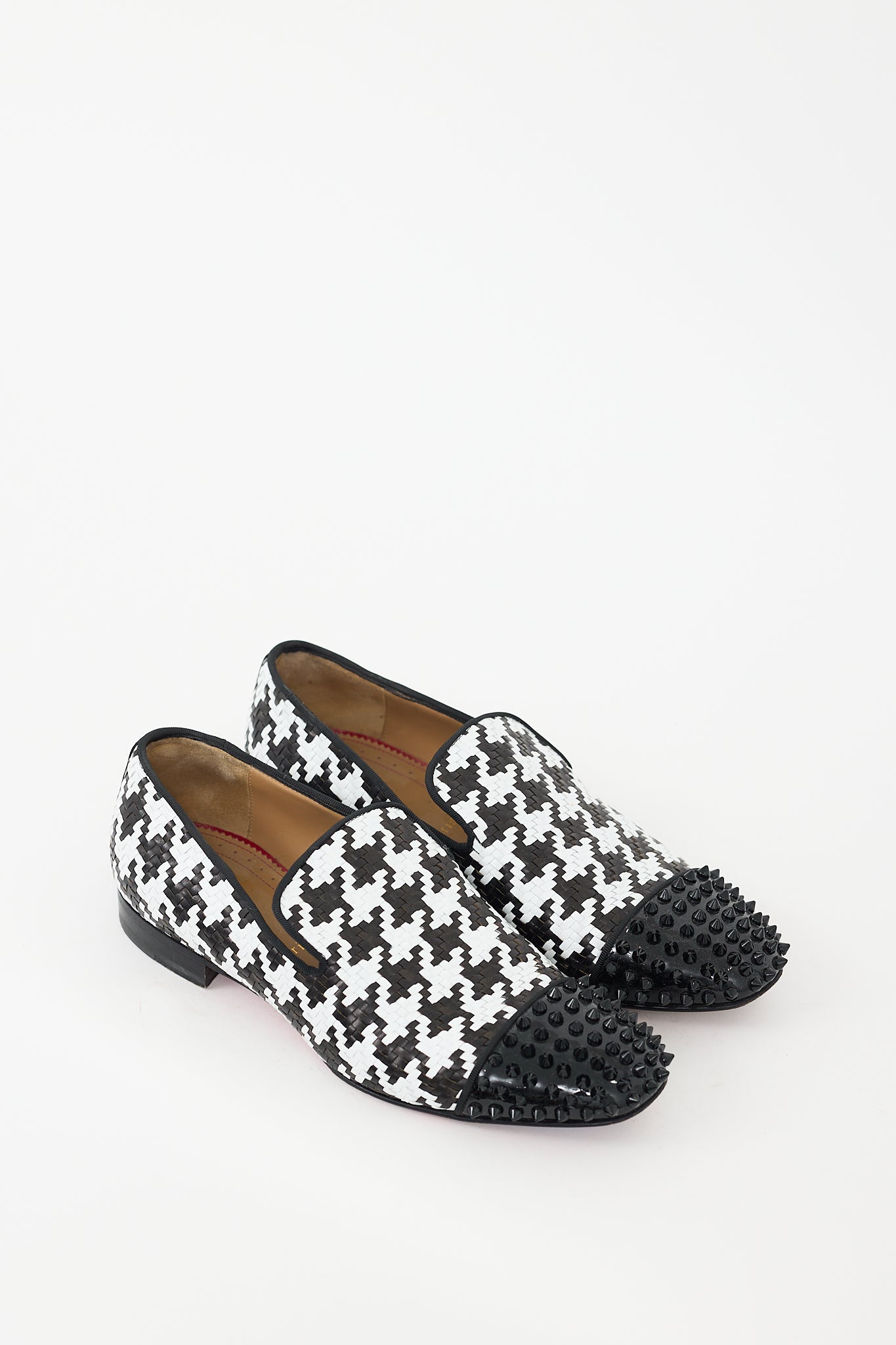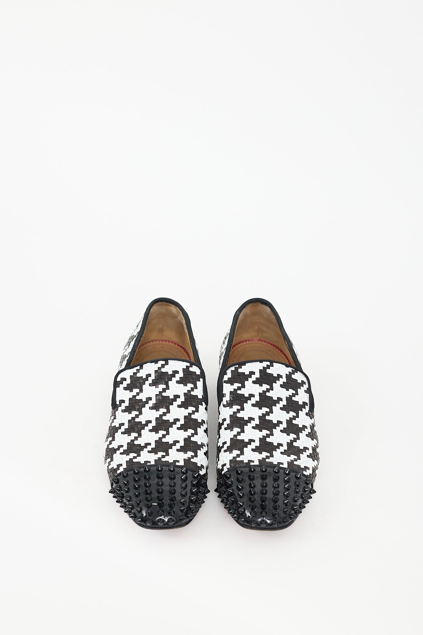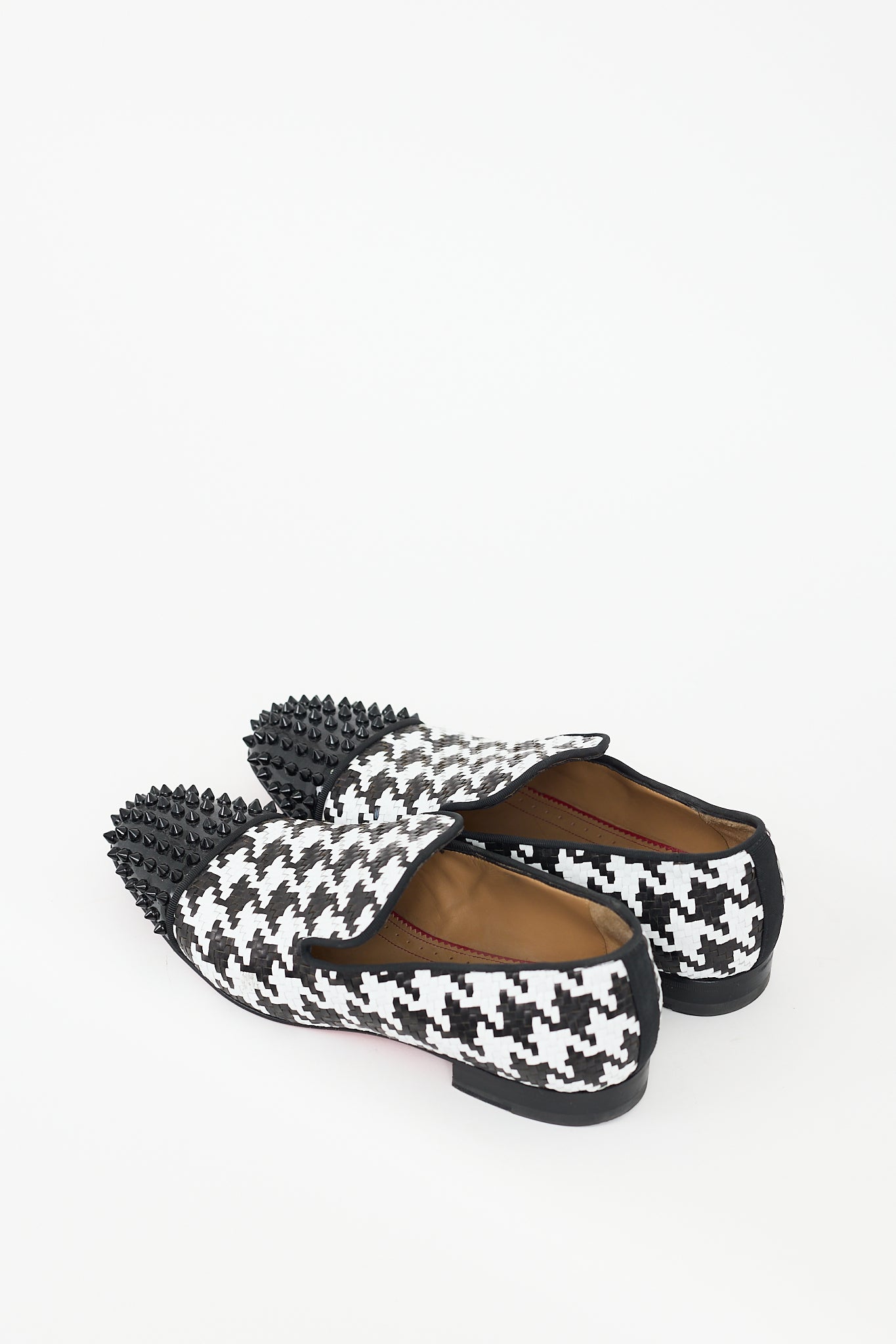 Pre-owned Christian Louboutin black Spooky flats featuring a round toe with spiked detailing, white woven houndstooth upper, and stacked heel. Comes with original dust bag.