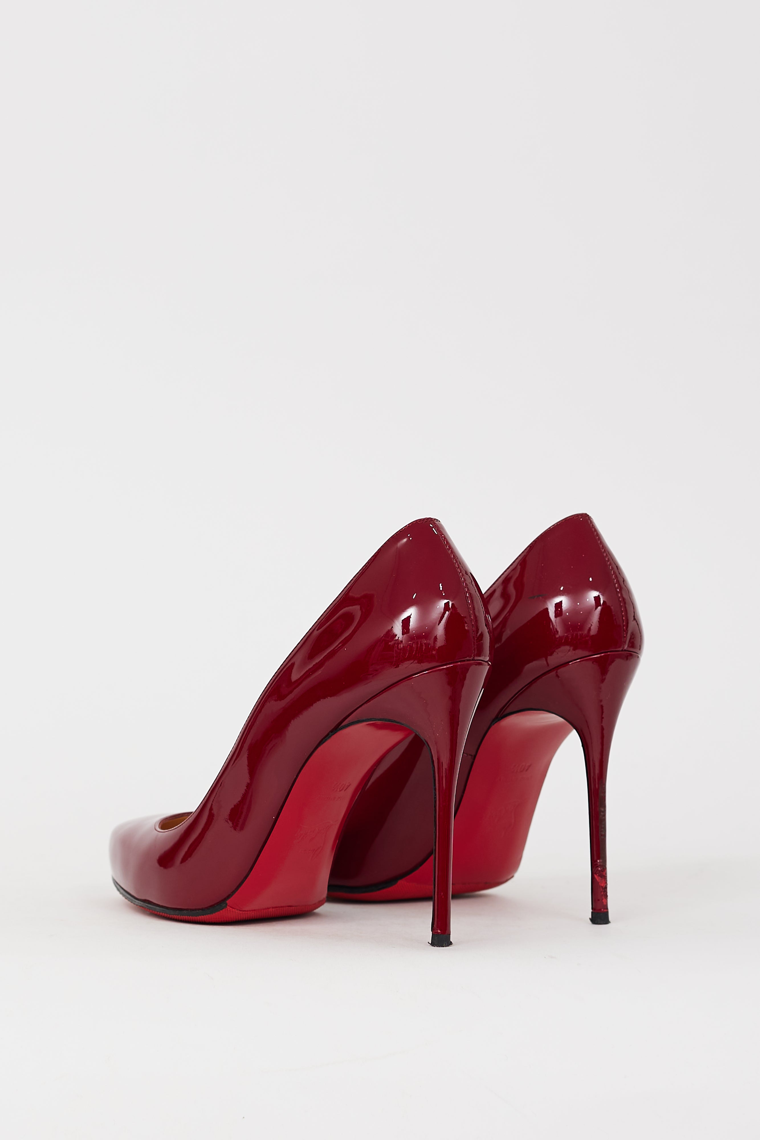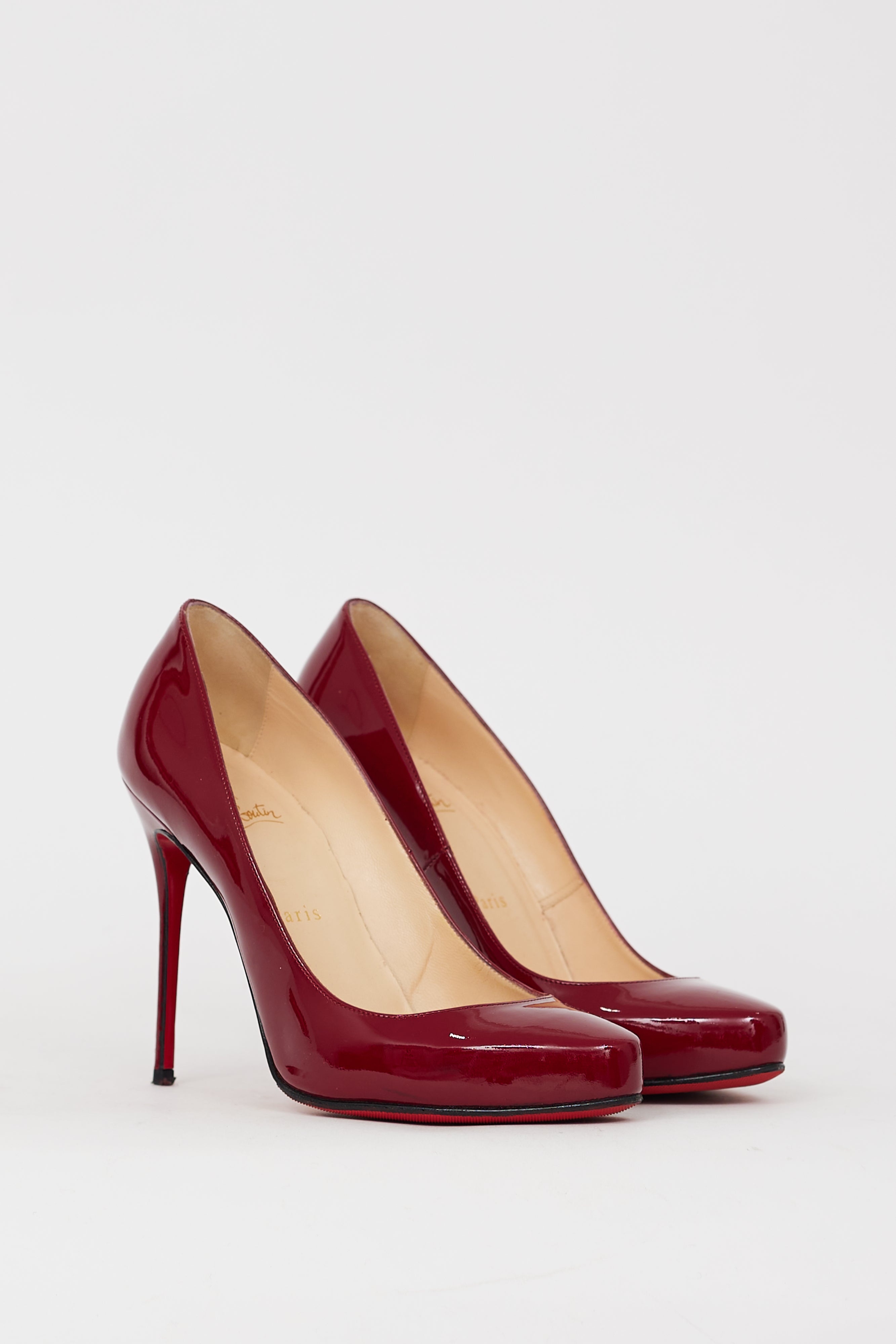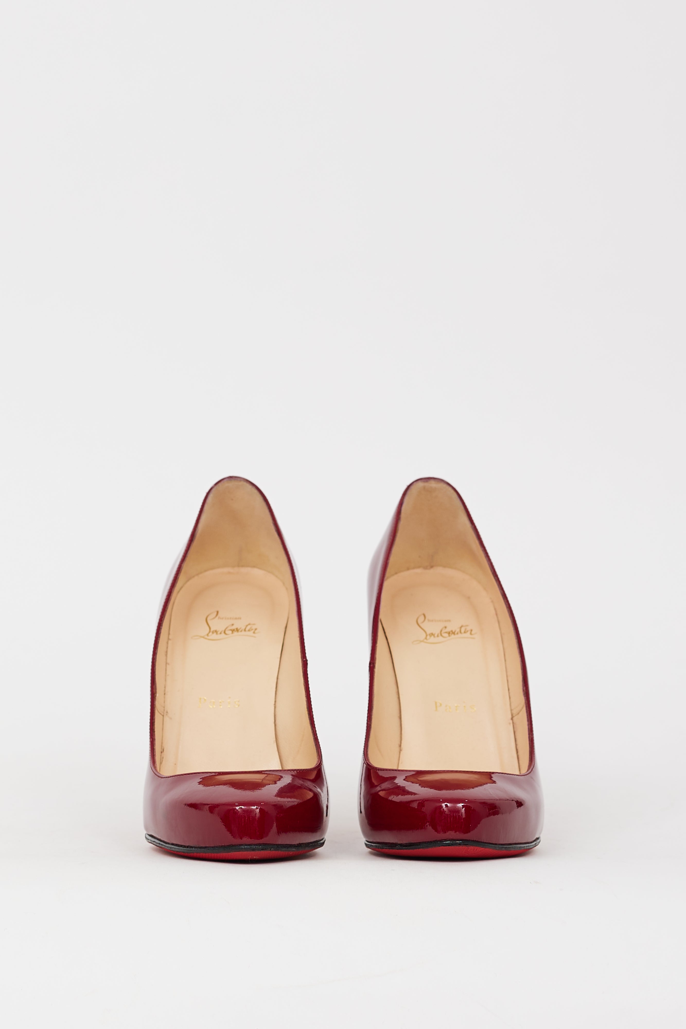 Pre-owned Christian Louboutin burgundy patent leather Fifi 115mm pumps featuring almond toe, slip on entry, stiletto heel, and signature red lacquered outsole. Comes with original dust bag.