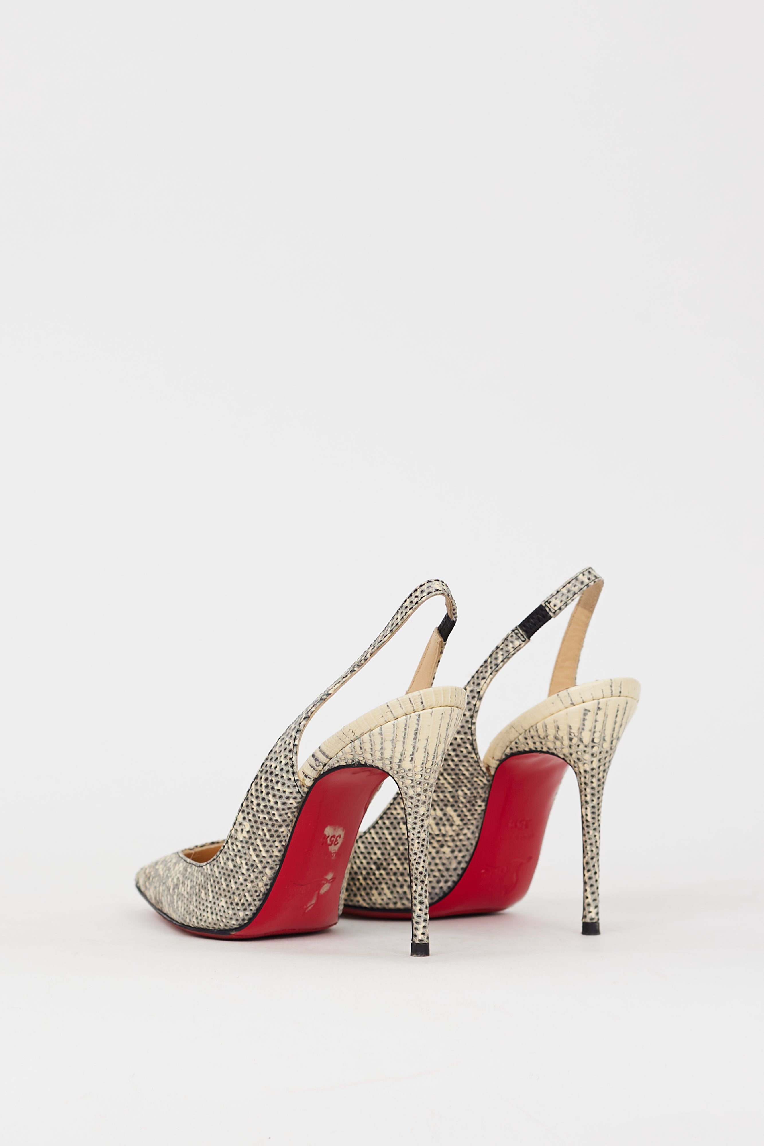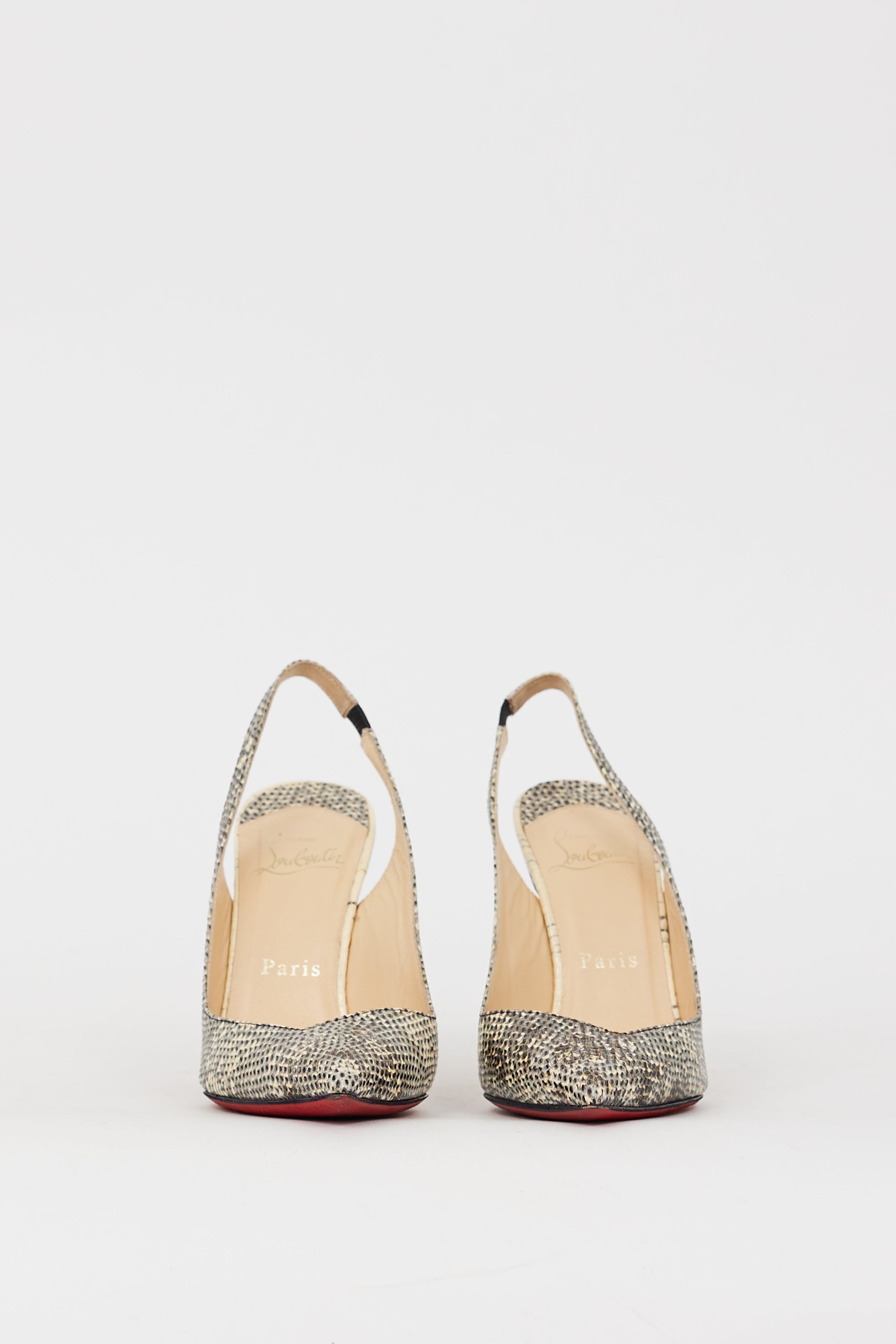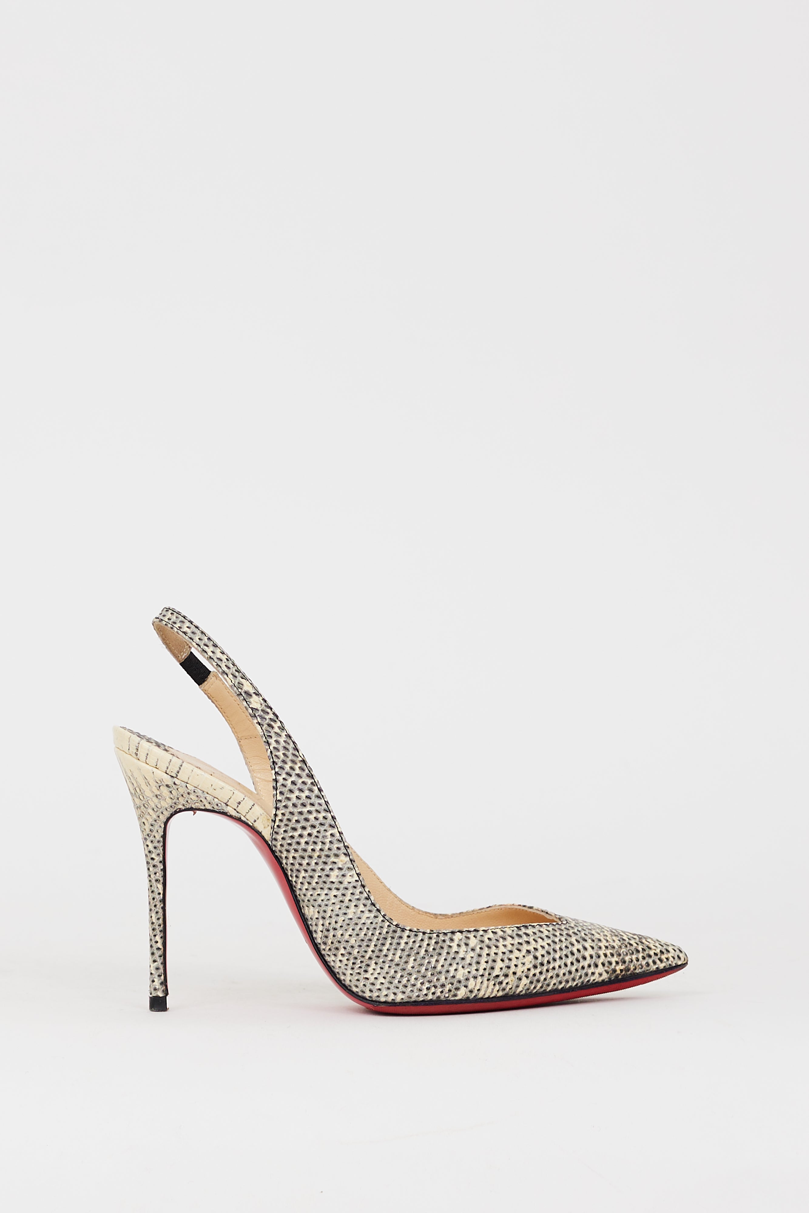 Pre-owned Christian Louboutin grey and black Corneille pumps featuring snakeskin effect upper, V-cut vamp, pointed toe, slingback strap, stiletto heel, and signature red lacquered outsole.