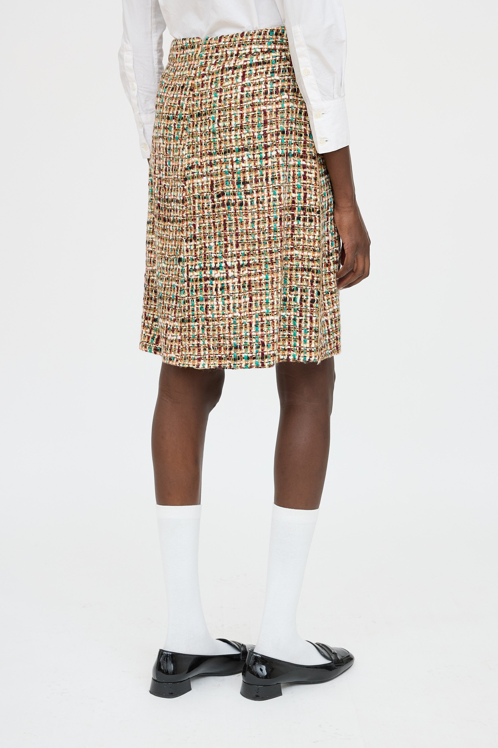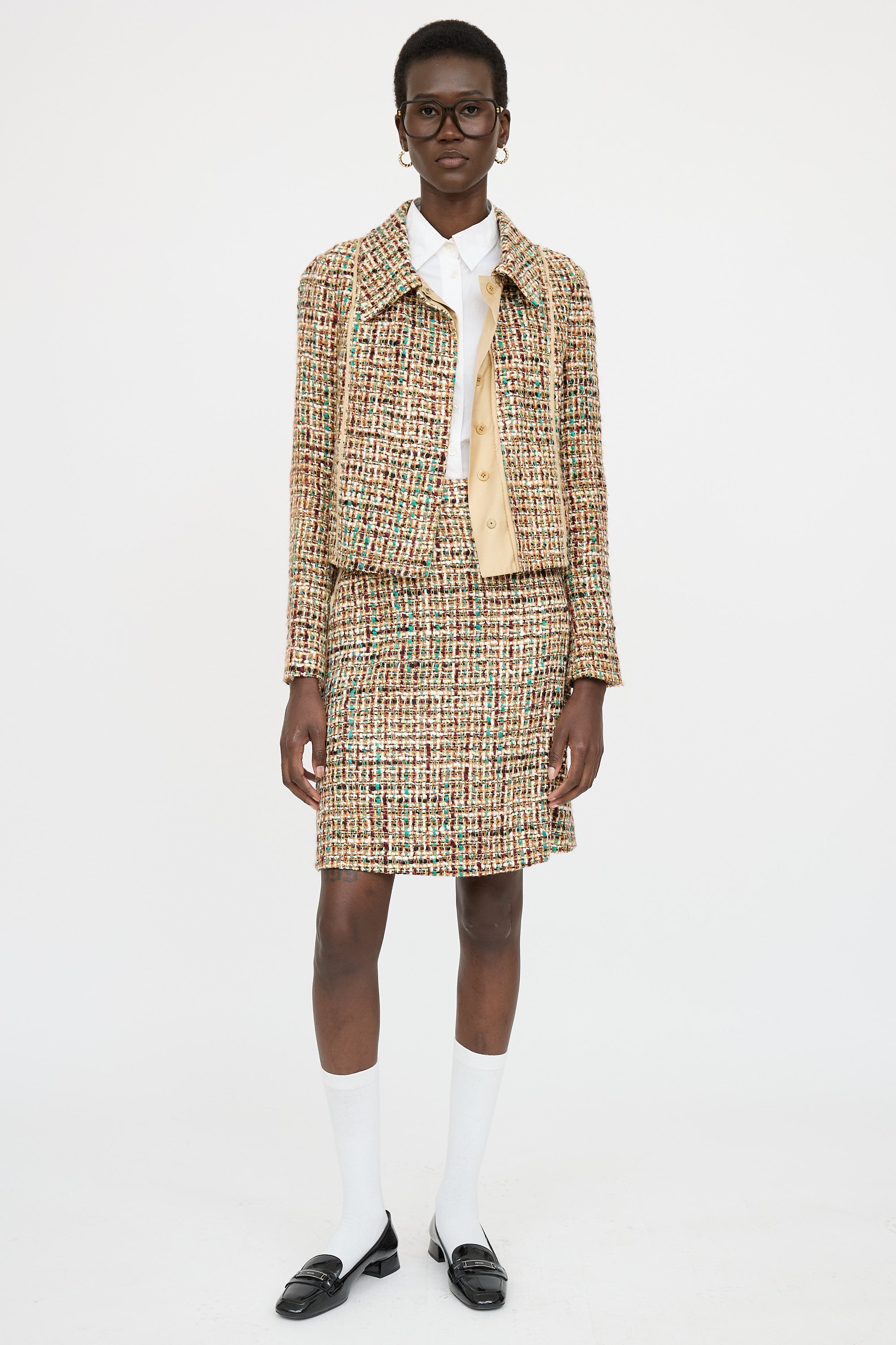 Pre-owned Prada beige and multicolor tweed co-ord set featuring pointed collar jacket, concealed button front, slit pockets at side, and lined. Matching skirt featuring concealed zip at back, raw trimming at side, and lined.