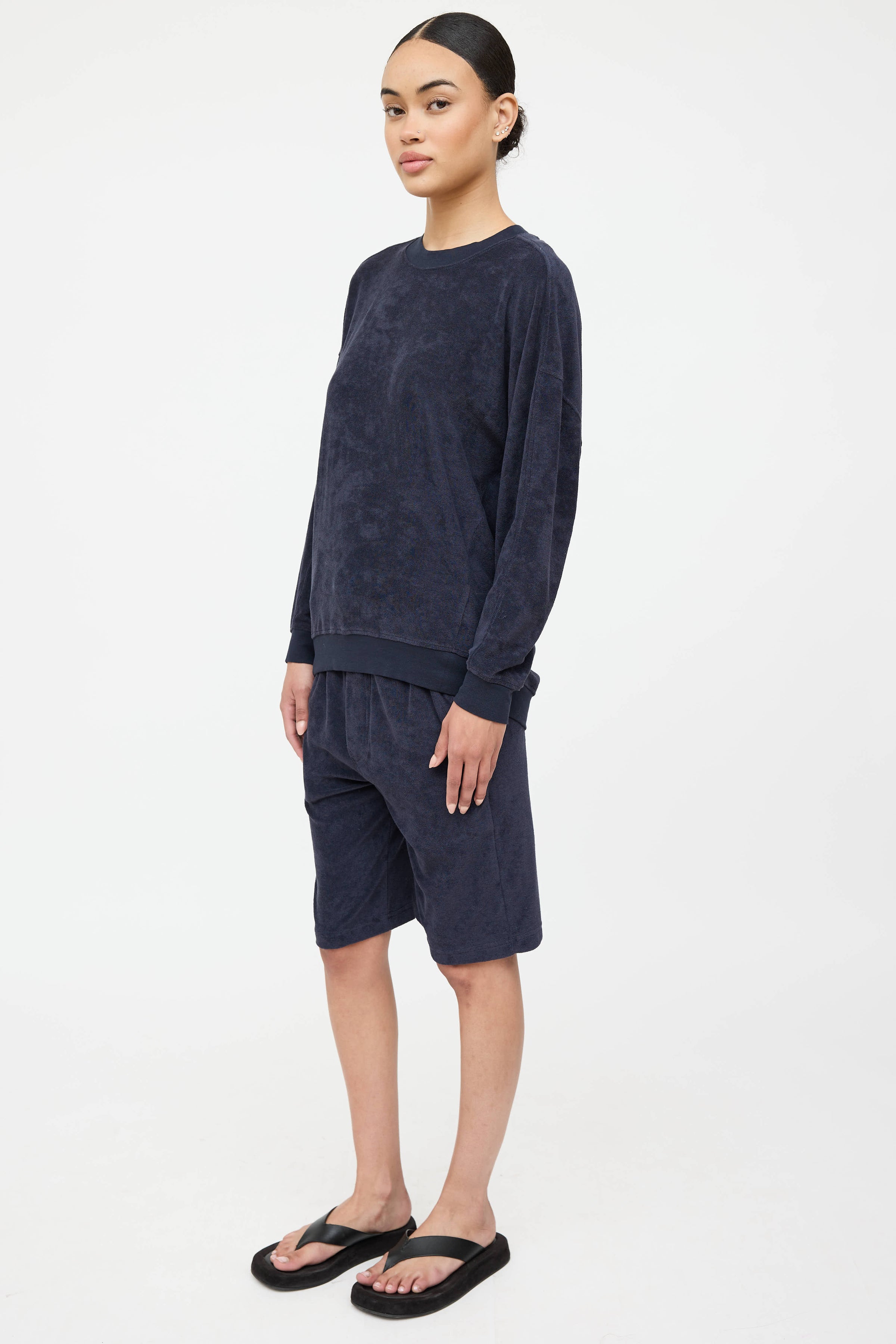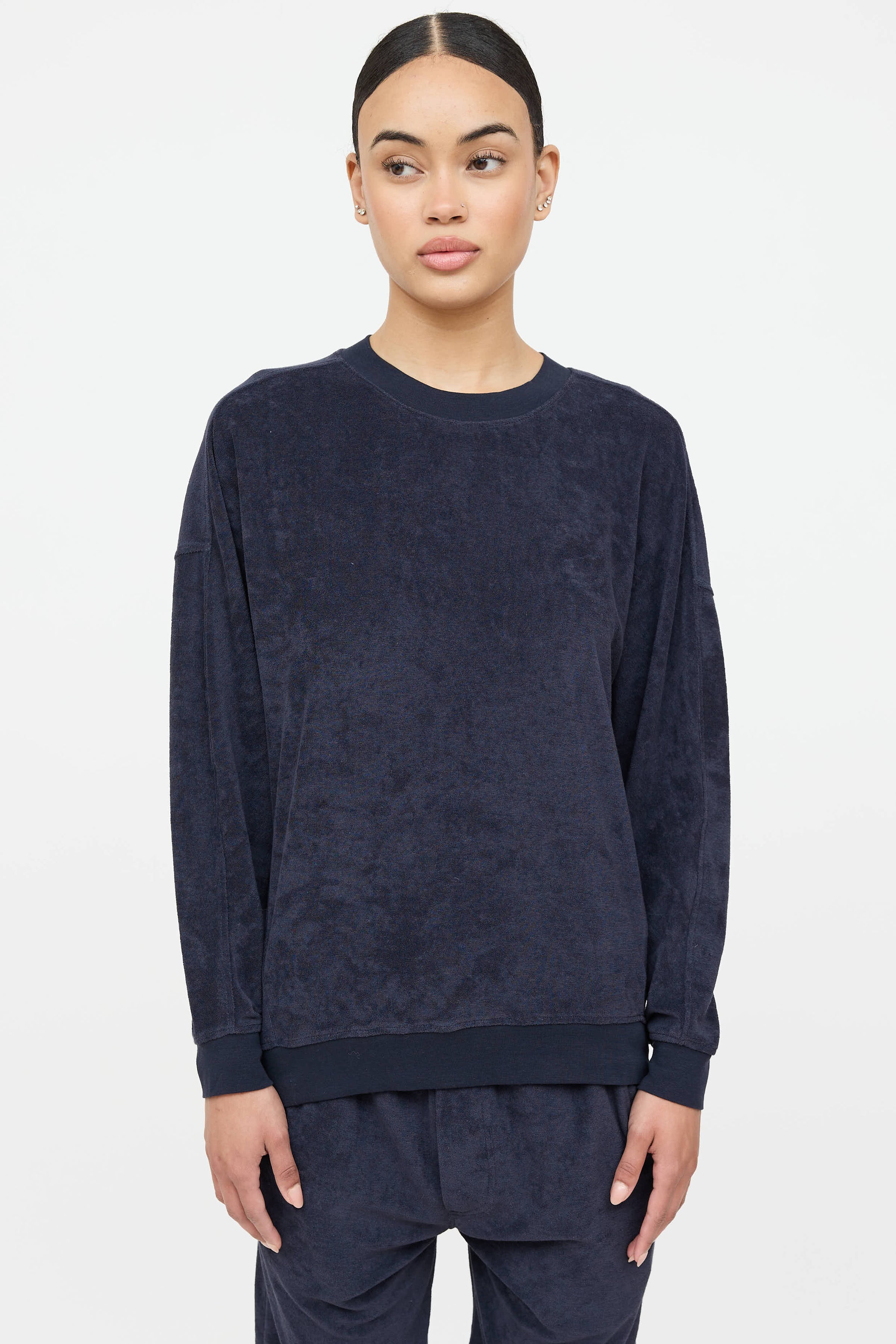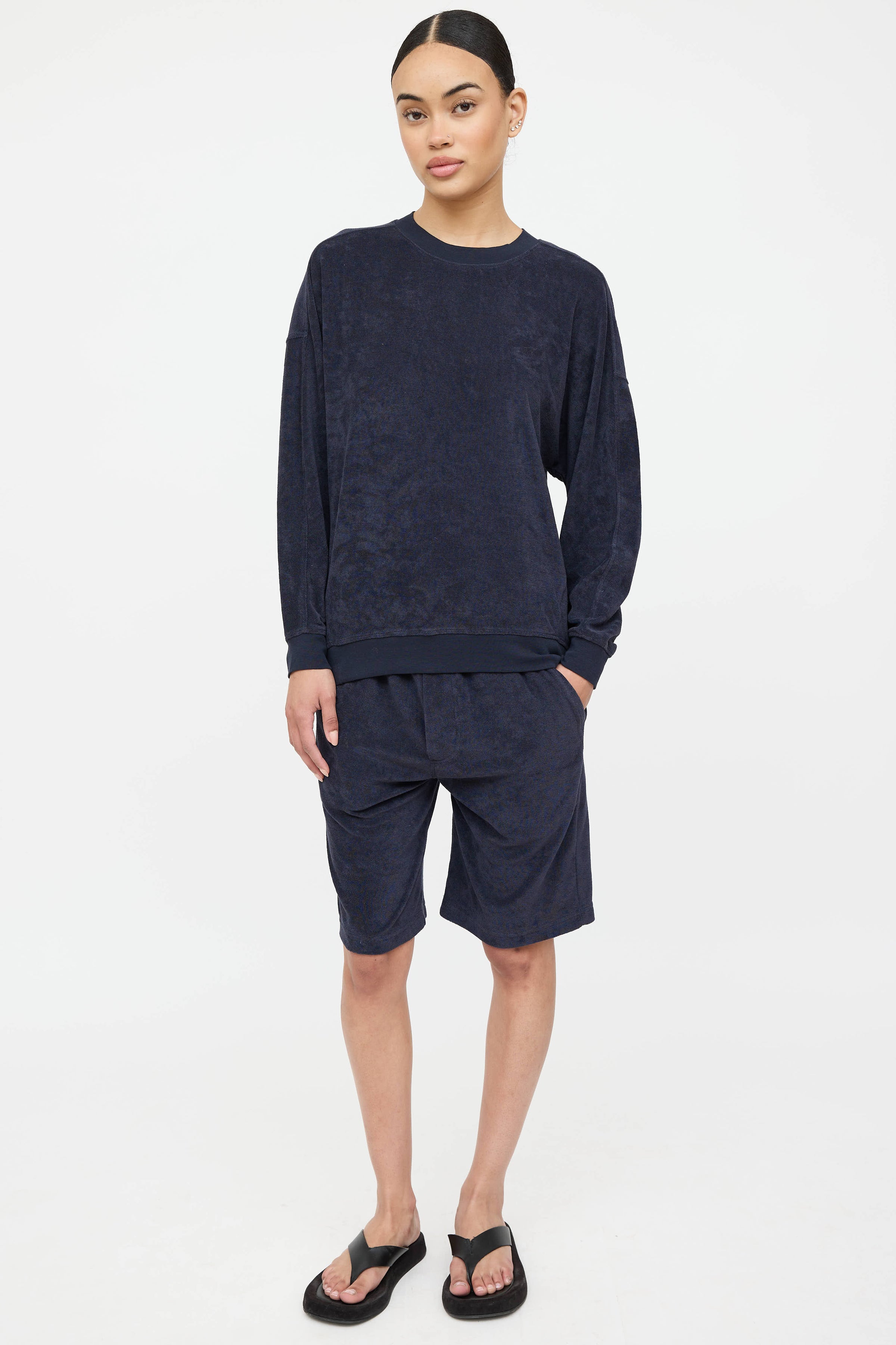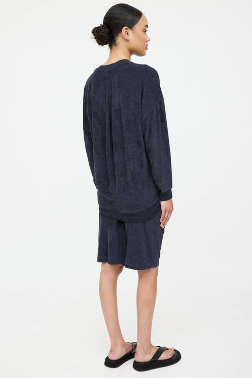 Pre-owned Nili Lotan navy velvet co-ord set featuring long sleeve top with round neckline, dropped shoulder and high low hemline. Matching navy short featuring drawstring waistband, slit pockets at side, and patch pocket at back.
