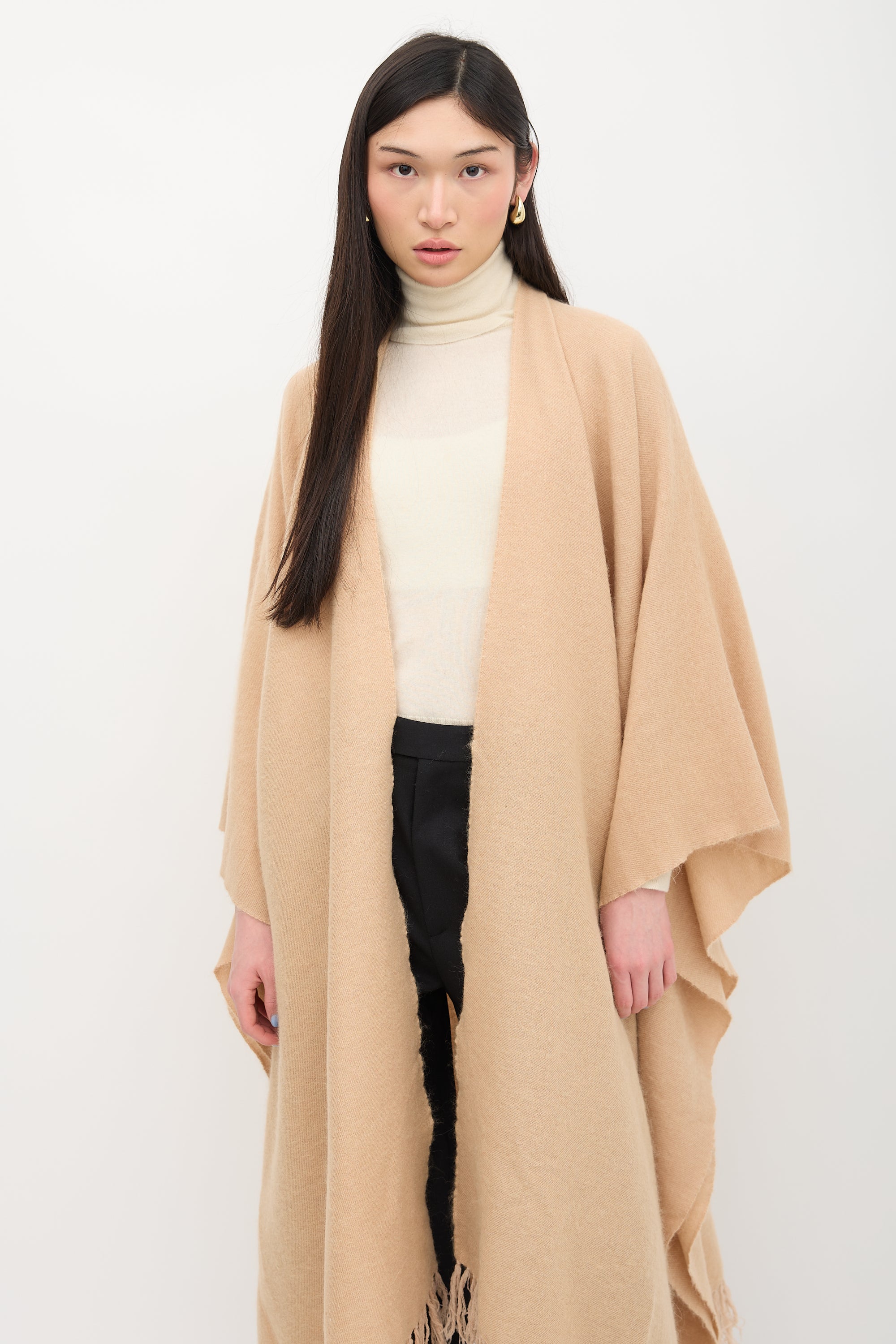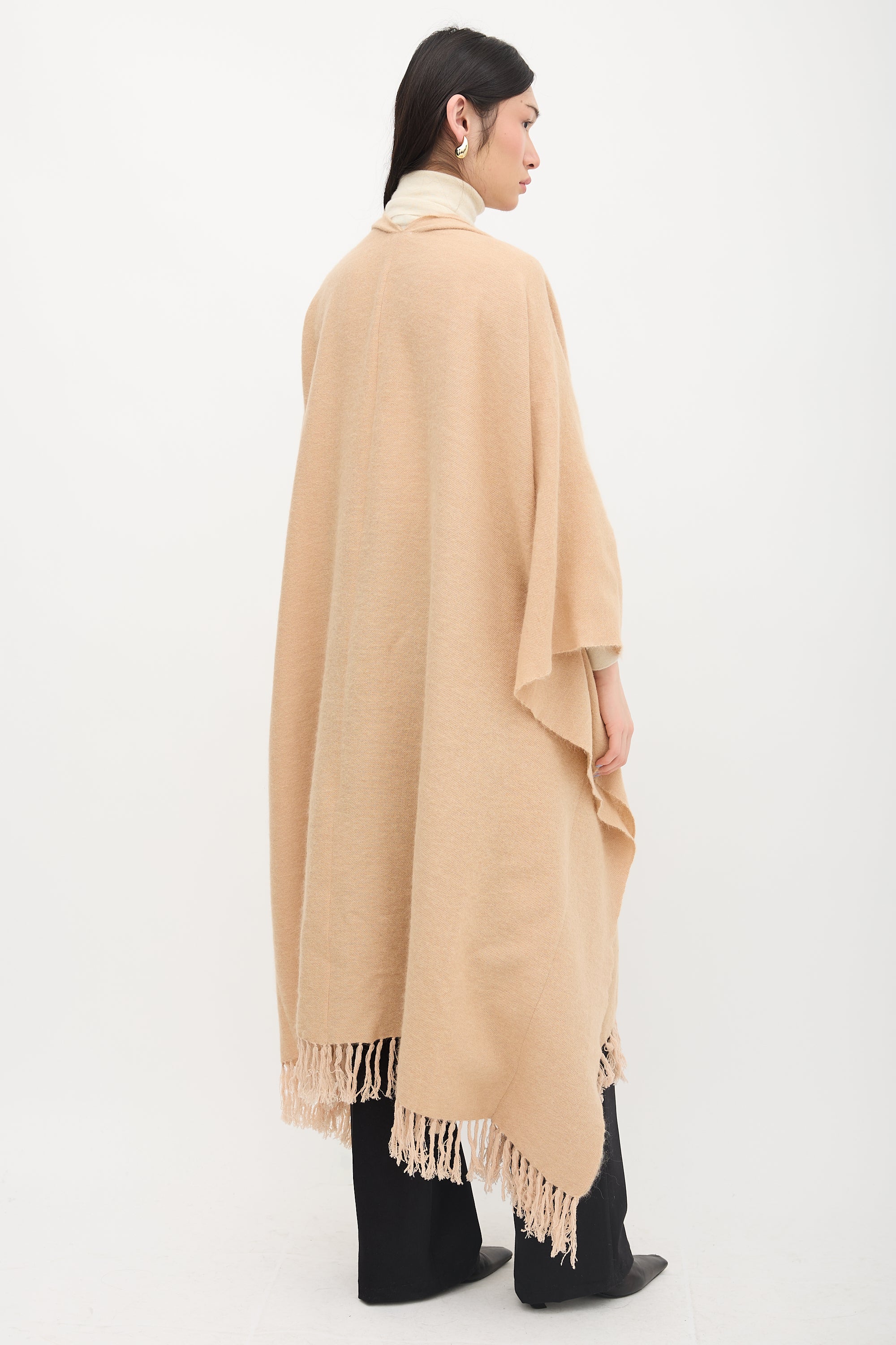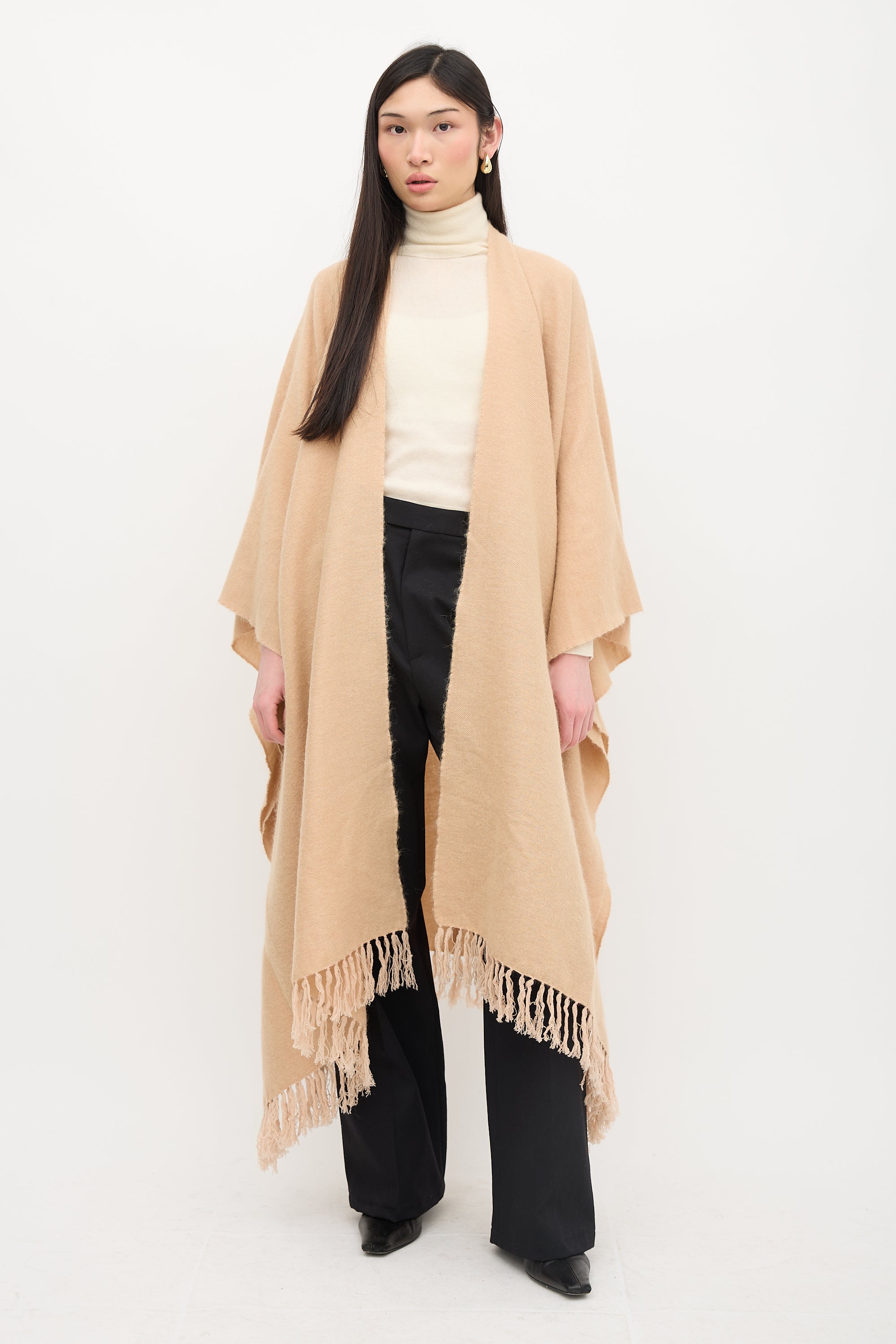 Pre-owned Brunello Cucinelli beige cashmere and mohair blend shawl featuring cape sleeves and fringed hem.