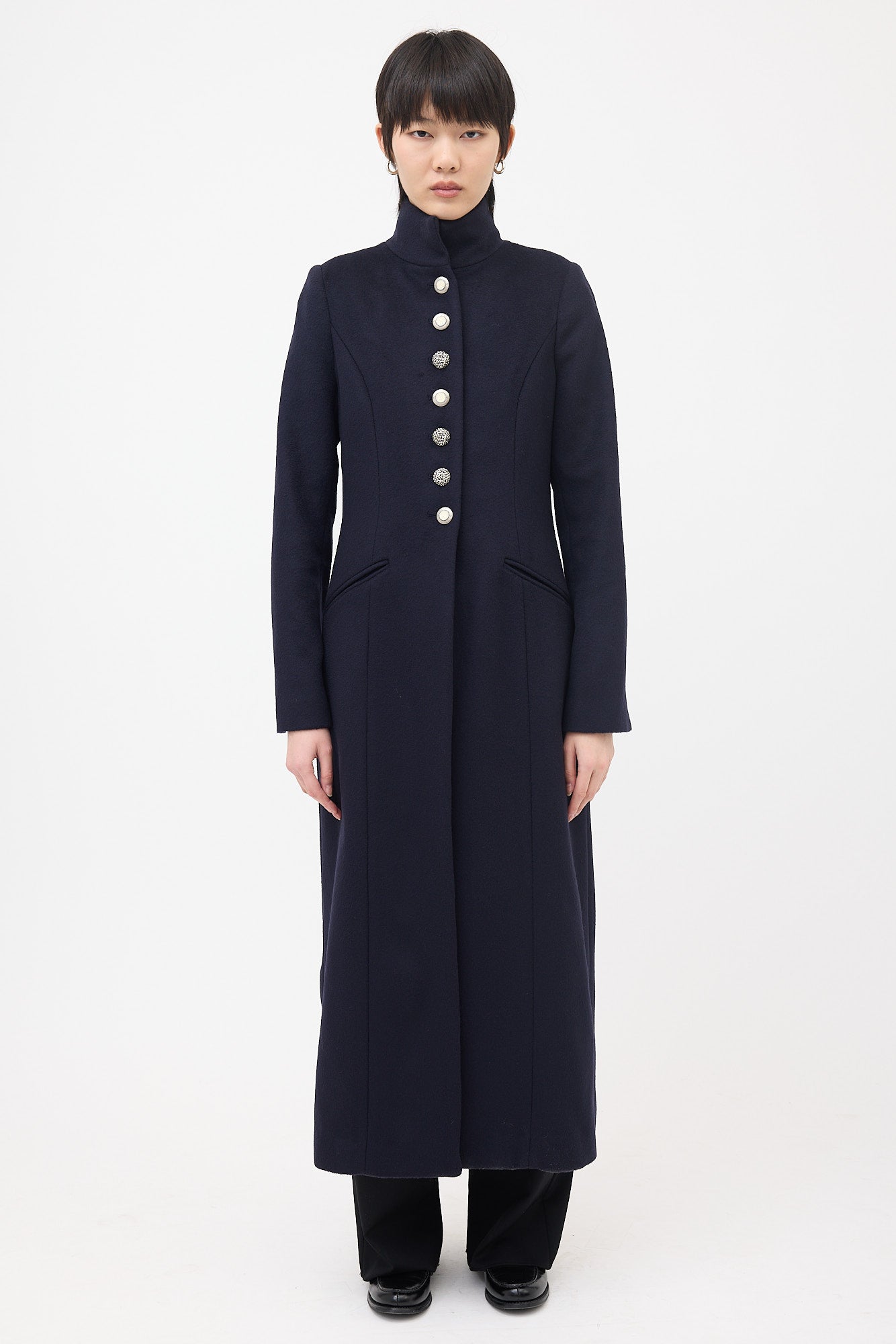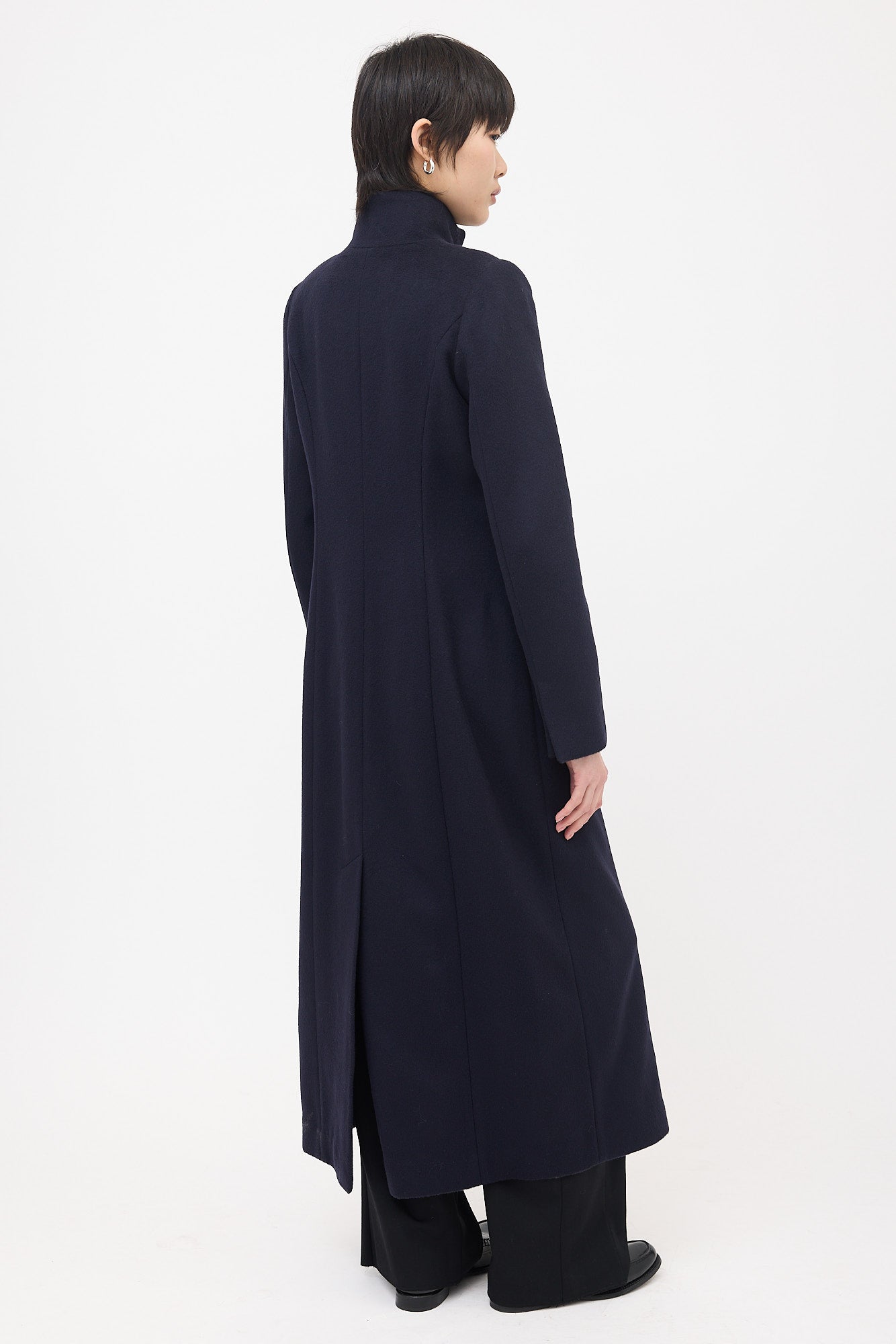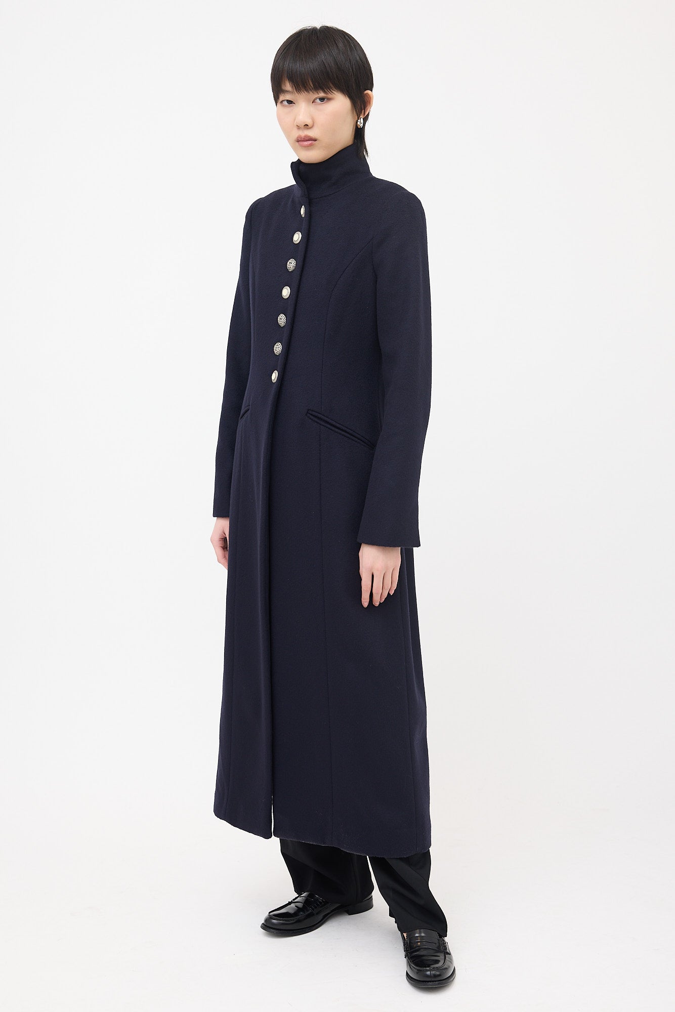 Pre-owned Pilosoule navy wool Walking Duster coat featuring stand collar, mismatched button up front, two front slip pockets, back vent, and slit cuffs. Lined.