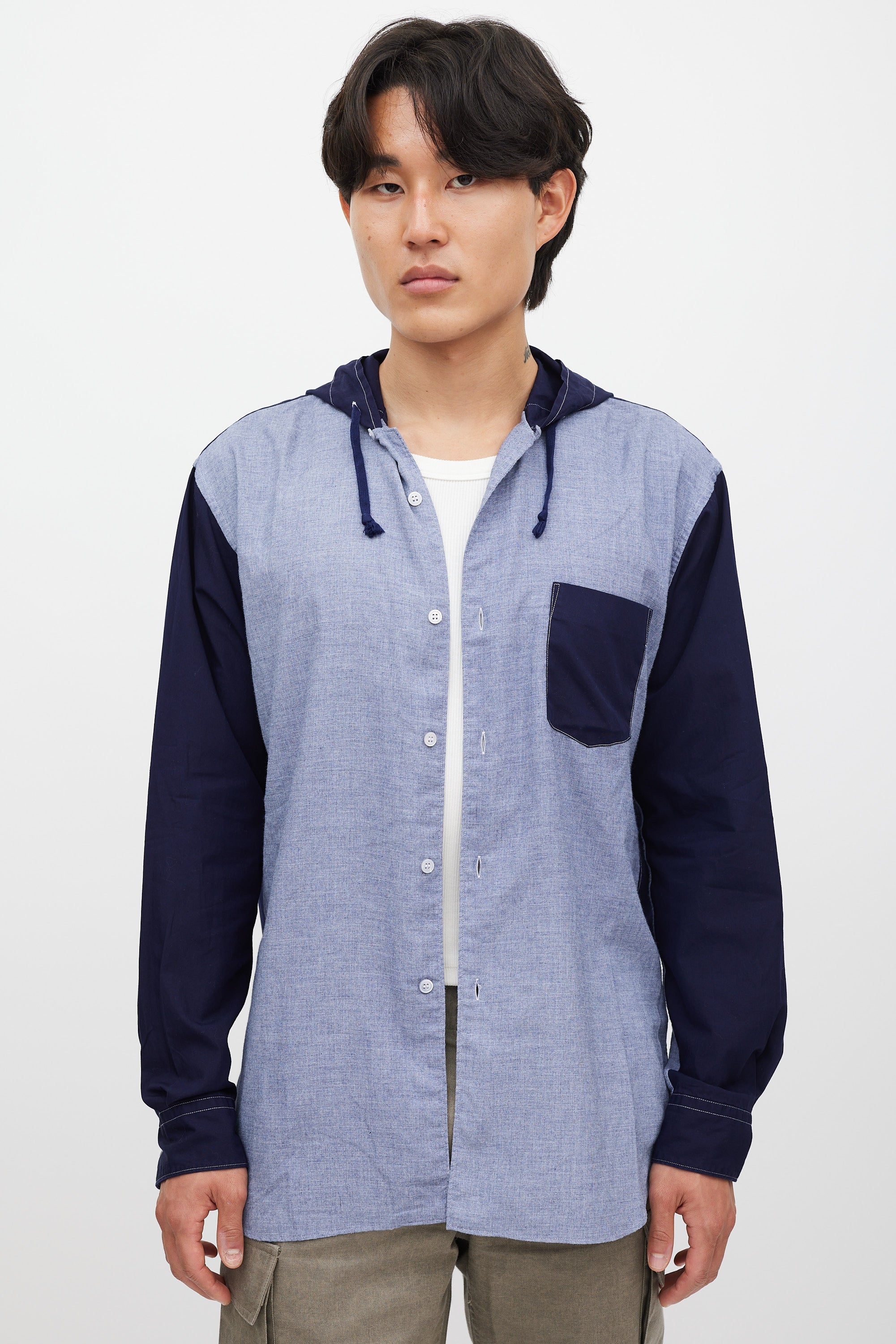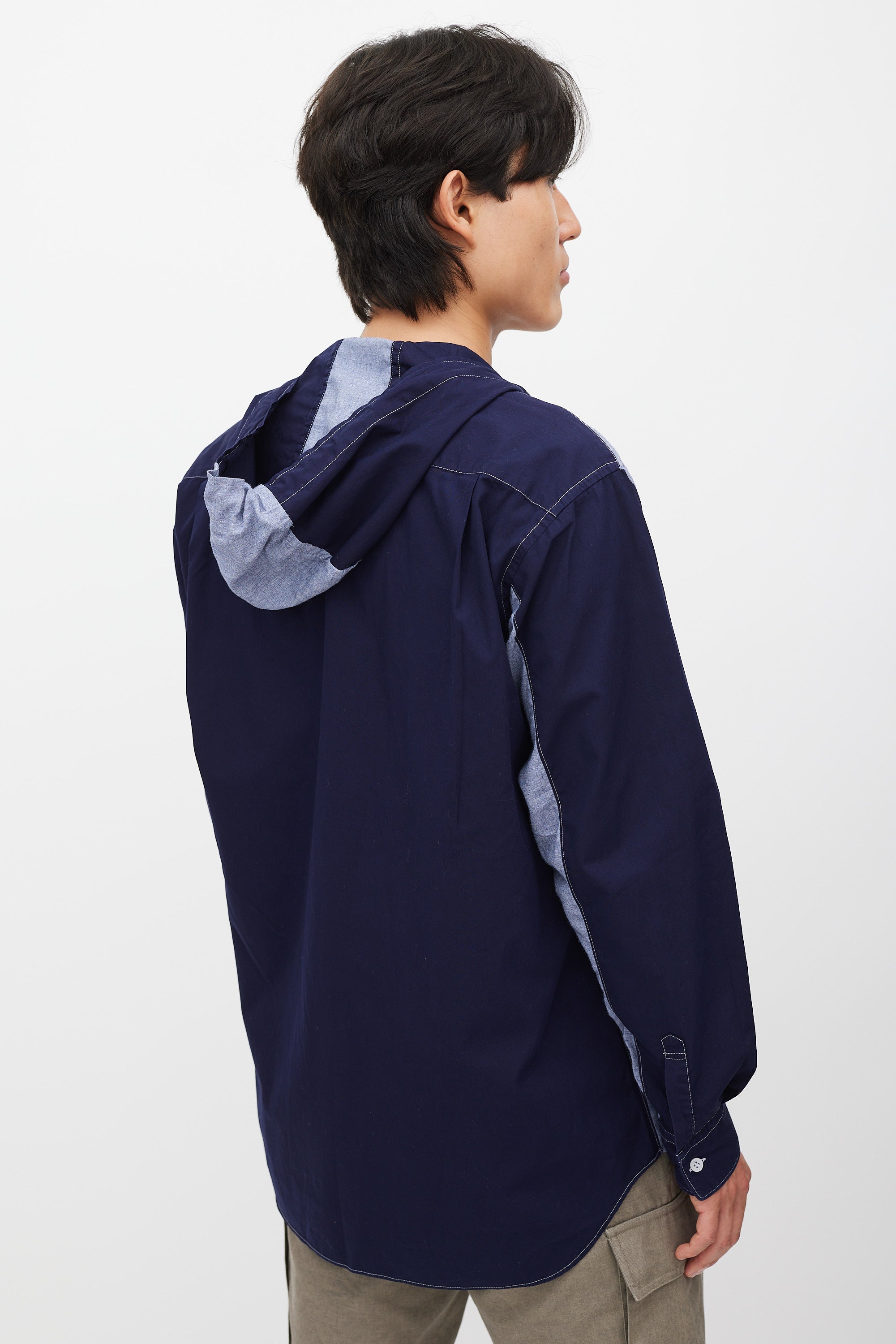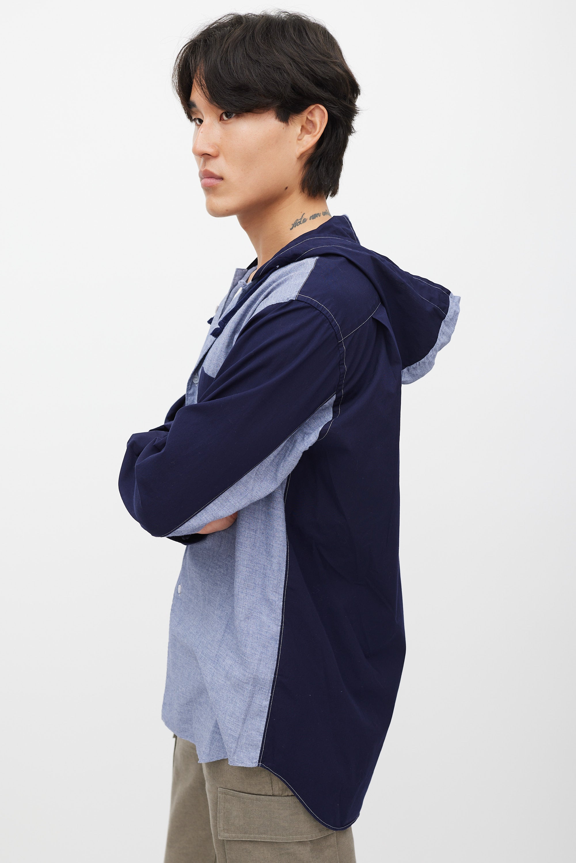 Pre-owned Comme des Garçons SHIRT blue shirt jacket featuring a drawstring hood, two tone panelling, long sleeves with buttoned cuffs, one patch pocket at chest, contrast stitching, and button up closure.