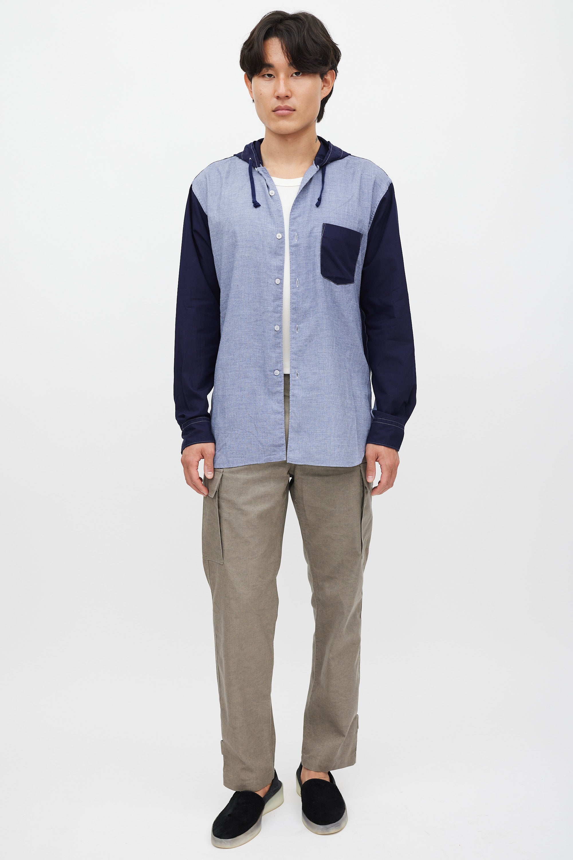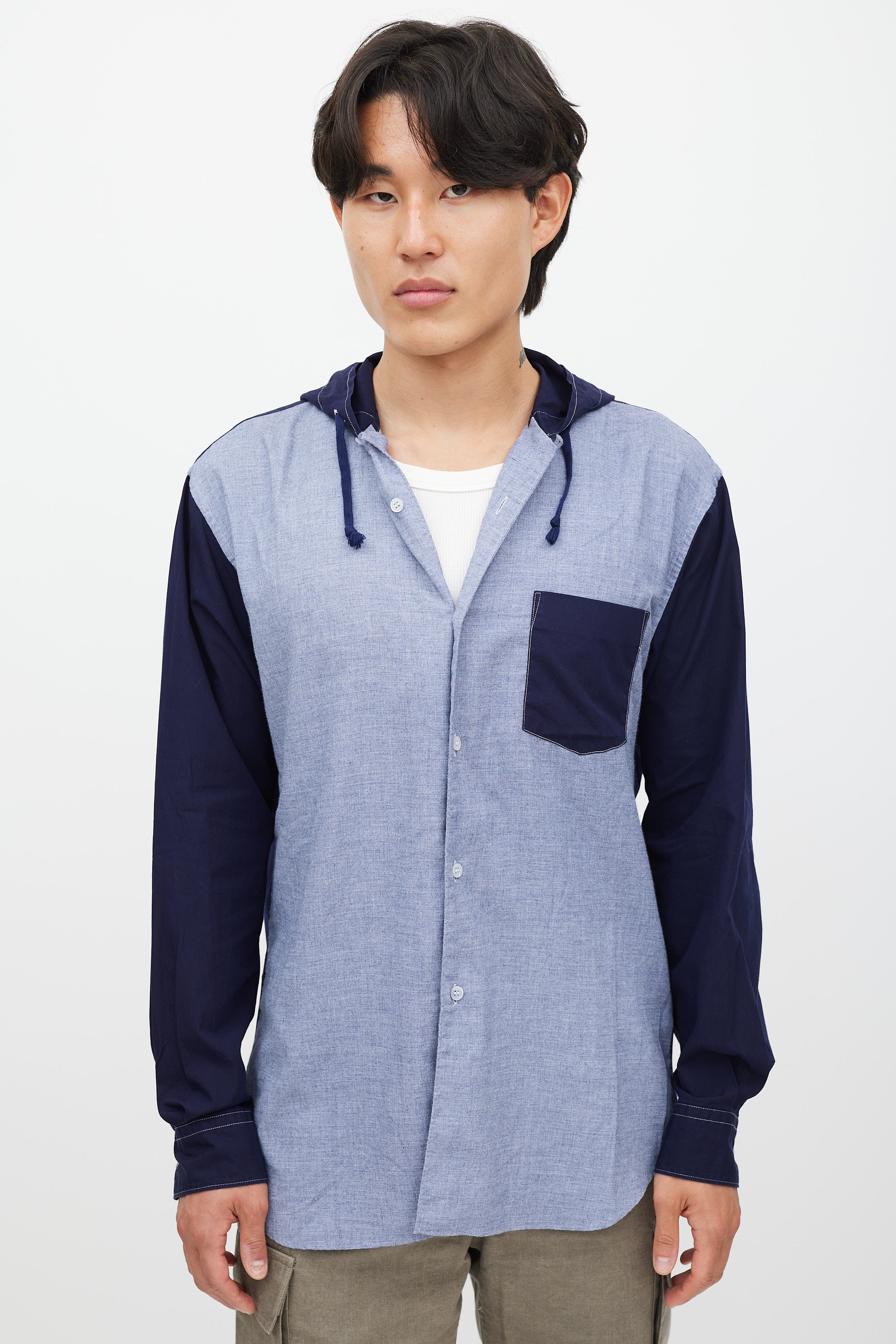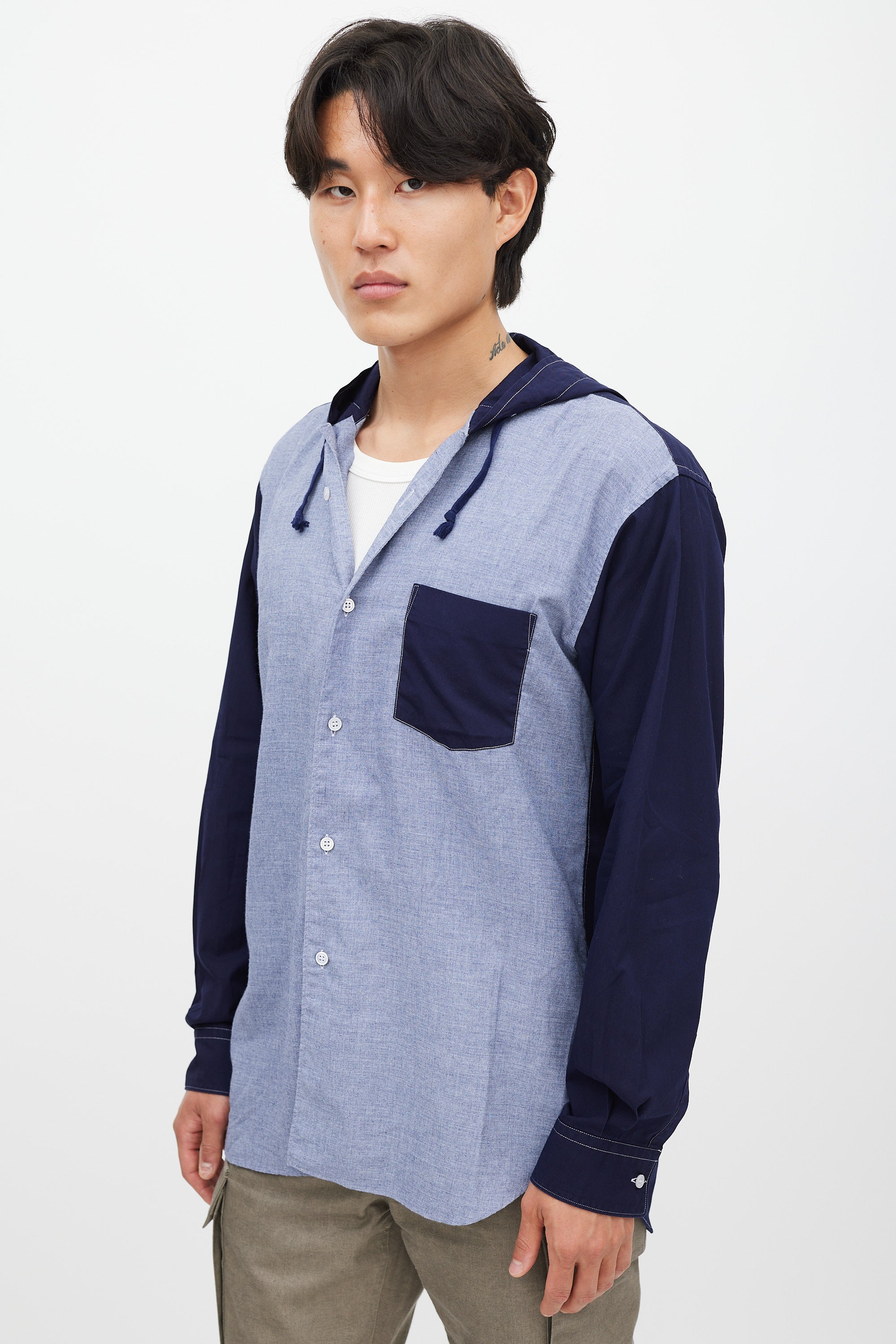 Pre-owned Comme des Garçons SHIRT blue shirt jacket featuring a drawstring hood, two tone panelling, long sleeves with buttoned cuffs, one patch pocket at chest, contrast stitching, and button up closure.