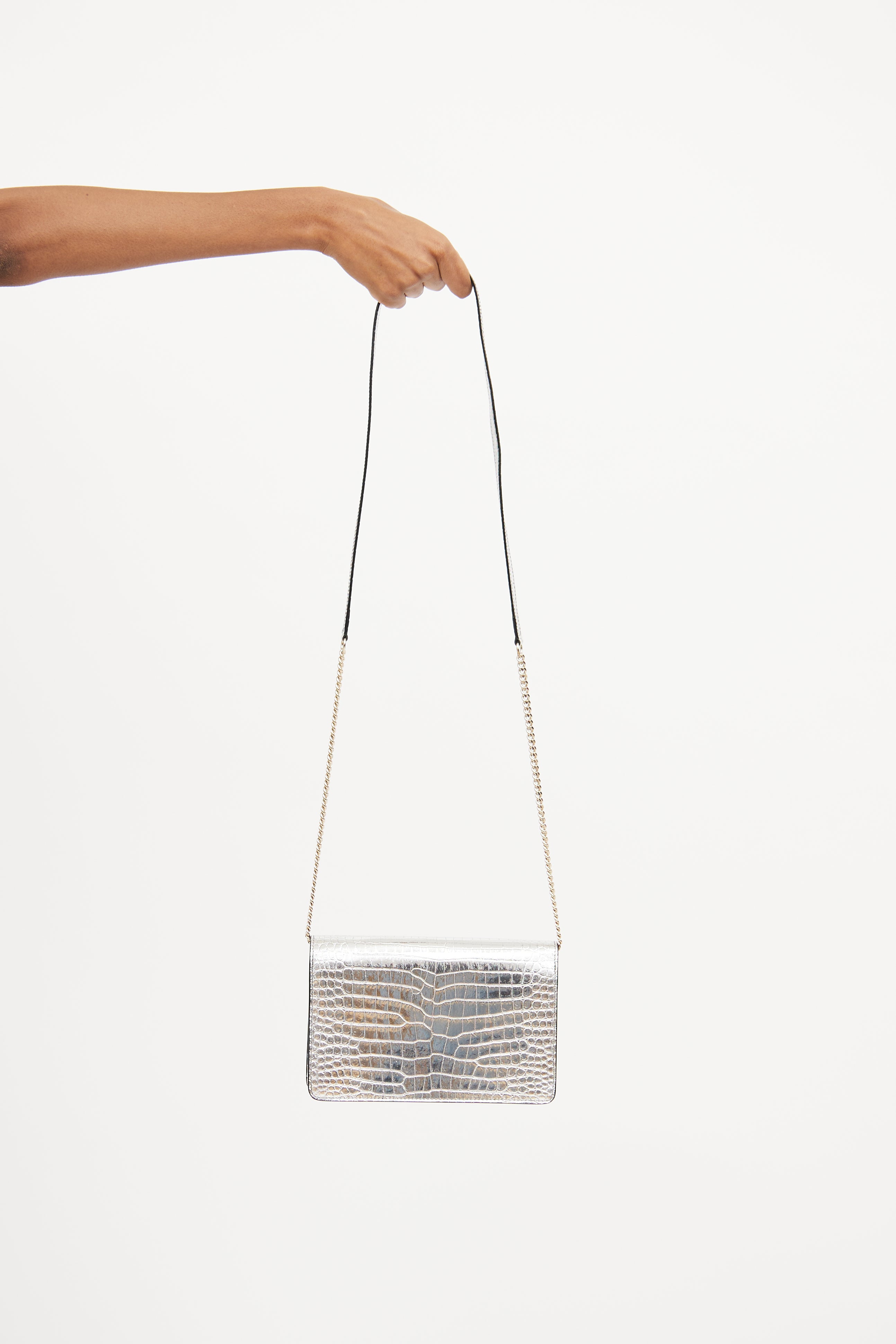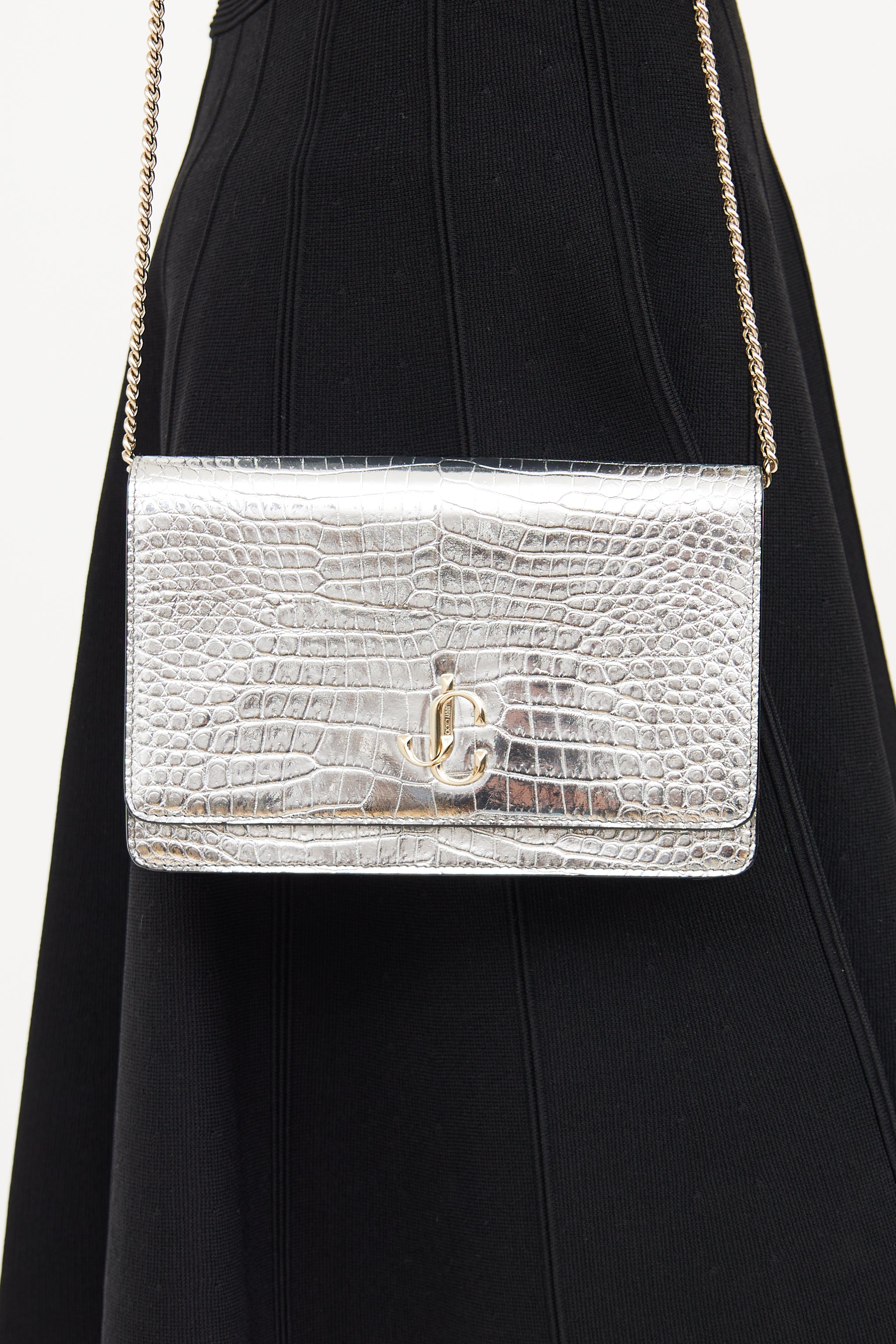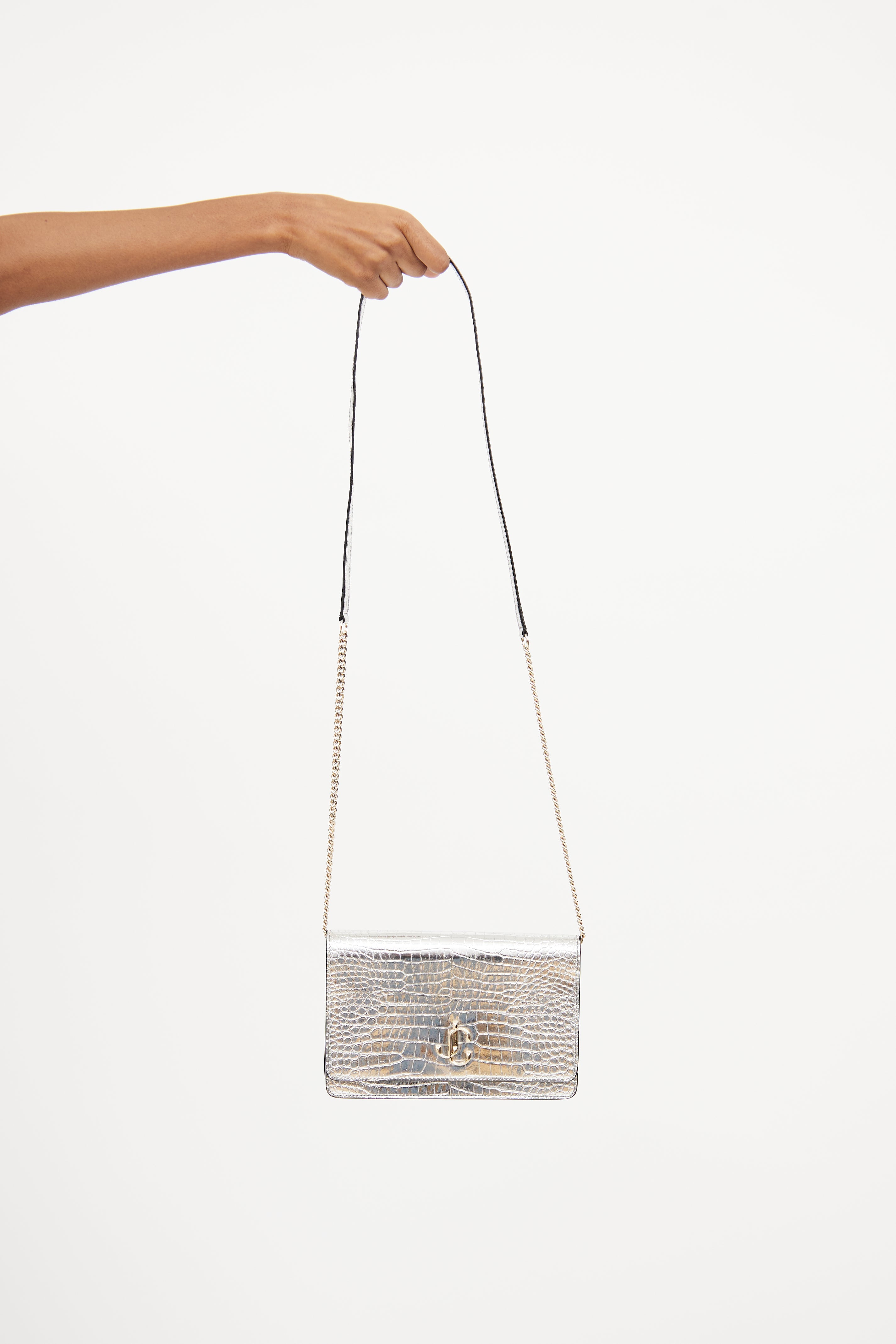 Pre-owned Jimmy Choo silver tone Palace crossbody bag featuring embossed croc finish, single flat shoulder strap with chain, JC logo hardware at face and front flap with magnetic button closure. Canvas lined main compartment, one zip pocket, one slip pocket and six card slots.
