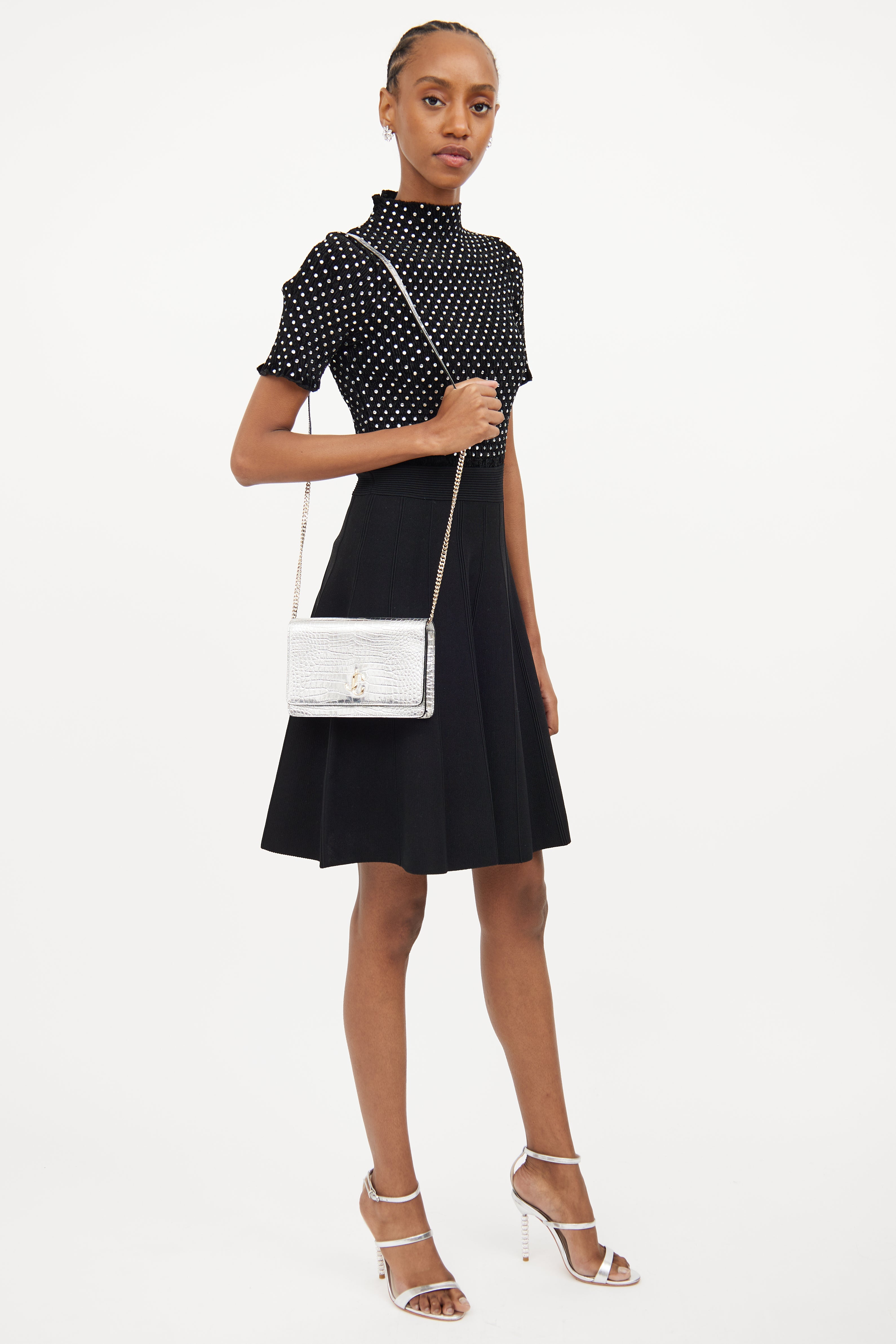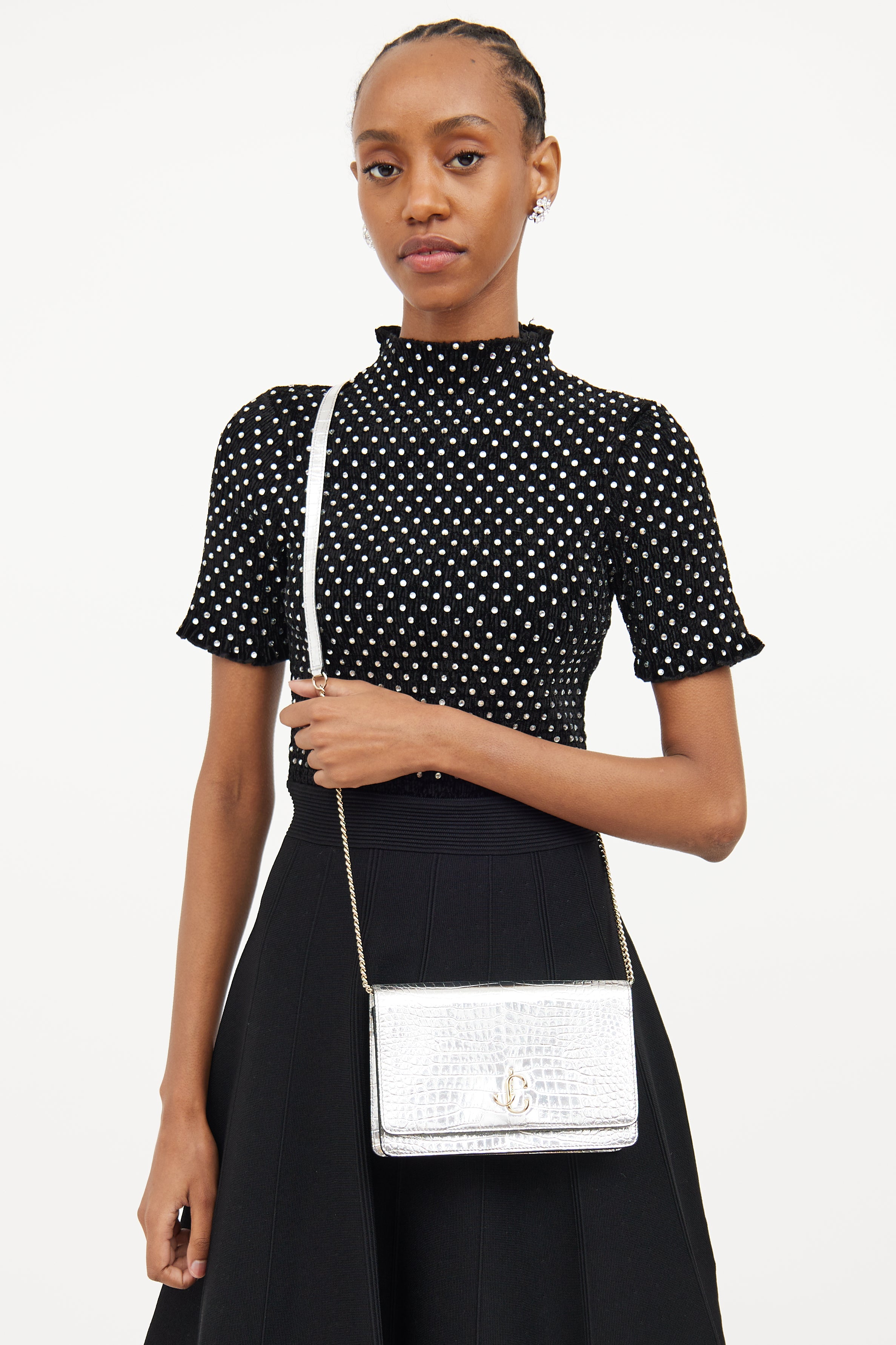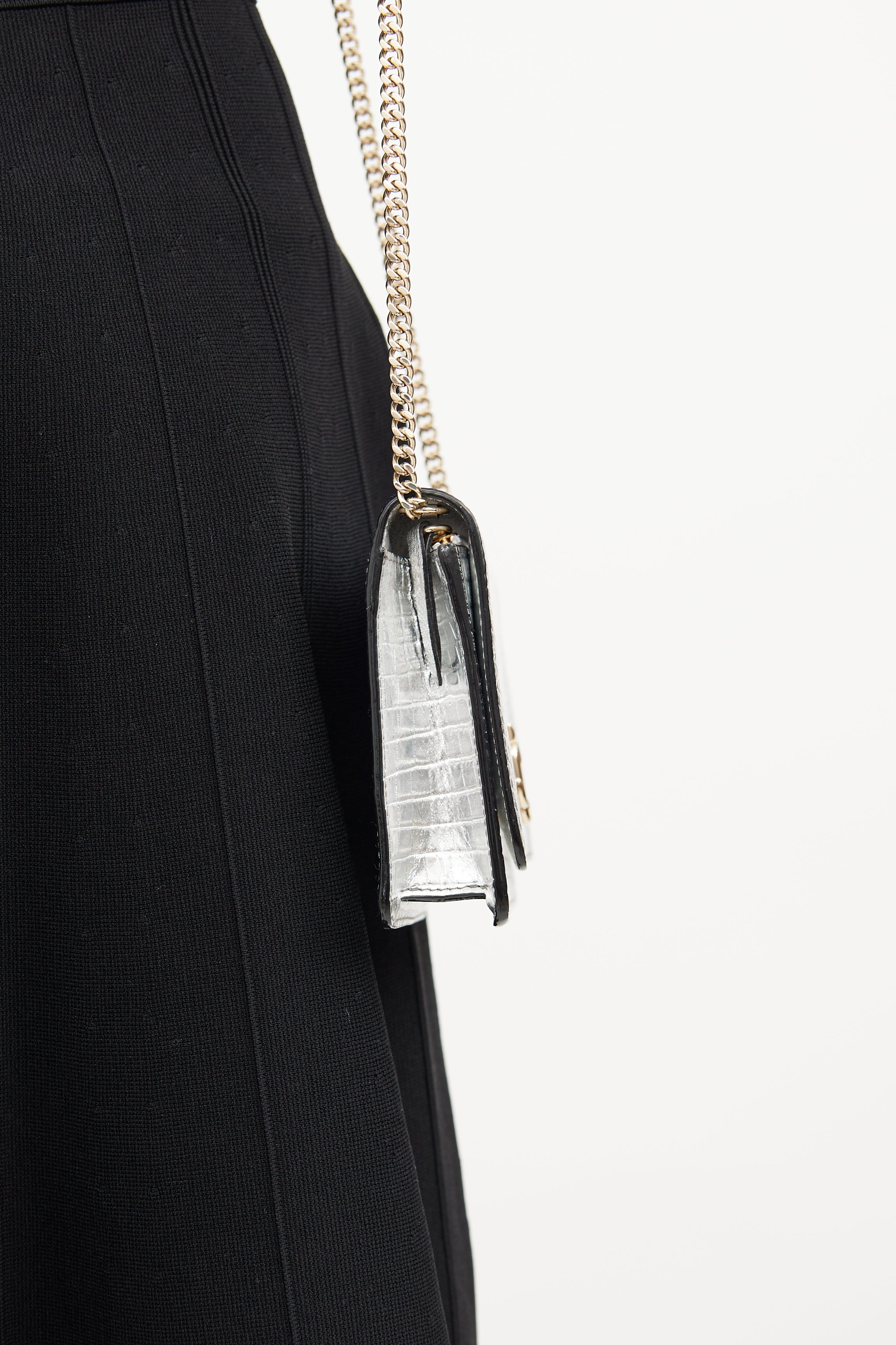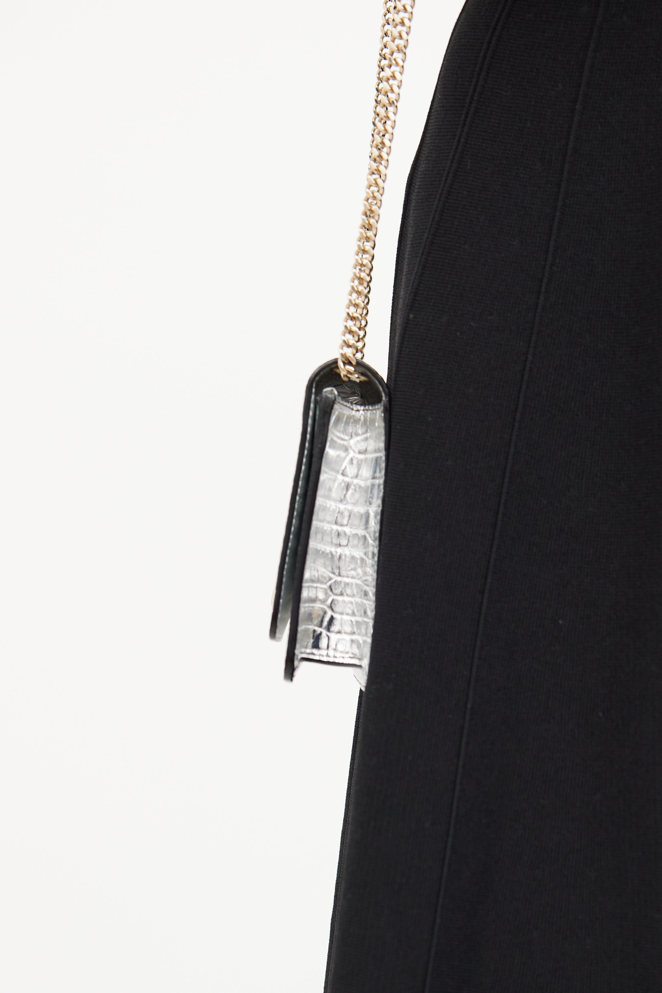 Pre-owned Jimmy Choo silver tone Palace crossbody bag featuring embossed croc finish, single flat shoulder strap with chain, JC logo hardware at face and front flap with magnetic button closure. Canvas lined main compartment, one zip pocket, one slip pocket and six card slots.