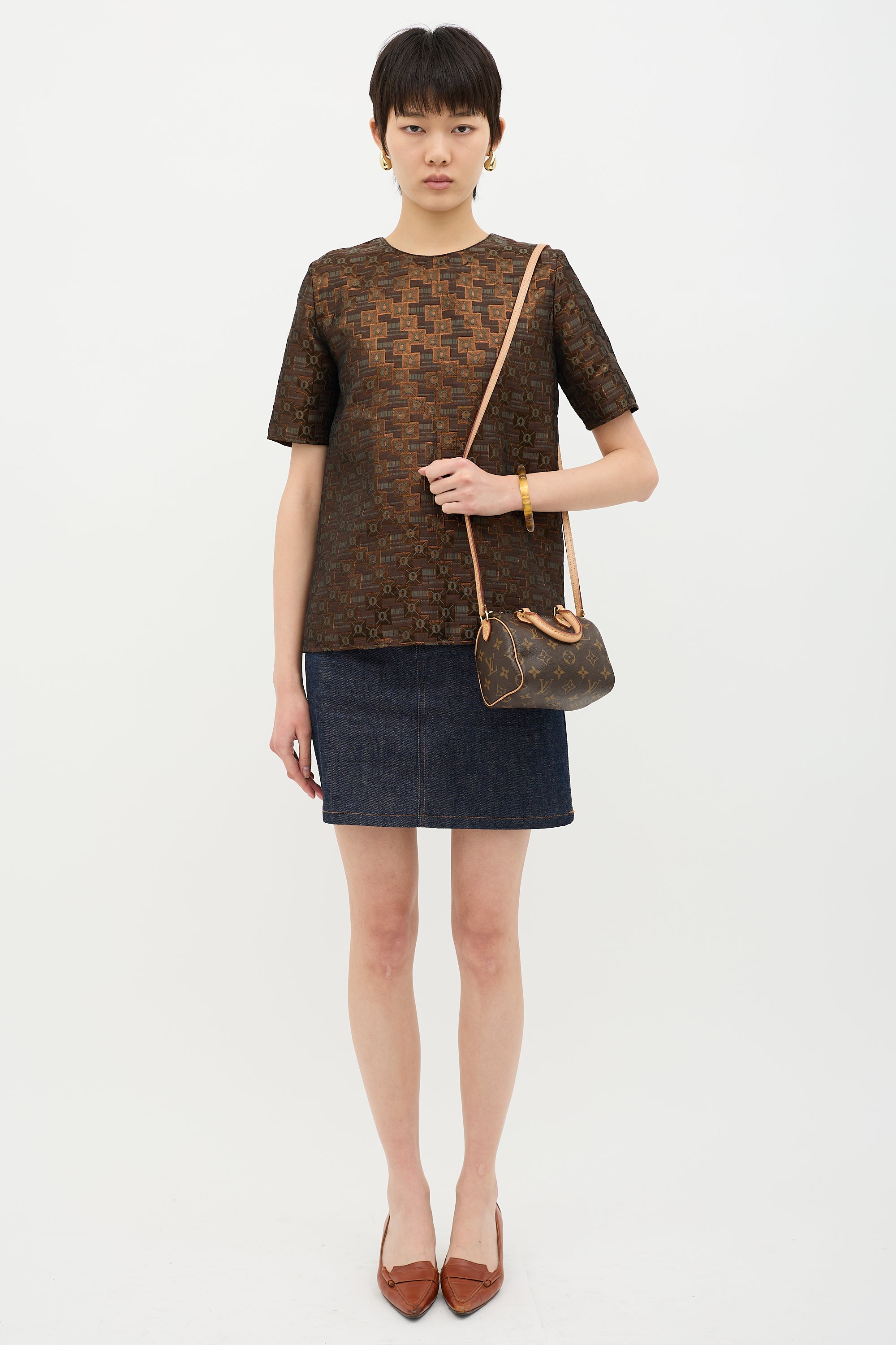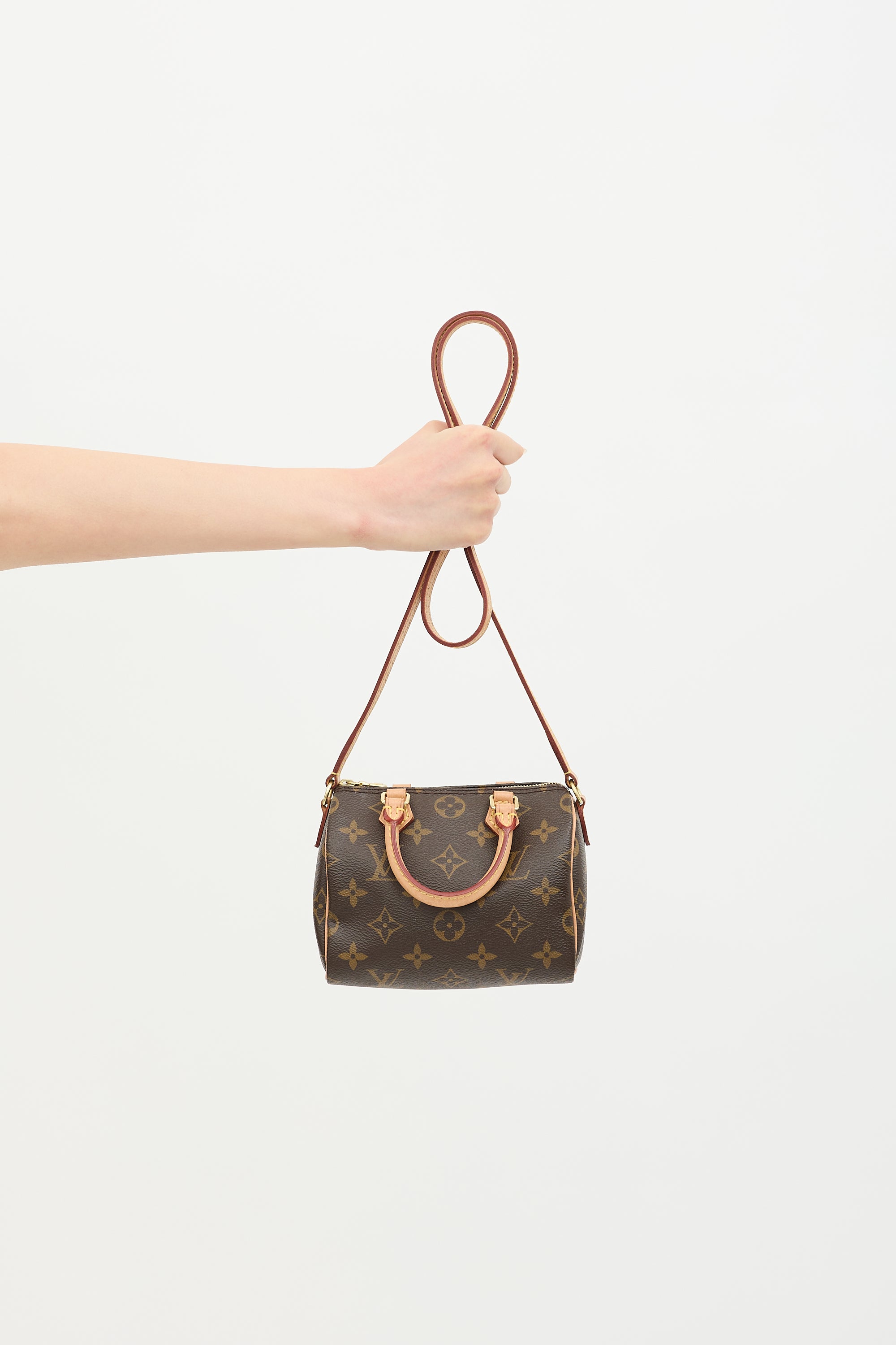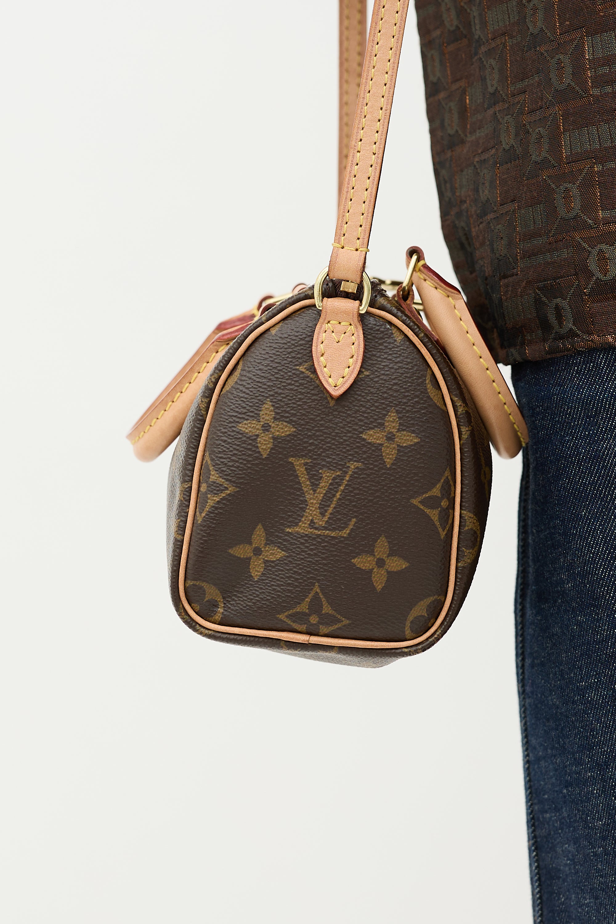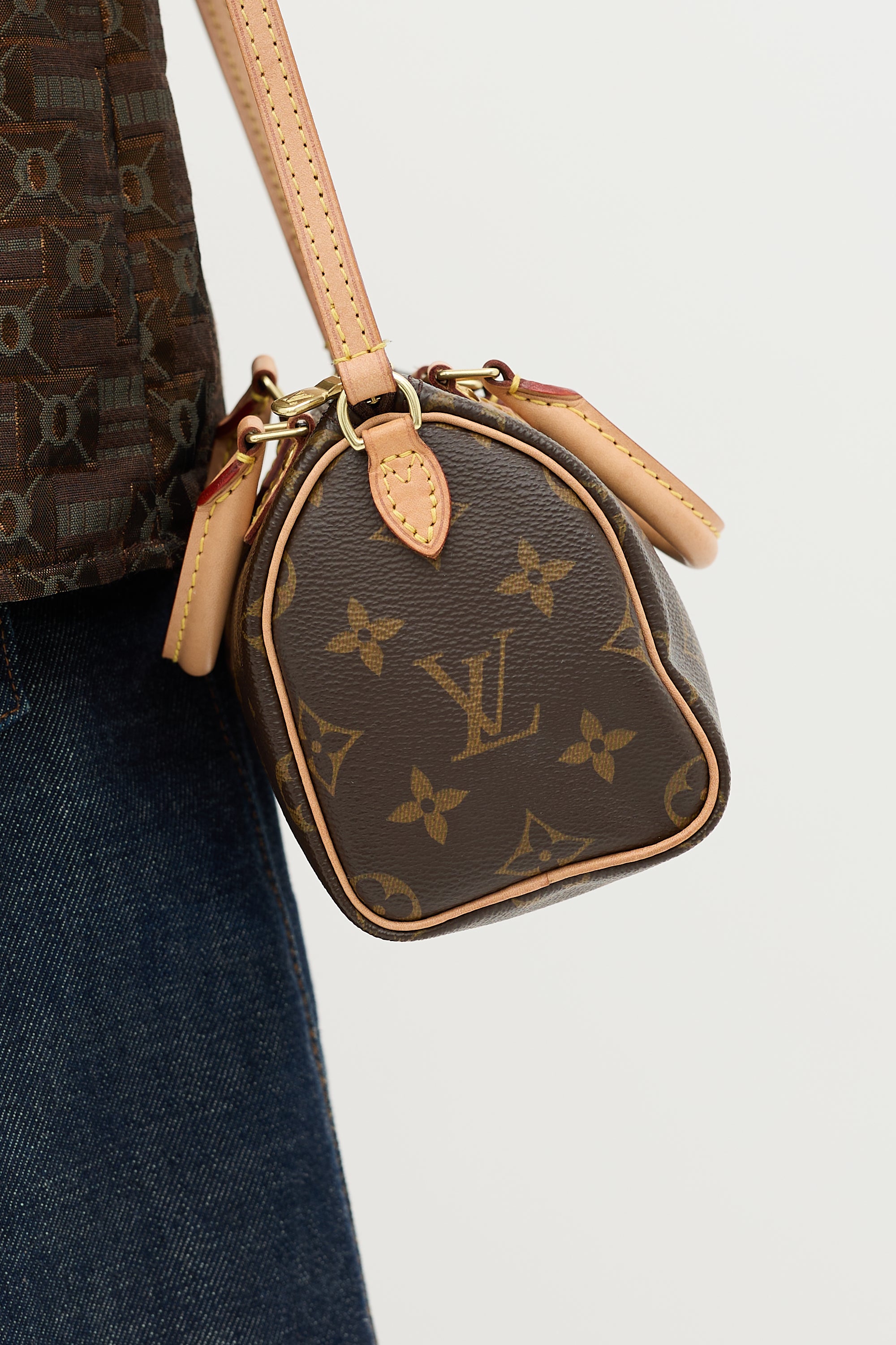 Pre-owned Louis Vuitton 2020 brown Nano Speedy bag featuring a signature monogram coated canvas, Vachetta leather trim, gold tone hardware, dual rolled top handles, flat shoulder strap, top zip closure, and one main compartment. Comes with original box and dust bag.