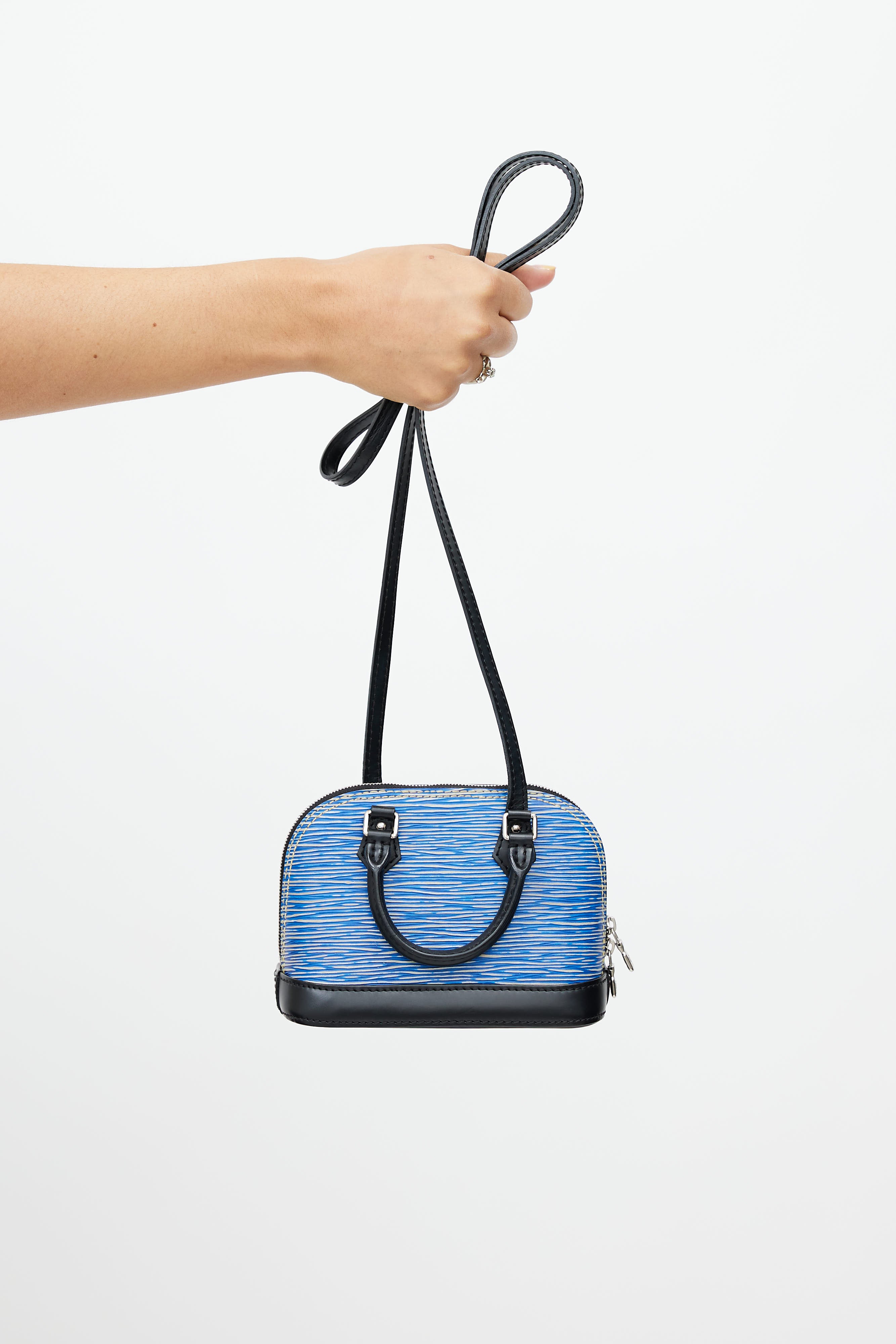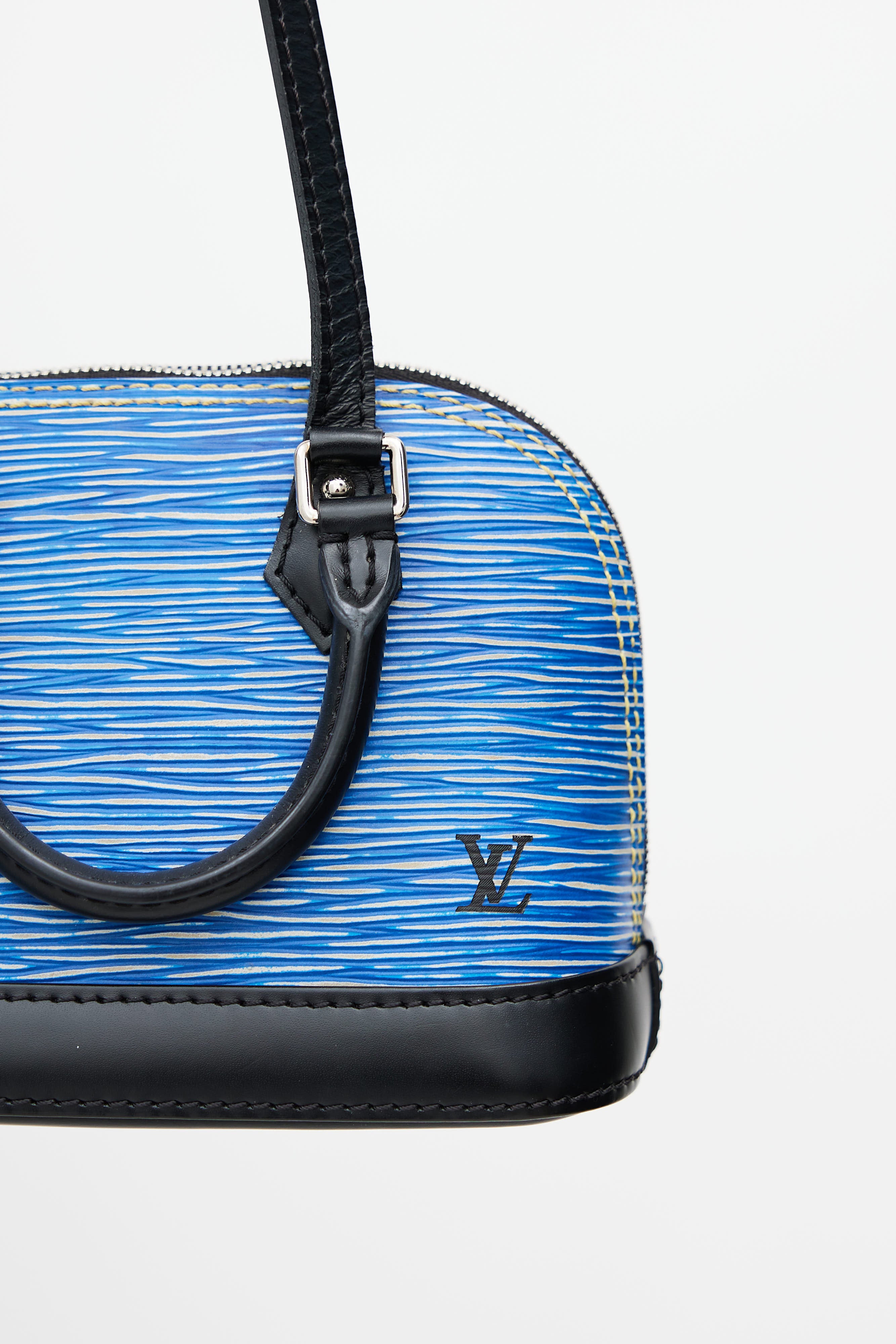 Pre-owned Spring/ Summer 2016 Louis Vuitton Nano Alma shoulder bag in blue denim featuring Epi leather, black embossed logo at front, black leather trim, full zip closure, lined main compartment with logo tab, two rolled top handles, and attached shoulder strap. Comes with original dust bag.