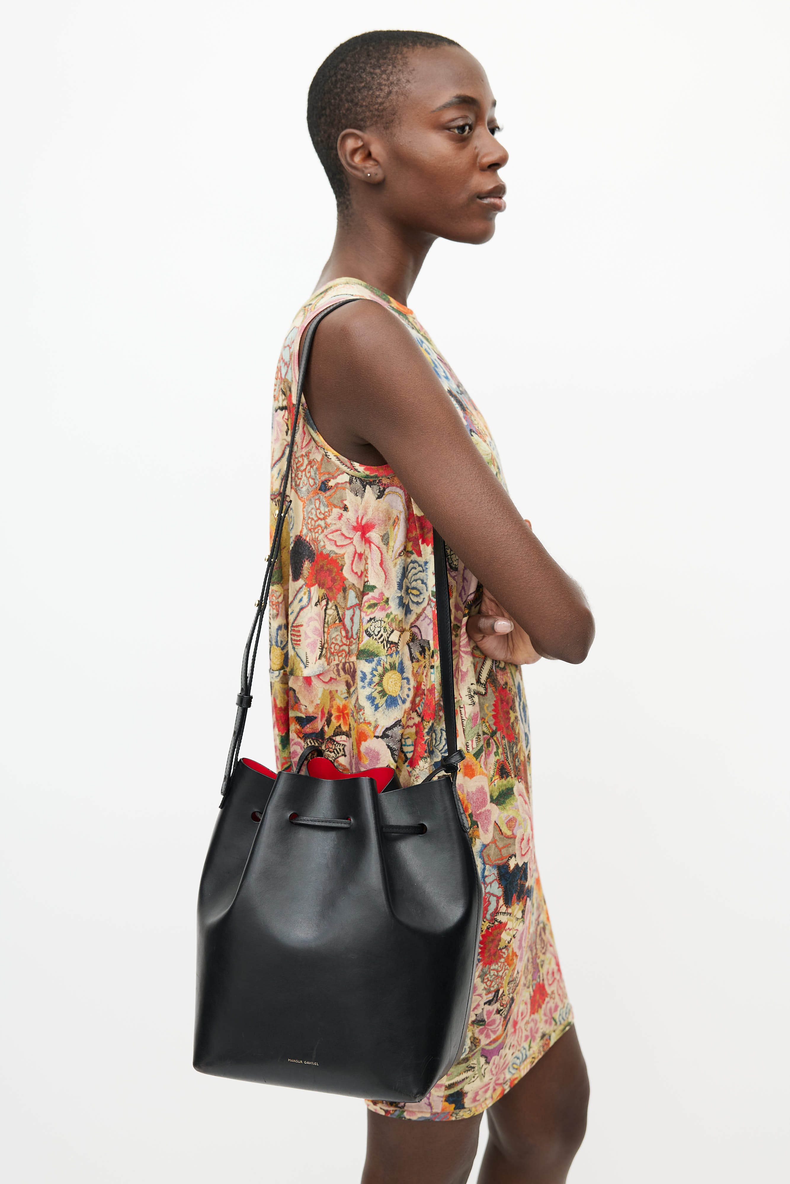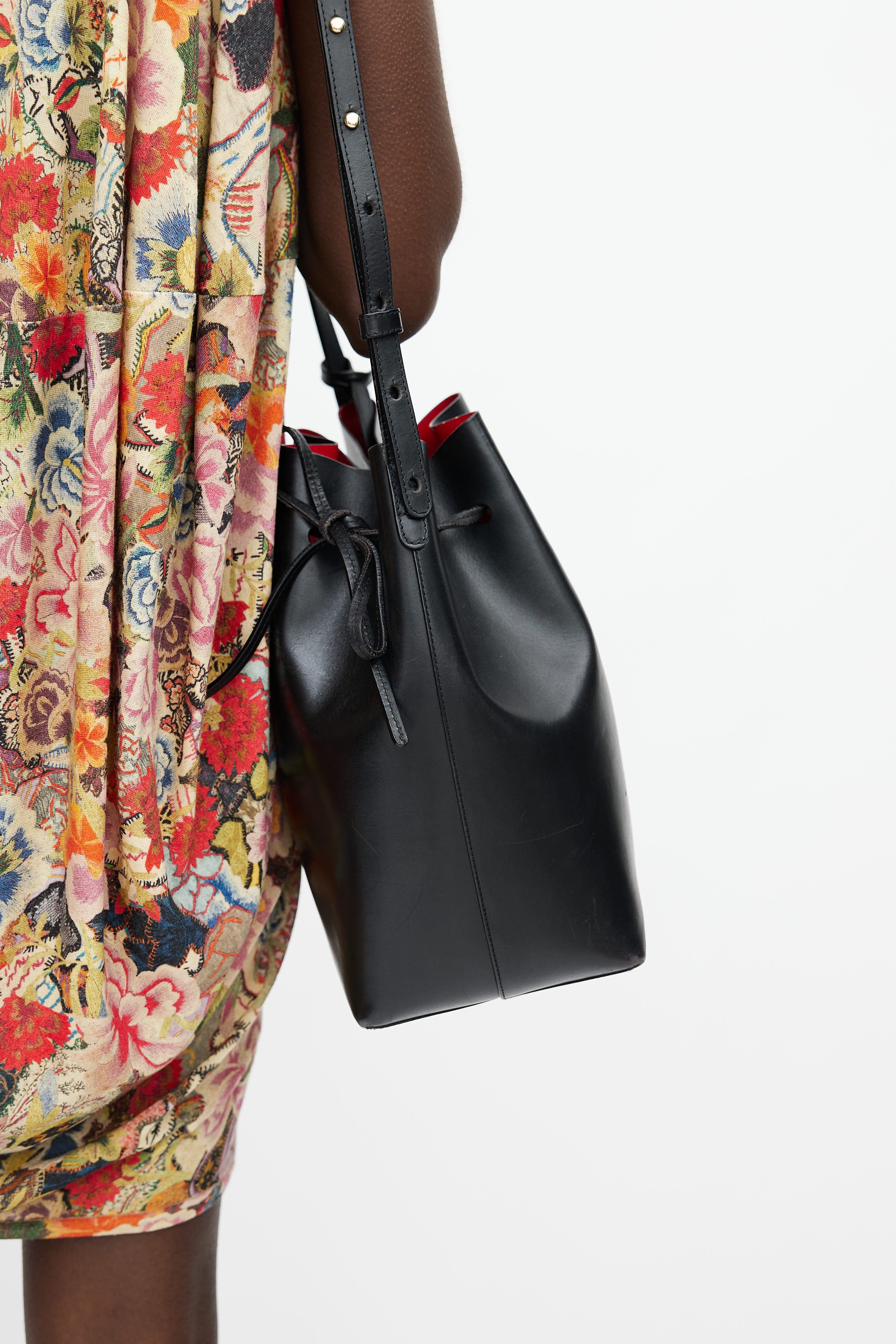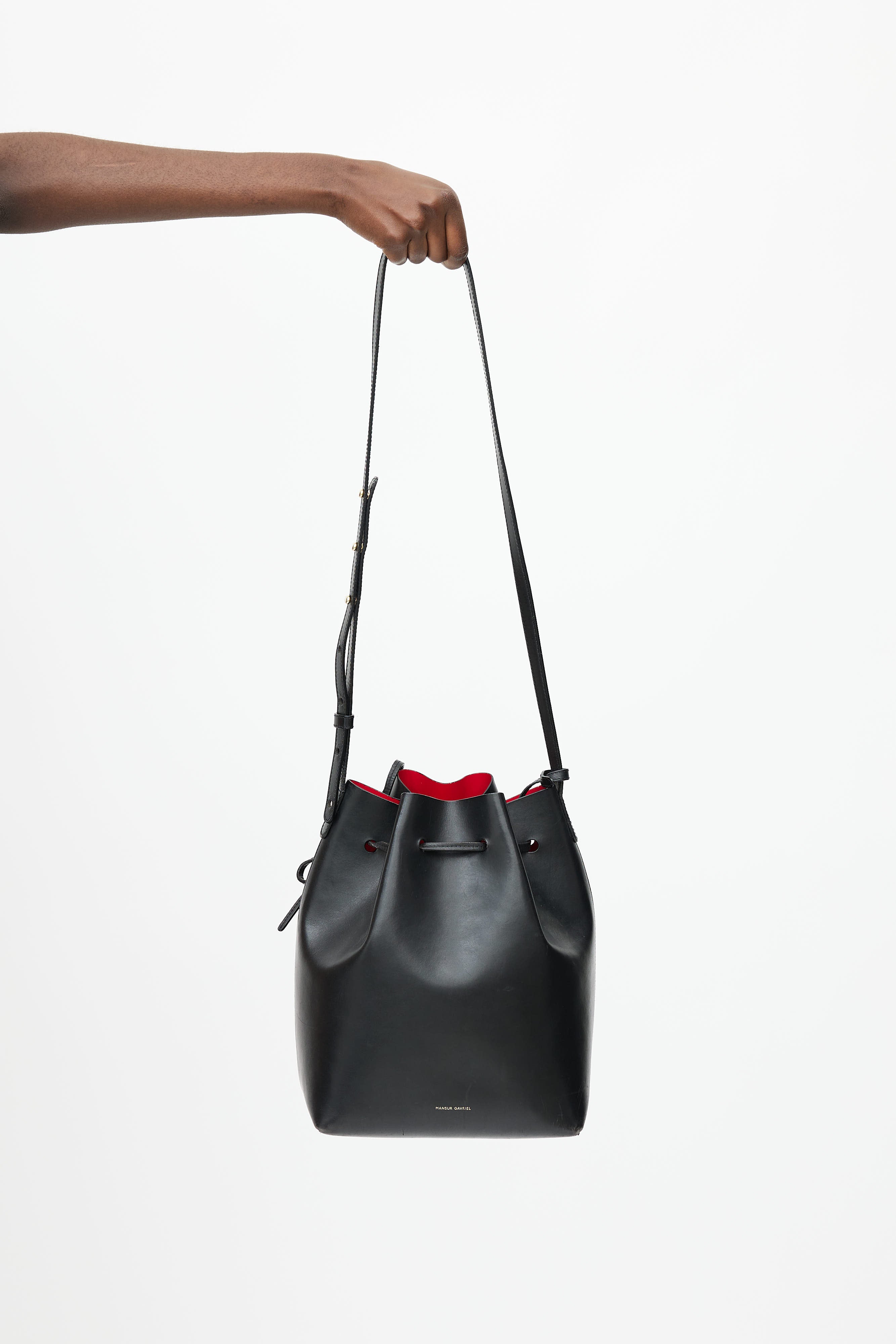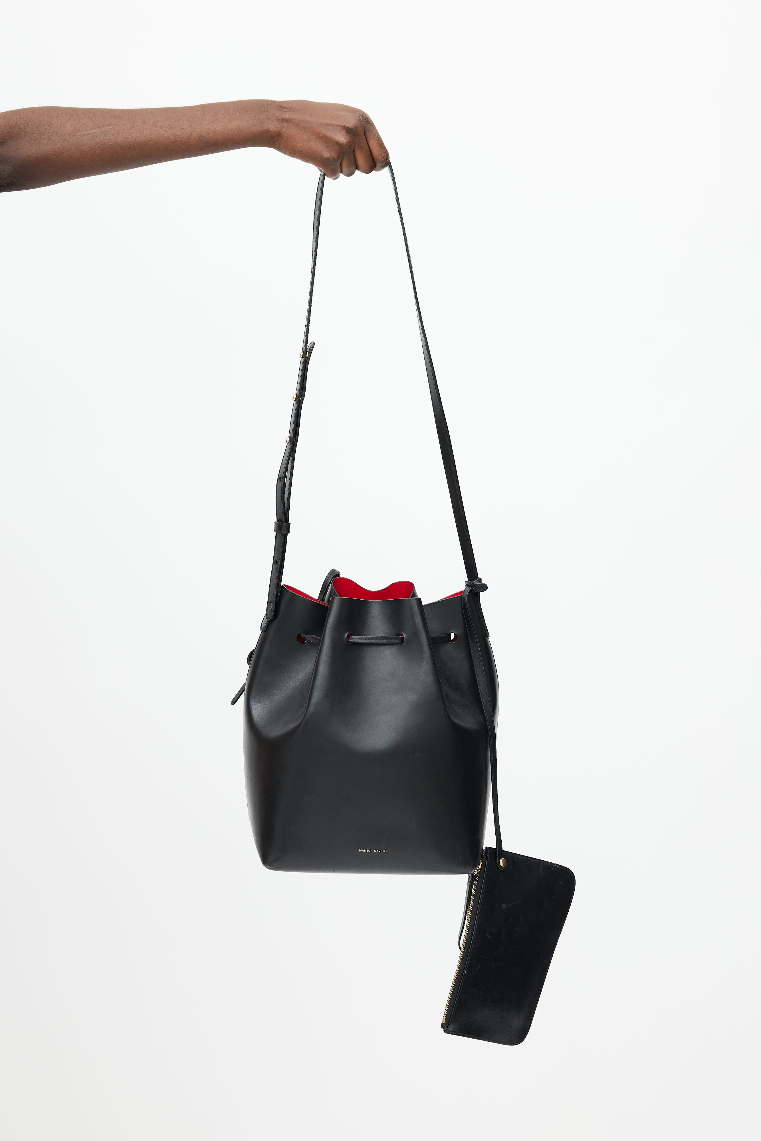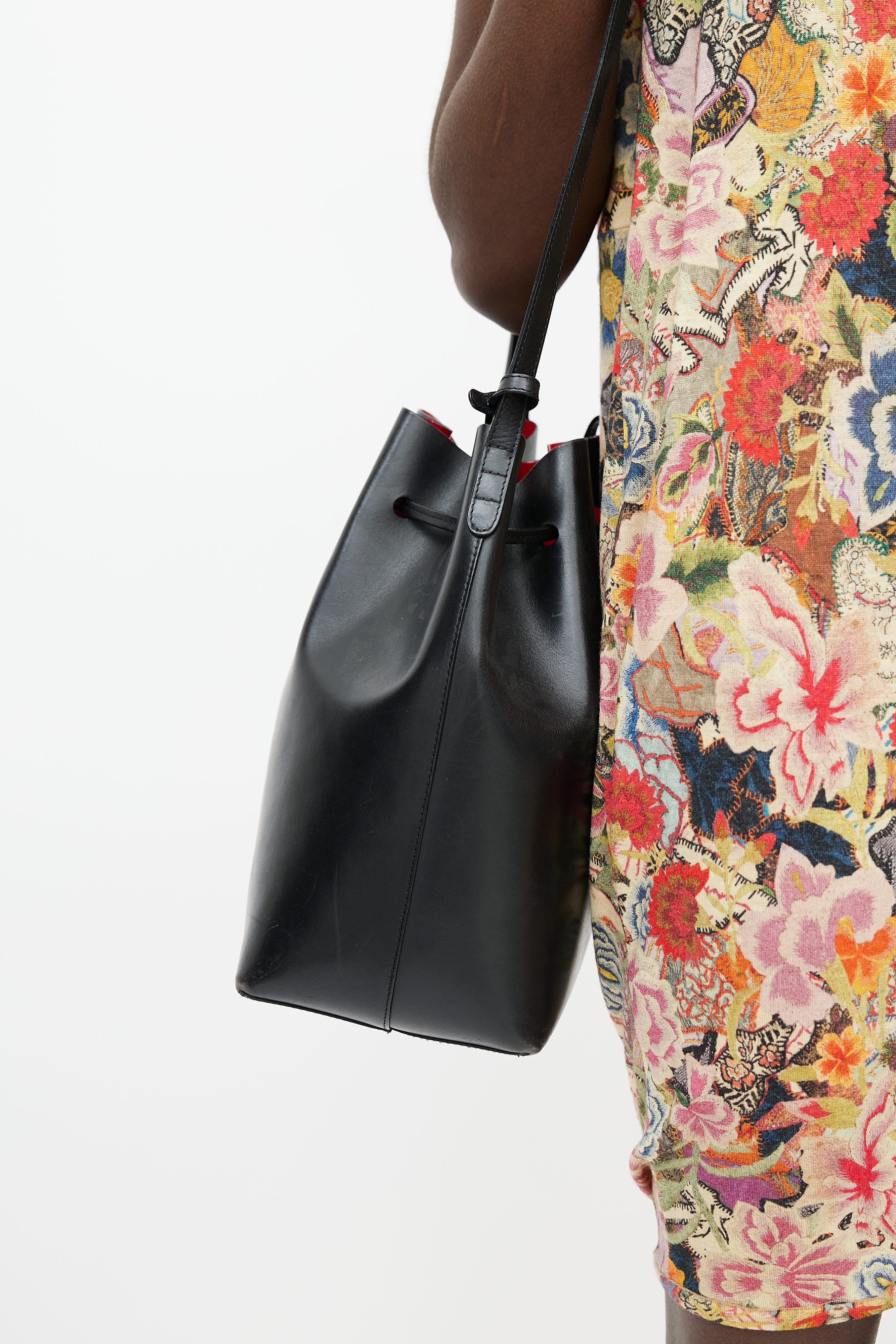 Pre-owned Mansur Gavriel Bucket Bag in black featuring cinch closure, gold tone logo stamp at front, attached shoulder strap, one main compartment, and detachable leather pouch. Original dust bag included.