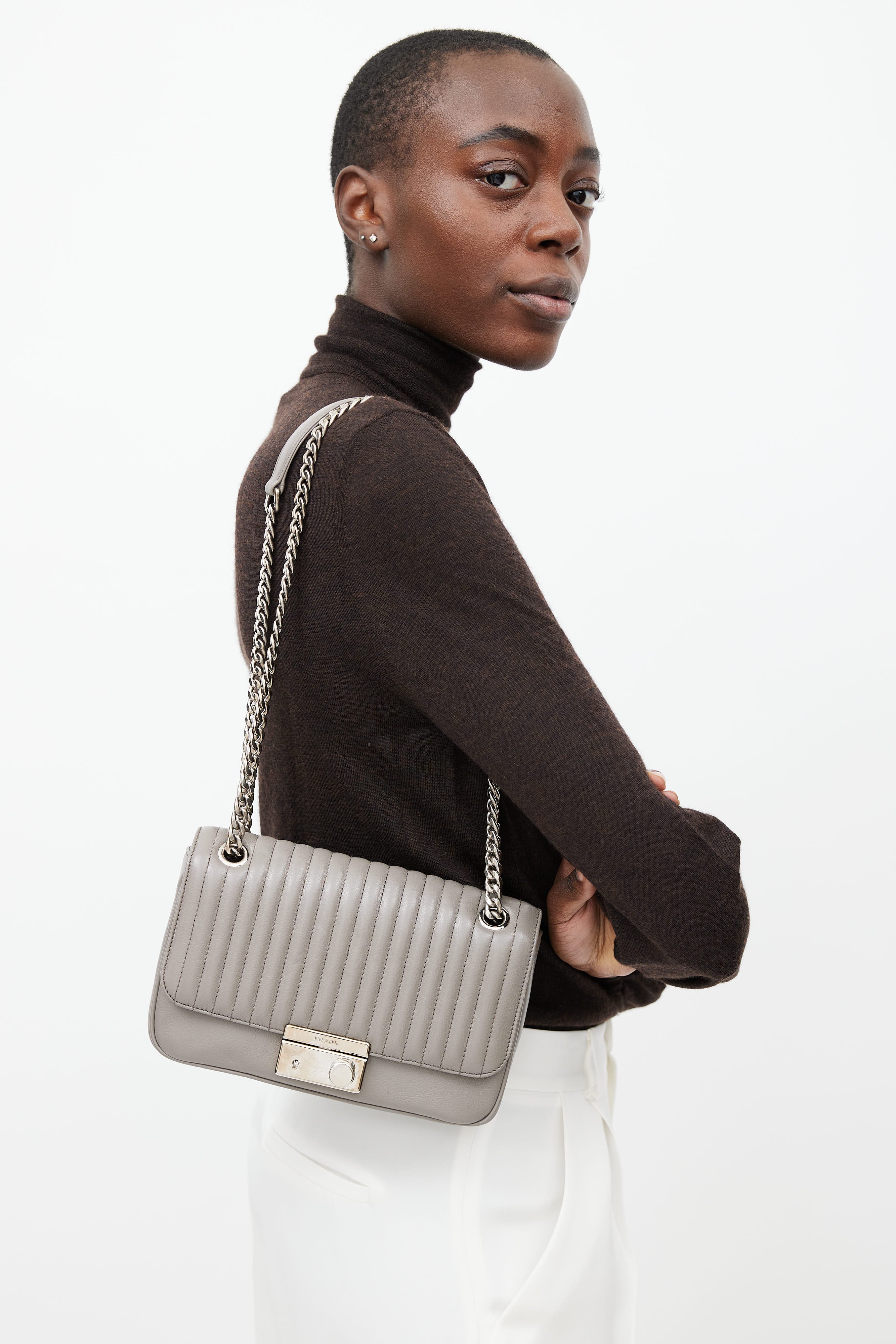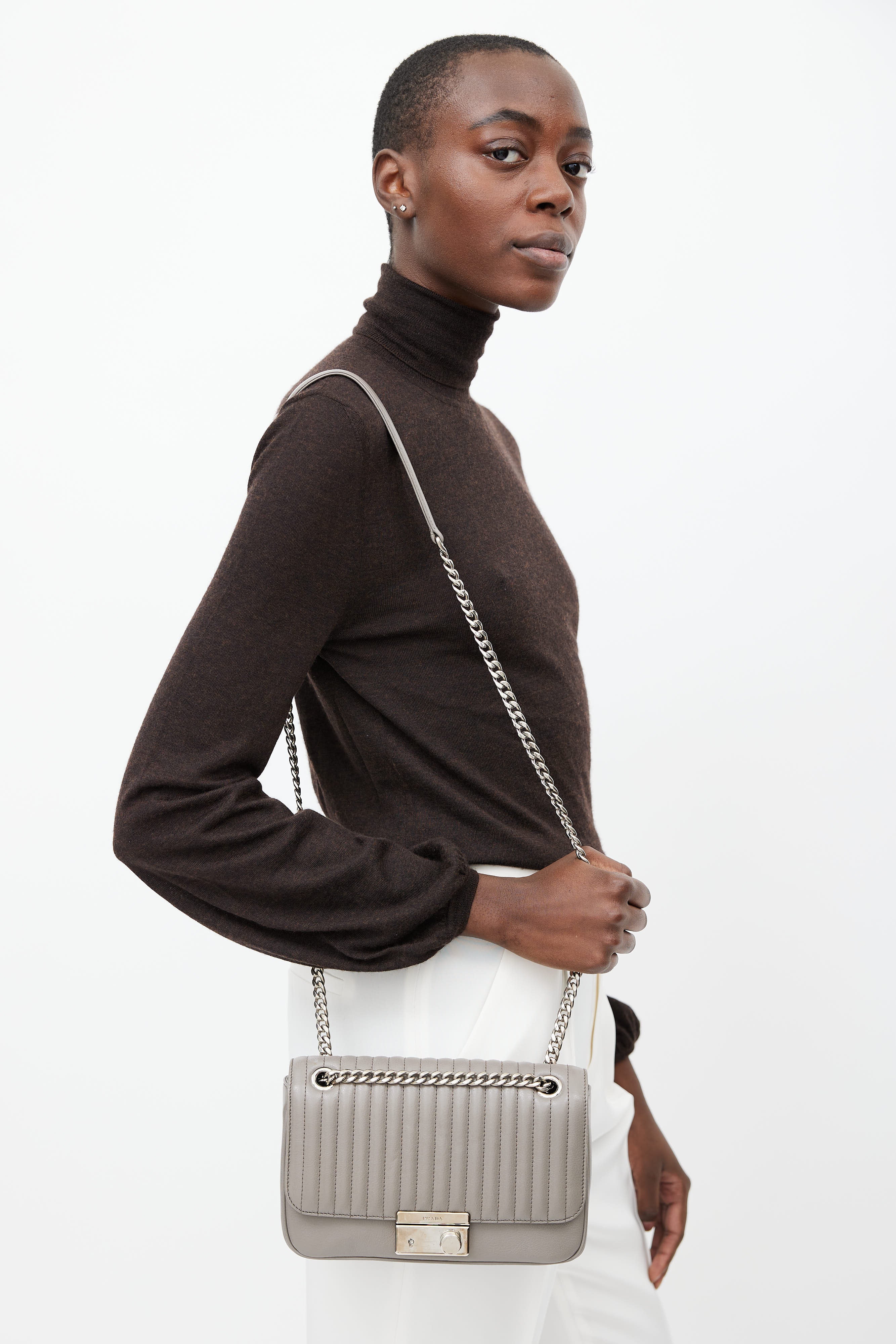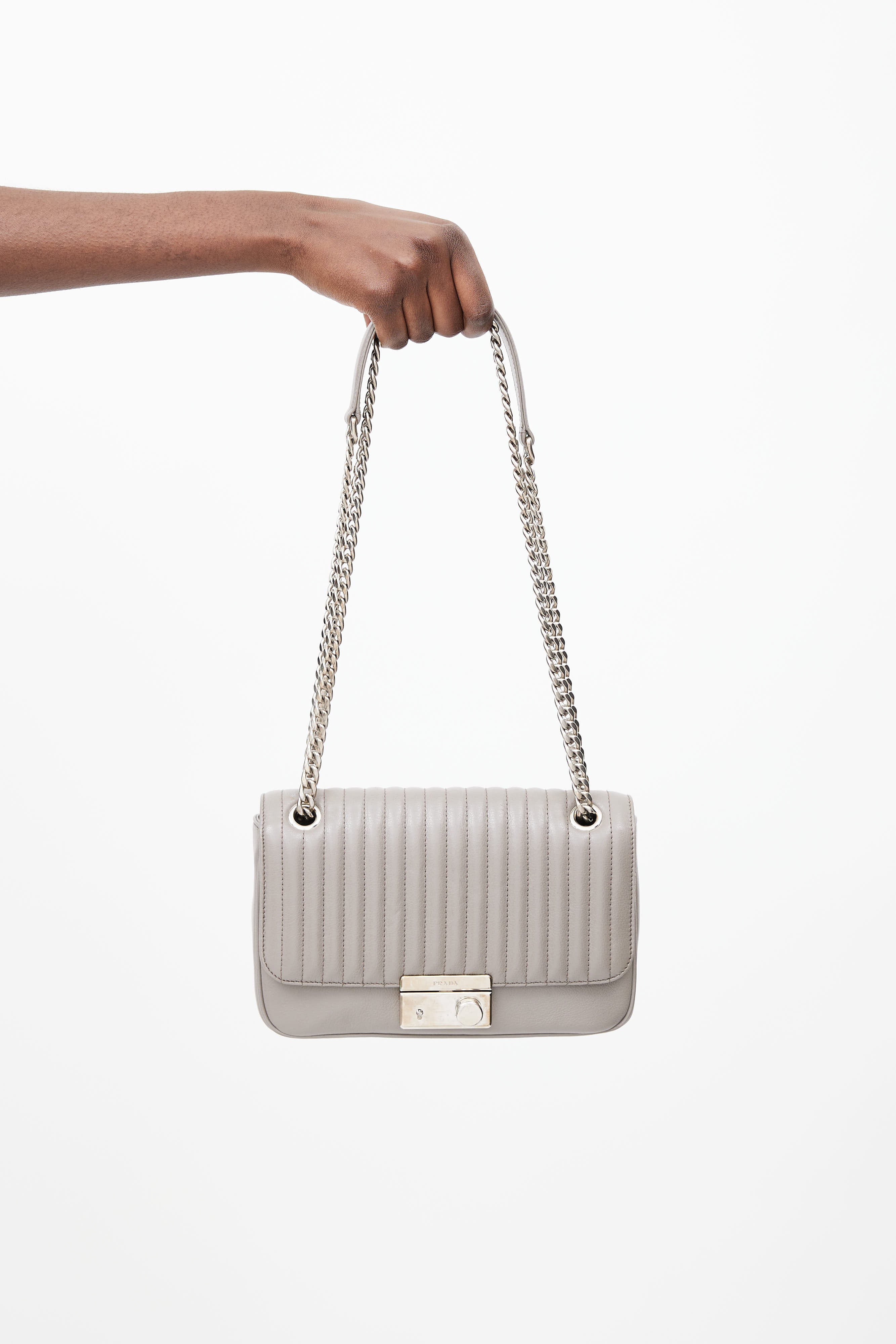 Pre-owned Prada grey leather shoulder bag featuring a quilted top flap with silver tone push lock closure, one main compartment with one zip pocket and one slip pocket, removable leather keychain, and a silver tone chain shoulder strap with tonal leather tab.