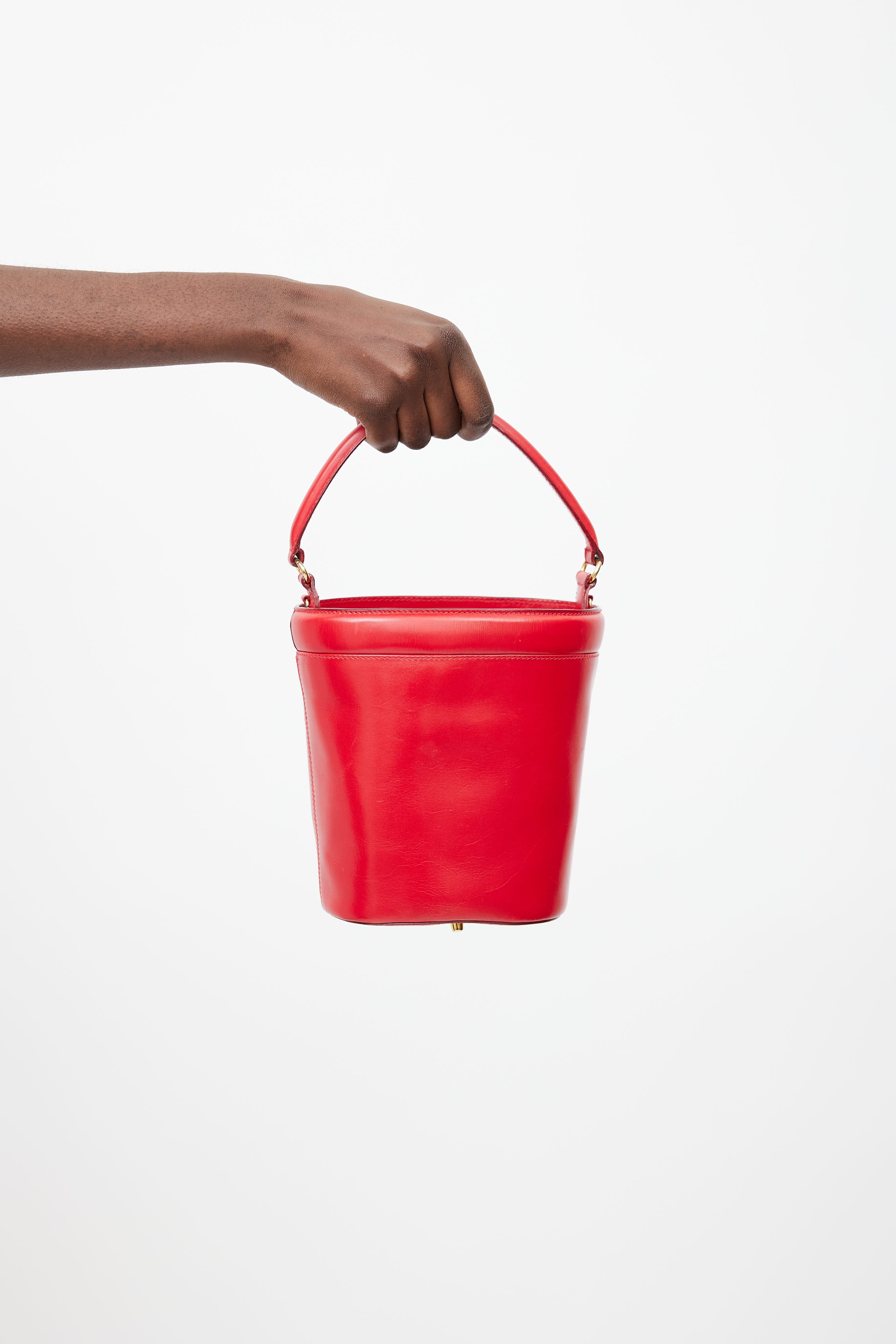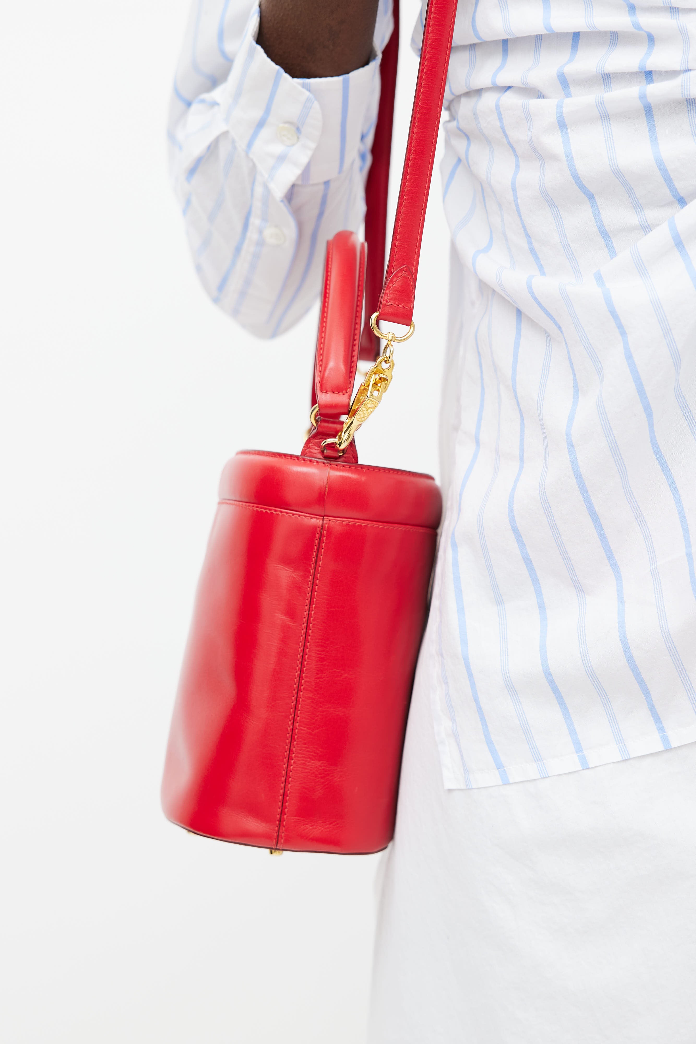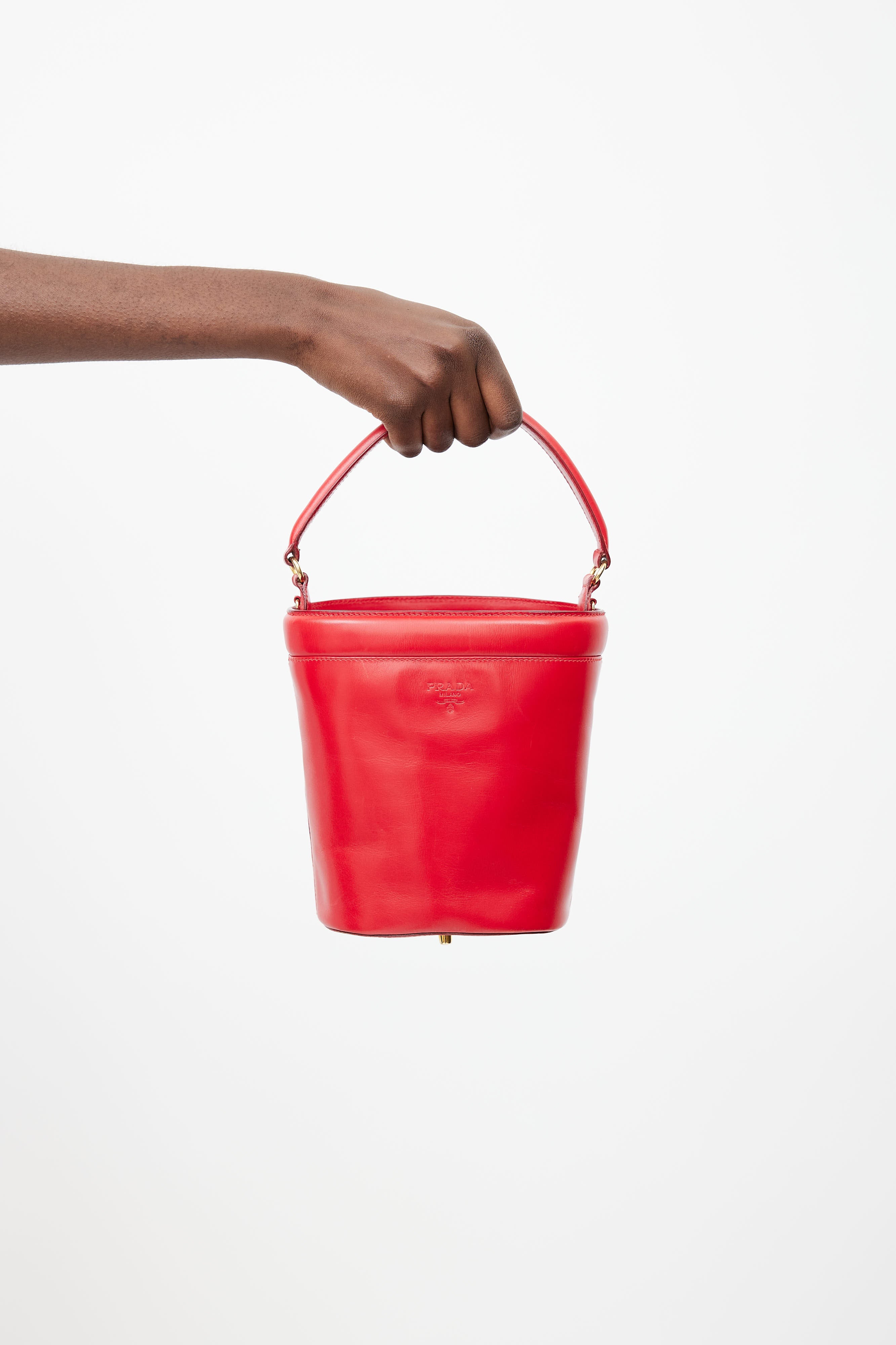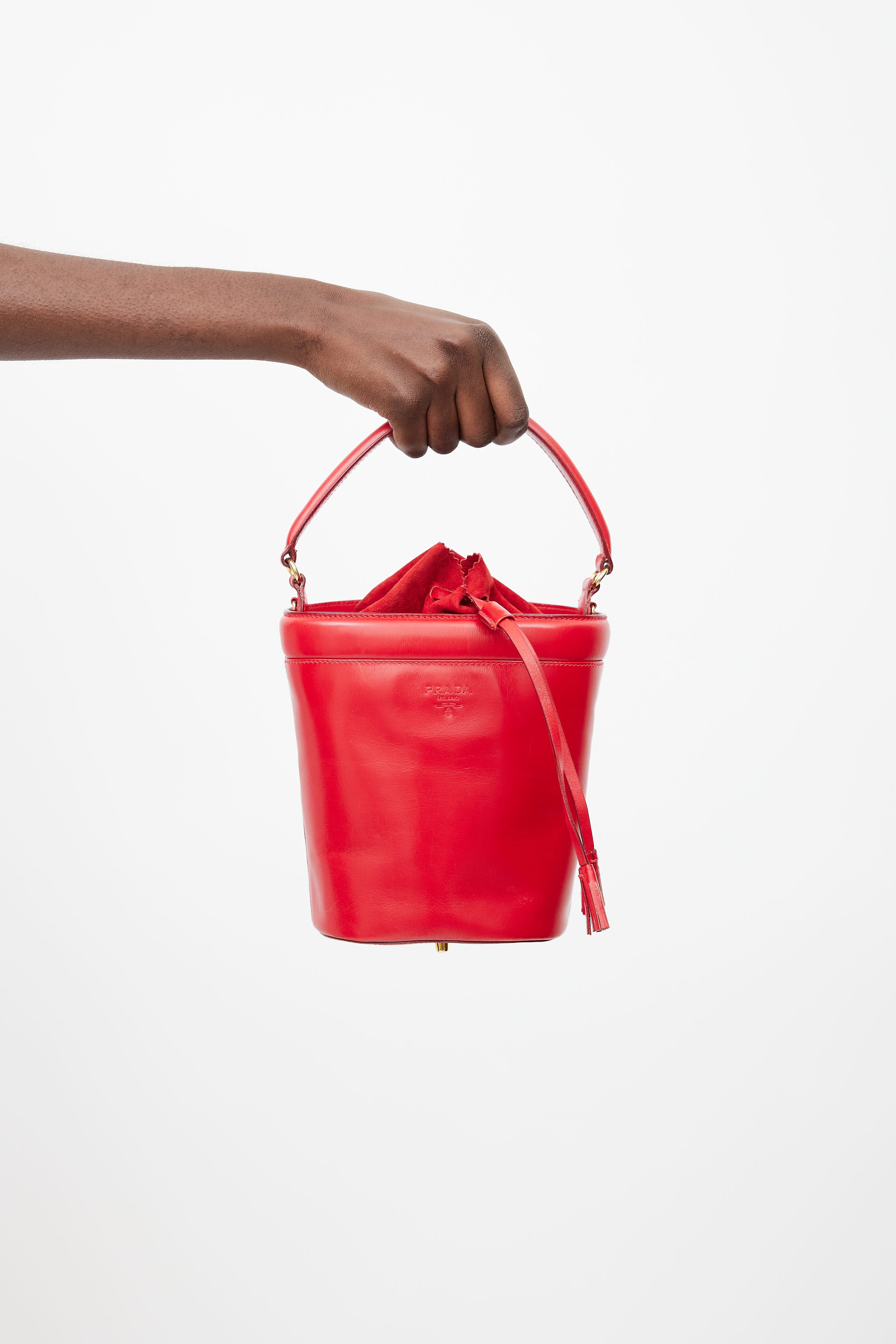 Pre-owned Prada red leather bucket shoulder bag featuring a tonal embossed logo at front, wrapped leather top handle, removable shoulder strap with gold tone hardware, one main compartment and one zip compartment, with a leather wrapped cinch closure at top. Comes with dust bag.