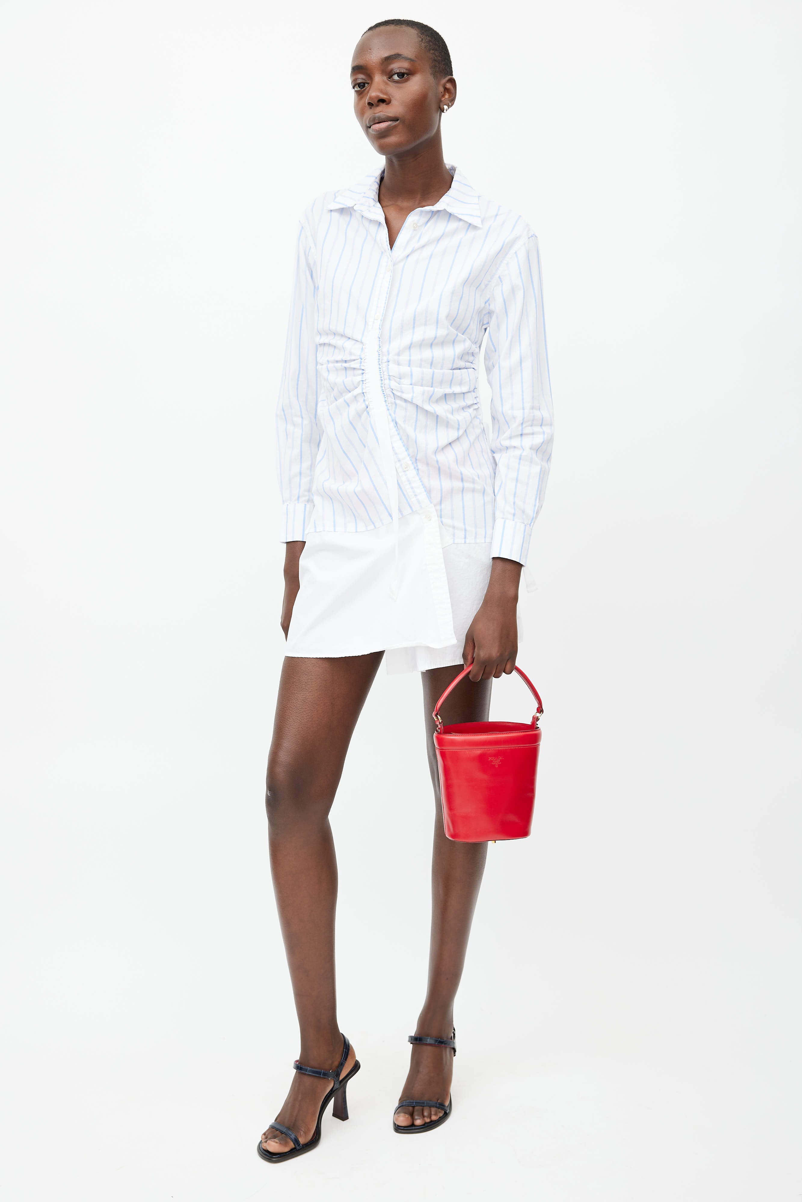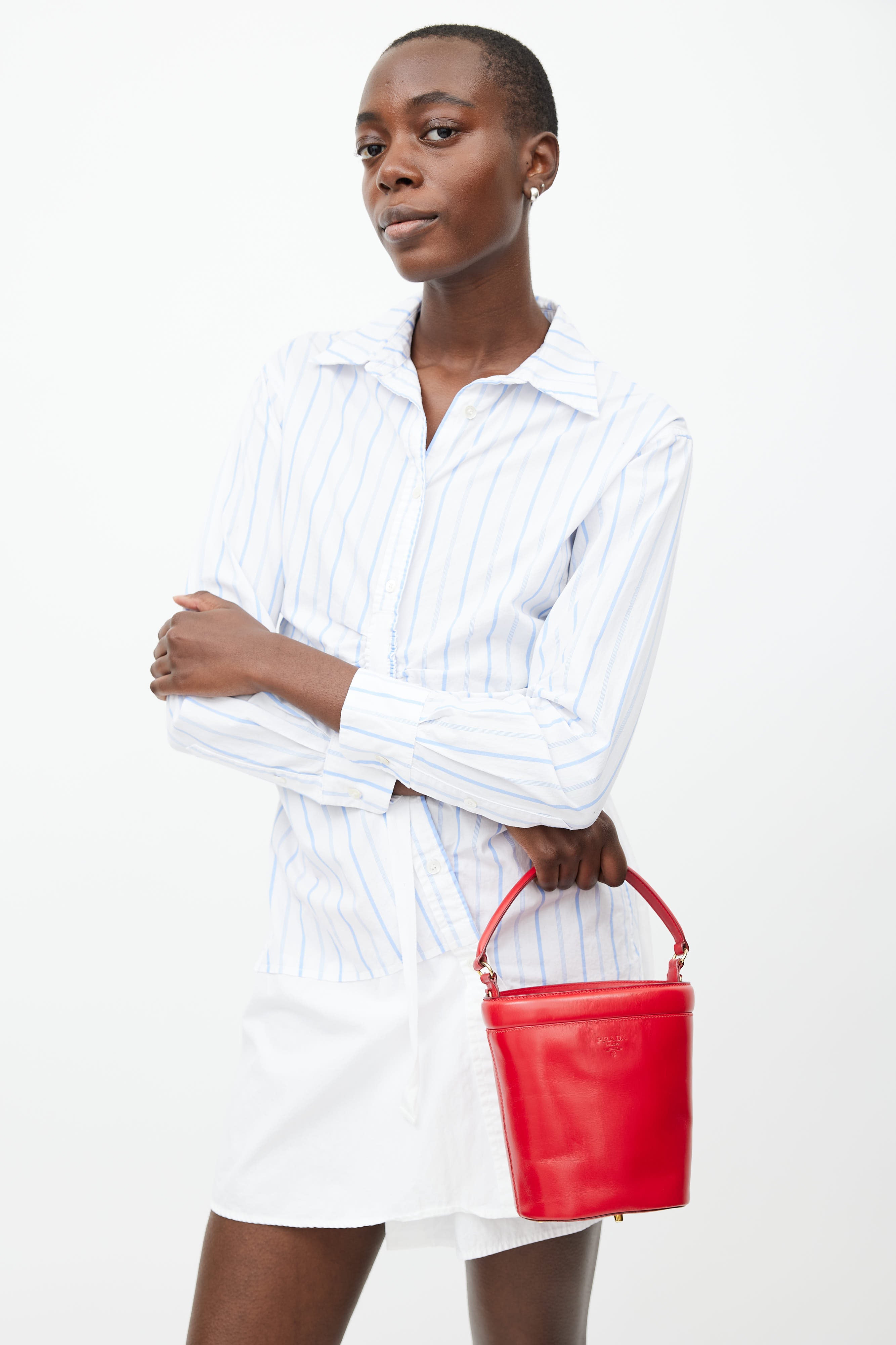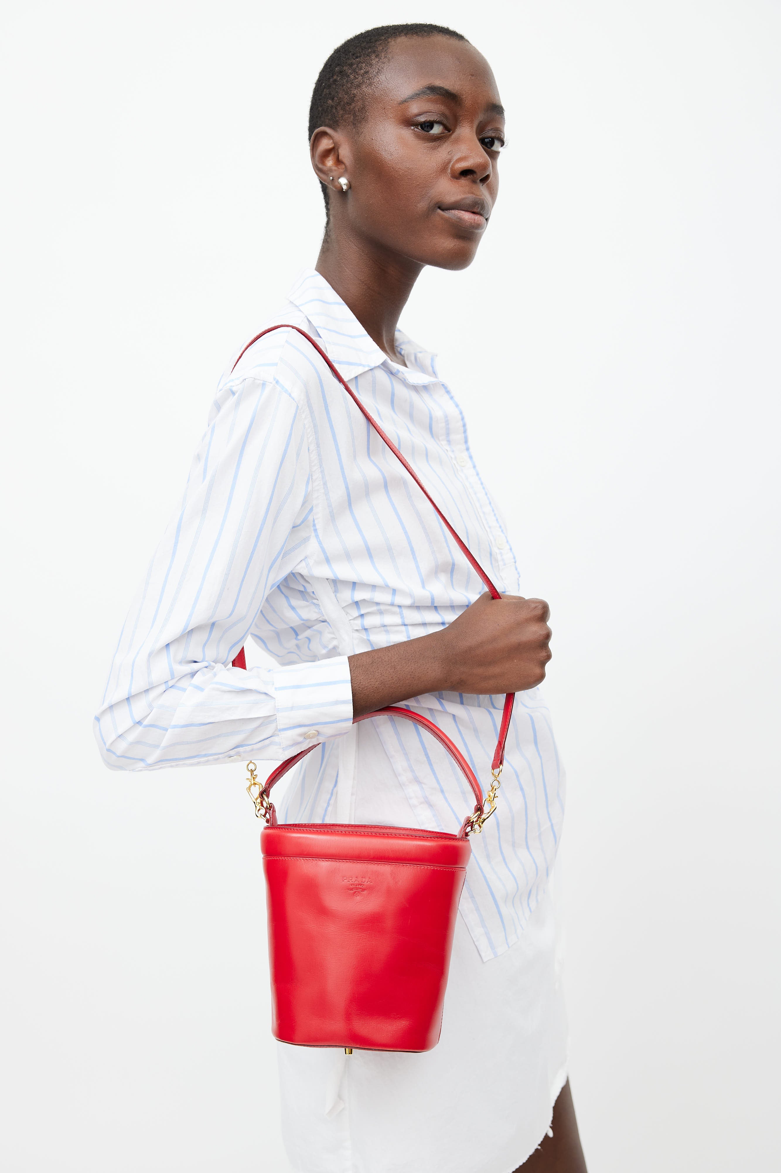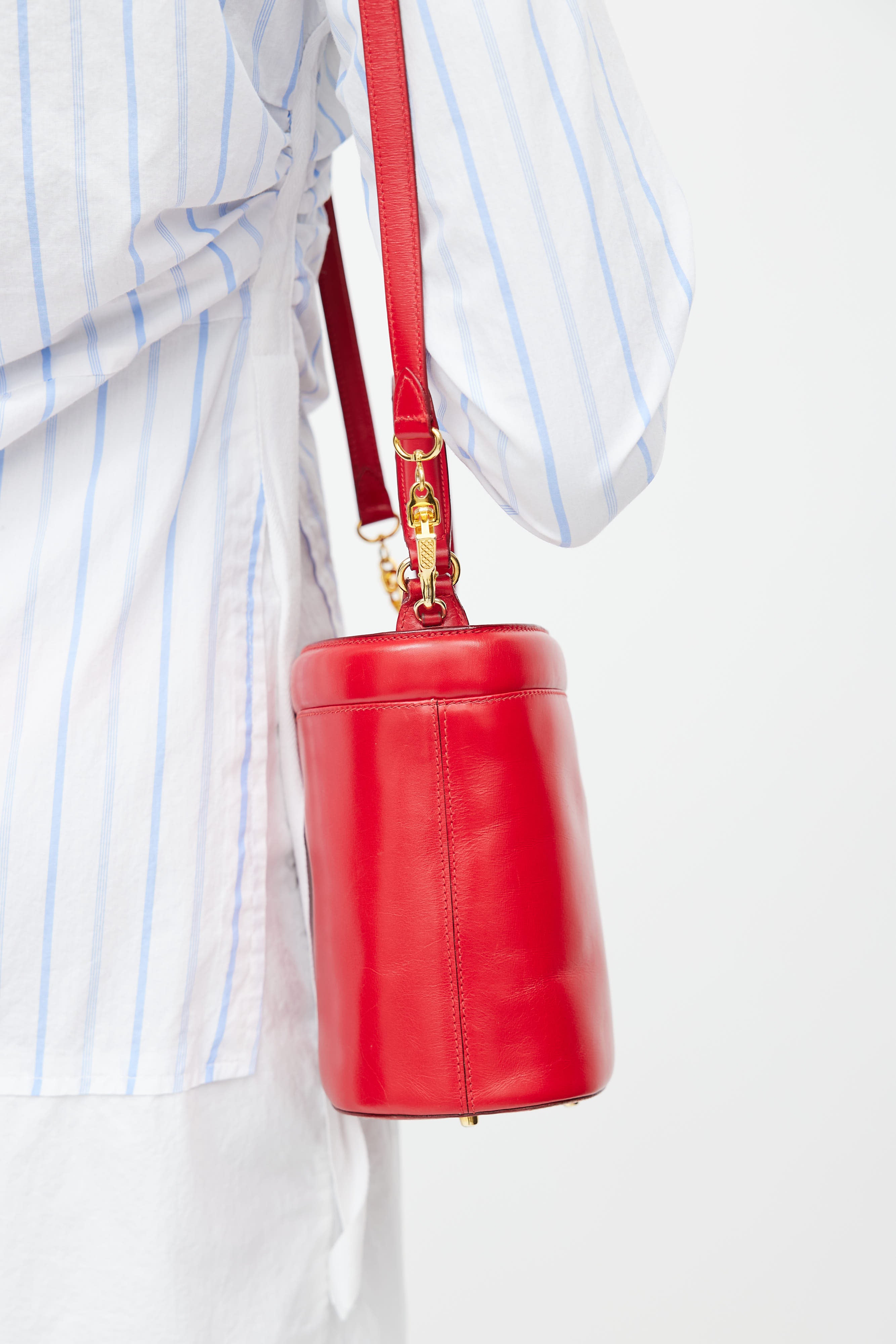 Pre-owned Prada red leather bucket shoulder bag featuring a tonal embossed logo at front, wrapped leather top handle, removable shoulder strap with gold tone hardware, one main compartment and one zip compartment, with a leather wrapped cinch closure at top. Comes with dust bag.