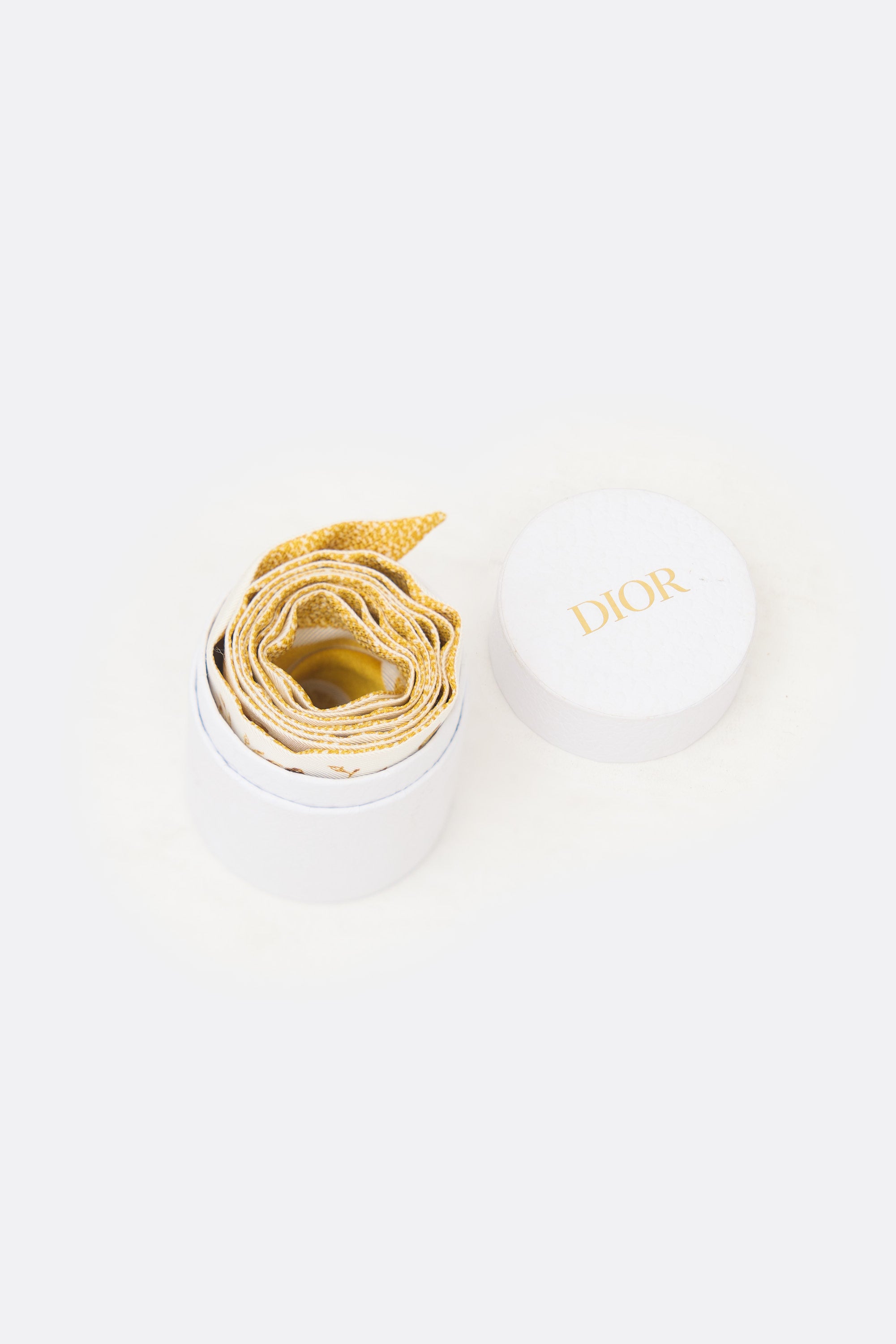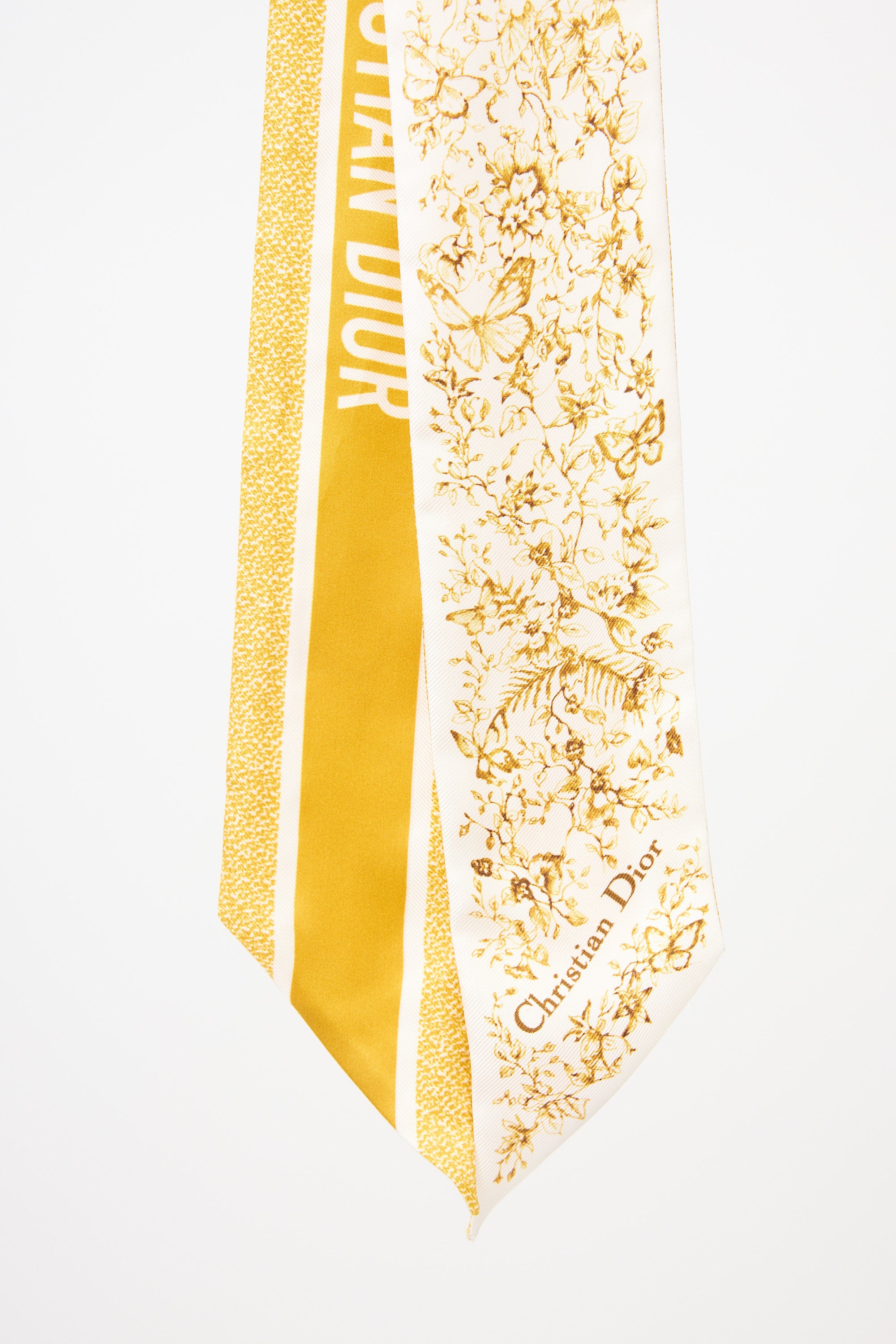 Pre-owned Dior yellow and cream silk Dioresque Butterfly Mitzah twilly scarf featuring a floral print. signature logo striped reverse, and pointed ends. Comes with original box.