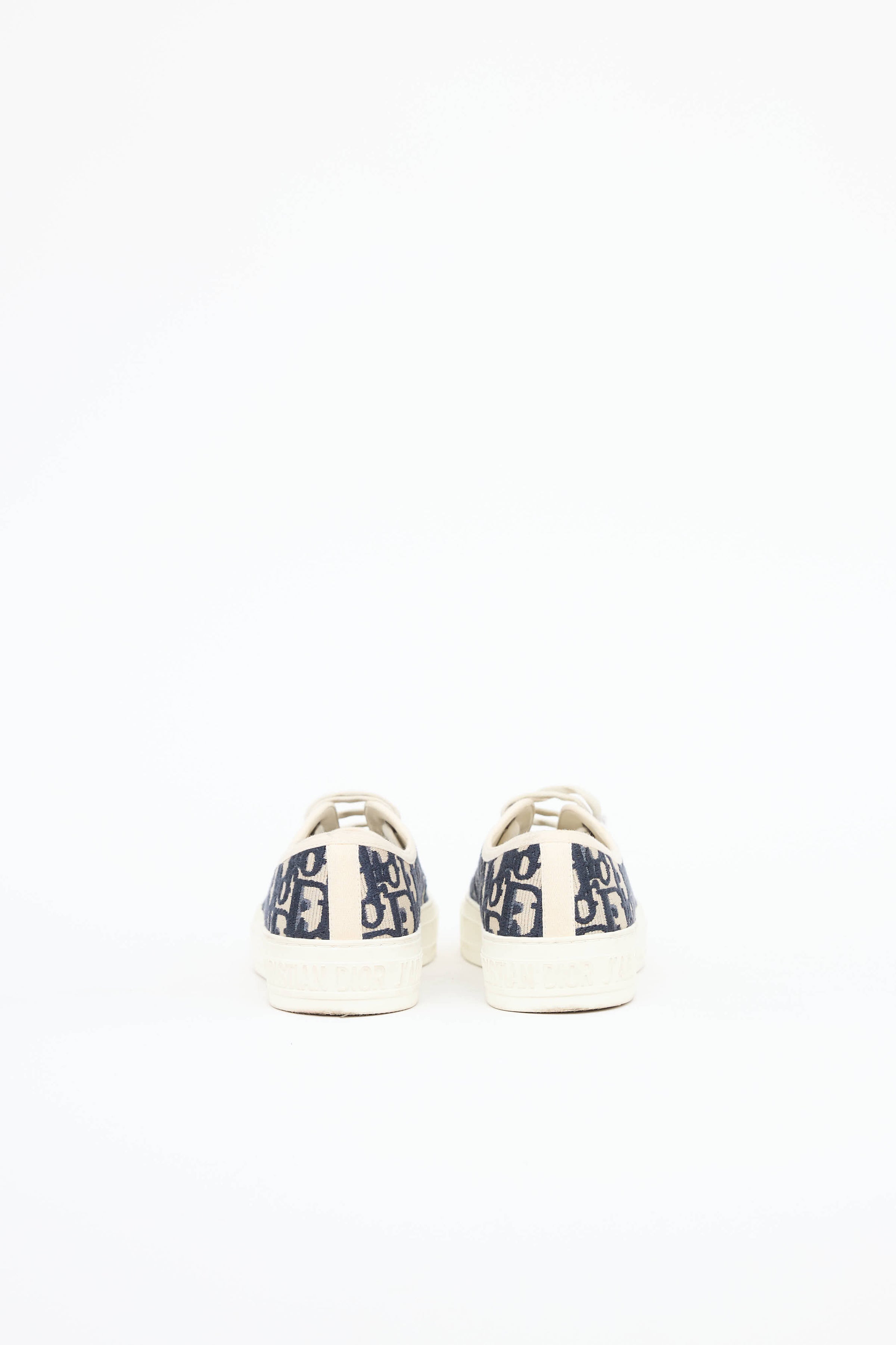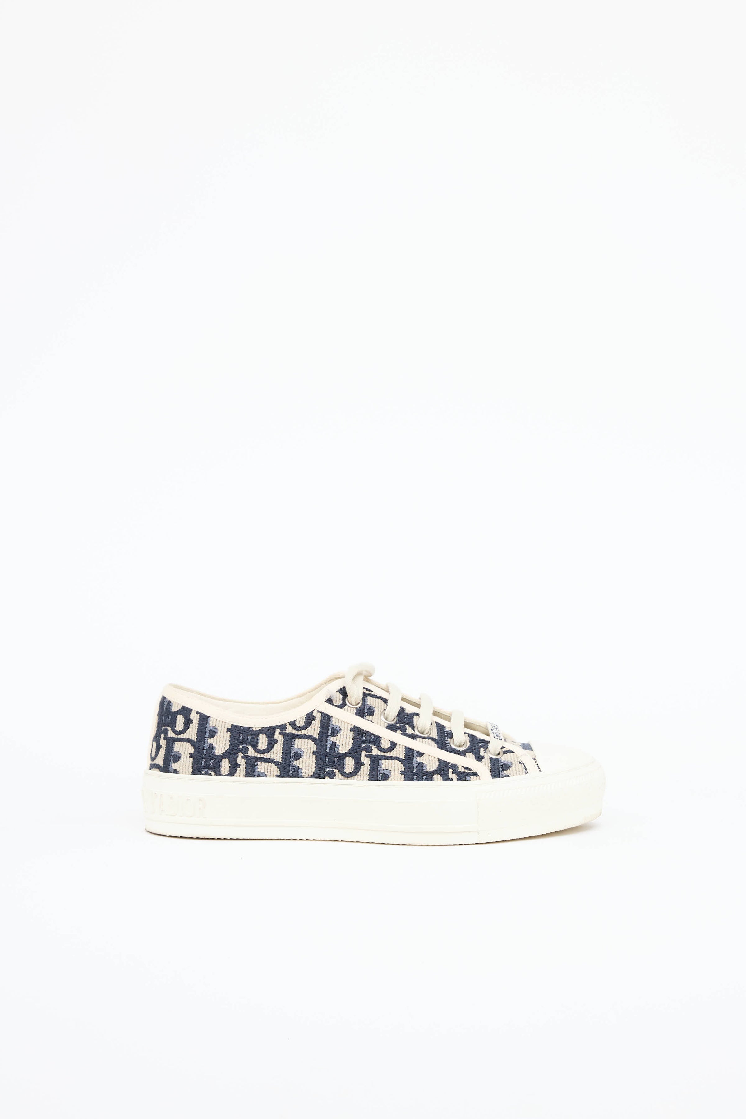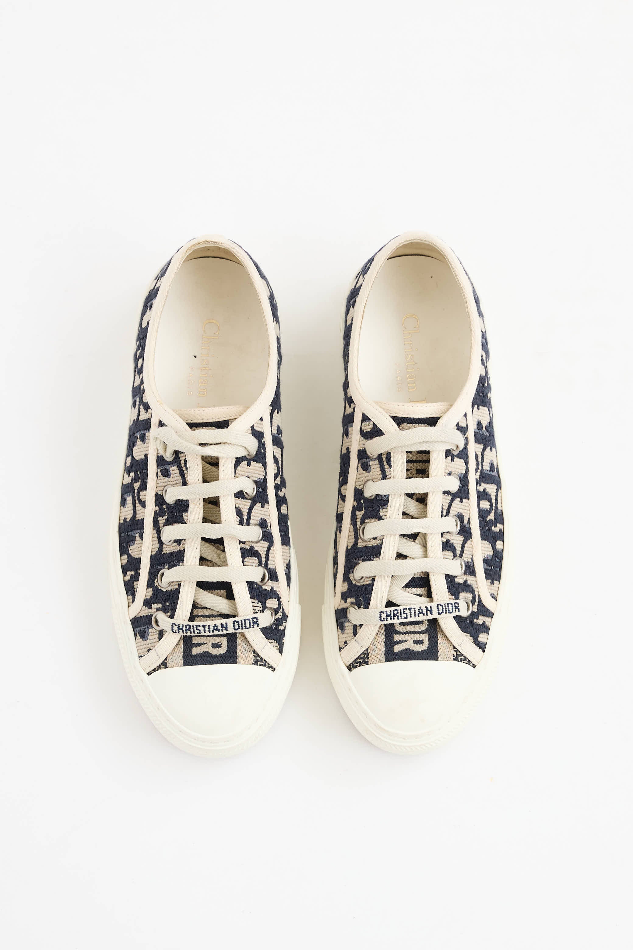 Pre-owned Dior navy and cream Walk'n'Dior sneakers featuring oblique Dior monogram canvas, round cap toe, logo at midsole, and lace up vamp.