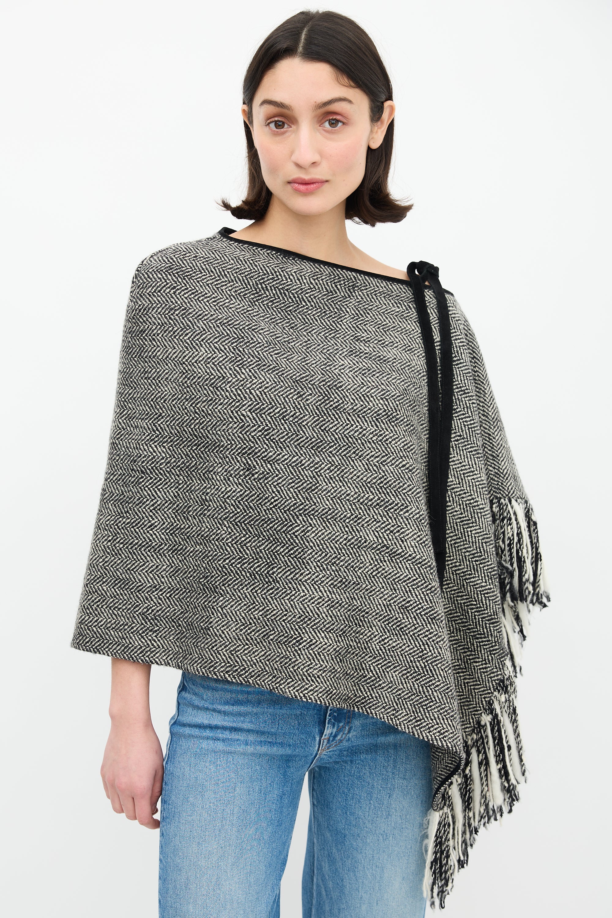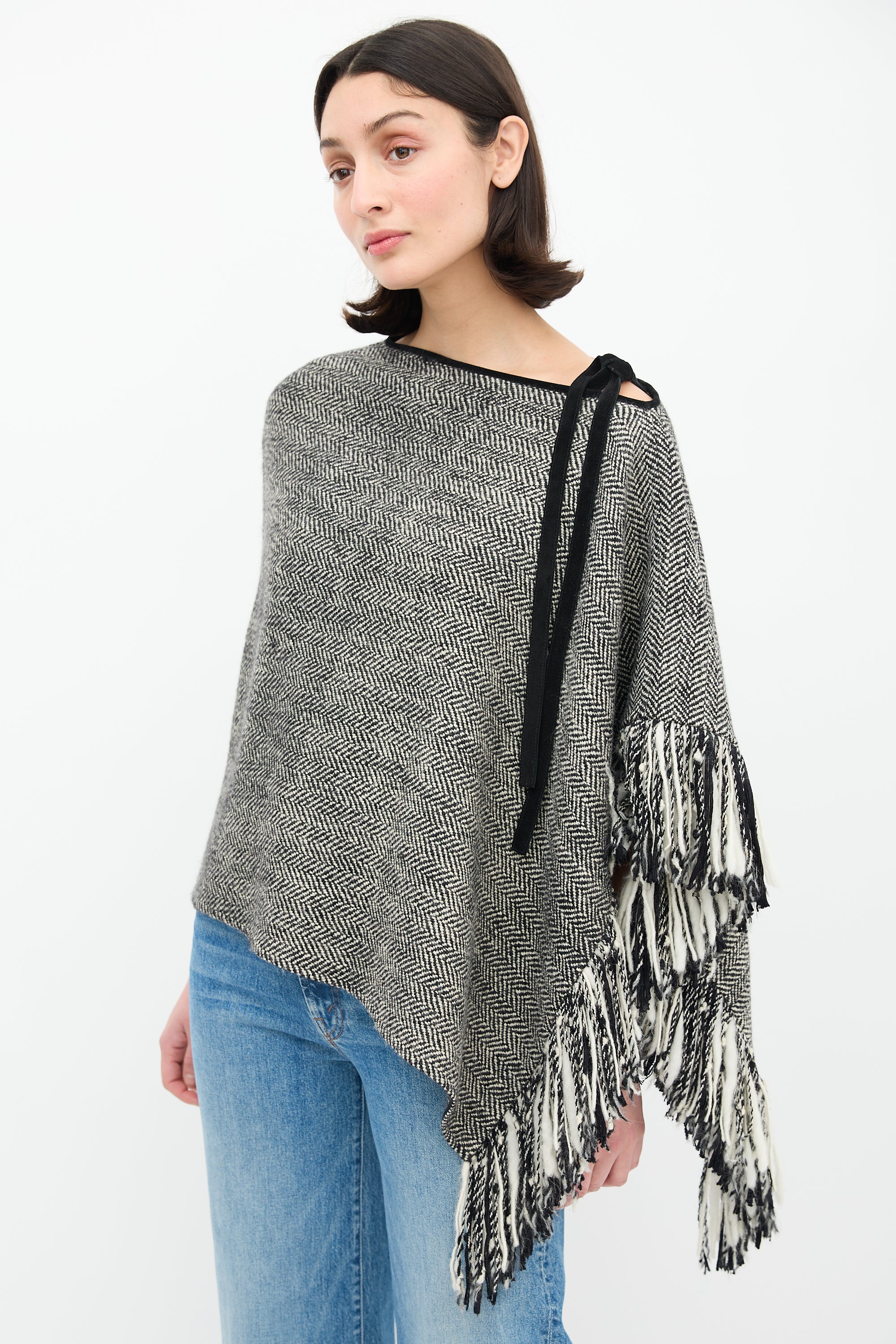 Pre-owned Dolce & Gabbana black and white wool herringbone knit cape featuring asymmetric boat neckline with single shoulder self tie and fringe trim.