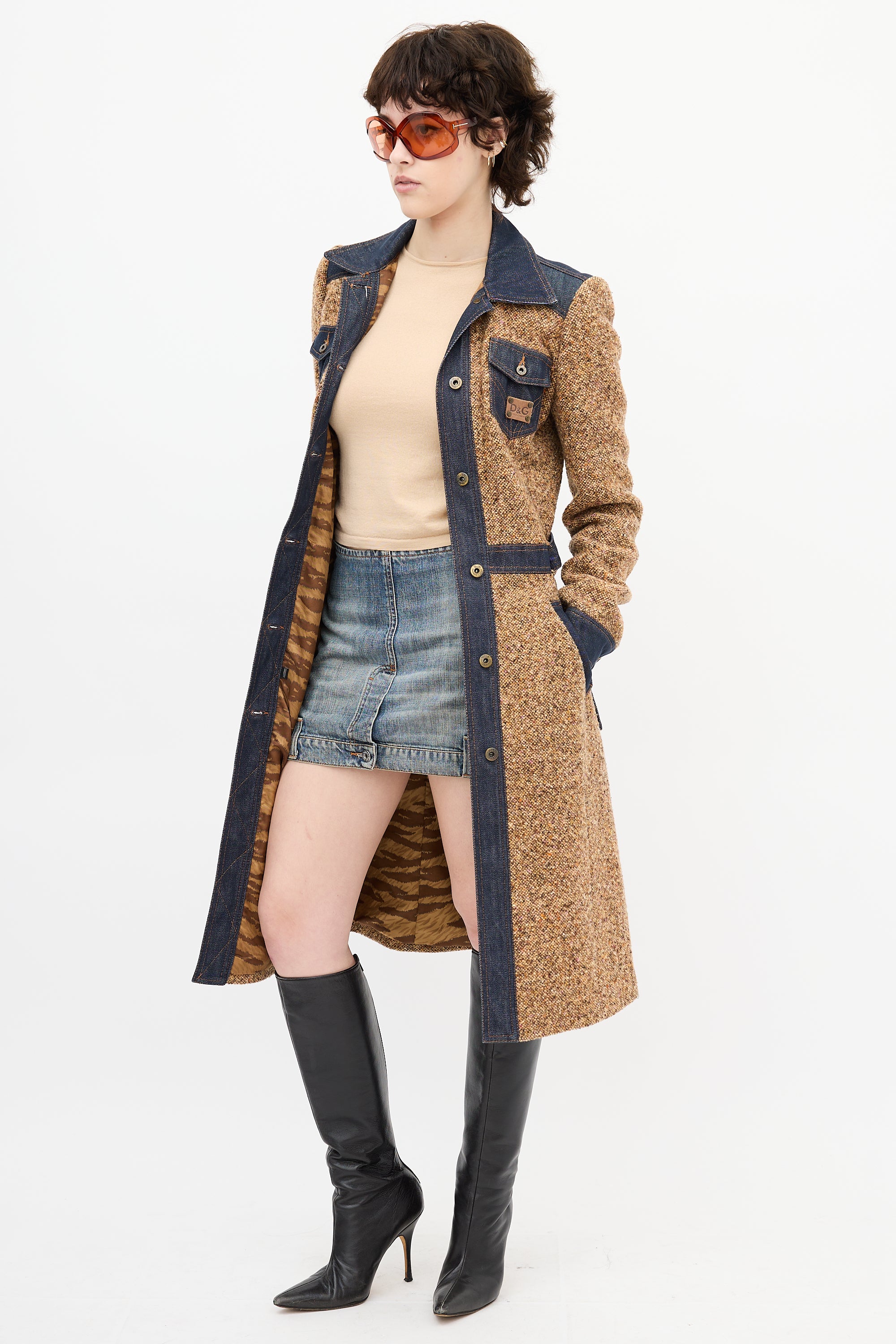 Pre-owned Dolce & Gabbana medium wash denim mini skirt featuring upside denim construction and side zip closure.