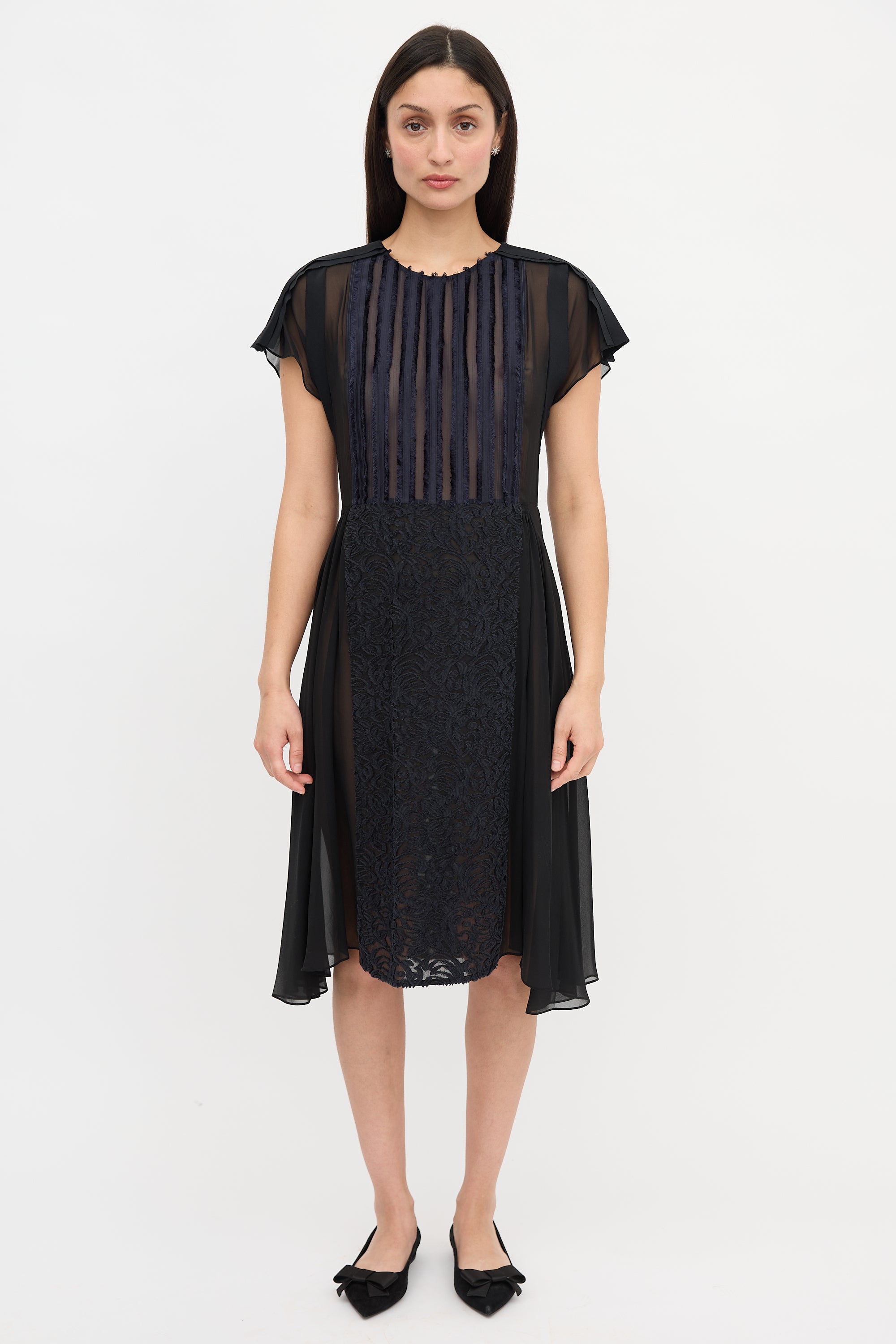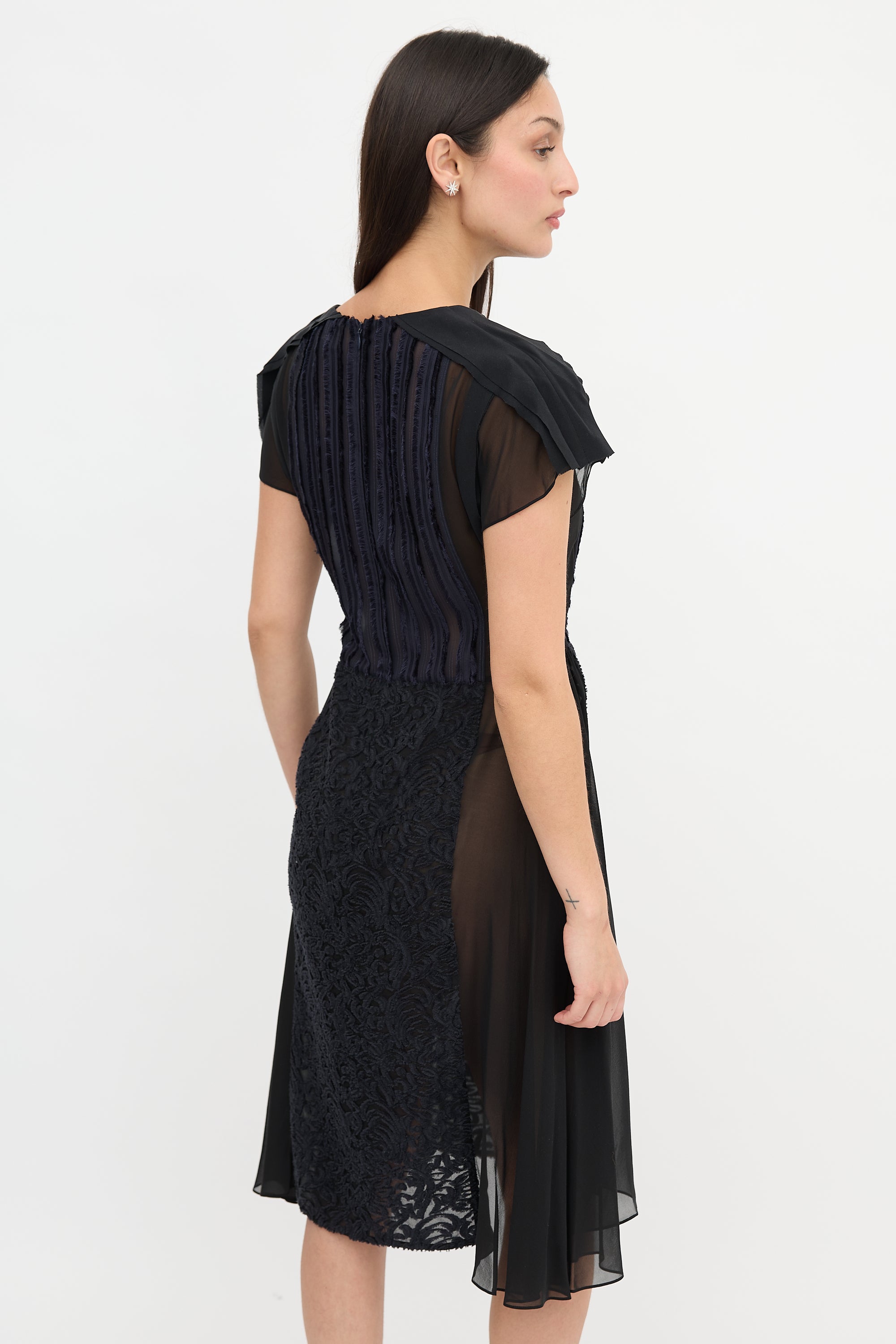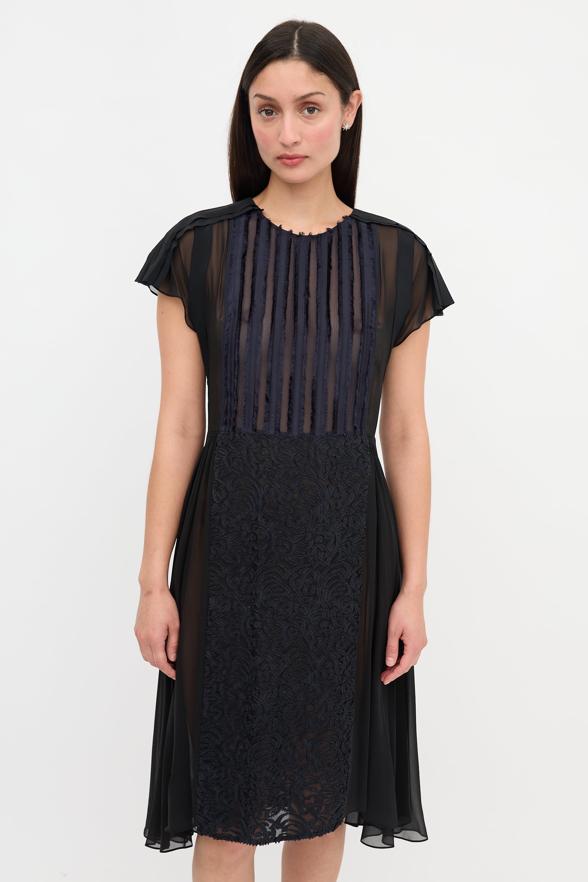 Pre-owned 3.1 Phillip Lim black chiffon dress featuring a round neckline, back zip closure, cap sleeves with flutter detail, navy striped embroidered top with frayed edge detail, gathered waist, and navy lace embroidered skirt. Unlined.